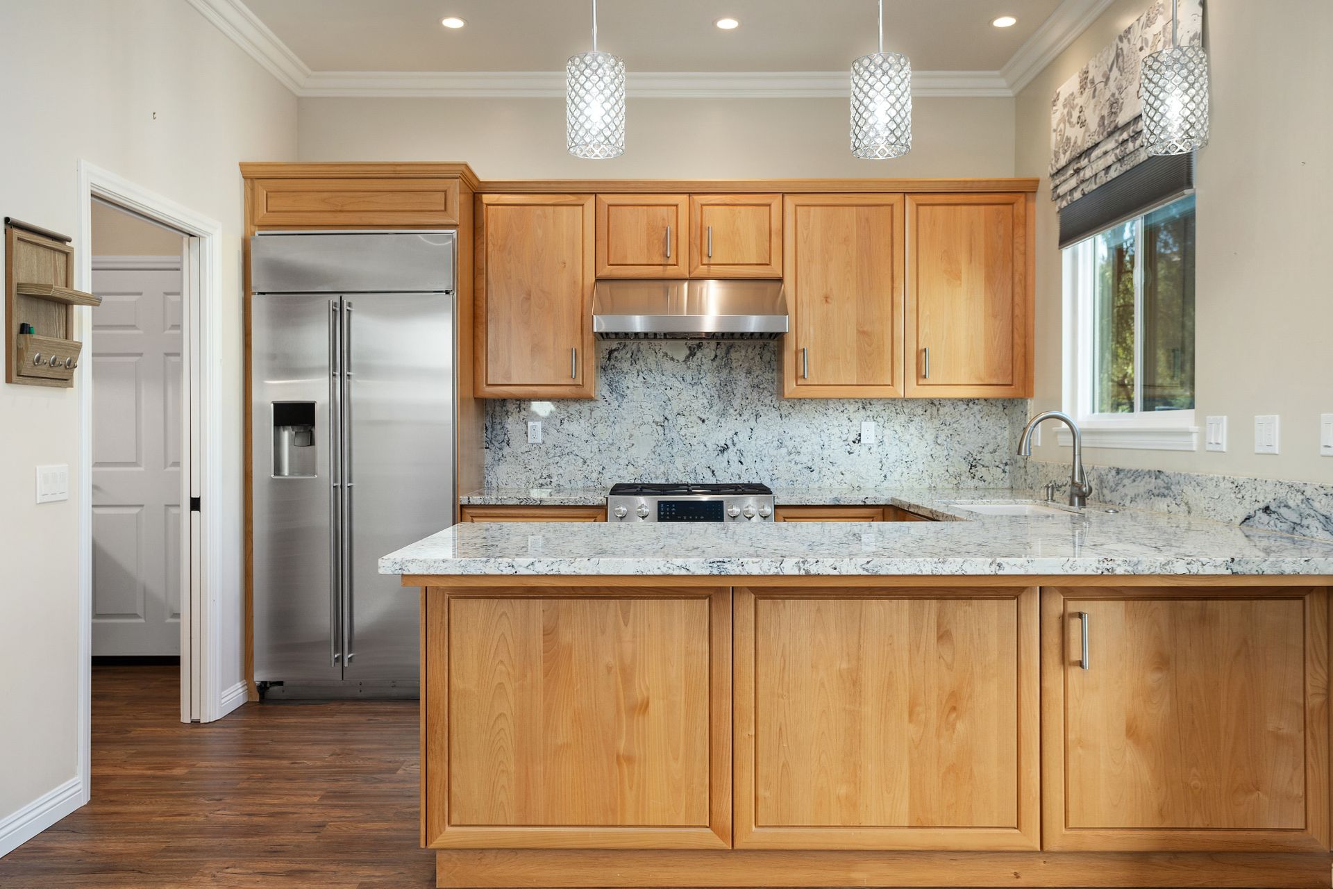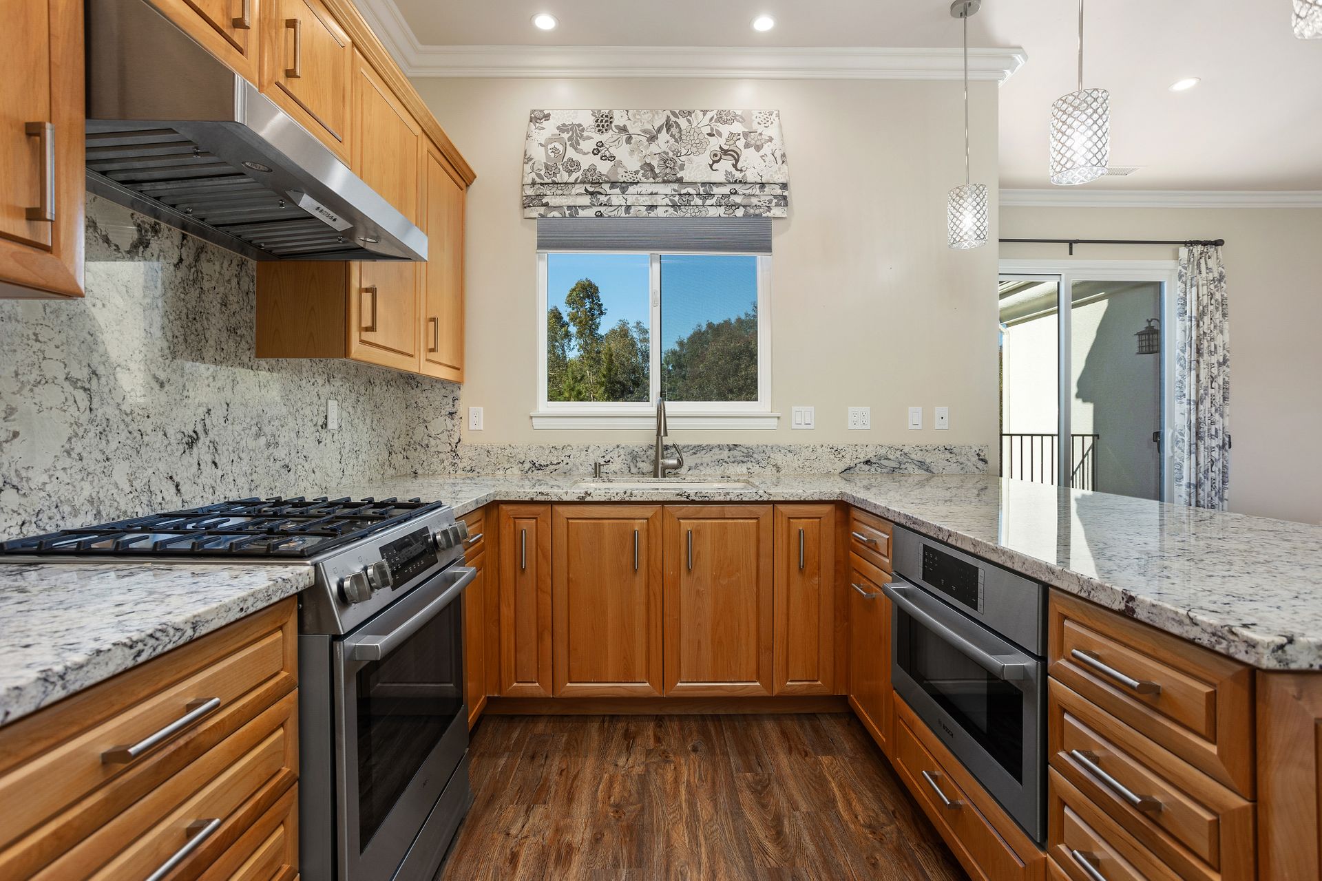The detached casita, built in 2019, offers approximately 997 square feet of additional livable space with 10-foot ceilings. It has two spacious bedrooms with walk-in closets, one full travertine and granite bathroom, a full kitchen with custom walnut cabinets and stainless-steel appliances, granite countertops and a separate laundry room. With its own attached one-car garage, a private balcony with serene tree views, and a separate gas and electricity meter, the casita is ideal for diverse living or rental income.