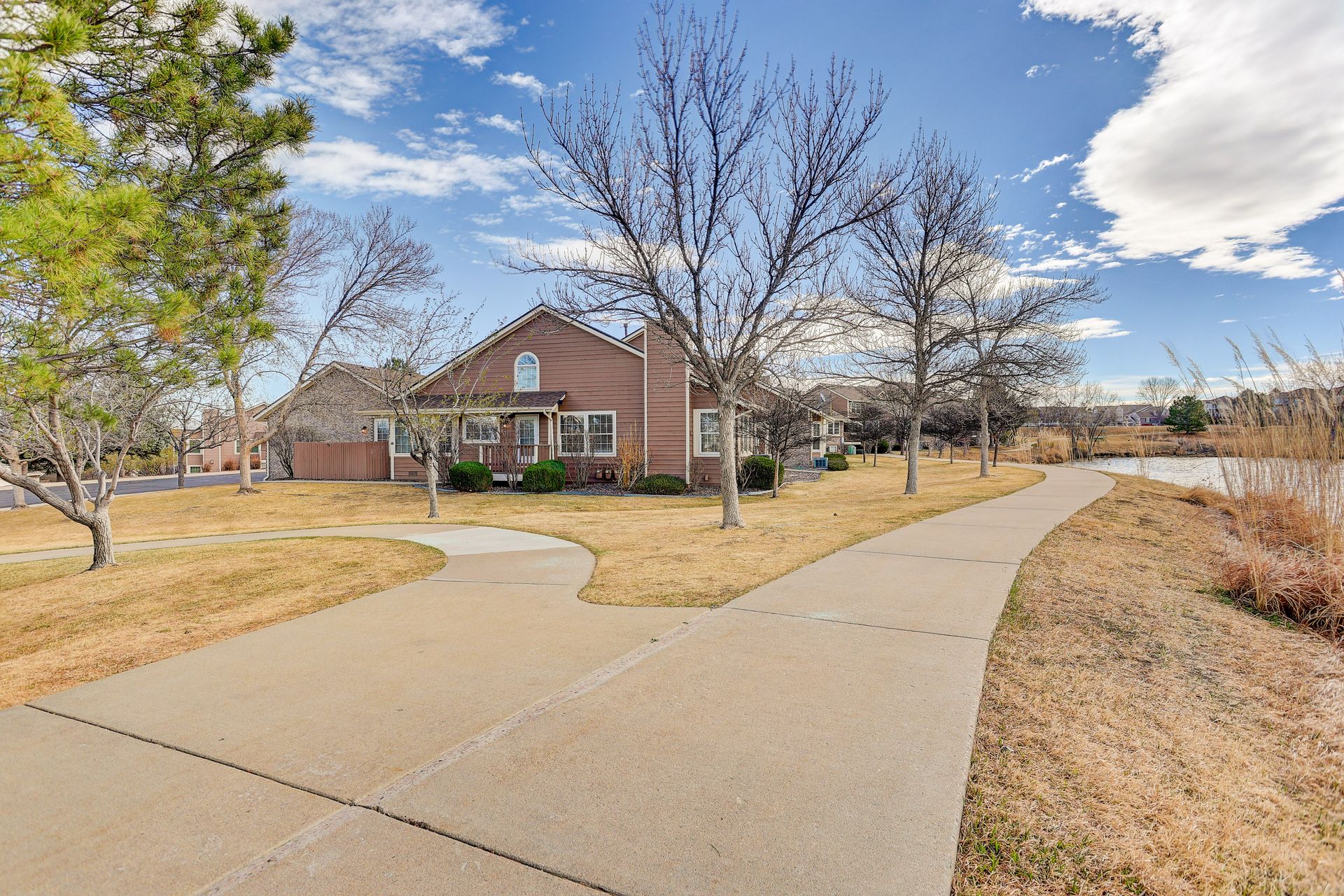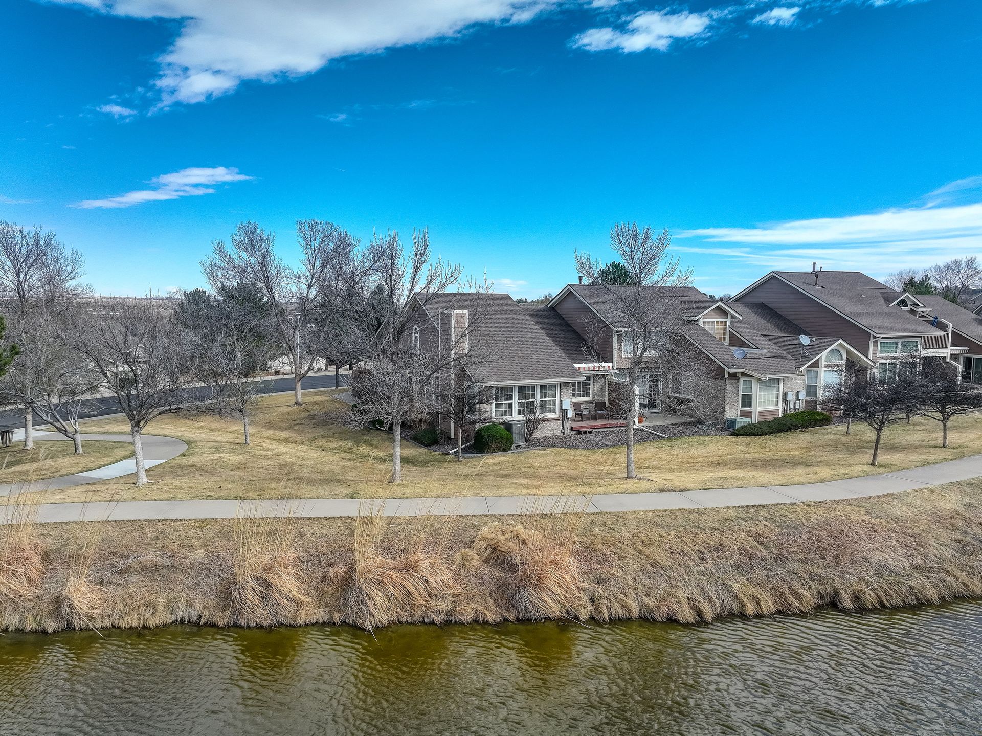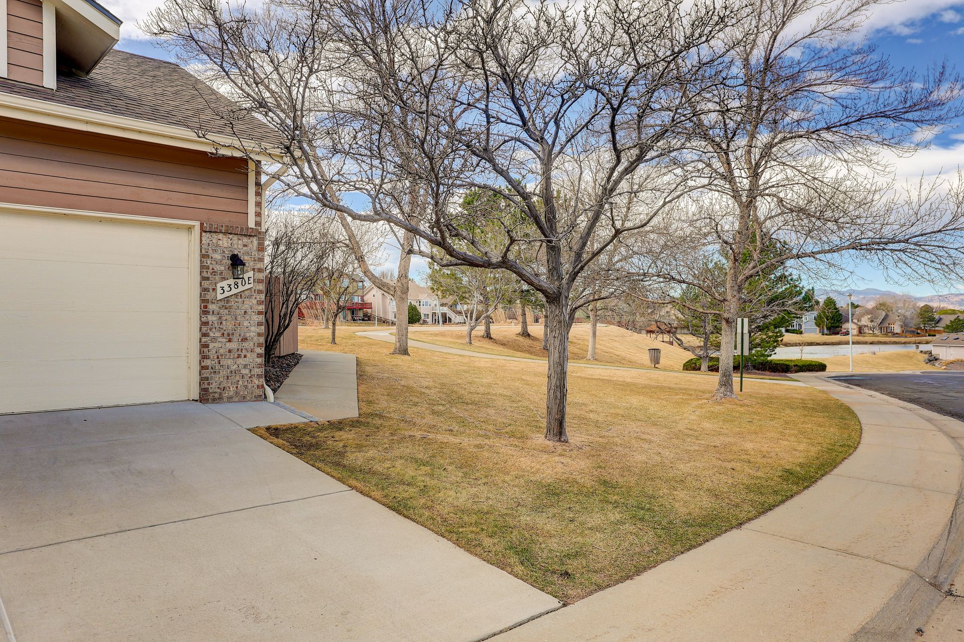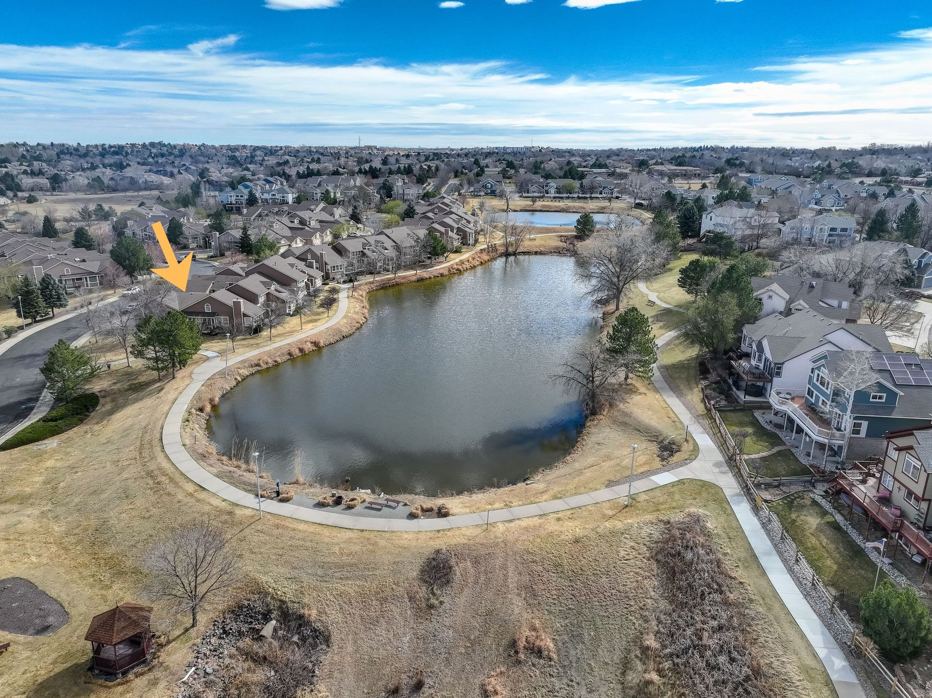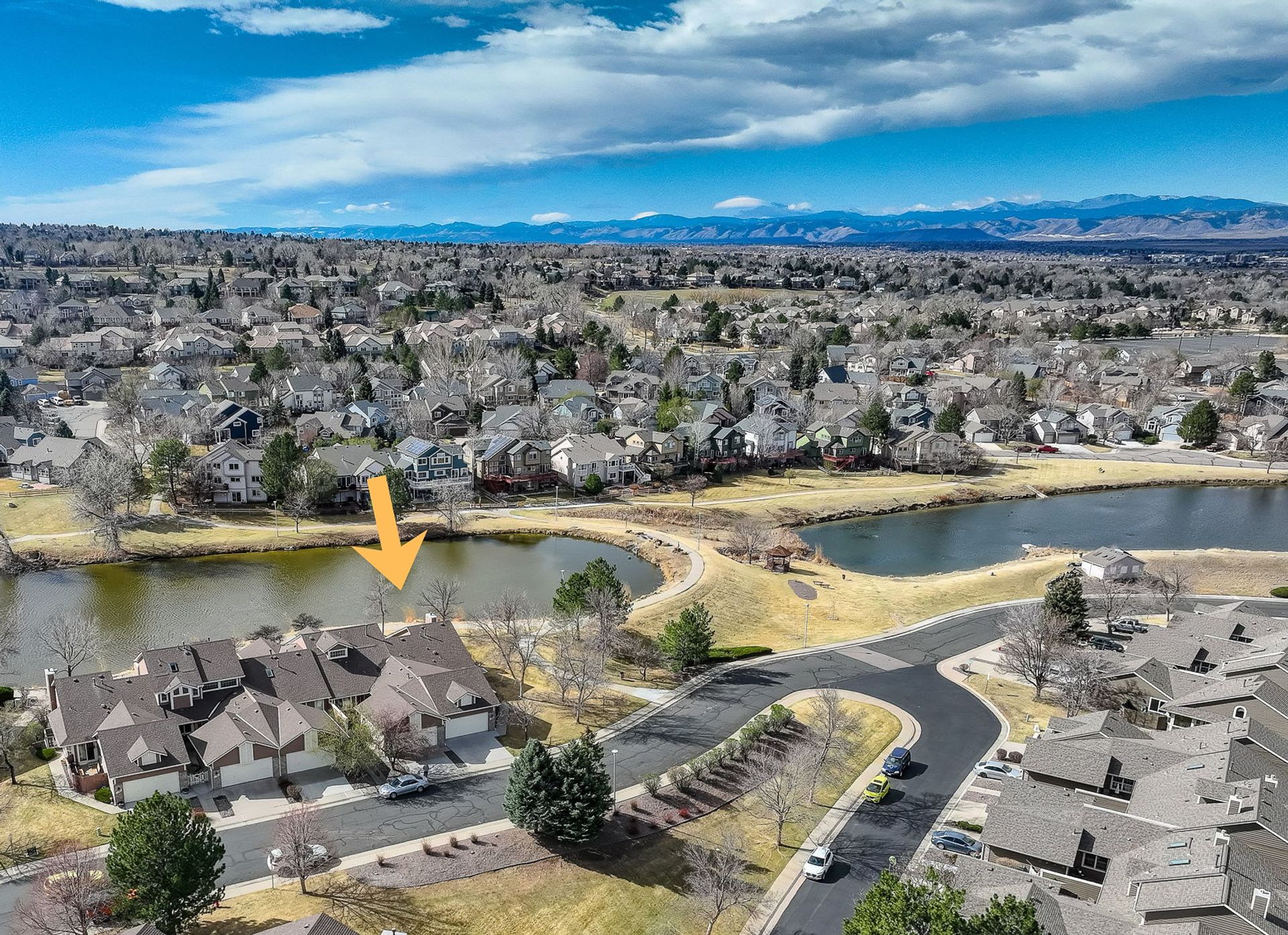Incredible location! This beautiful end-unit townhome is just steps from a peaceful pond and offers stunning mountain views. Step inside to a spacious living room with soaring vaulted ceilings, a cozy fireplace, and an abundance of natural light. Solid wood doors add a touch of quality throughout, and brand-new carpeting has just been installed. The primary bedroom features vaulted ceilings and an updated en-suite bath with granite countertops, new sinks and fixtures, a sliding barn door, and new shower and floor tile. The secondary bedroom offers flexibility as a guest room or home office. You’ll love preparing meals in the spacious kitchen, complete with granite countertops, hardwood floors, pull-out shelves, a separate bank of glass-front cabinets, and a water filtration system. All the appliances are high-quality and stainless steel, including a newer Bosch dishwasher and range hood. The sunny kitchen nook is the perfect spot to relax, dine, and take in the mountain views. Enjoy two outdoor living spaces: a large, private deck just off the kitchen, and another with a retractable awning overlooking the pond—both offering beautiful mountain views. A separate mudroom leads to the insulated, finished two-car garage. The community features a clubhouse, tennis courts, and an extensive network of trails winding past tranquil ponds and showcasing breathtaking mountain views.