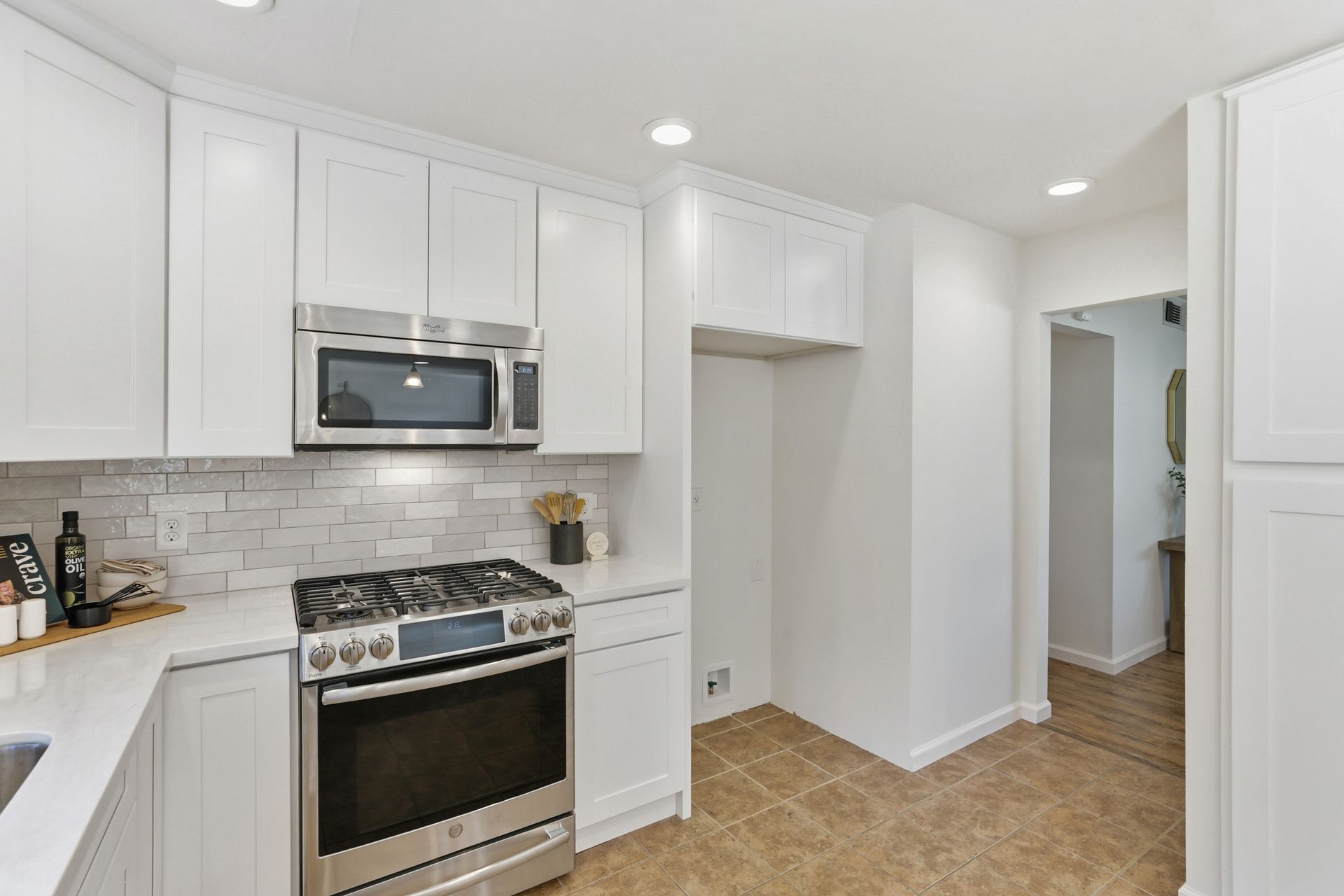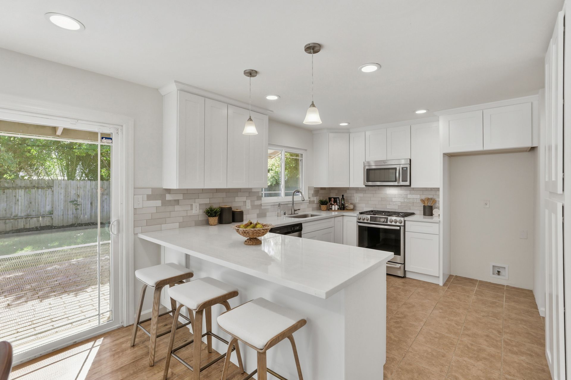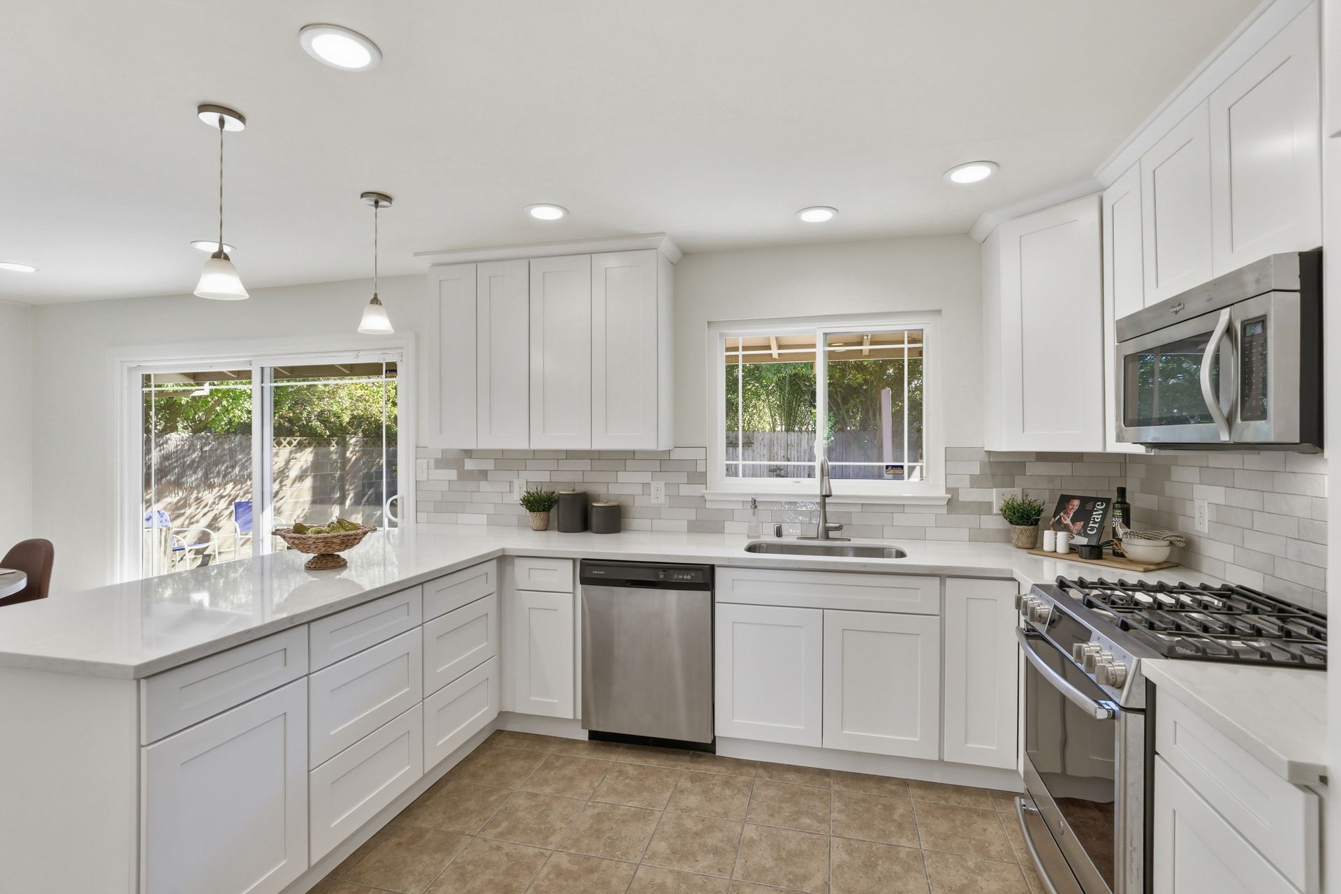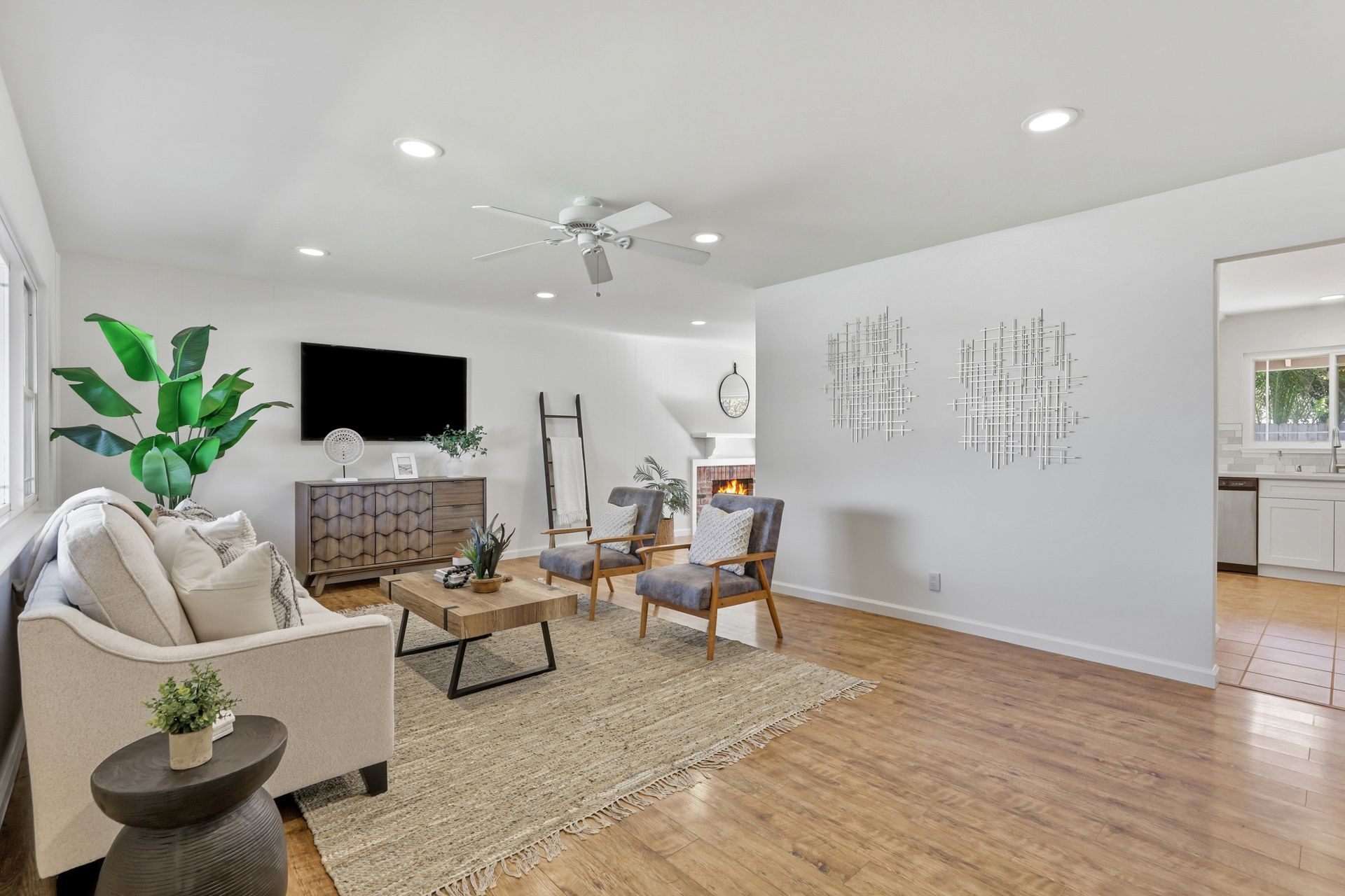 A newly installed roof and newer copper plumbing offer peace of mind for years to come. The beautifully remodeled kitchen shines with quartz countertops, custom cabinetry, a stunning tile backsplash, and recessed lighting that brightens every corner. The cozy fireplace adds a touch of ambiance to the open dining area, ideal for gathering with friends or unwinding after a long day. Enjoy laminate flooring in the main livable spaces, plush carpet in the bedrooms, and updated bathrooms that blend function with modern design. Outside, a private backyard retreat offers the ideal backdrop for morning coffee, weekend BBQs, or simply soaking in the serenity.