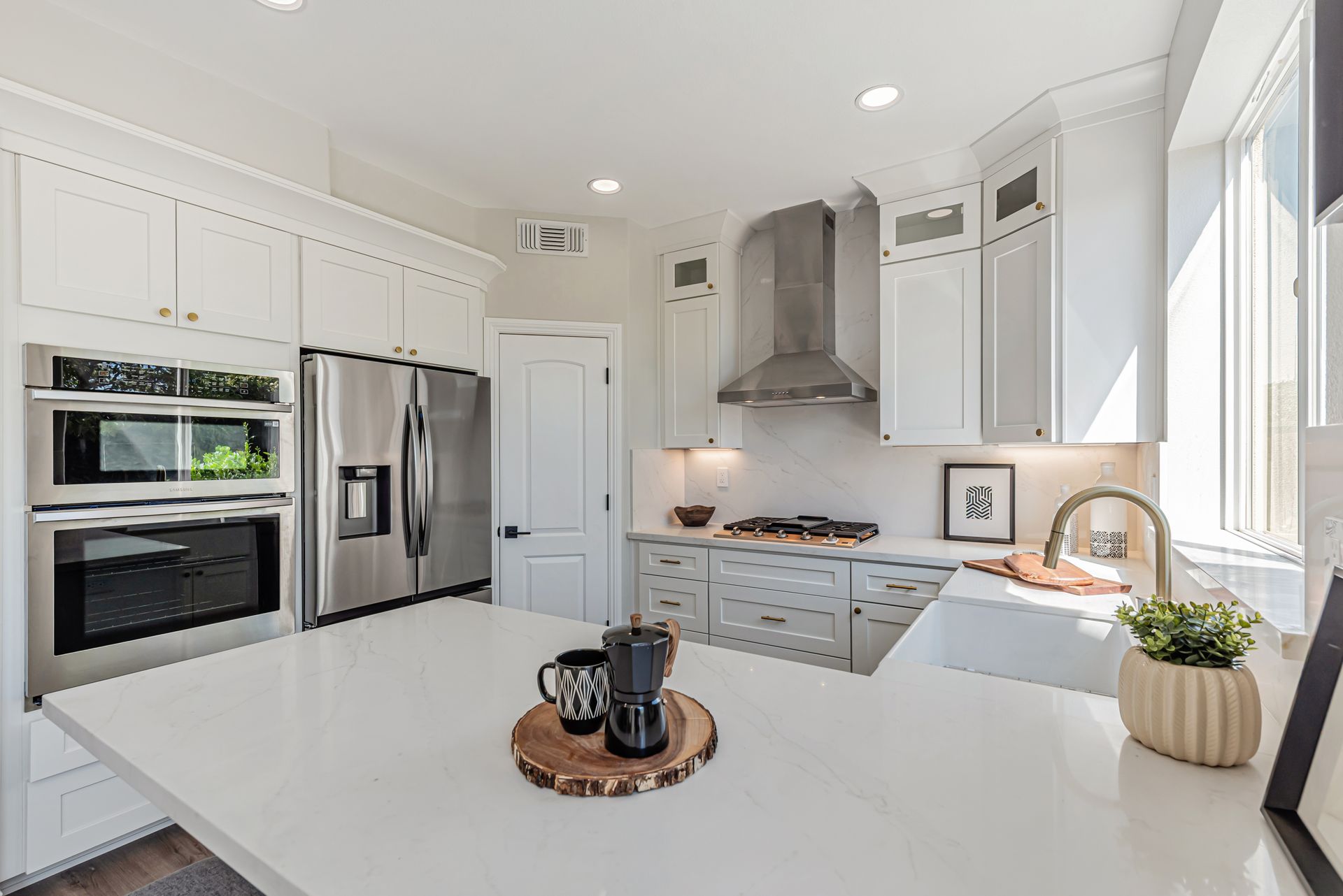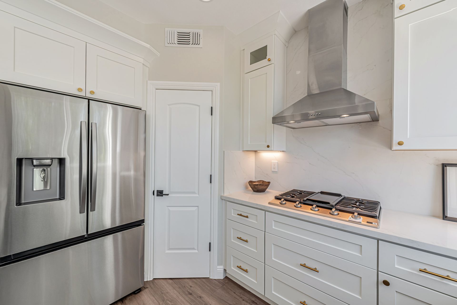 The heart of the home is a stunning, remodeled kitchen featuring quartz countertops, shaker-style soft-close cabinets, Samsung stainless steel appliances including a gas cooktop, built-in oven and microwave, a pantry, and a breakfast bar. A spacious formal dining room with a sleek LED fireplace and a dramatic living room with vaulted ceilings provide inviting spaces for entertaining.