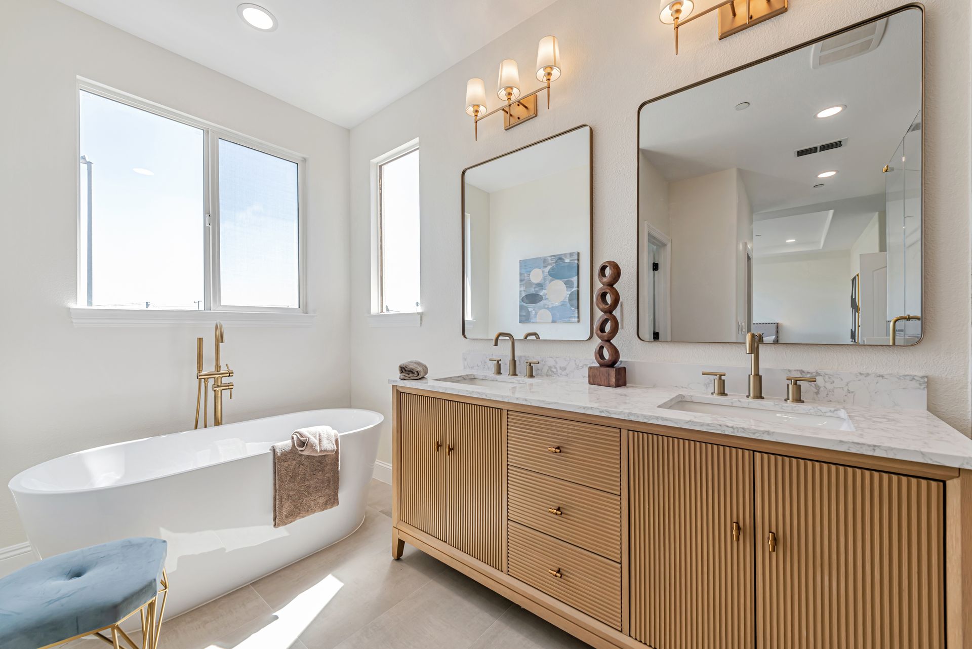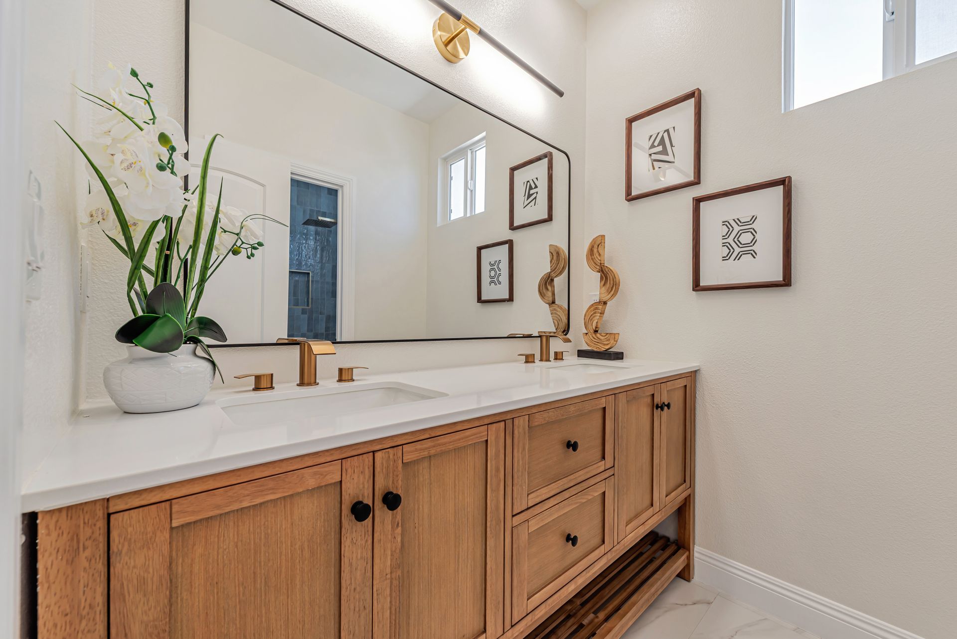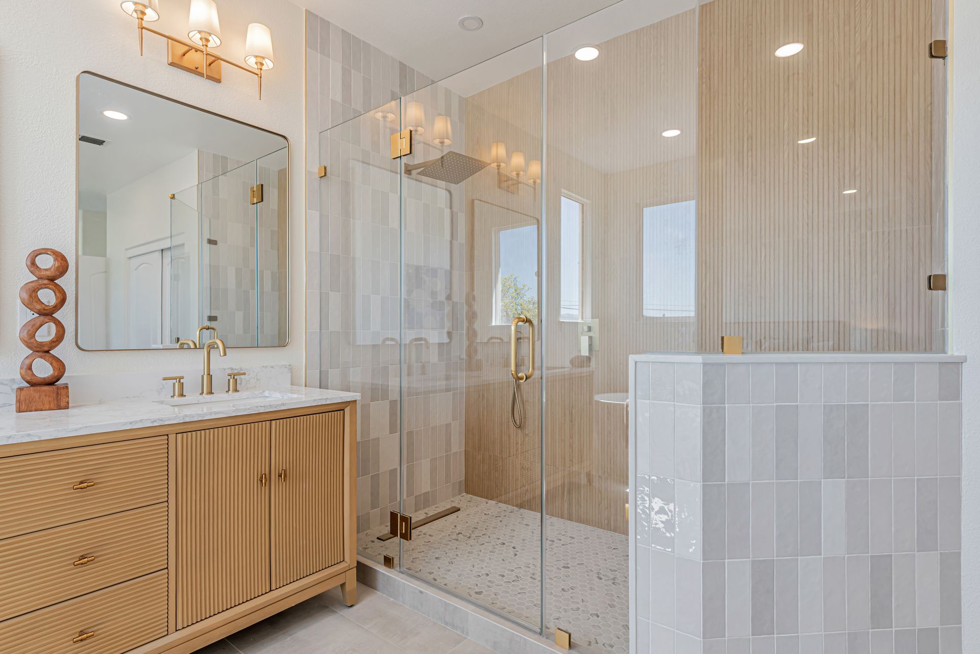 Upstairs, the primary suite offers coffered ceilings, a walk-in closet plus a second closet, and a remodeled spa-like bathroom with quartz-topped dual-sink vanity, oversized shower, soaking tub, and tile floors. Three additional bedrooms share a remodeled hall bath with dual sinks, tile floors, a tub/shower, and a rainforest shower head. There’s landscaped backyard with a patio area great for barbecues.