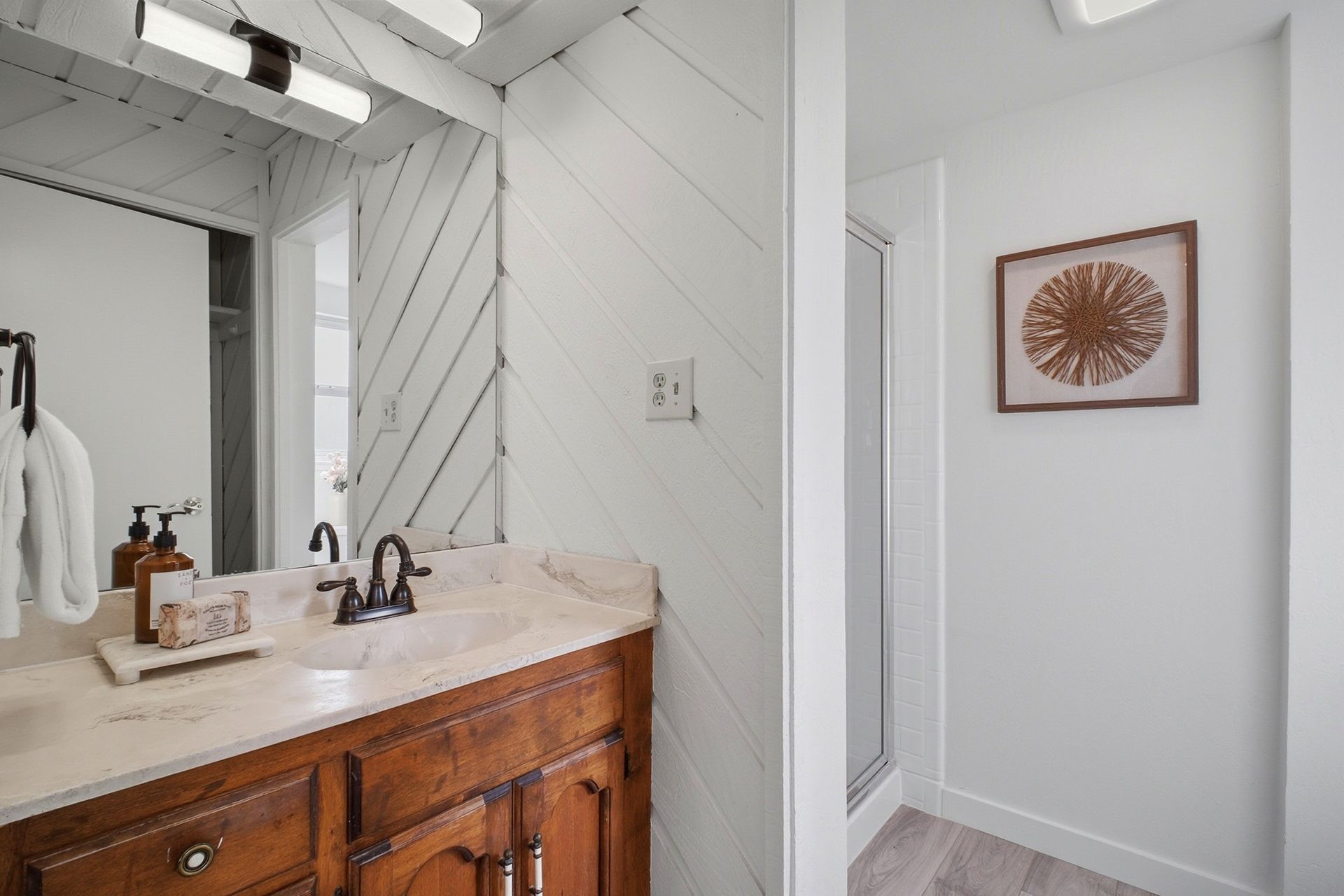 The interior has been freshly painted and features new carpet, giving the home a clean, refreshed, and welcoming feel. The layout offers excellent flow with an eat-in kitchen featuring wood cabinets, connected to the dining area, as well as a formal living room ideal for gatherings and entertaining. The downstairs bathroom has been upgraded with a new shower, floor, and updated fixtures, adding comfort and convenience.