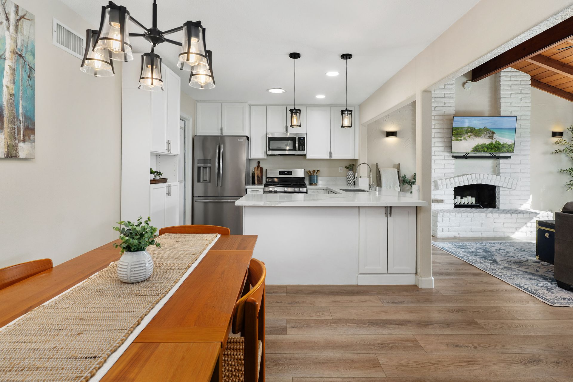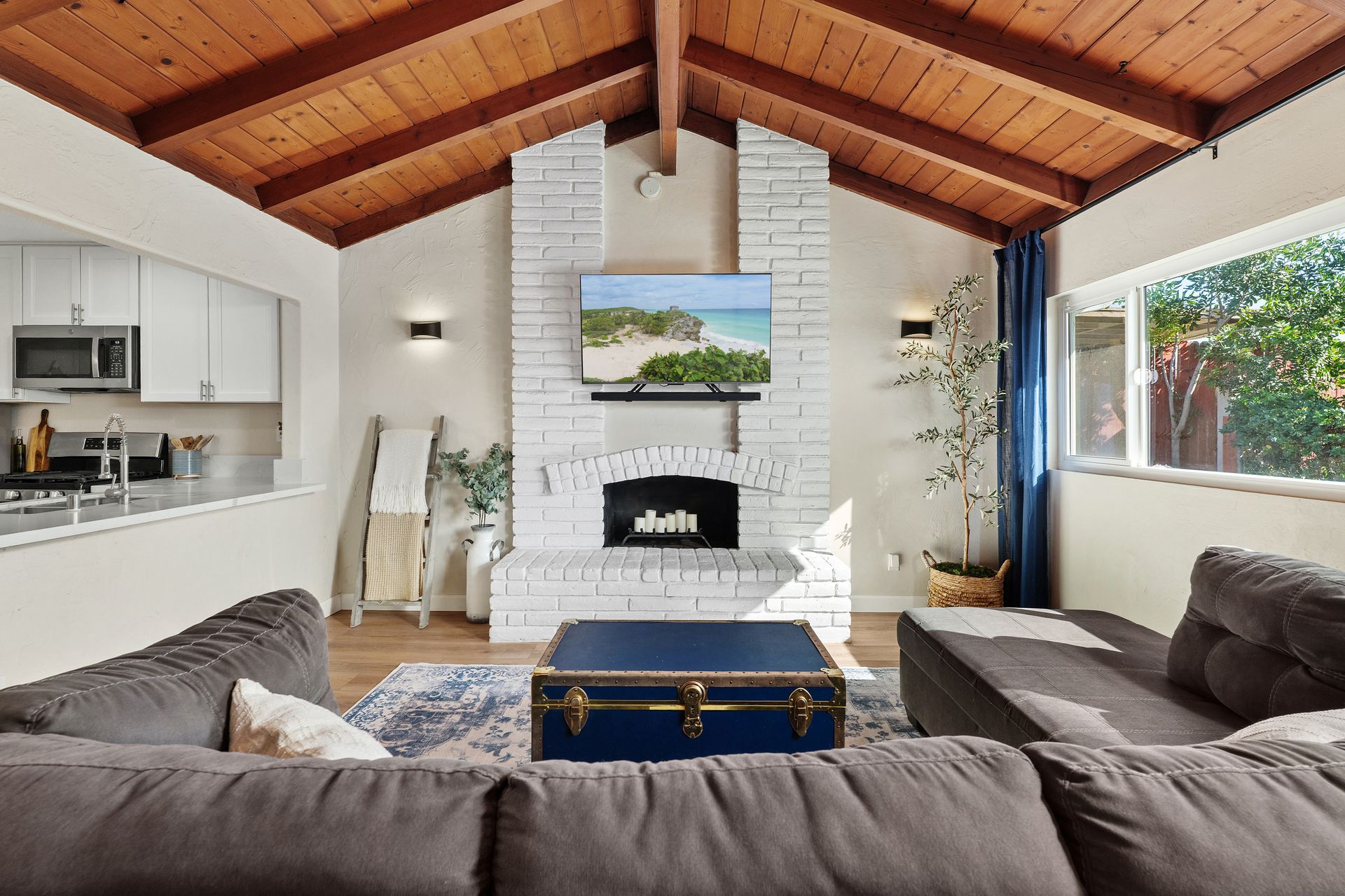 The open-concept kitchen and dining area flow seamlessly into the expansive family room, which is highlighted by a vaulted wood ceiling with exposed beams and filled with natural light from updated dual-pane windows and a sliding glass door overlooking the backyard. The redesigned kitchen offers quartz countertops, white cabinetry, and stainless steel appliances, creating a clean, timeless space for daily living and entertaining. A separate living room with a cozy fireplace provides an additional retreat.