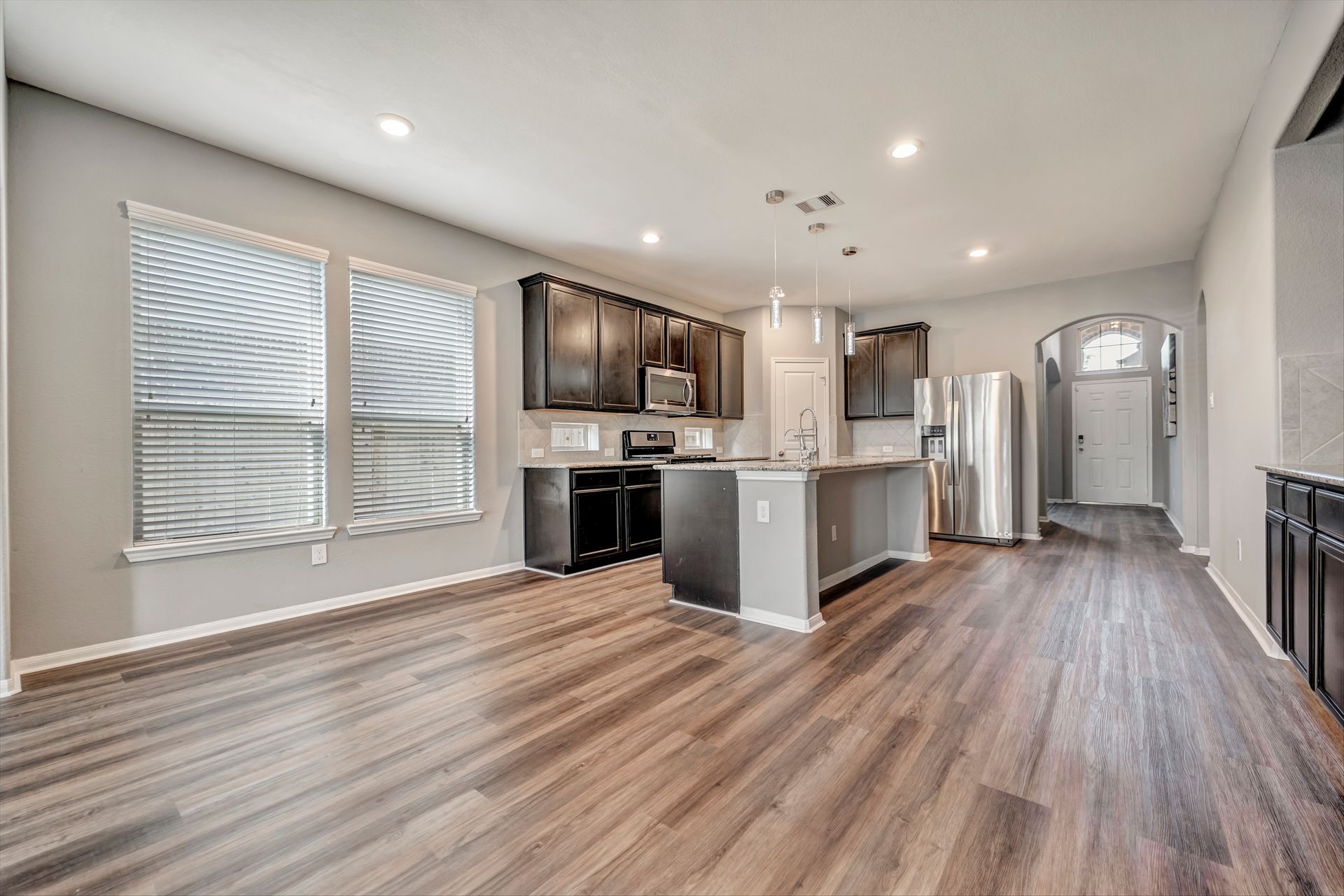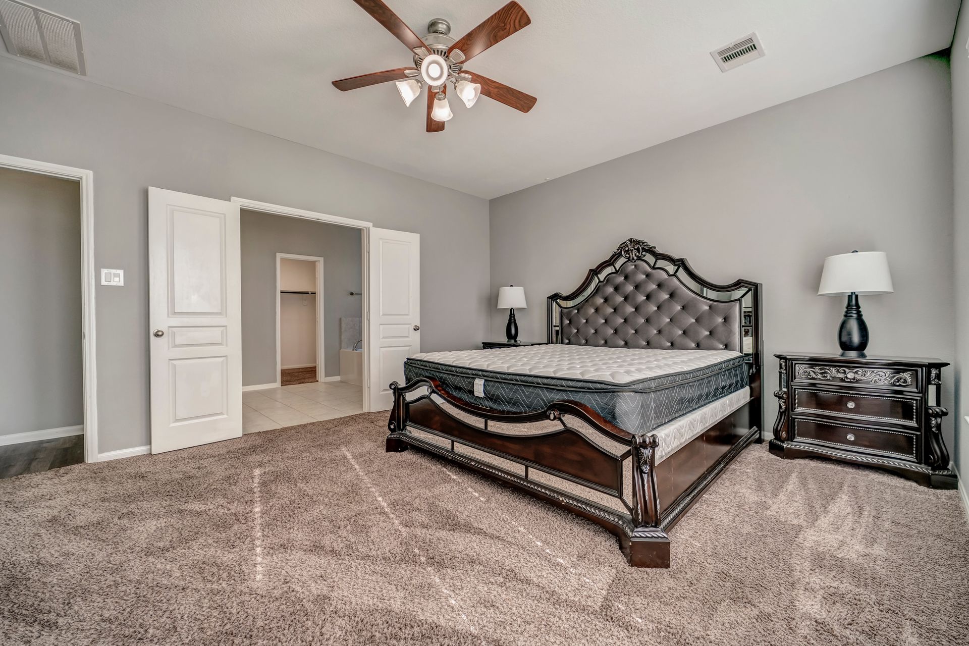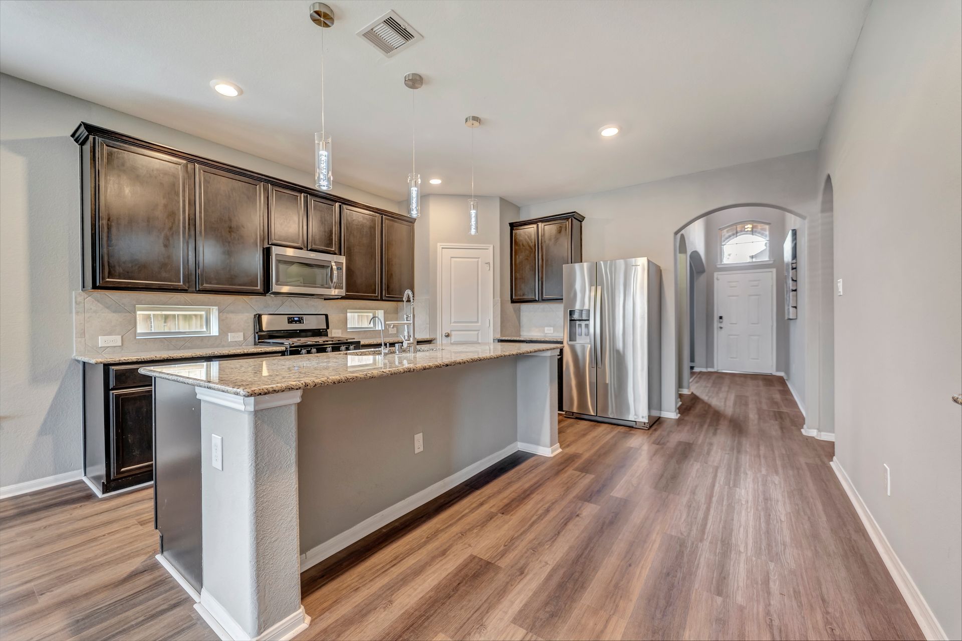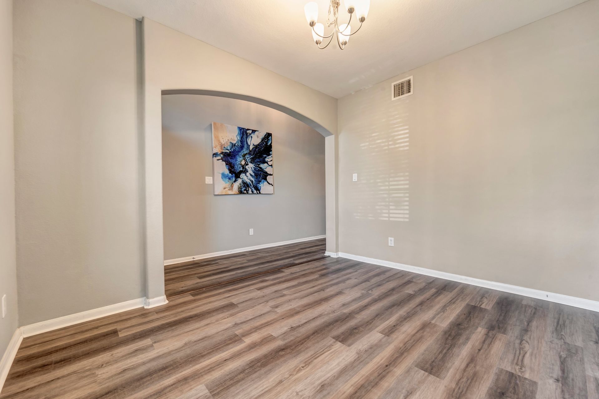 As you come through the front door onto the vinyl plank flooring, your dining room is on the front right side. Traveling down the entryway and entering the kitchen, you see a granite-top kitchen island. A butler pantry is perfect for your fine china and setting up your coffee maker. The kitchen features a five-burner gas stove and two deep sinks. Pendant lighting hangs above the kitchen island. There is plenty of countertop space and cabinets to make meal preparation fun. The water softener and reverse osmosis system provide clean drinking water. The large living room offers a huge wall for that large TV screen. As you go through the primary bedroom, which has plenty of room for your dressers, you enter the bathroom with a bench and soaking tub. There is also access to the laundry room from the primary closet. A private room is available for you to work during the day. Upstairs, there is a game room, three bedrooms, and a bathroom. Carpet is installed throughout the upstairs.