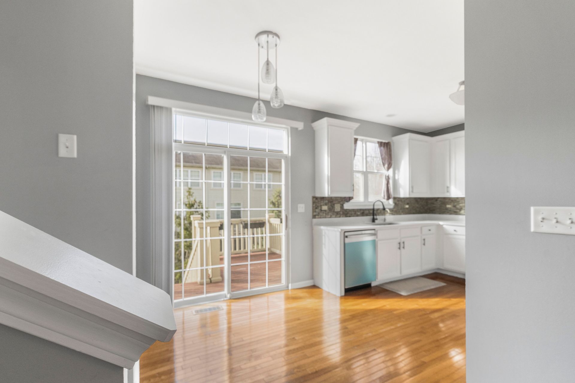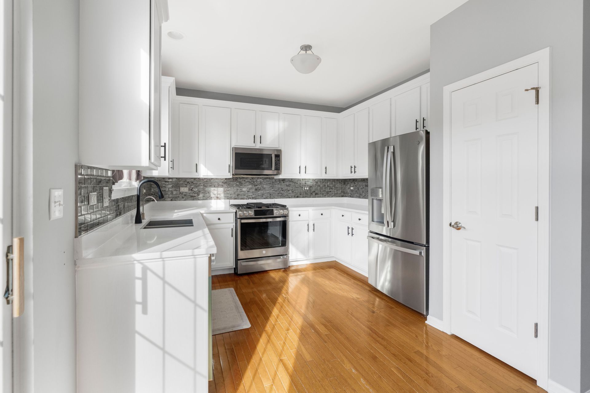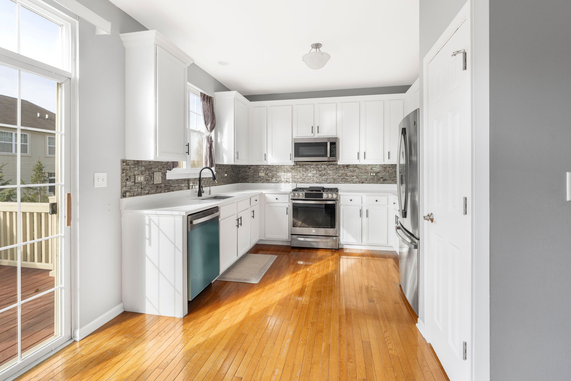 The stunning renovated kitchen includes quartz countertops, white cabinetry, custom backsplash, and brand-new fingerprint-resistant stainless steel appliances (2025), with direct access to a cozy private deck—perfect for everyday living and entertaining.