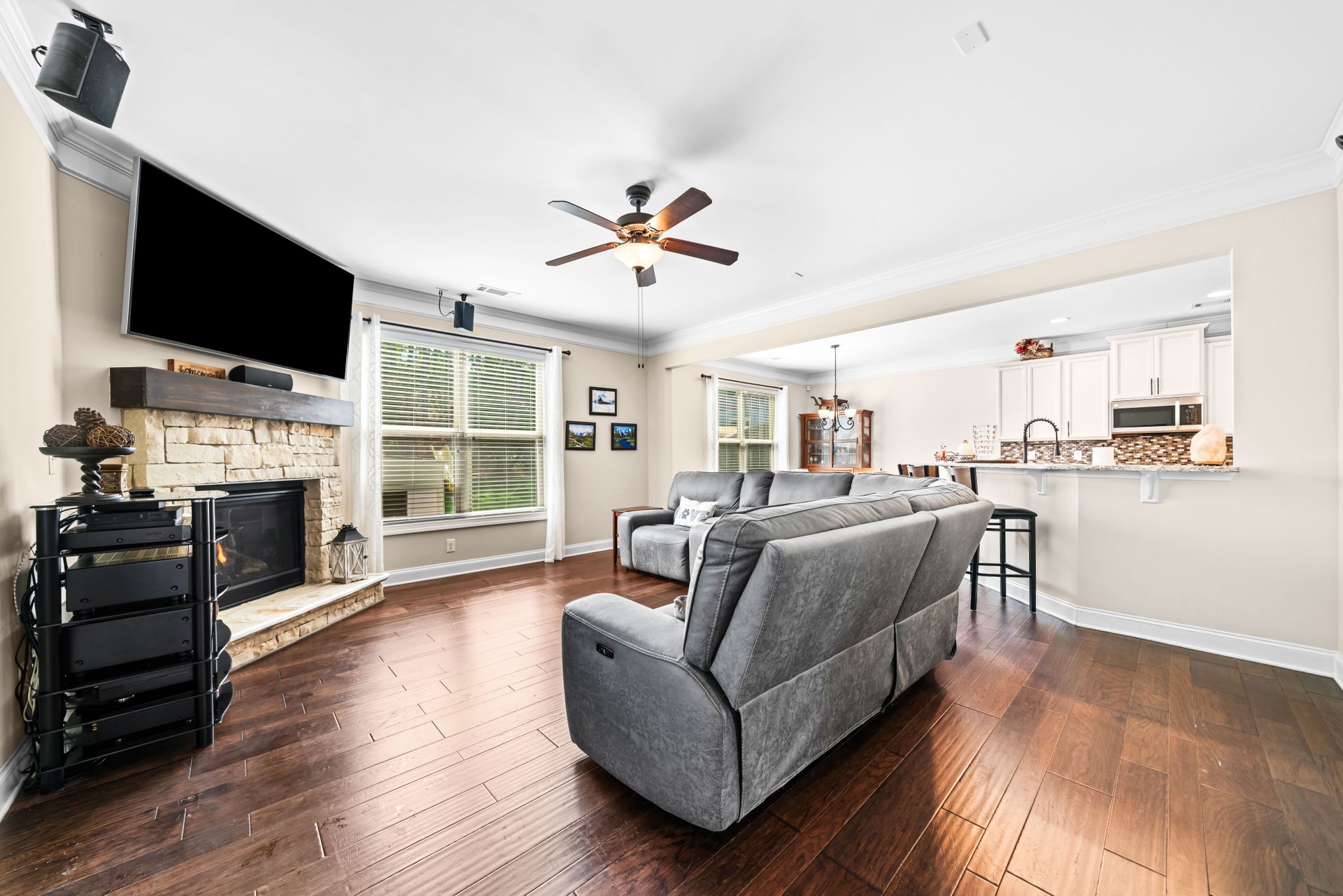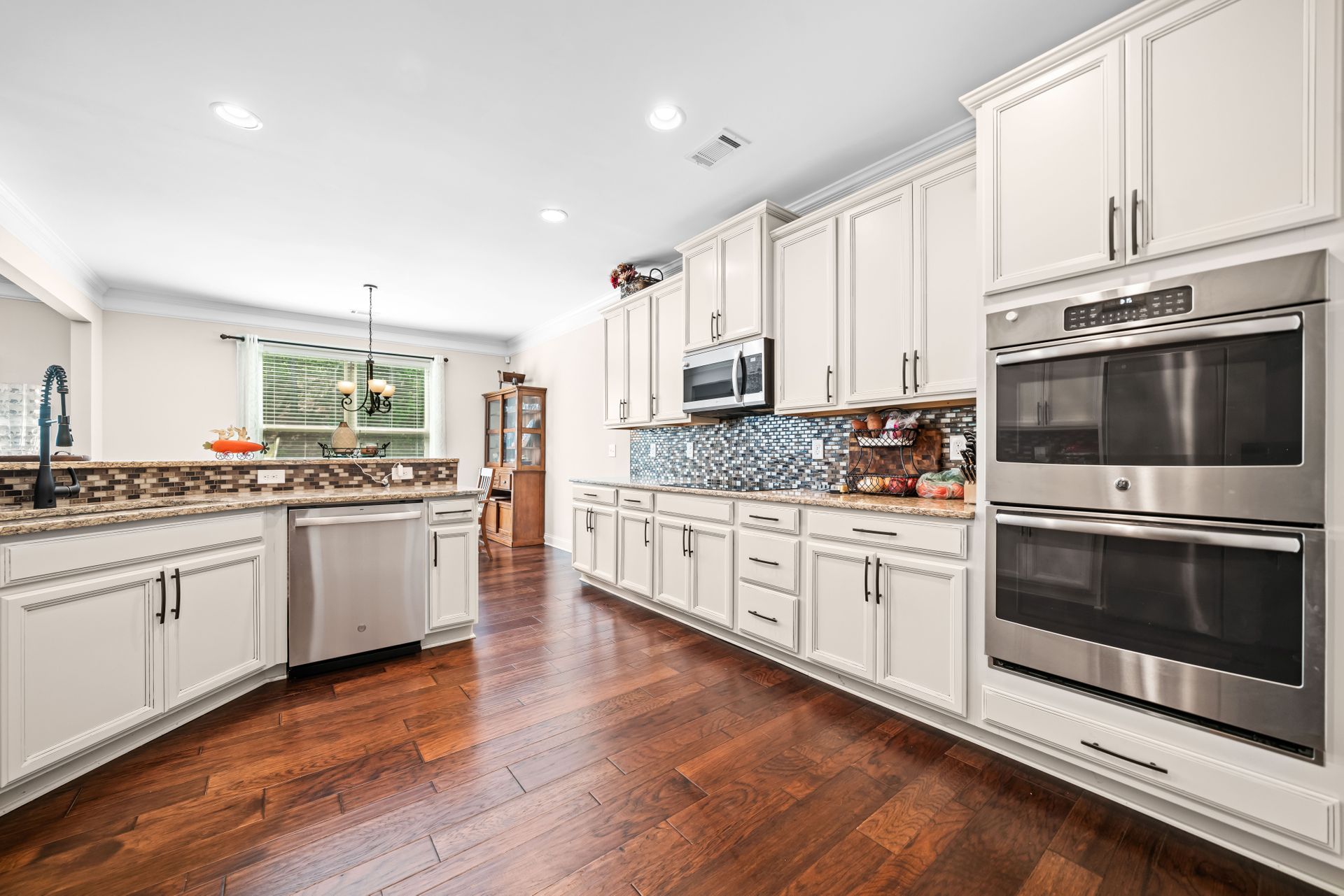 The heart of the home is the gourmet kitchen, outfitted with stunning quartz countertops, double built-in ovens, an induction electric cooktop, and custom cabinetry, perfect for both everyday meals and entertaining guests in style. Rich, wood floors flow seamlessly throughout the main level, adding warmth and sophistication.