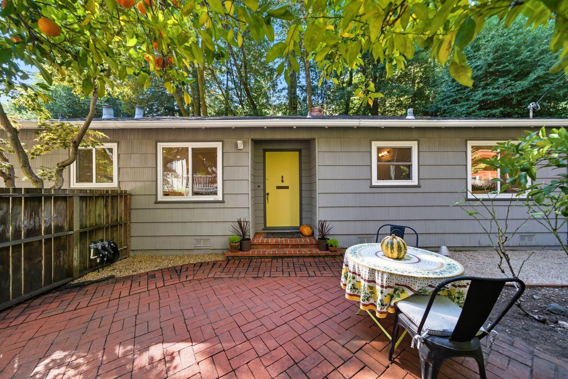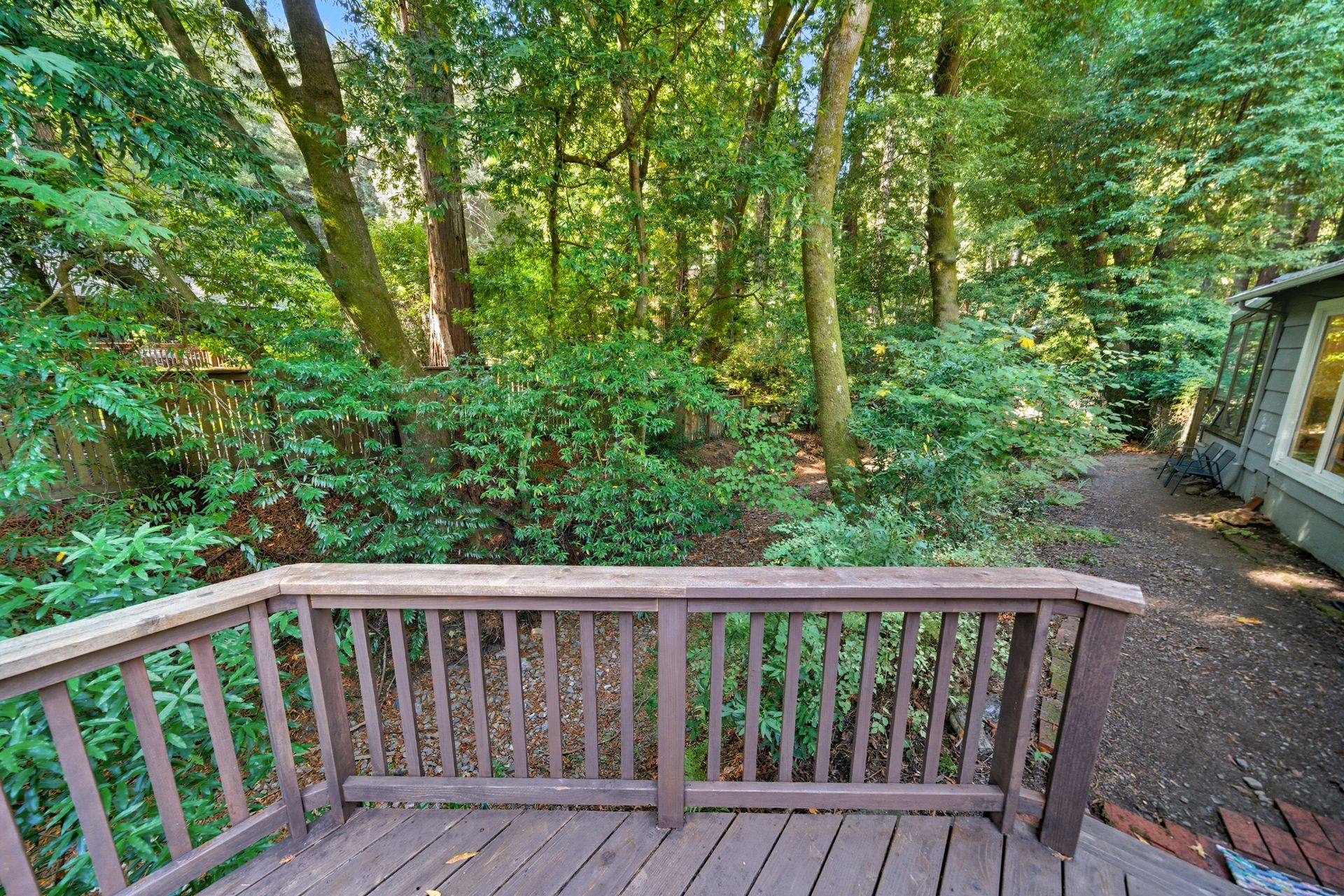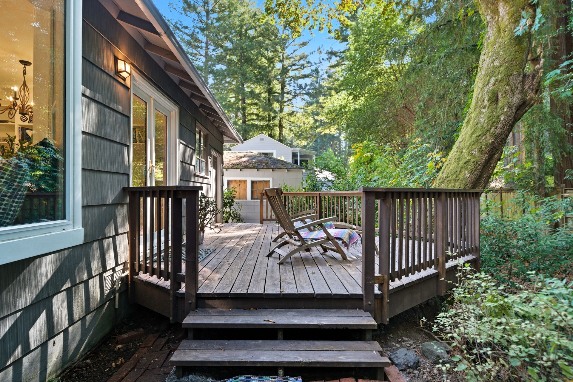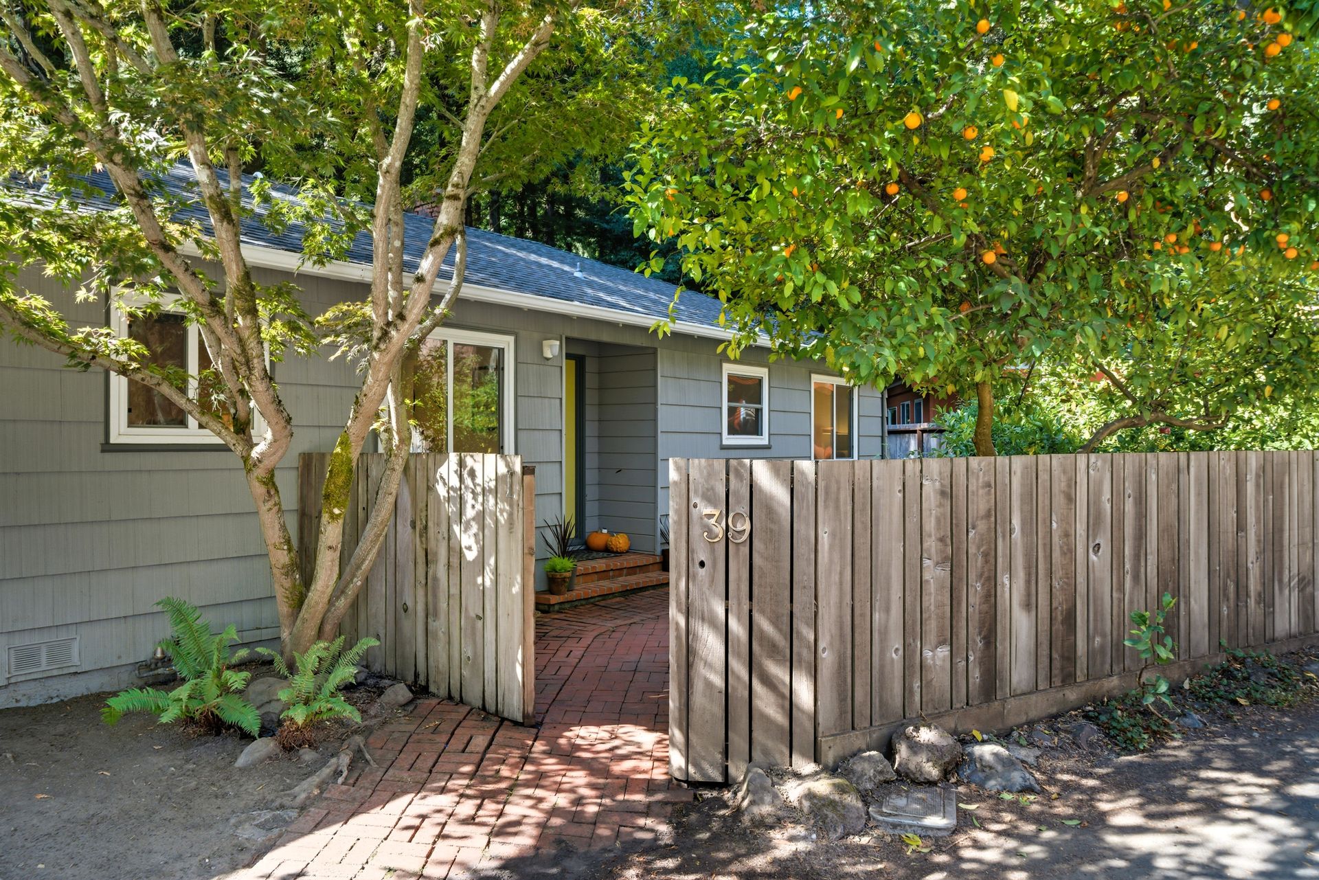 If you've ever wondered how it would feel to live in a gorgeous state park, come see 39 Bridge Road in Larkspur, California. Here inspiring birdsong and gosun break through the towering redwoods throughout the day. This incredibly peaceful single-level home is near the entrance to Baltimore Canyon. A charming front patio and gorgeous citrus trees welcome you home to a front entry and gracious living/dining room with a wood burning fireplace, built-in bookshelves, a large bay window with a cozy window seat, and French doors opening to a deck perched over the beautiful seasonal creek. There's a super attractive and updated eat-in kitchen, two lovely bedrooms, one and one-half baths, and a custom crafted sunroom/office tucked away off the primary bedroom, with its own entrance. There's a one-car garage and space ideal for expansion (check with city.) Larkspur offers residents excellent public schools, world class hiking, great shops and restaurants and a close knit community that gets together for cultural events and celebration. Best of all, you'll awaken every day inspired by the tranquil majesty of redwoods all around you. They are the true kings among us, and living among them is a healthy and beautiful thing. Perry's is also right down the road.