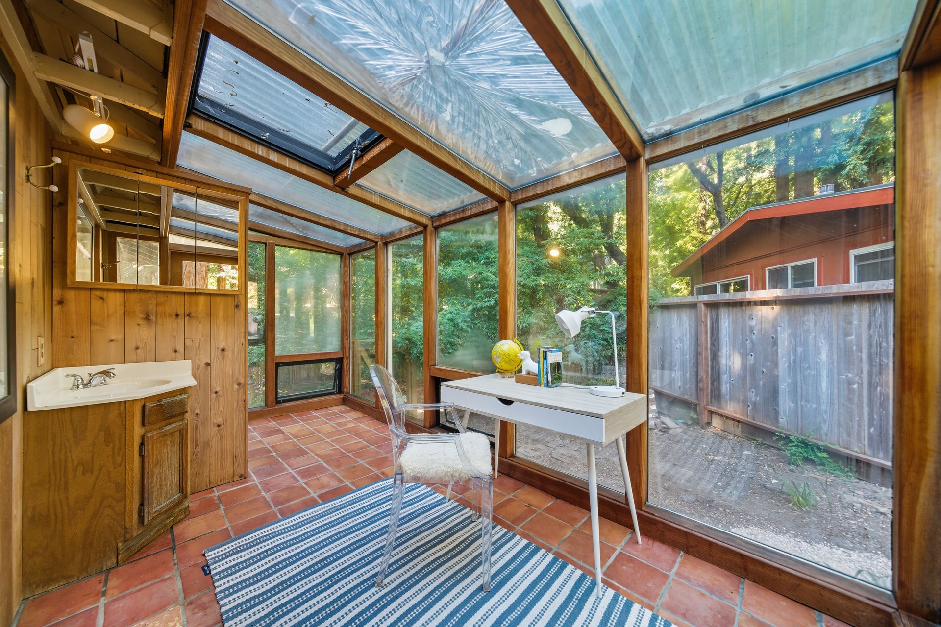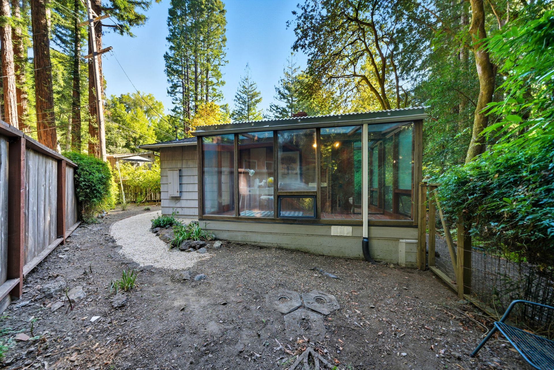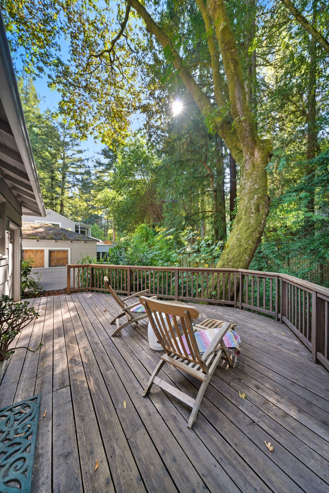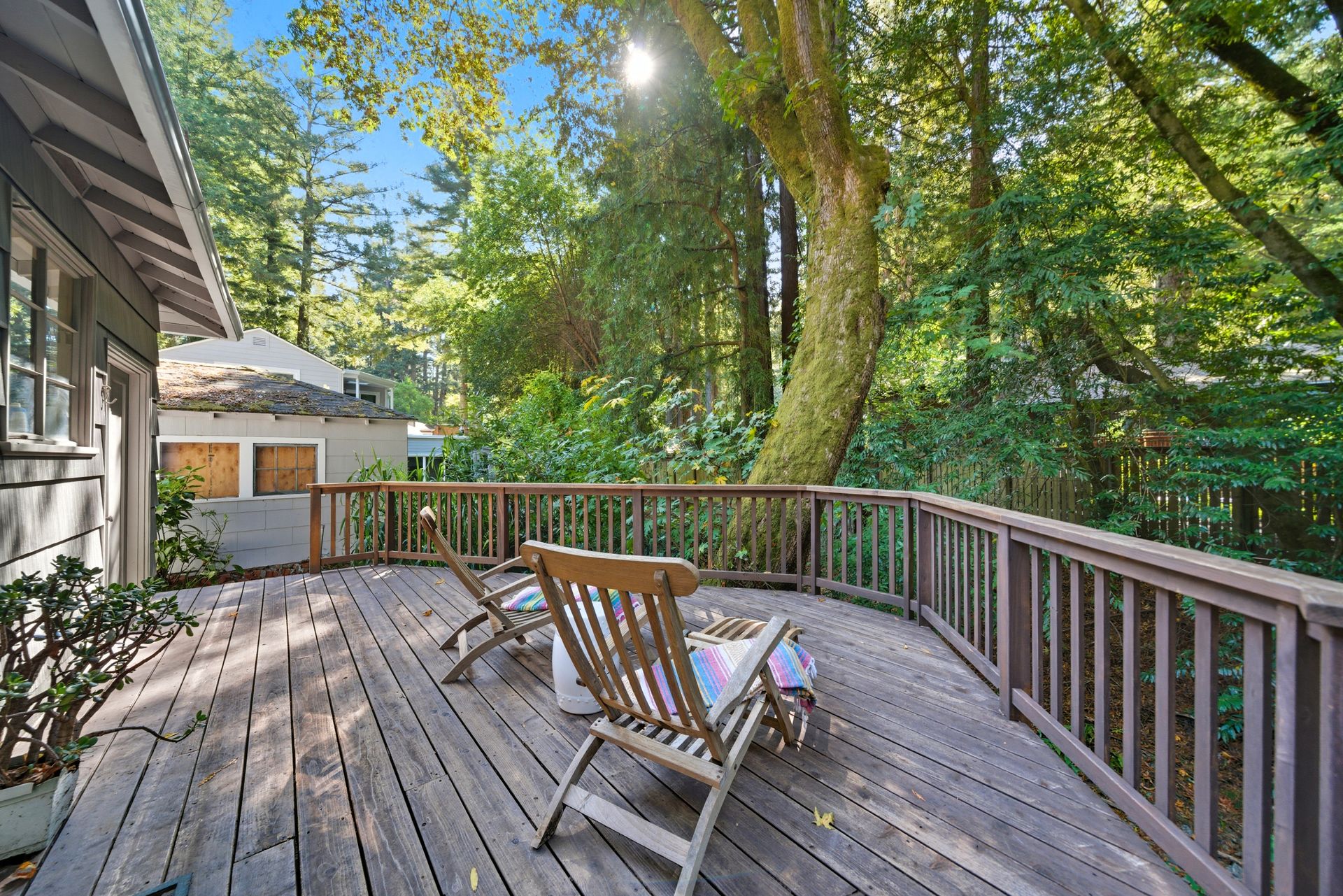 If you've ever wondered how it would feel to live in a gorgeous state park, come see 39 Bridge Road in Larkspur, California. Here inspiring birdsong and gosun break through the towering redwoods throughout the day. This incredibly peaceful single-level home is near the entrance to Baltimore Canyon. A charming front patio and gorgeous citrus trees welcome you home to a front entry and gracious living/dining room with a wood burning fireplace, built-in bookshelves, a large bay window with a cozy window seat, and French doors opening to a deck perched over the beautiful seasonal creek. There's a super attractive and updated eat-in kitchen, two lovely bedrooms, one and one-half baths, and a custom crafted sunroom/office tucked away off the primary bedroom, with its own entrance. There's a one-car garage and space ideal for expansion (check with city.) Larkspur offers residents excellent public schools, world class hiking, great shops and restaurants and a close knit community that gets together for cultural events and celebration. Best of all, you'll awaken every day inspired by the tranquil majesty of redwoods all around you. They are the true kings among us, and living among them is a healthy and beautiful thing. Perry's is also right down the road.