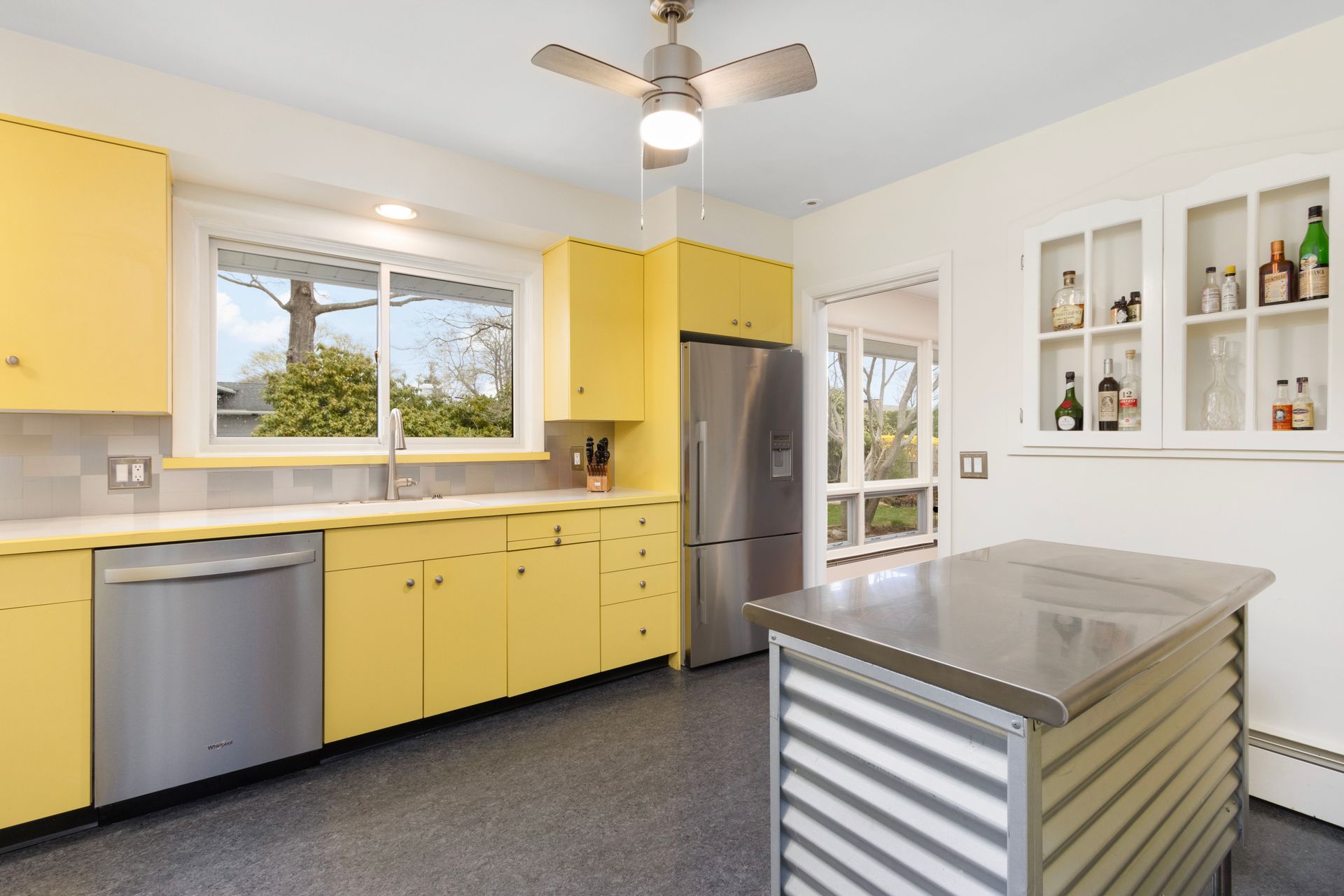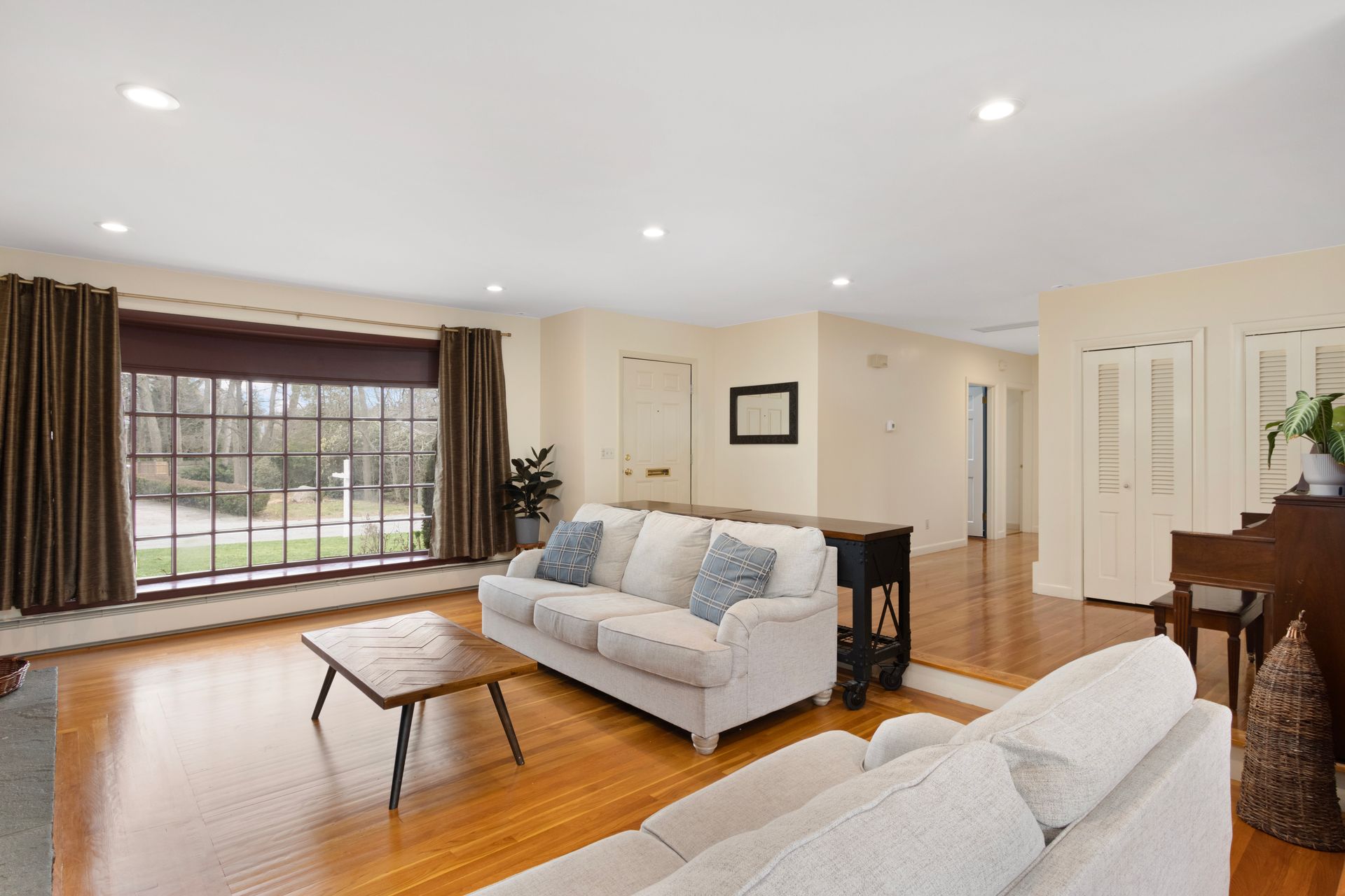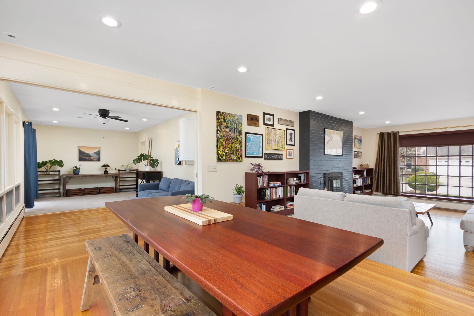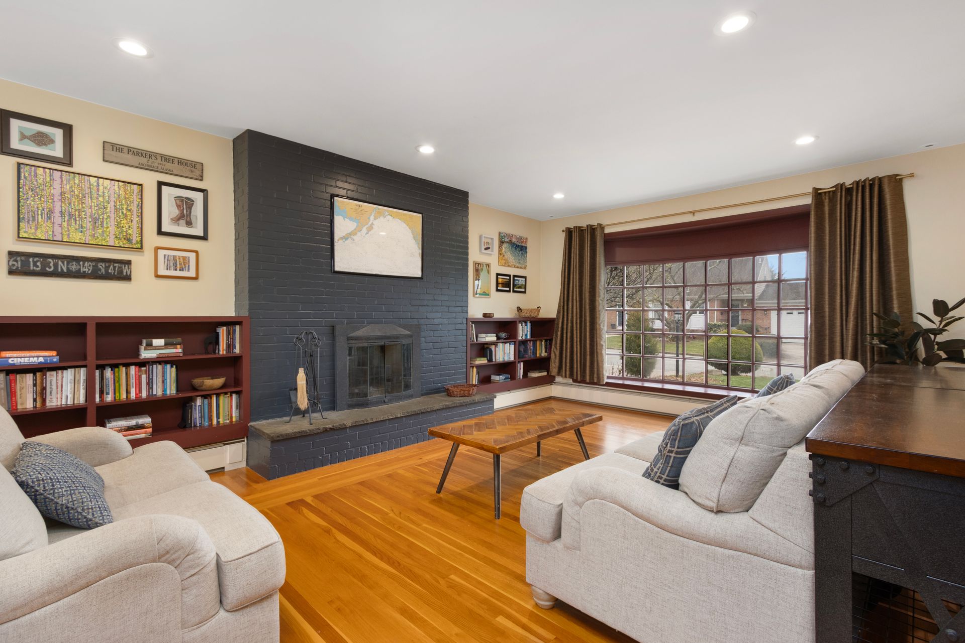 Experience true one-level living, complemented by a fully finished lower level ready to adapt to your needs. Natural light pours into the sunken living room, where a wood-burning fireplace anchors the space and invites you to settle in. The retro-style kitchen flows seamlessly into the dining area and den, creating a layout that works just as well for everyday living as it does for entertaining. The primary bedroom features an ensuite bath with a large soaking tub and separate shower, while two additional full bathrooms offer flexibility for family or guests. The finished lower level expands your living options with a second kitchen, built-in office, and ample storage, ideal for guests, working from home, or finally claiming a dedicated space for your hobbies. Outside, a paved driveway and walkway lead to a thoughtfully landscaped yard with mature plantings, perennials, underground sprinklers, and a storage shed. Additional highlights include central A/C, main-level laundry, and oil heat with gas available on the street for future conversion. Inquire for details on a potential assumable loan opportunity. A rare opportunity in sought-after Dean Estates, don’t miss it!