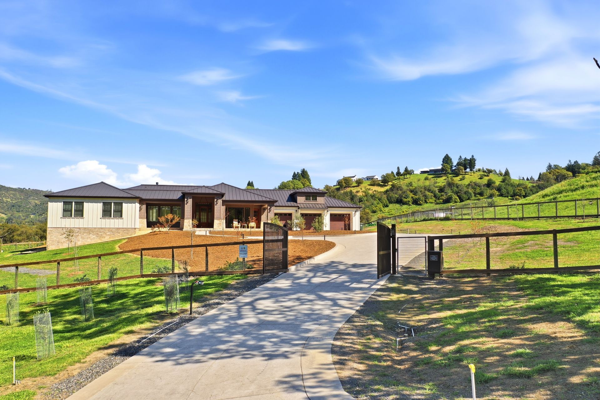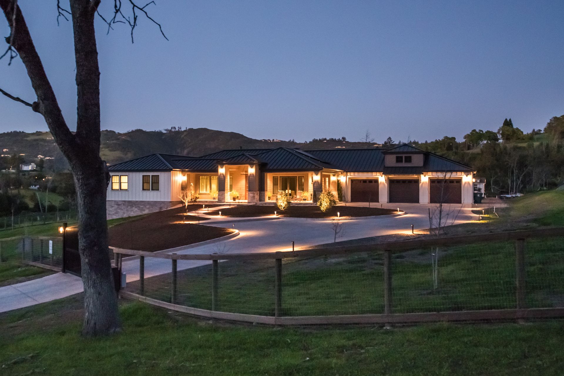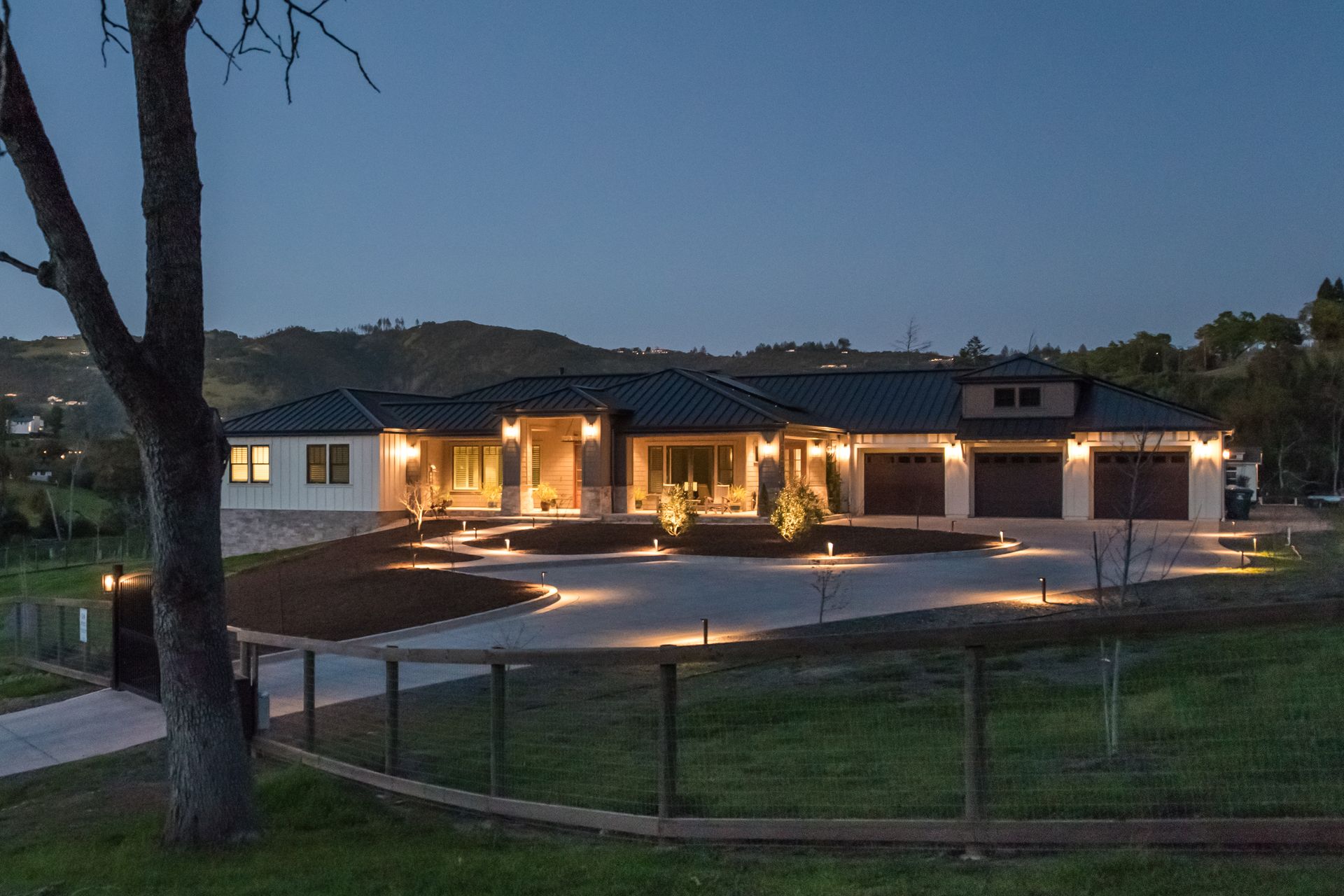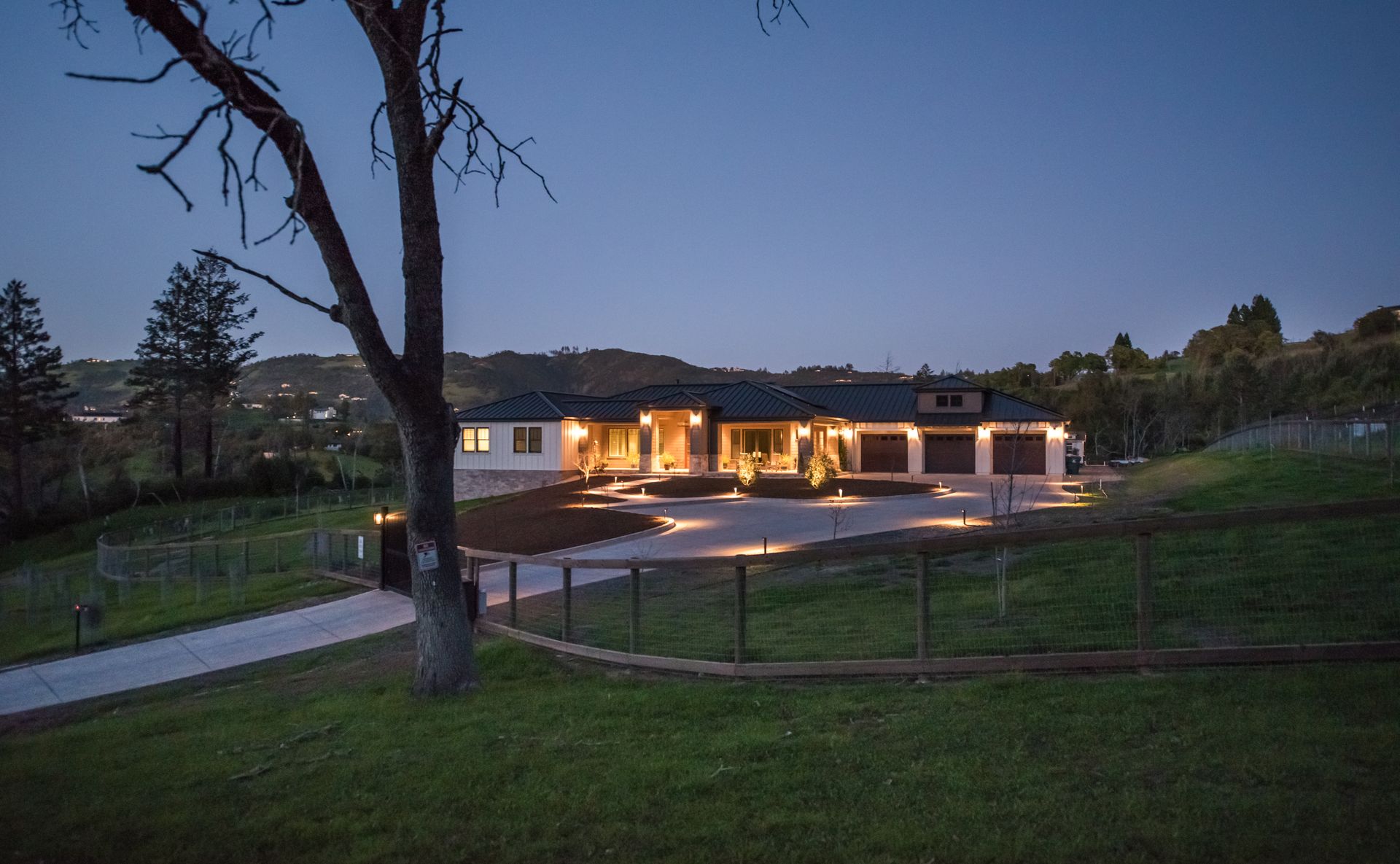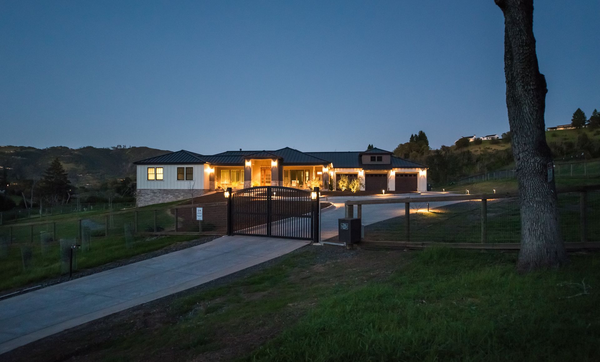 The main residence features three spacious bedrooms and three and one-half baths, complemented by a fully attached one bed, one bath ADU—ideal for guests or multi-level living. For the hobbyist, the oversized three-car garage includes a large integrated shop. As the sun sets, custom landscape lighting transforms the two-acre estate into a private, gated, glowing sanctuary.