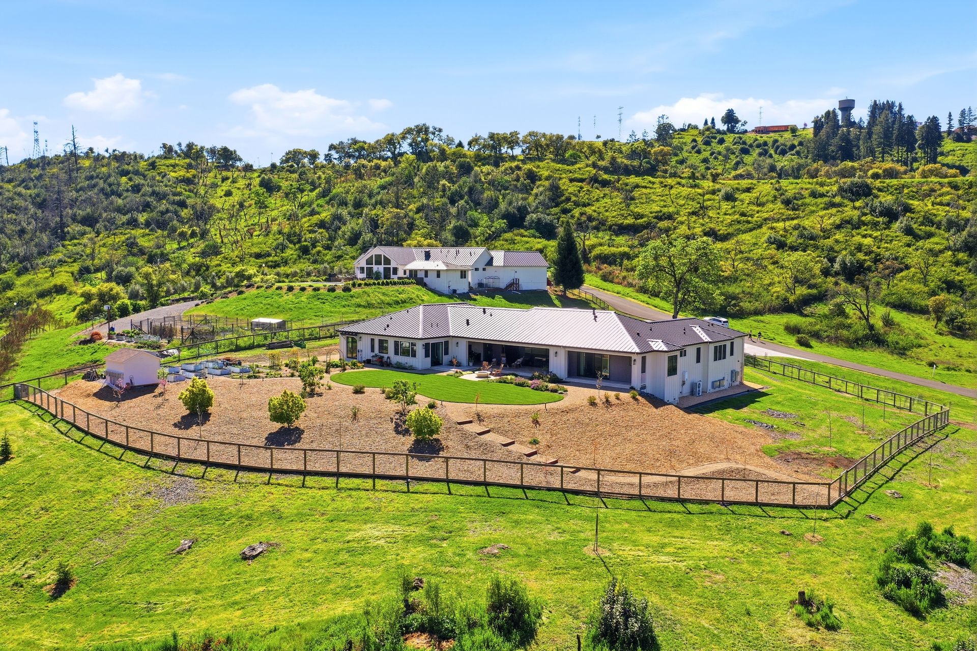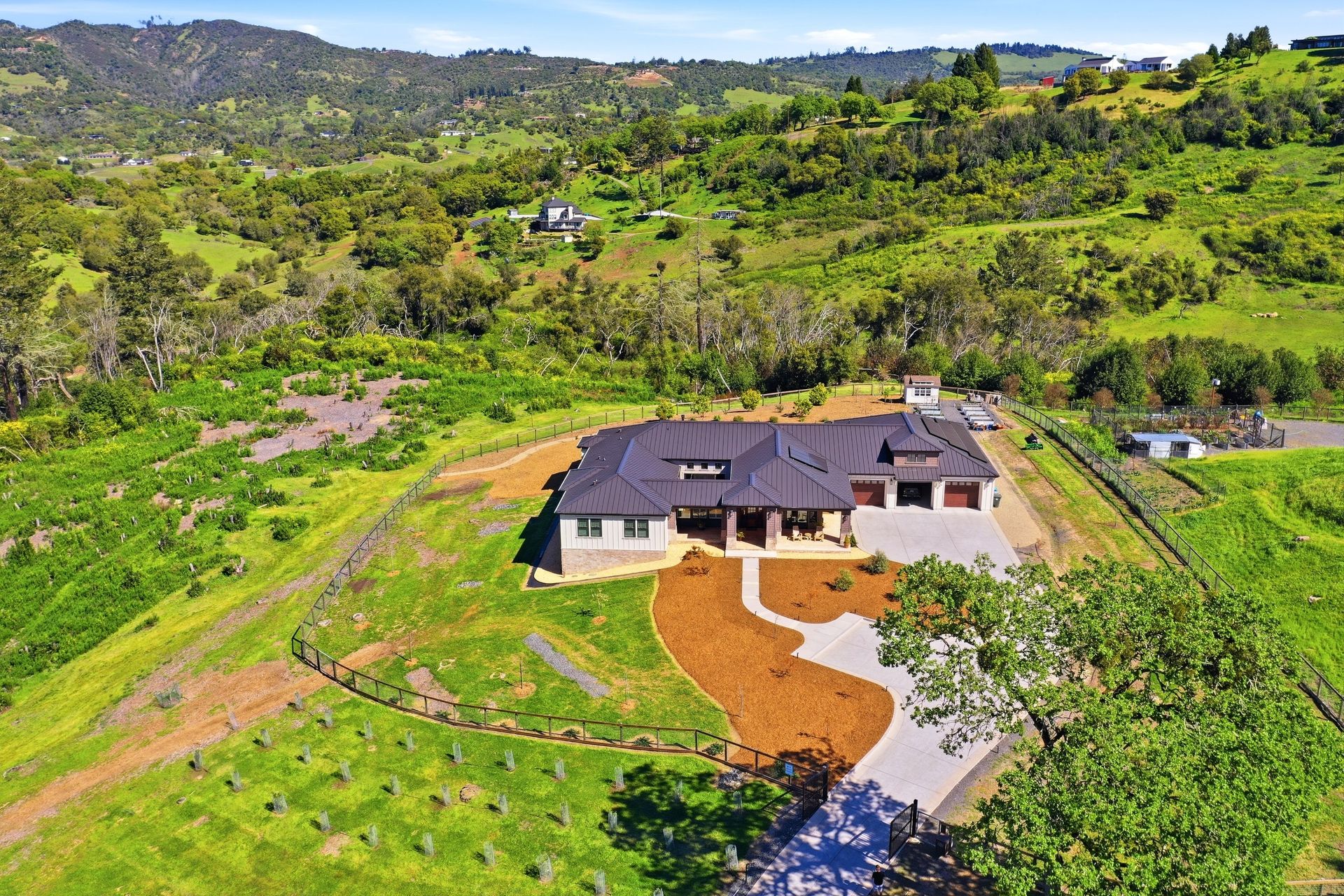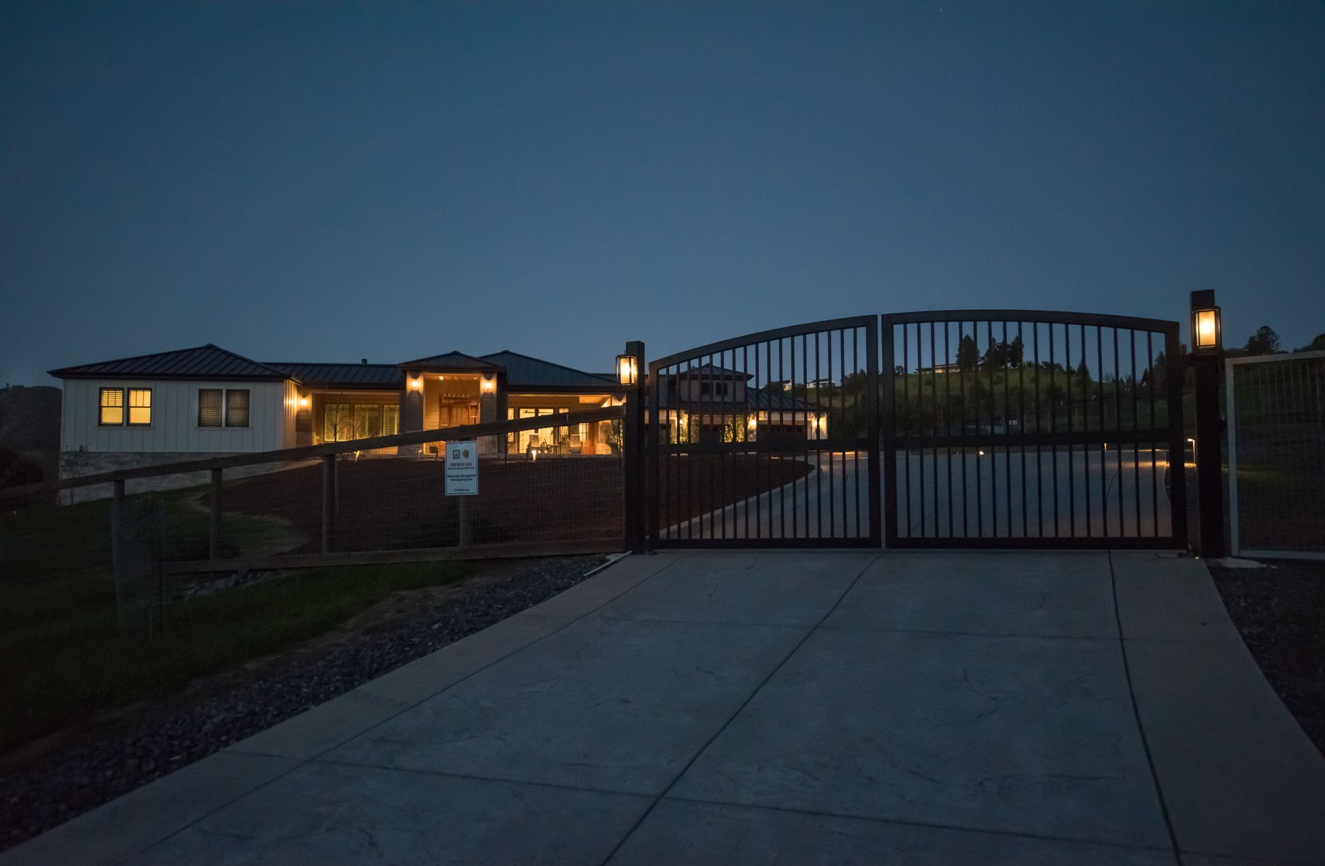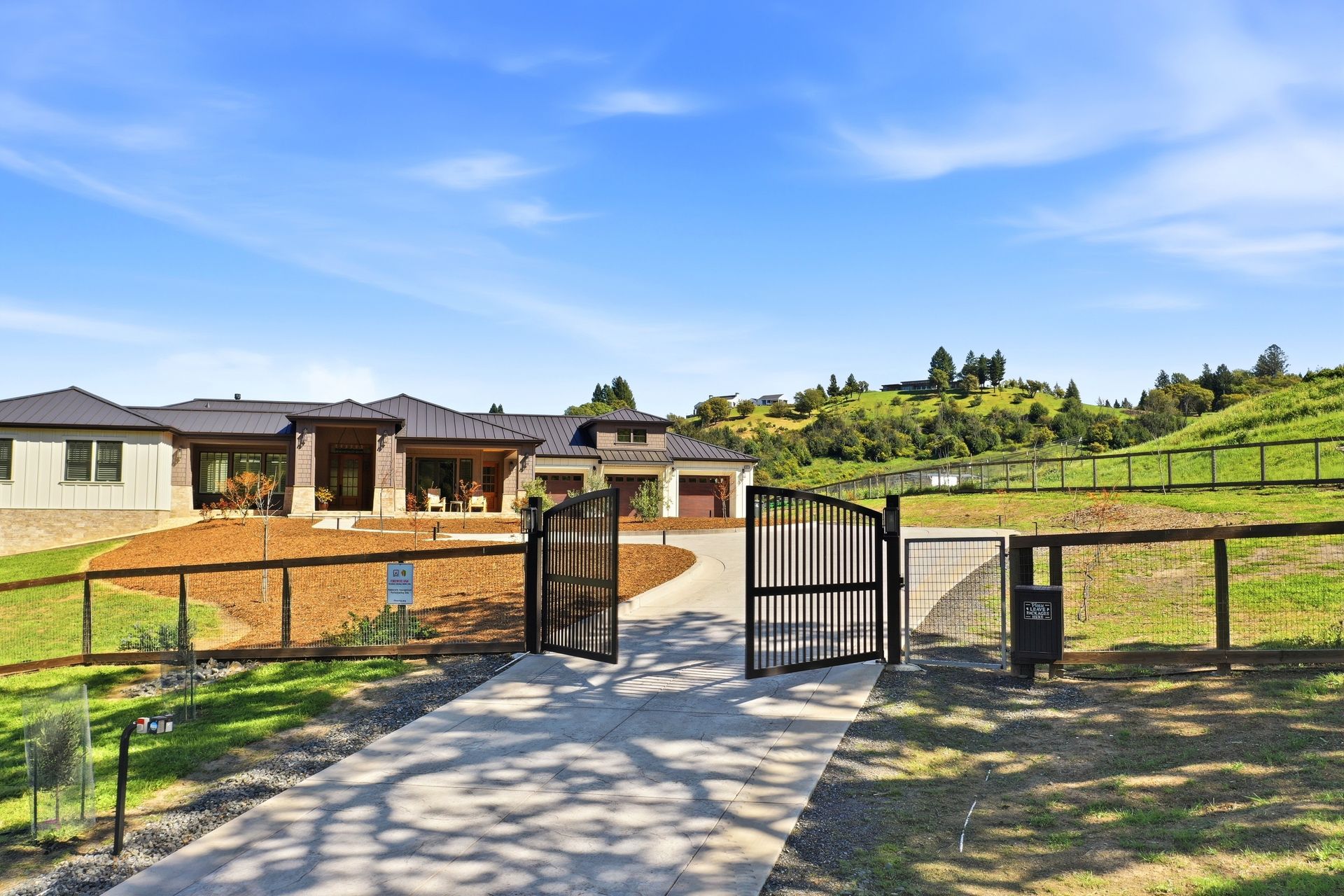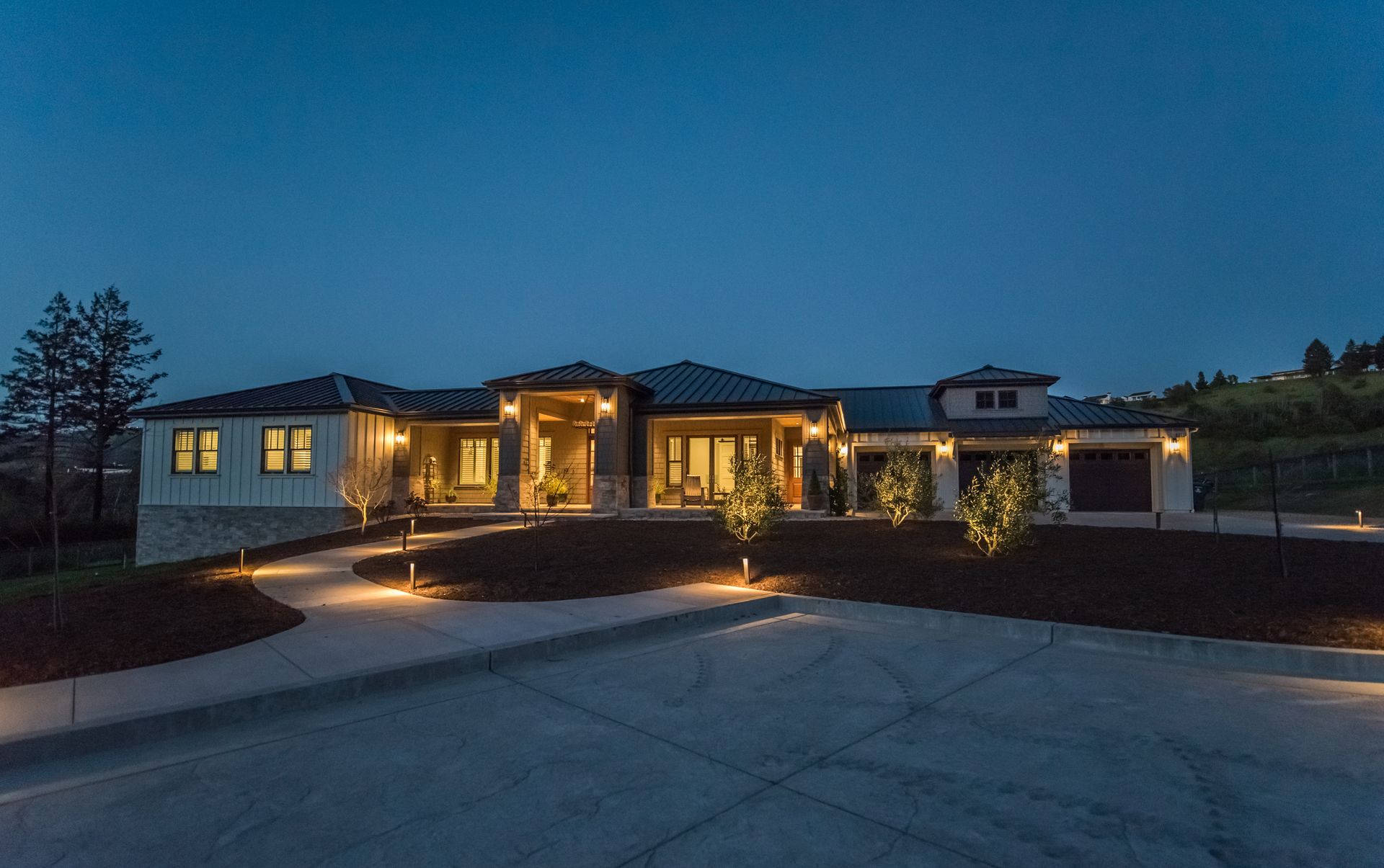 The main residence features three spacious bedrooms and three and one-half baths, complemented by a fully attached one bed, one bath ADU—ideal for guests or multi-level living. For the hobbyist, the oversized three-car garage includes a large integrated shop. As the sun sets, custom landscape lighting transforms the two-acre estate into a private, gated, glowing sanctuary.
