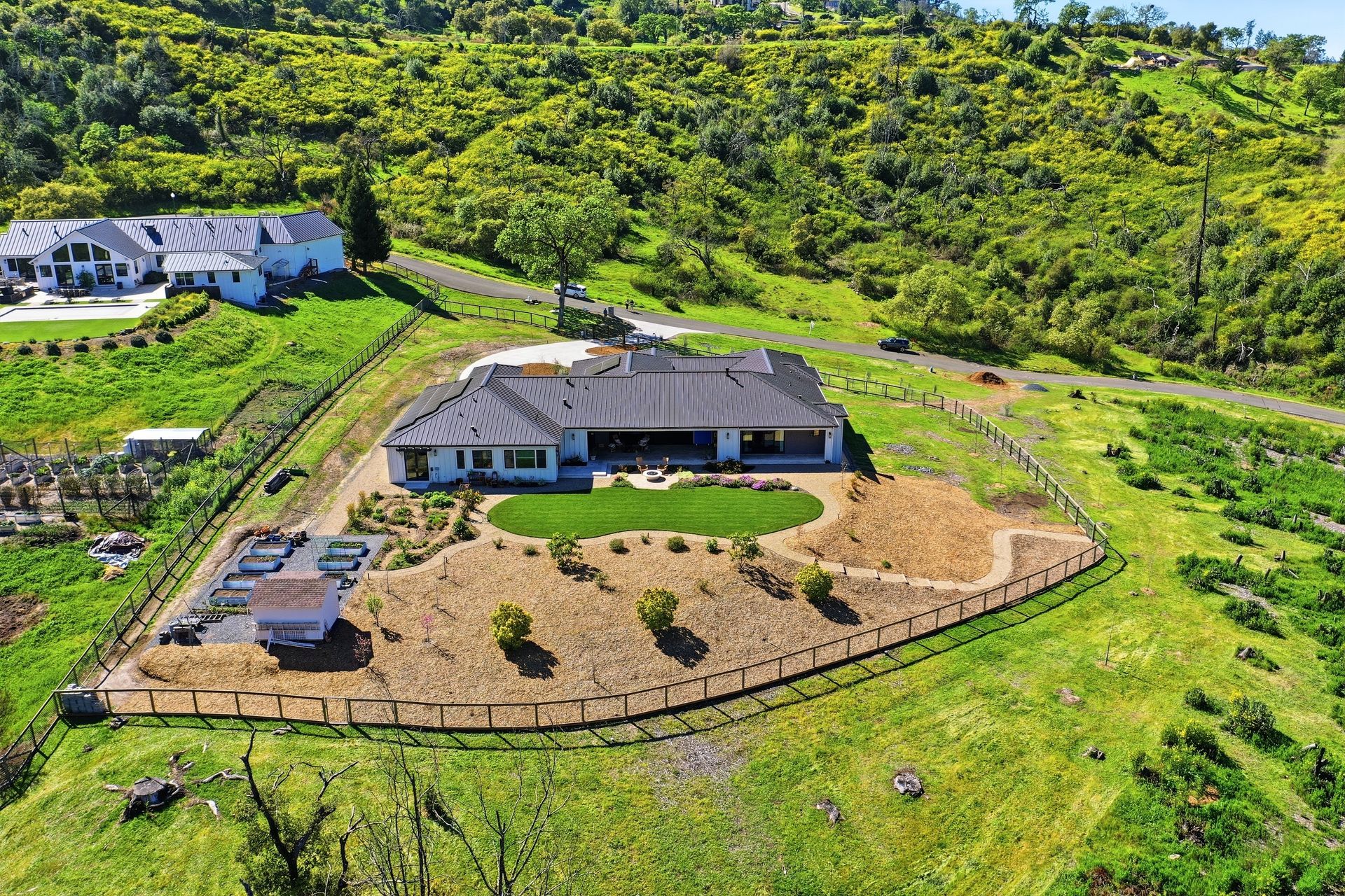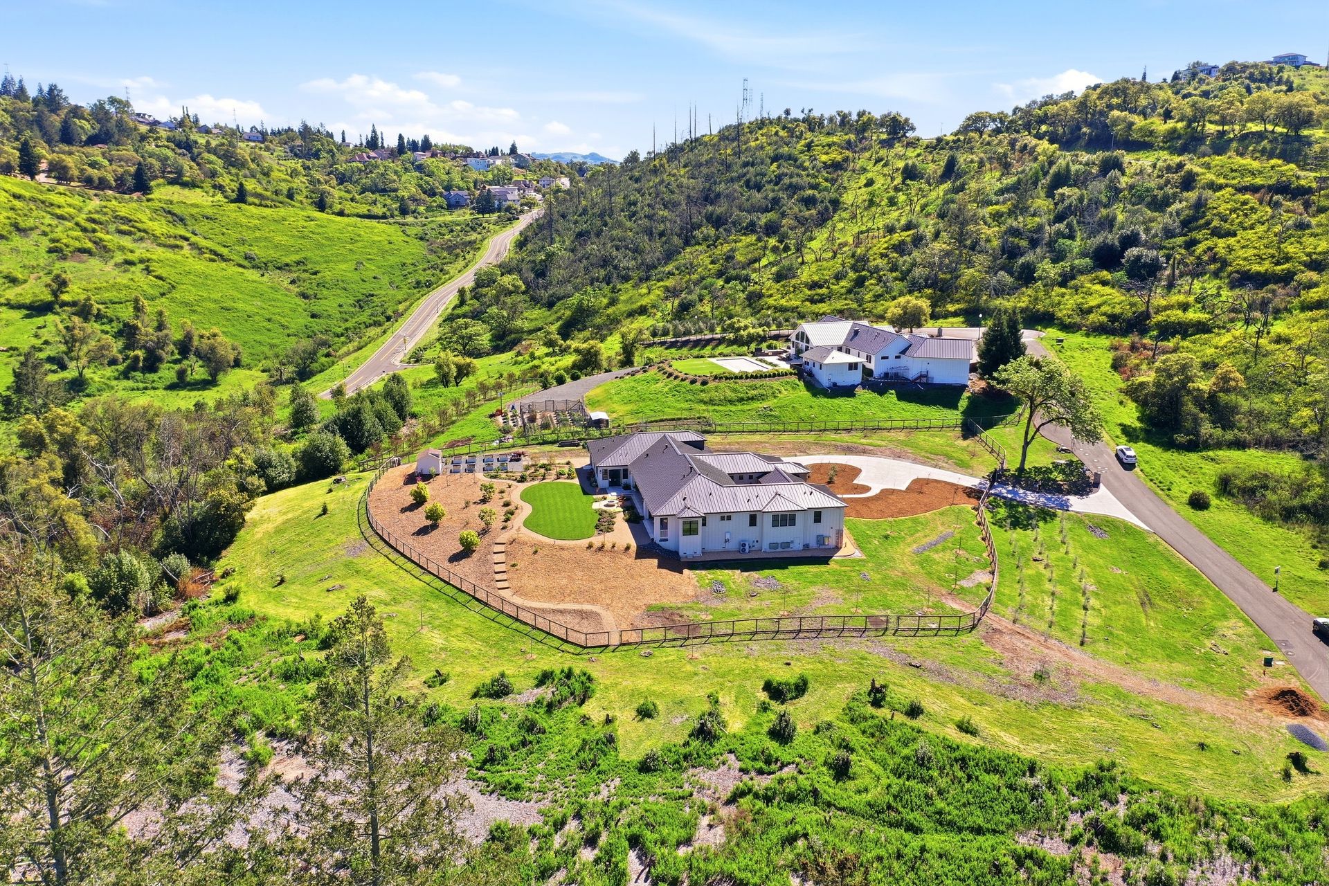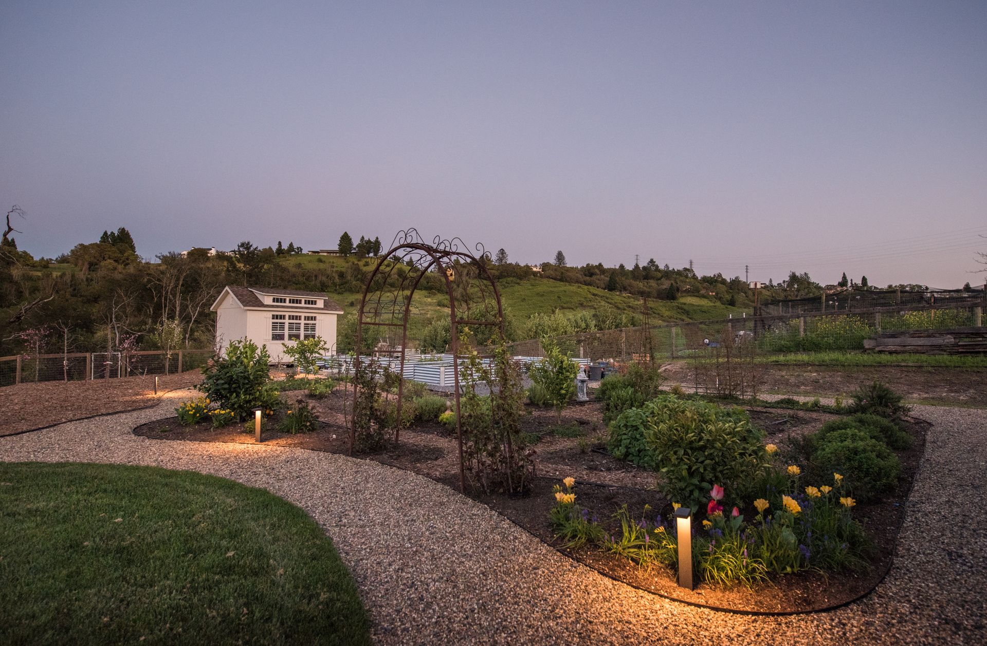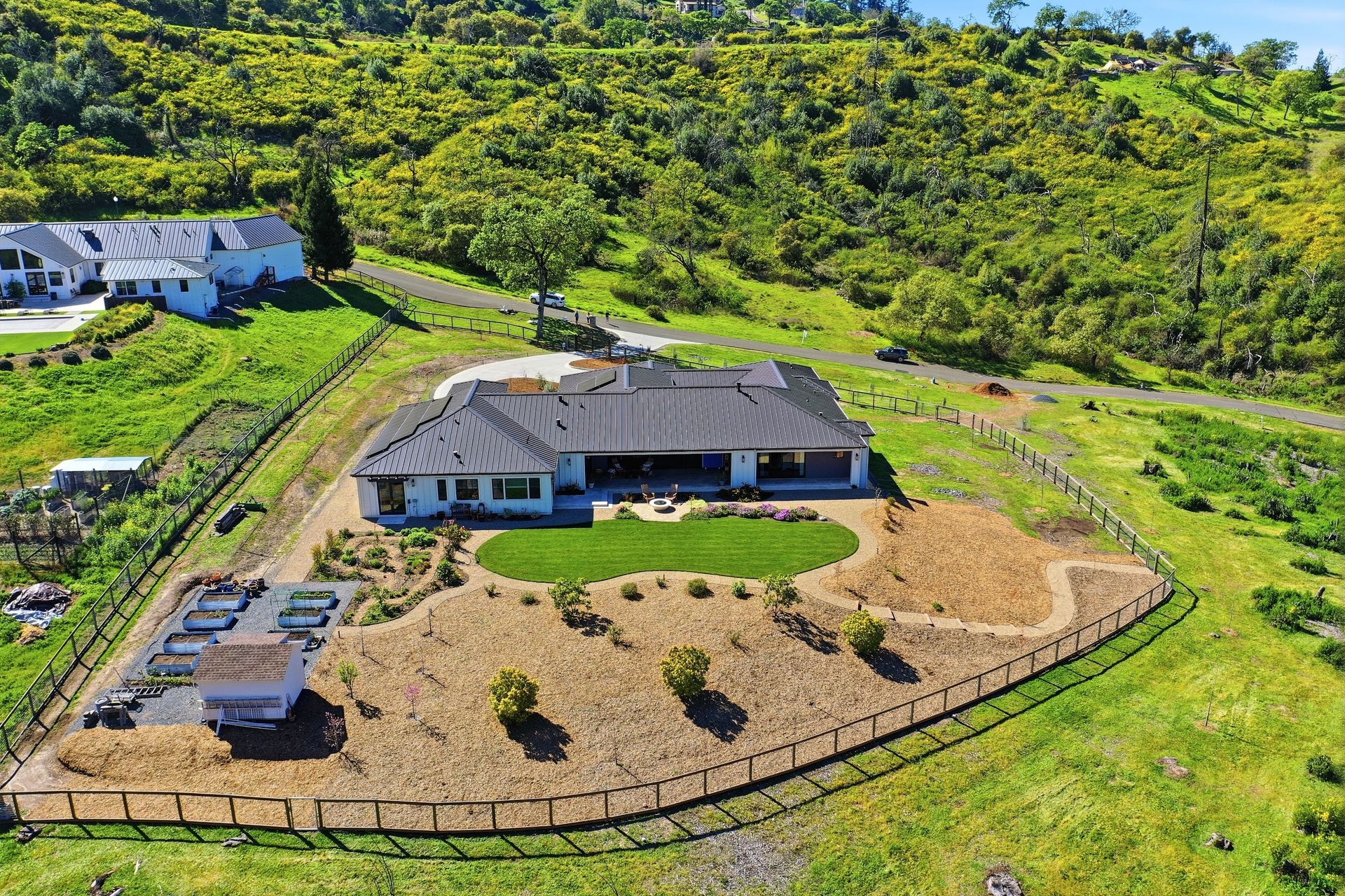 The main residence features three spacious bedrooms and three and one-half baths, complemented by a fully attached one bed, one bath ADU—ideal for guests or multi-level living. For the hobbyist, the oversized three-car garage includes a large integrated shop. As the sun sets, custom landscape lighting transforms the two-acre estate into a private, gated, glowing sanctuary.