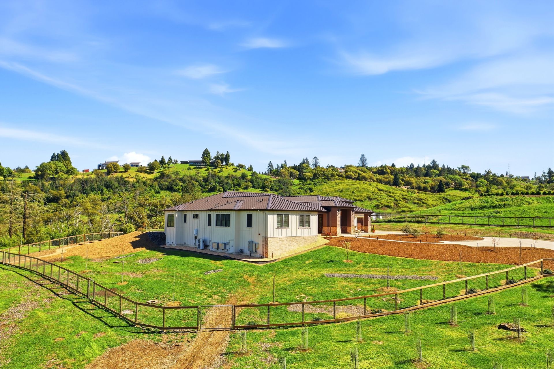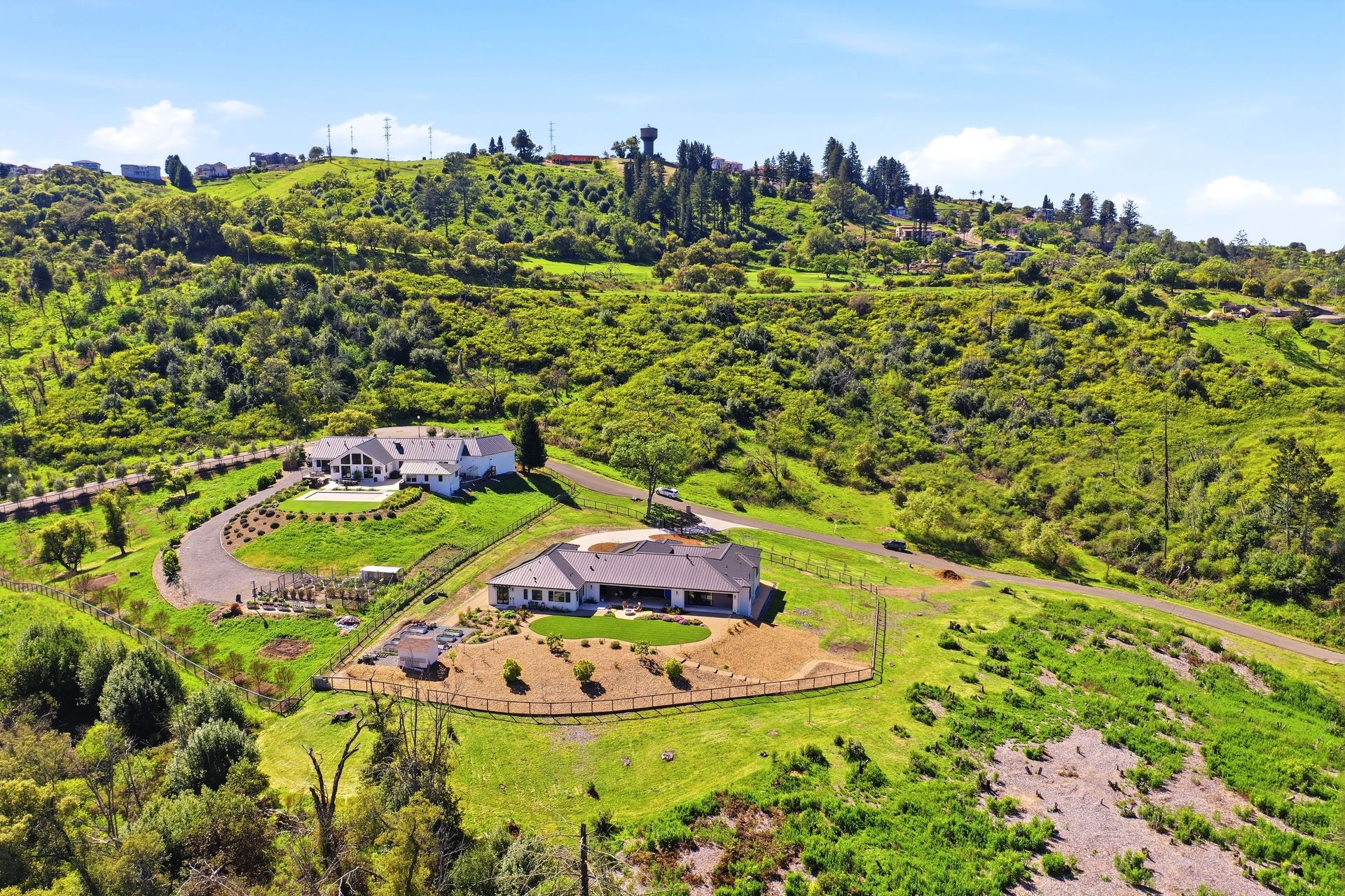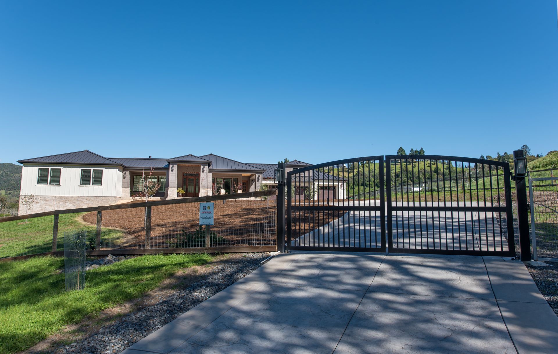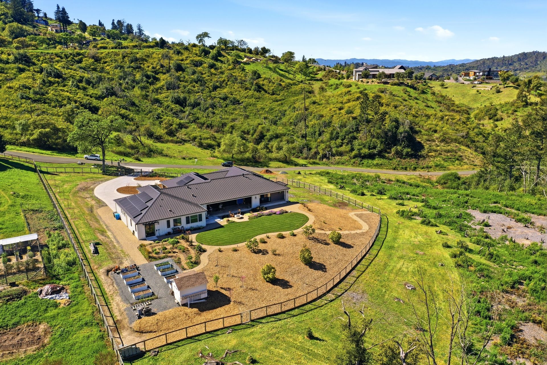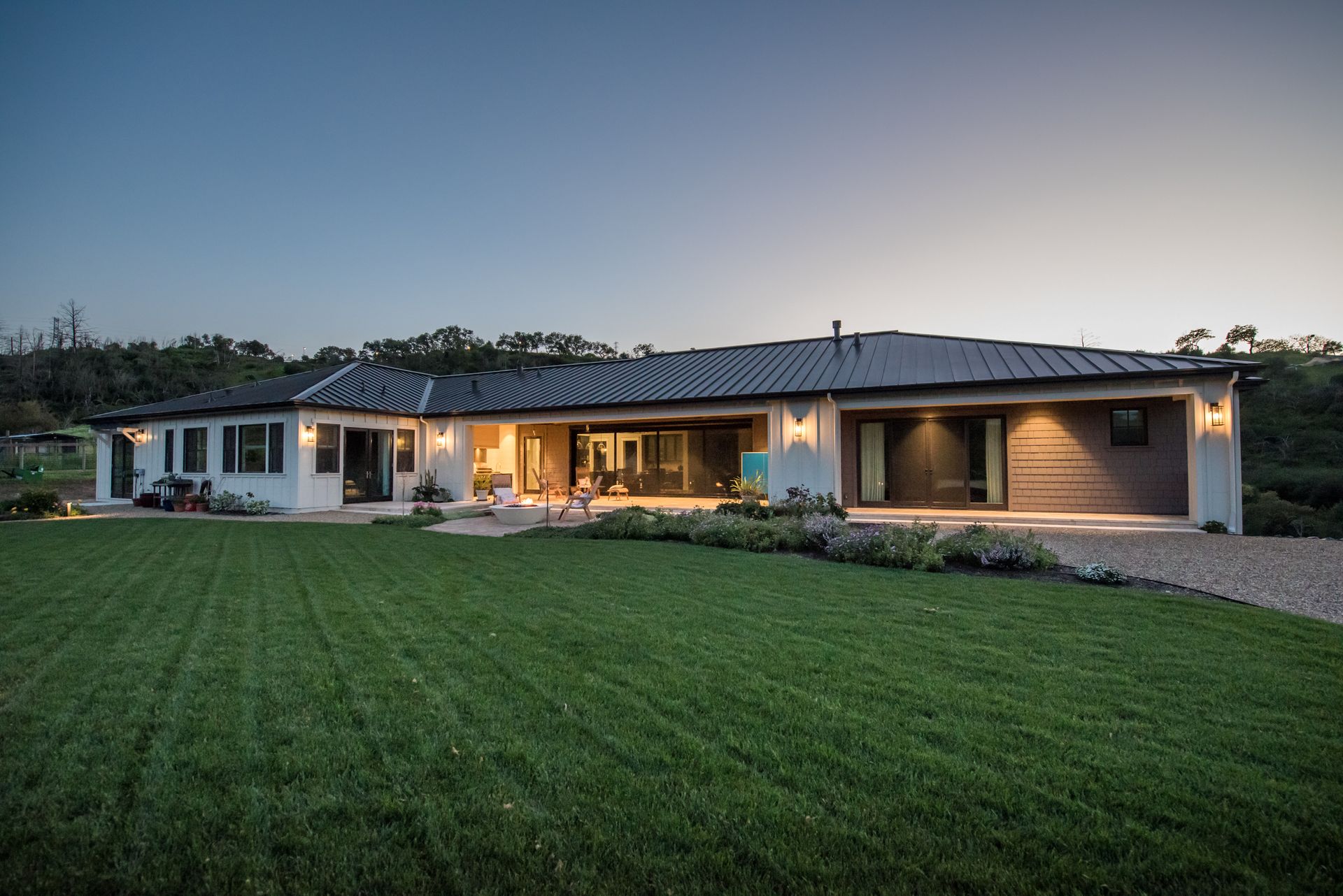 The main residence features three spacious bedrooms and three and one-half baths, complemented by a fully attached one bed, one bath ADU—ideal for guests or multi-level living. For the hobbyist, the oversized three-car garage includes a large integrated shop. As the sun sets, custom landscape lighting transforms the two-acre estate into a private, gated, glowing sanctuary.