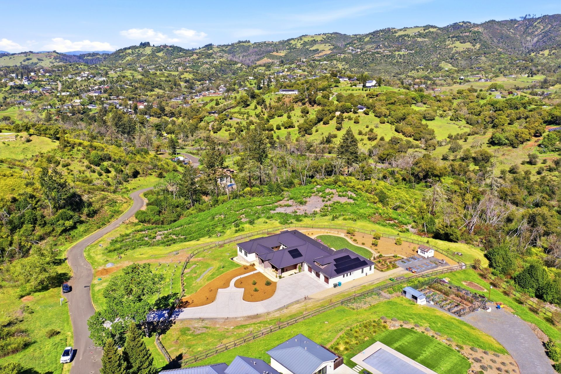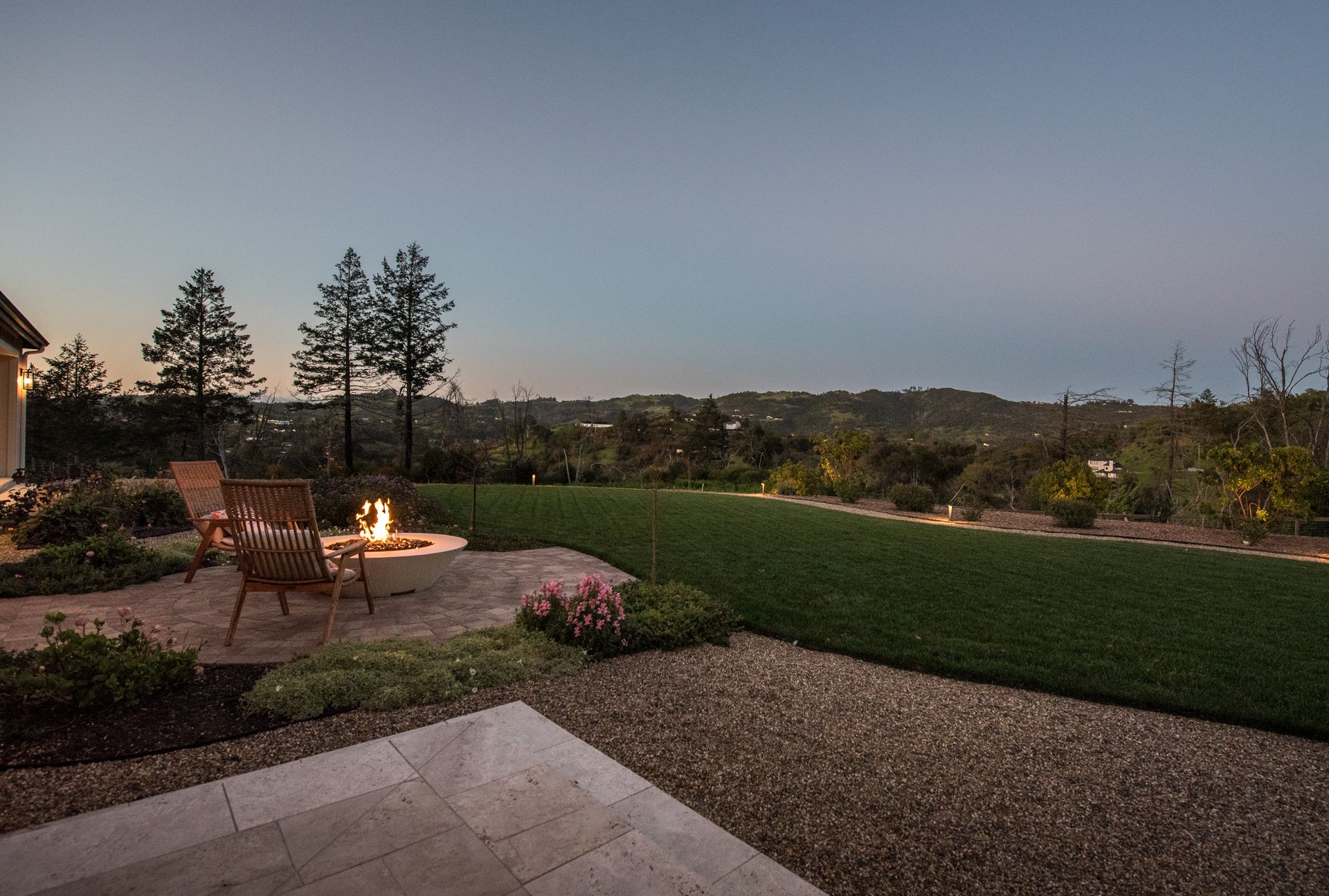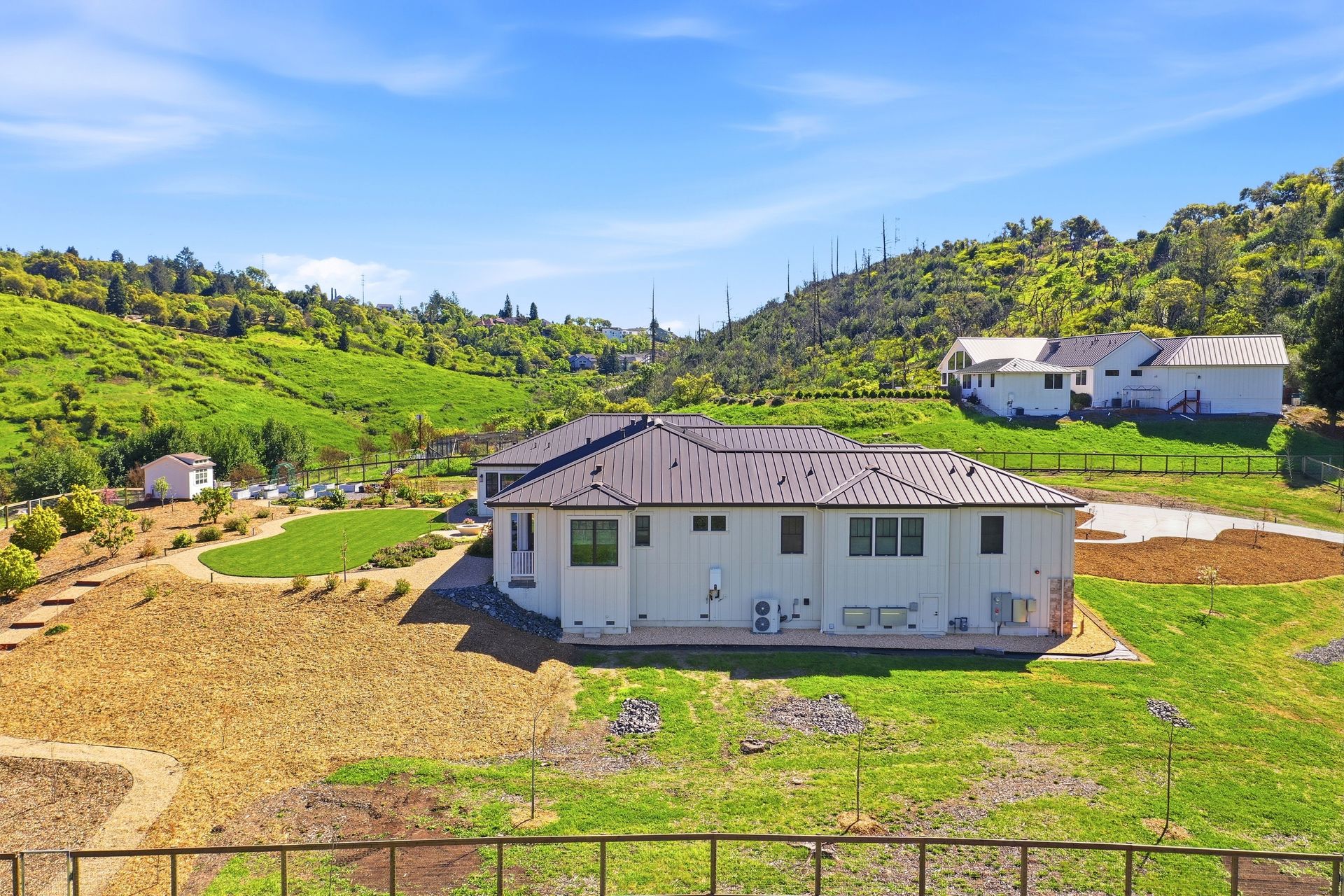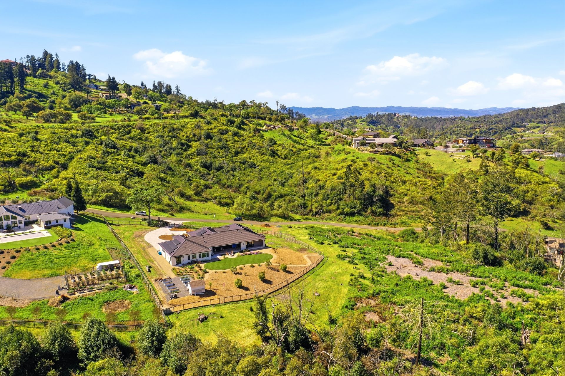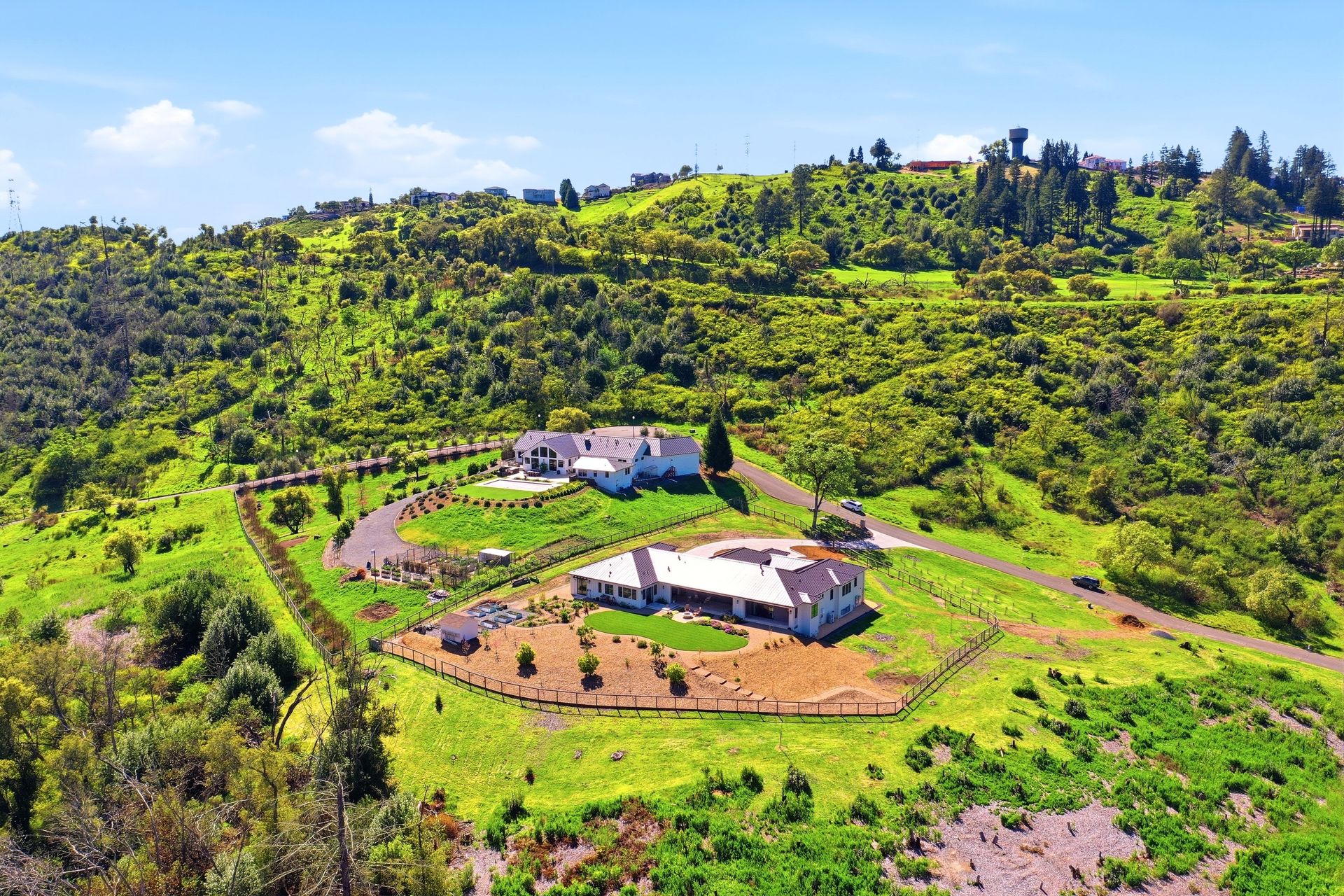 The main residence features three spacious bedrooms and three and one-half baths, complemented by a fully attached one bed, one bath ADU—ideal for guests or multi-level living. For the hobbyist, the oversized three-car garage includes a large integrated shop. As the sun sets, custom landscape lighting transforms the two-acre estate into a private, gated, glowing sanctuary.