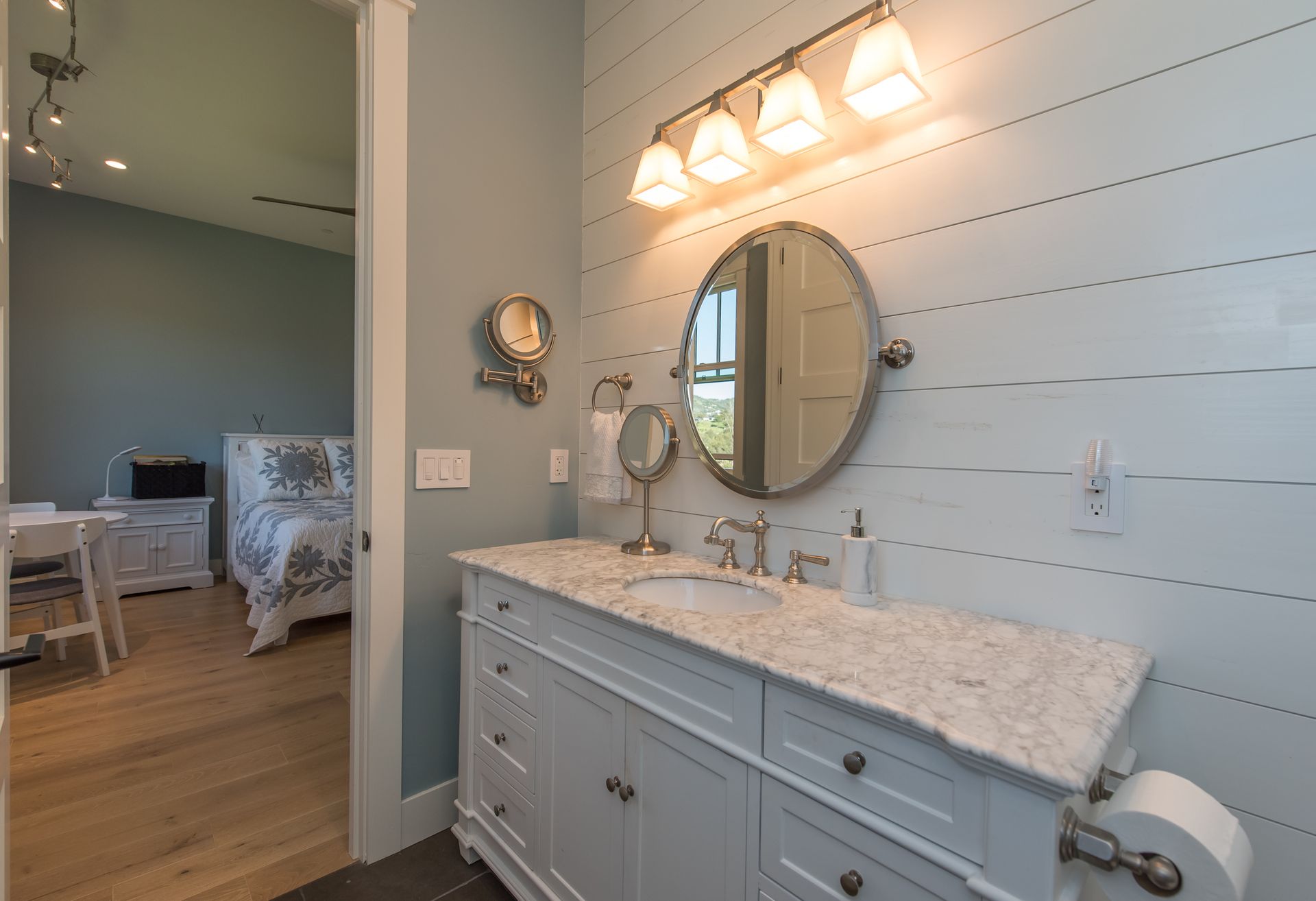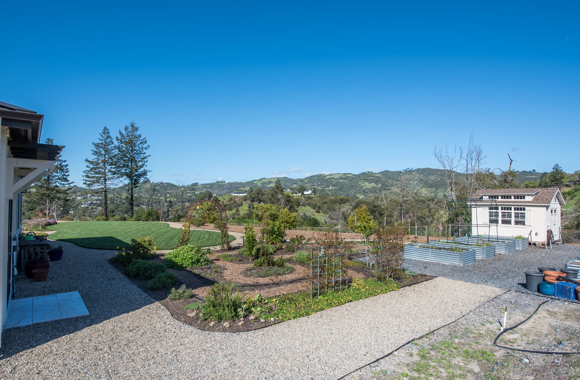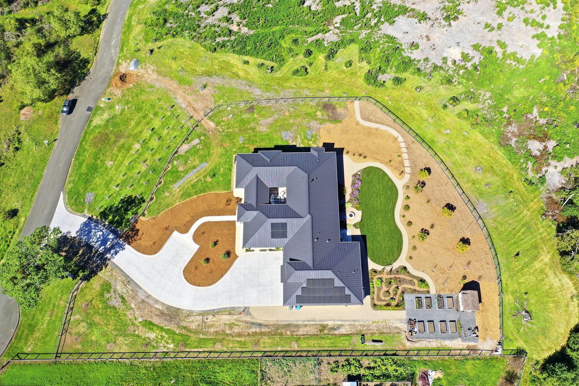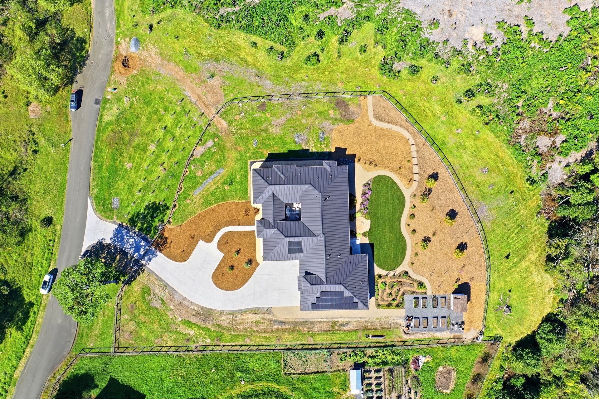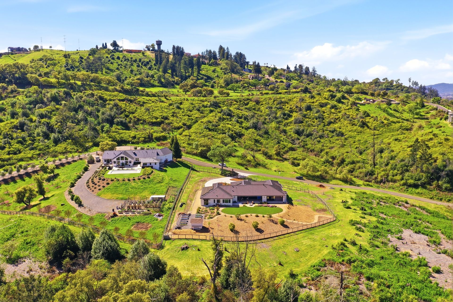 The main residence features three spacious bedrooms and three and one-half baths, complemented by a fully attached one bed, one bath ADU—ideal for guests or multi-level living. For the hobbyist, the oversized three-car garage includes a large integrated shop. As the sun sets, custom landscape lighting transforms the two-acre estate into a private, gated, glowing sanctuary.