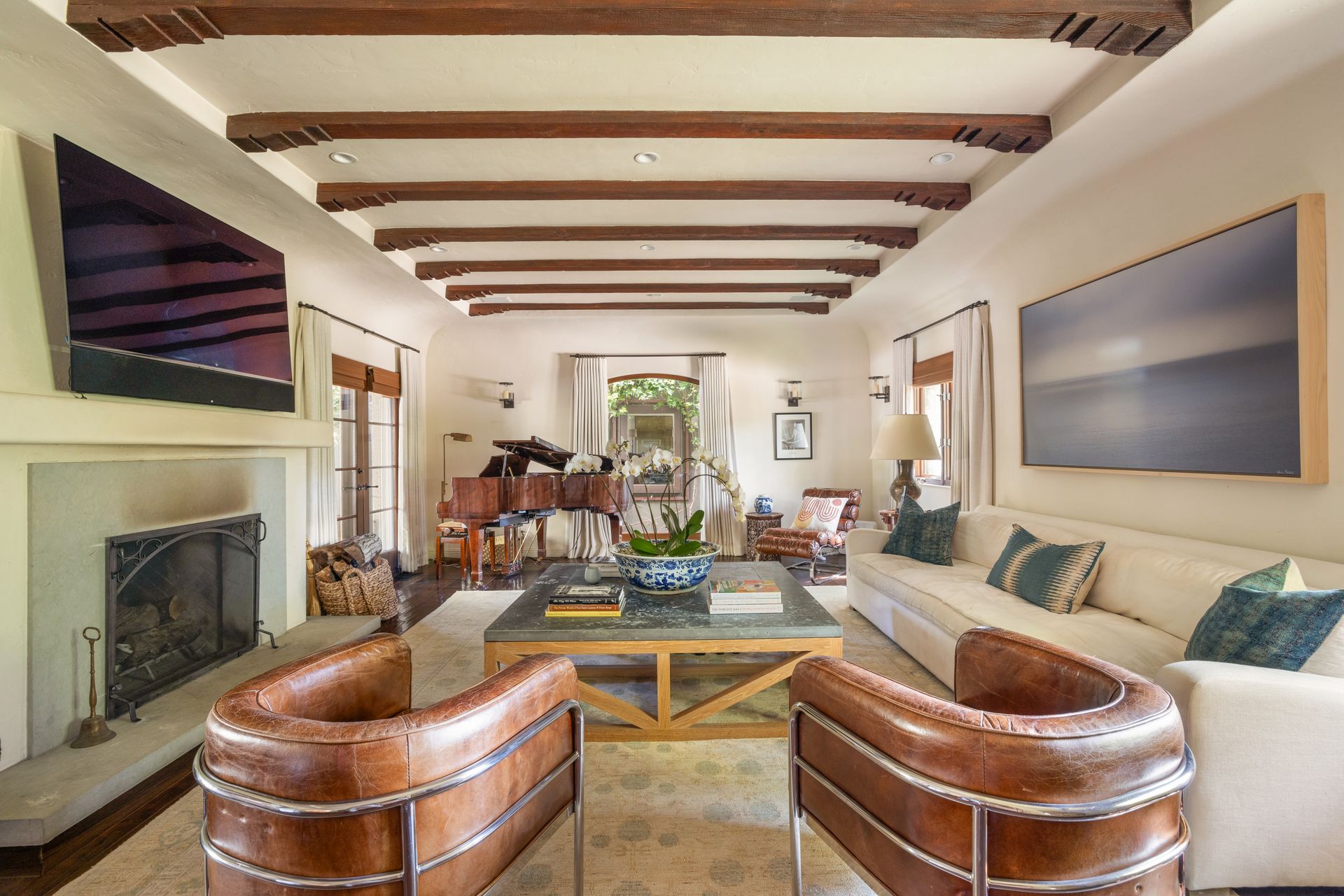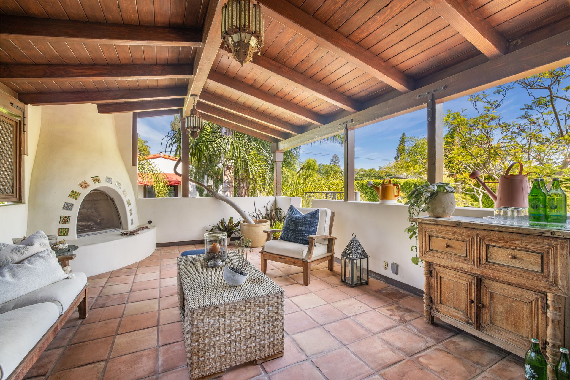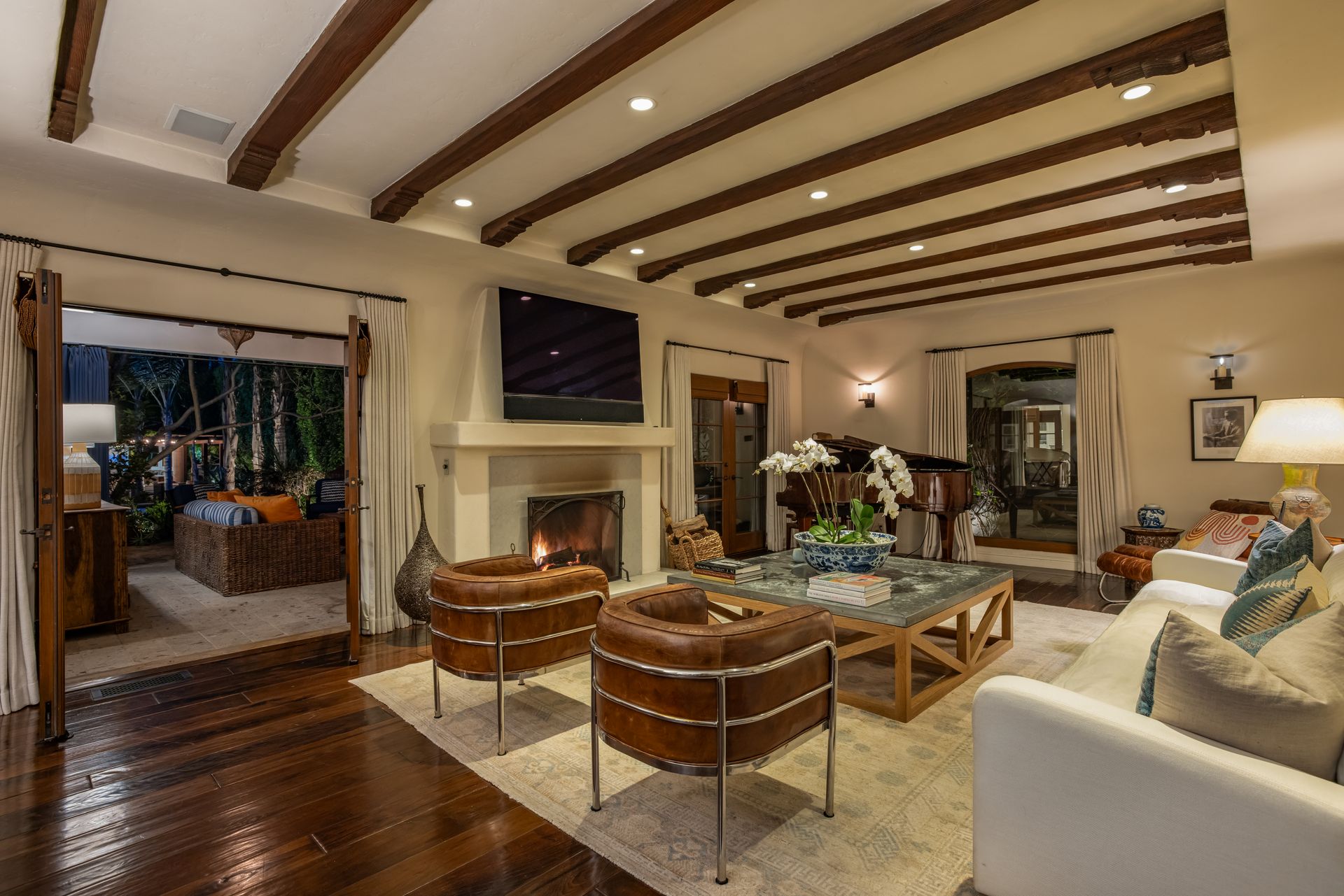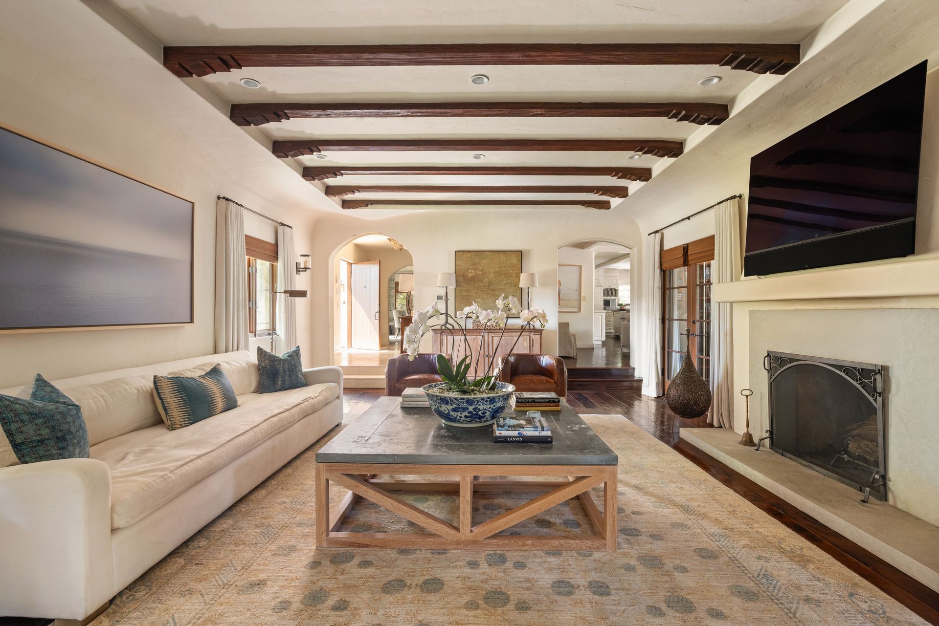 Nestled behind private gates on an expansive, approximately 16,000-square-foot lot, this exceptional Spanish Mediterranean residence masterfully blends timeless architecture with modern comforts. An arched entryway adorned with decorative tile work opens to a stunning step-down living room with dramatic beamed ceilings, a fireplace, and French doors leading to a covered patio with wrought iron pendant lanterns—ideal for gatherings that flow effortlessly outdoors. The formal dining room, with butler’s pantry, adjoins a beautifully appointed kitchen and breakfast room that overlooks a warm family room with fireplace and library nook. A private en-suite bedroom, along with an elegant powder room and a laundry room, completes the main level. Upstairs, three additional en-suite bedrooms offer comfort and privacy. The magnificent primary suite is a true retreat, featuring a generous walk-in closet, a spa-like bath with dual vanities, a soaking tub, skylights, and a separate shower, plus a covered terrace with a fireplace and a graceful circular staircase to the backyard.