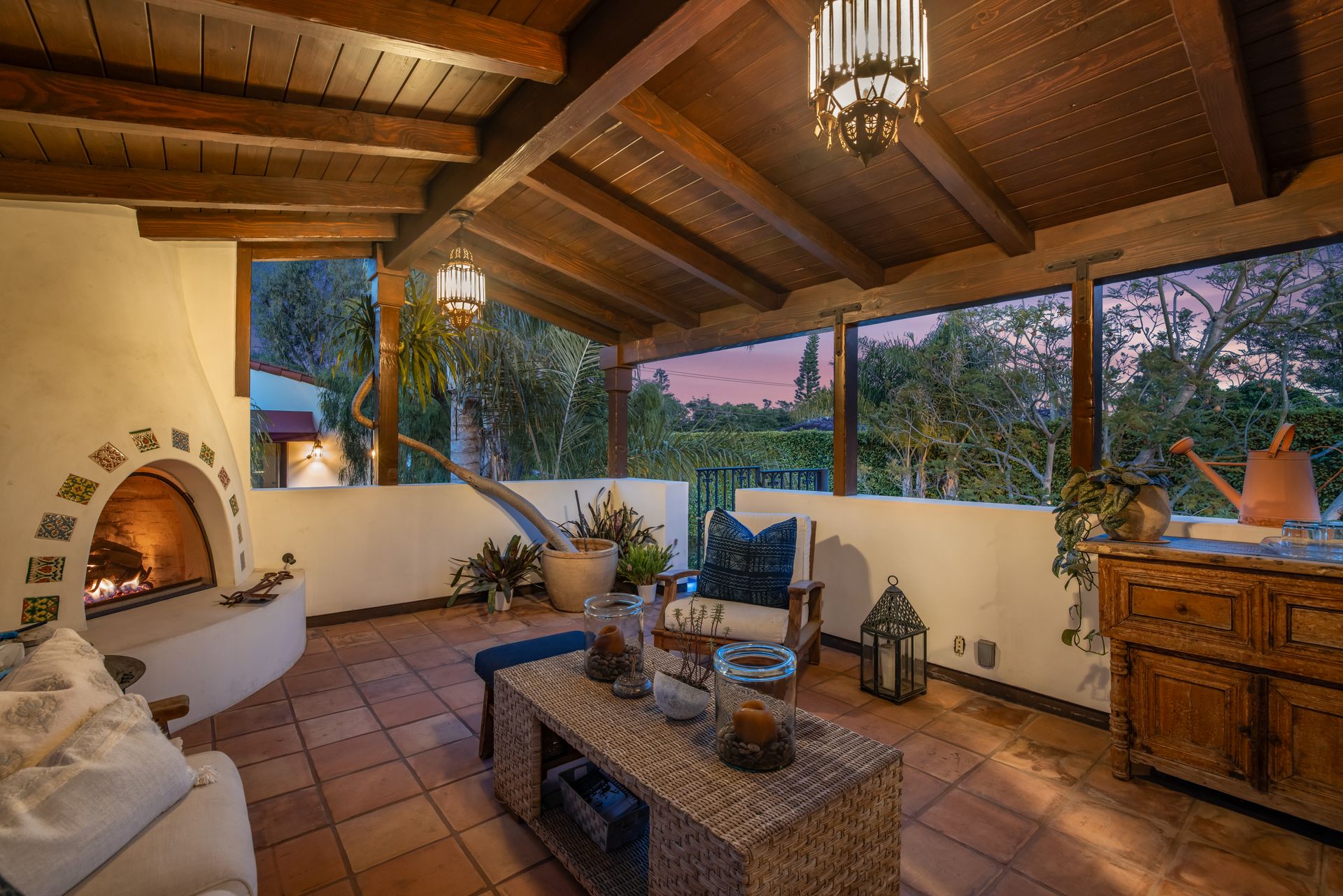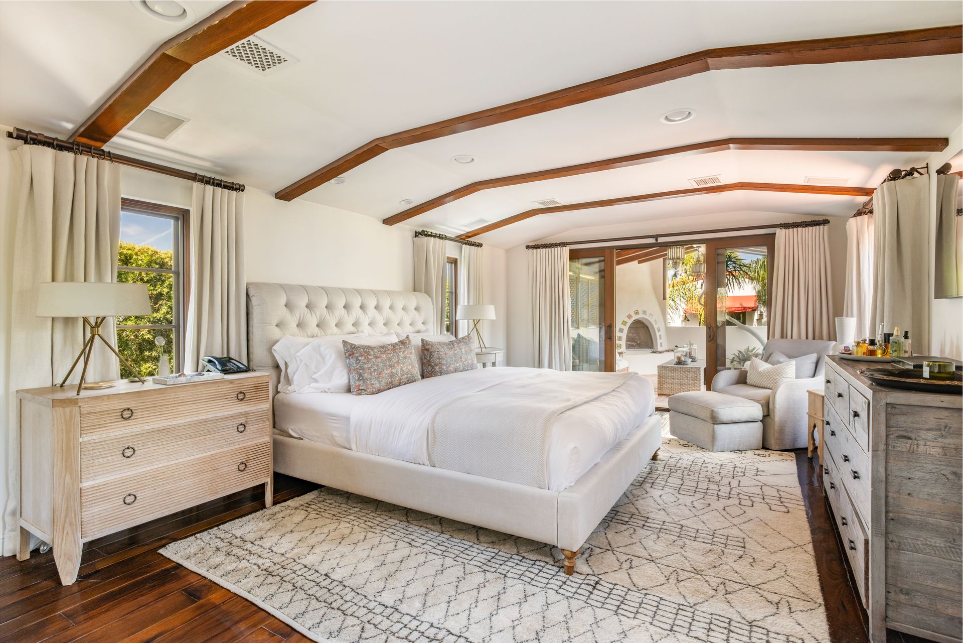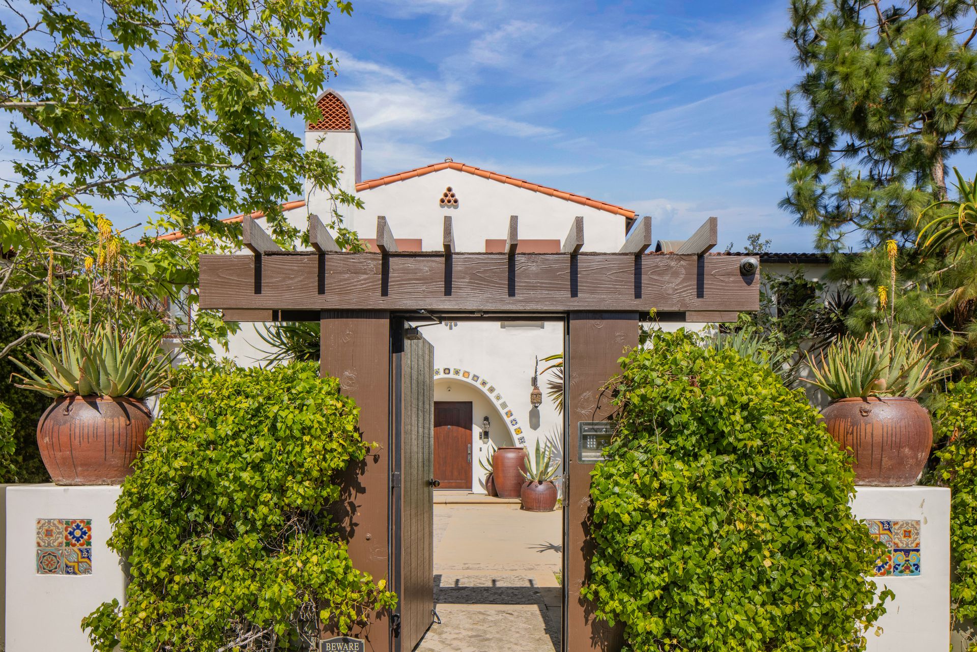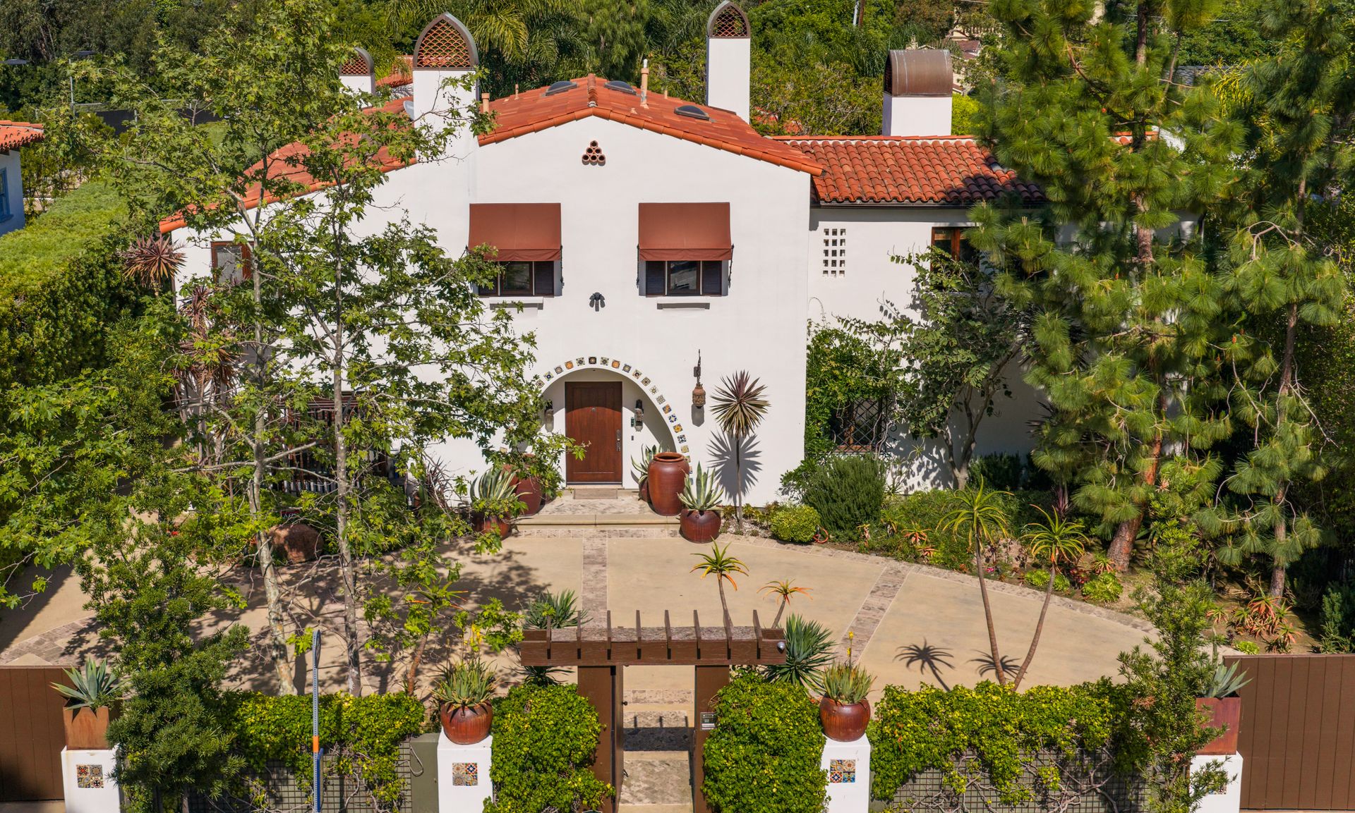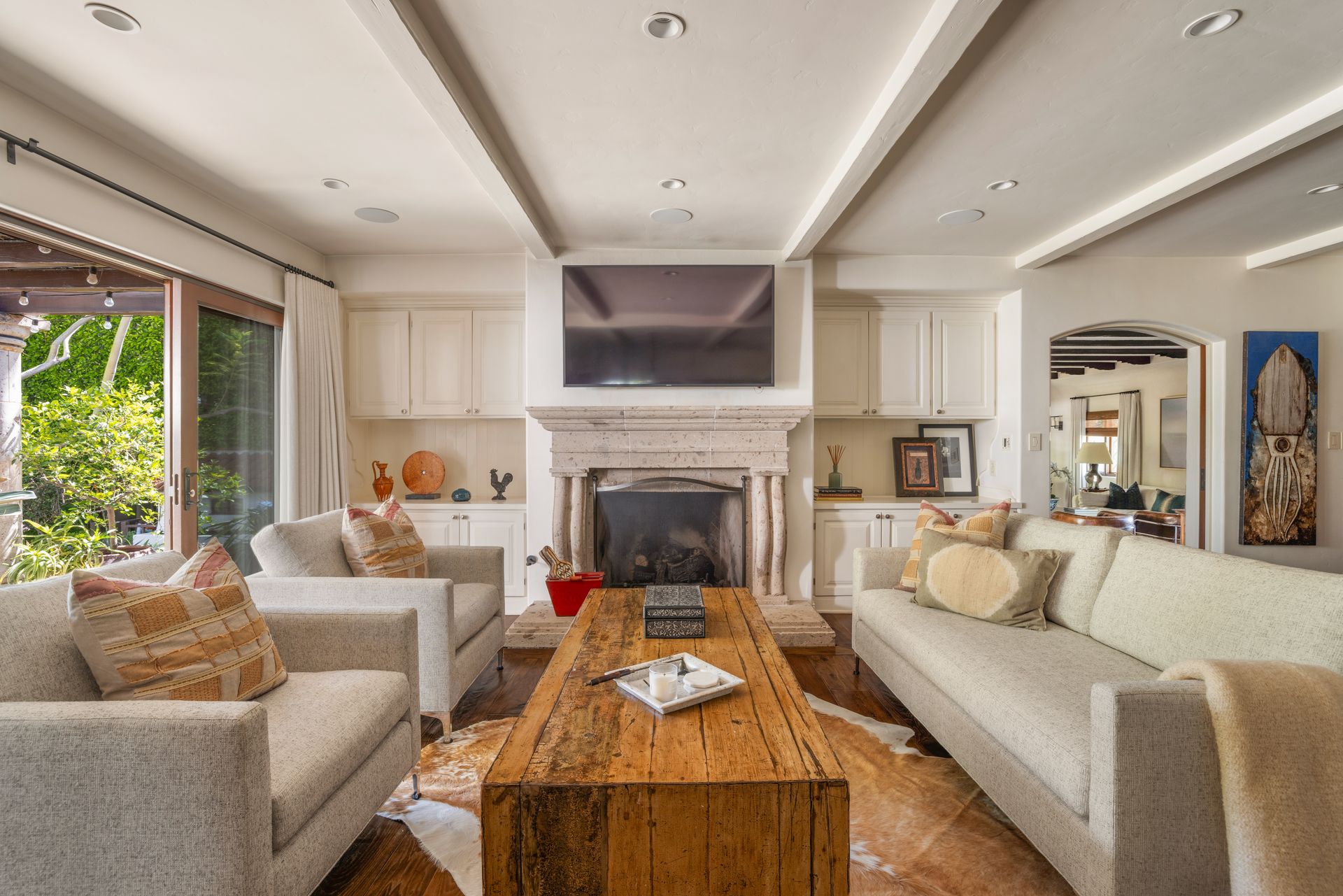 Nestled behind private gates on an expansive, approximately 16,000-square-foot lot, this exceptional Spanish Mediterranean residence masterfully blends timeless architecture with modern comforts. An arched entryway adorned with decorative tile work opens to a stunning step-down living room with dramatic beamed ceilings, a fireplace, and French doors leading to a covered patio with wrought iron pendant lanterns—ideal for gatherings that flow effortlessly outdoors. The formal dining room, with butler’s pantry, adjoins a beautifully appointed kitchen and breakfast room that overlooks a warm family room with fireplace and library nook. A private en-suite bedroom, along with an elegant powder room and a laundry room, completes the main level. Upstairs, three additional en-suite bedrooms offer comfort and privacy. The magnificent primary suite is a true retreat, featuring a generous walk-in closet, a spa-like bath with dual vanities, a soaking tub, skylights, and a separate shower, plus a covered terrace with a fireplace and a graceful circular staircase to the backyard.