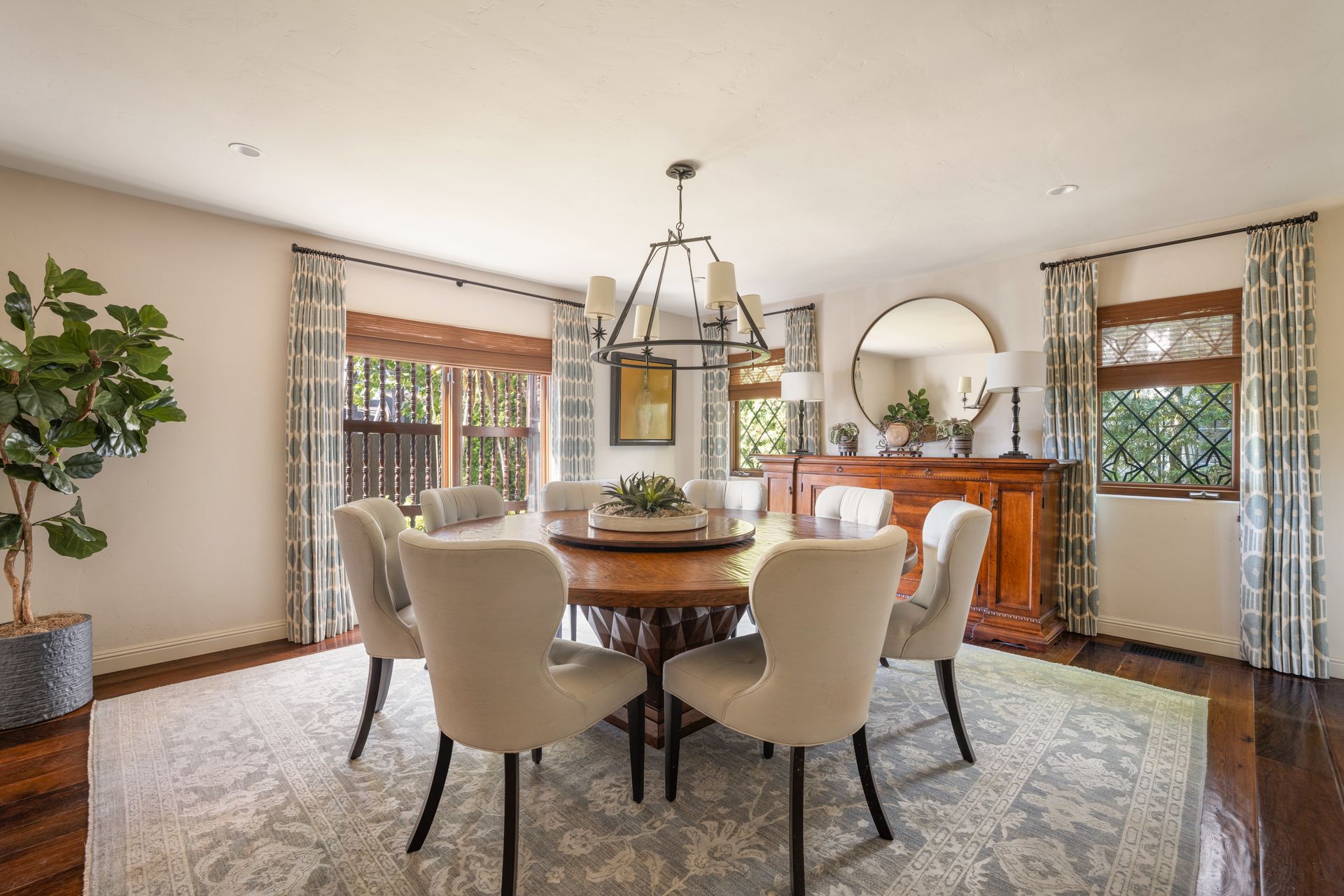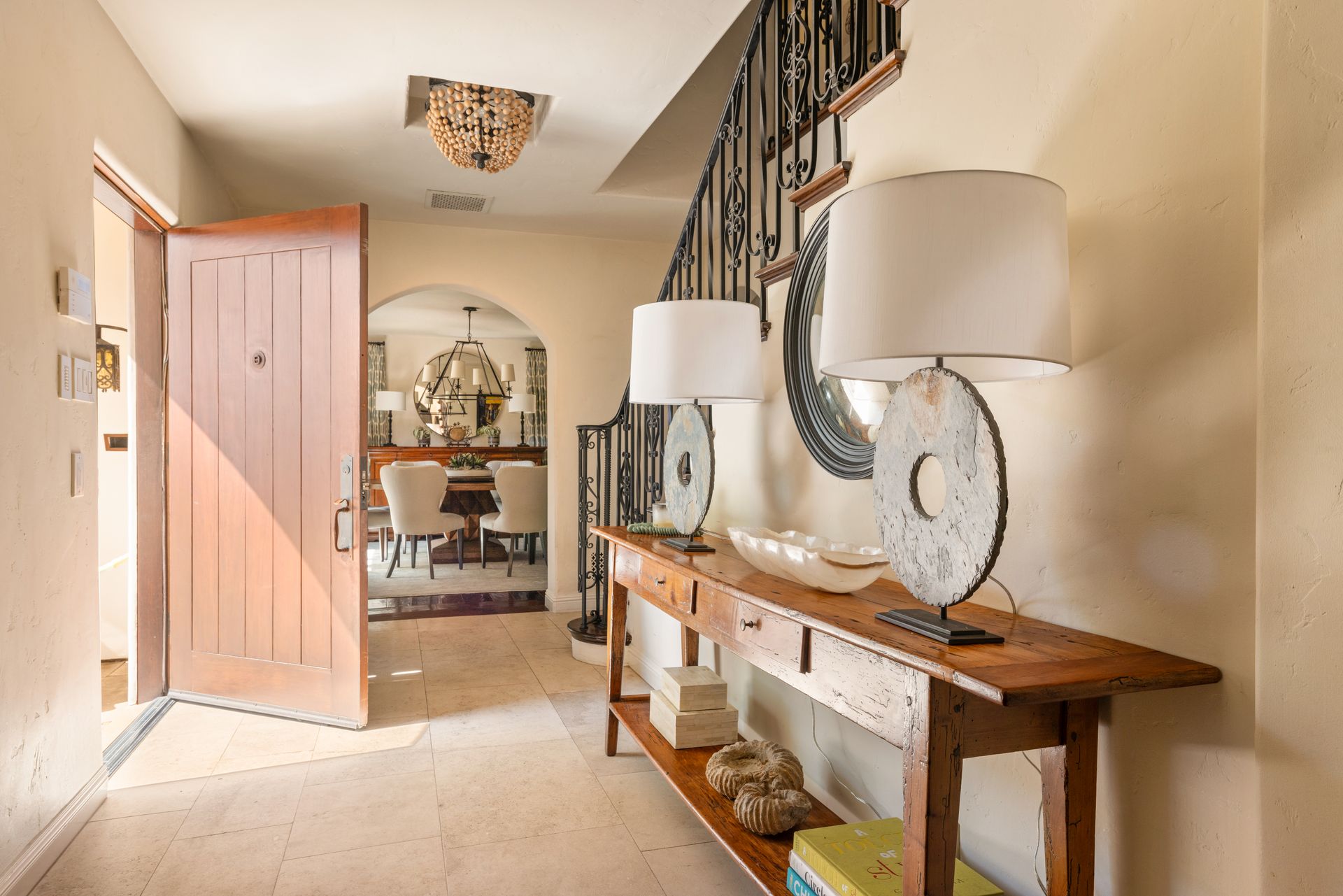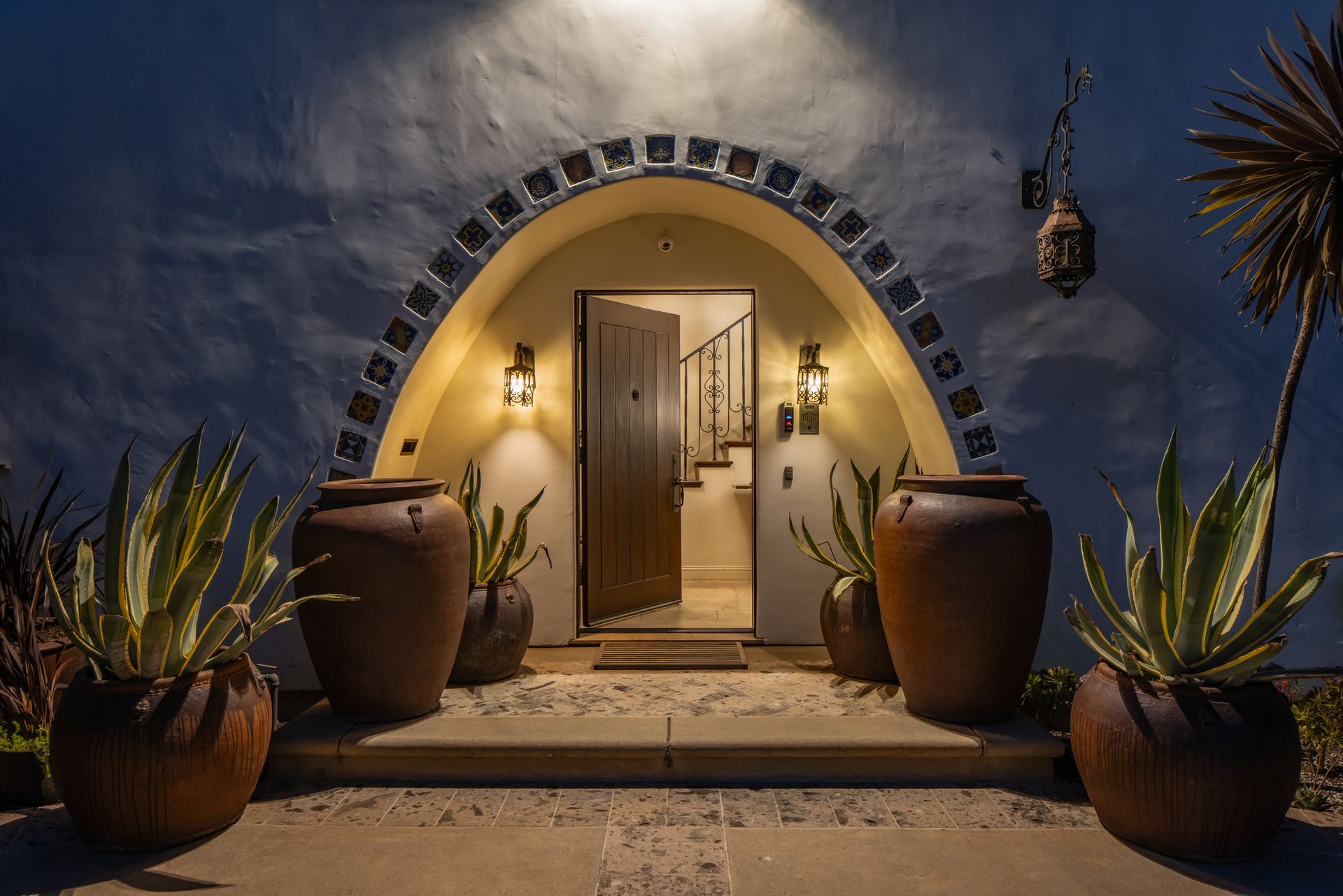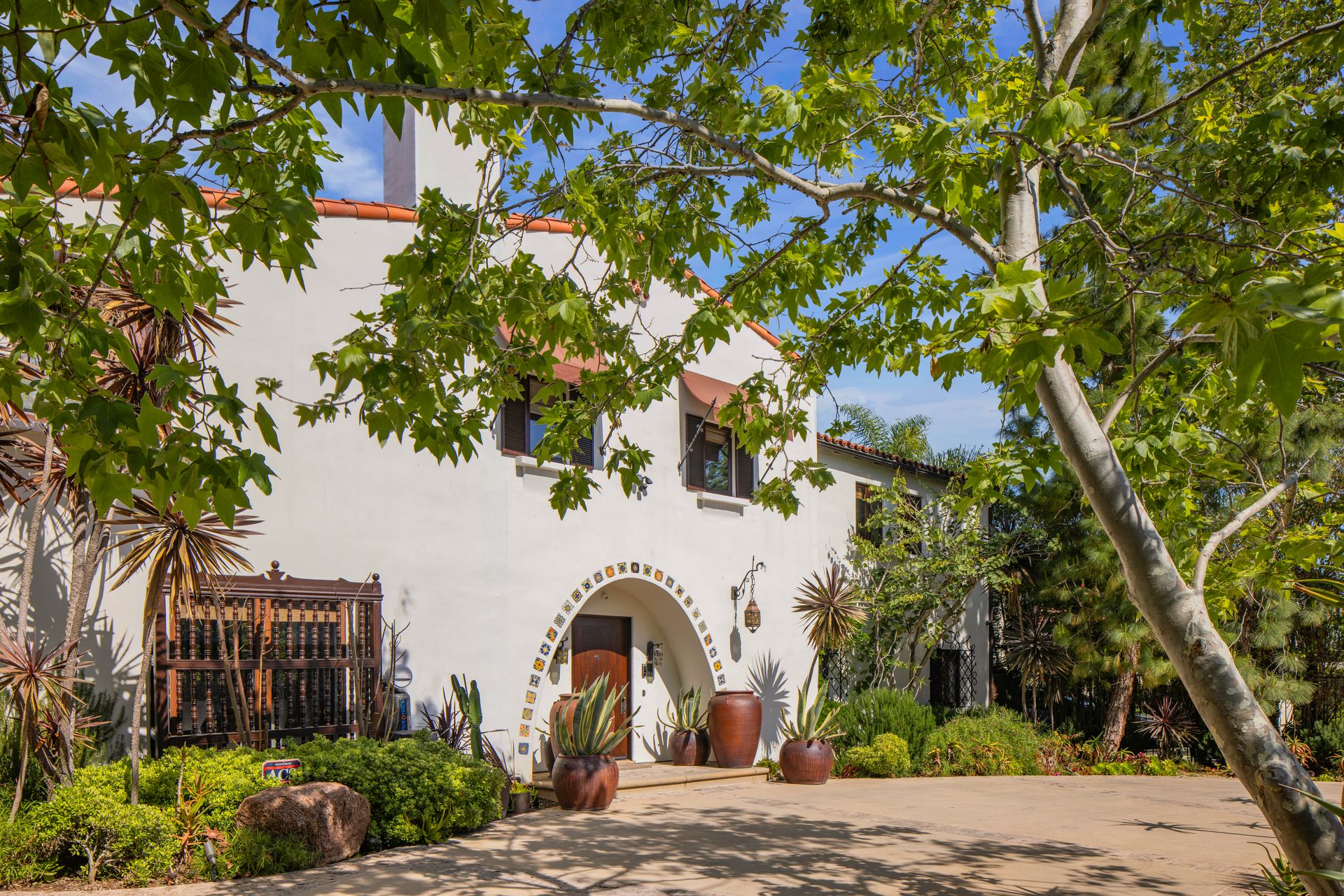 Nestled behind private gates on an expansive, approximately 16,000-square-foot lot, this exceptional Spanish Mediterranean residence masterfully blends timeless architecture with modern comforts. An arched entryway adorned with decorative tile work opens to a stunning step-down living room with dramatic beamed ceilings, a fireplace, and French doors leading to a covered patio with wrought iron pendant lanterns—ideal for gatherings that flow effortlessly outdoors. The formal dining room, with butler’s pantry, adjoins a beautifully appointed kitchen and breakfast room that overlooks a warm family room with fireplace and library nook. A private en-suite bedroom, along with an elegant powder room and a laundry room, completes the main level. Upstairs, three additional en-suite bedrooms offer comfort and privacy. The magnificent primary suite is a true retreat, featuring a generous walk-in closet, a spa-like bath with dual vanities, a soaking tub, skylights, and a separate shower, plus a covered terrace with a fireplace and a graceful circular staircase to the backyard.