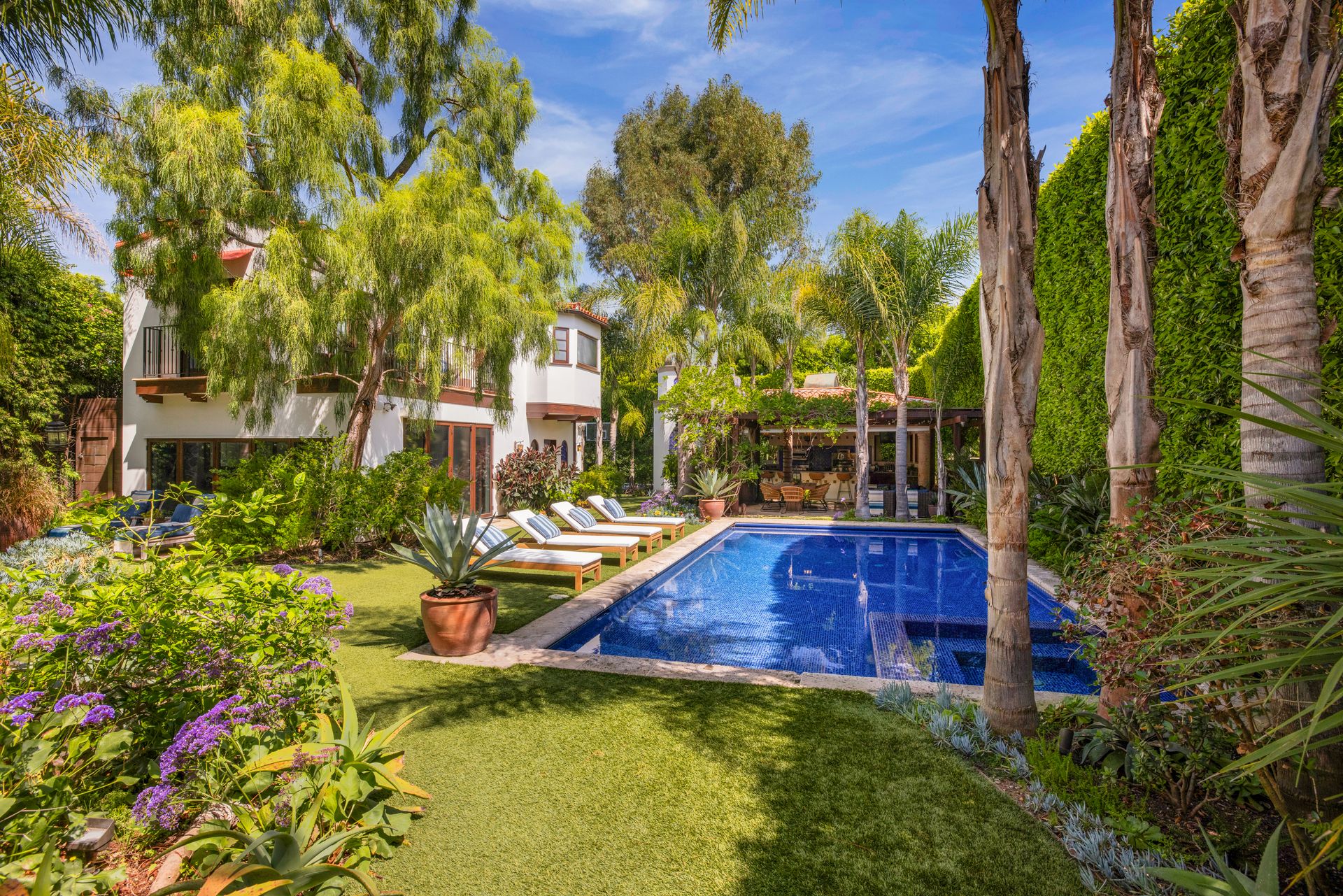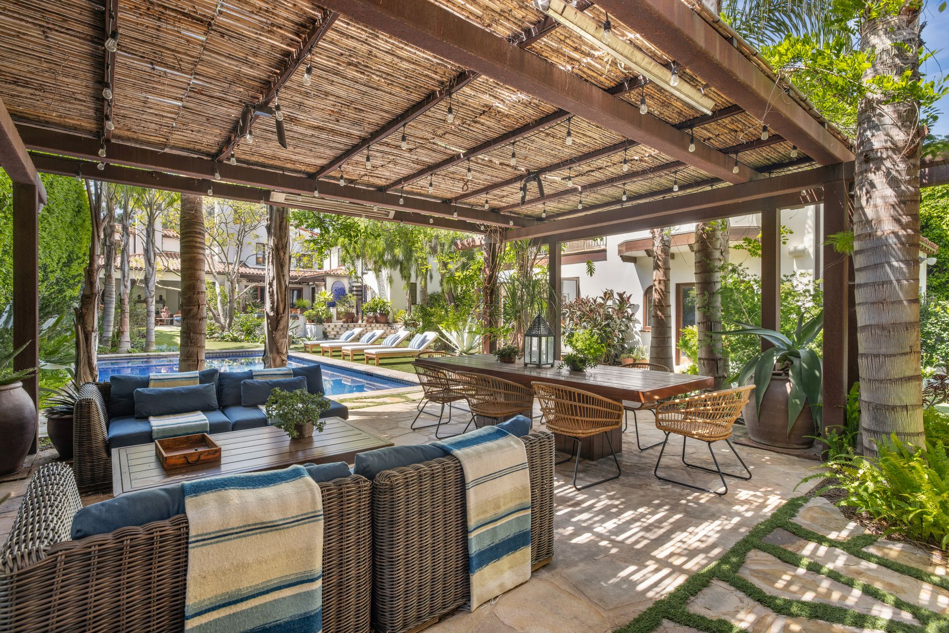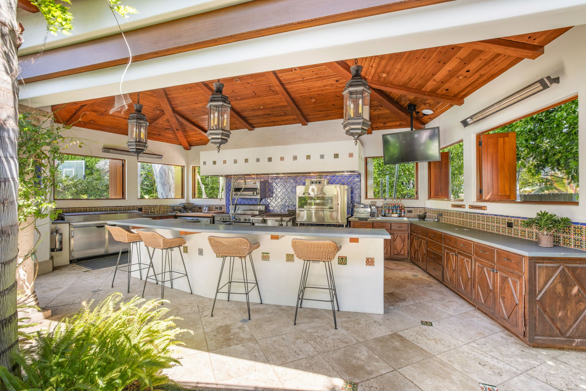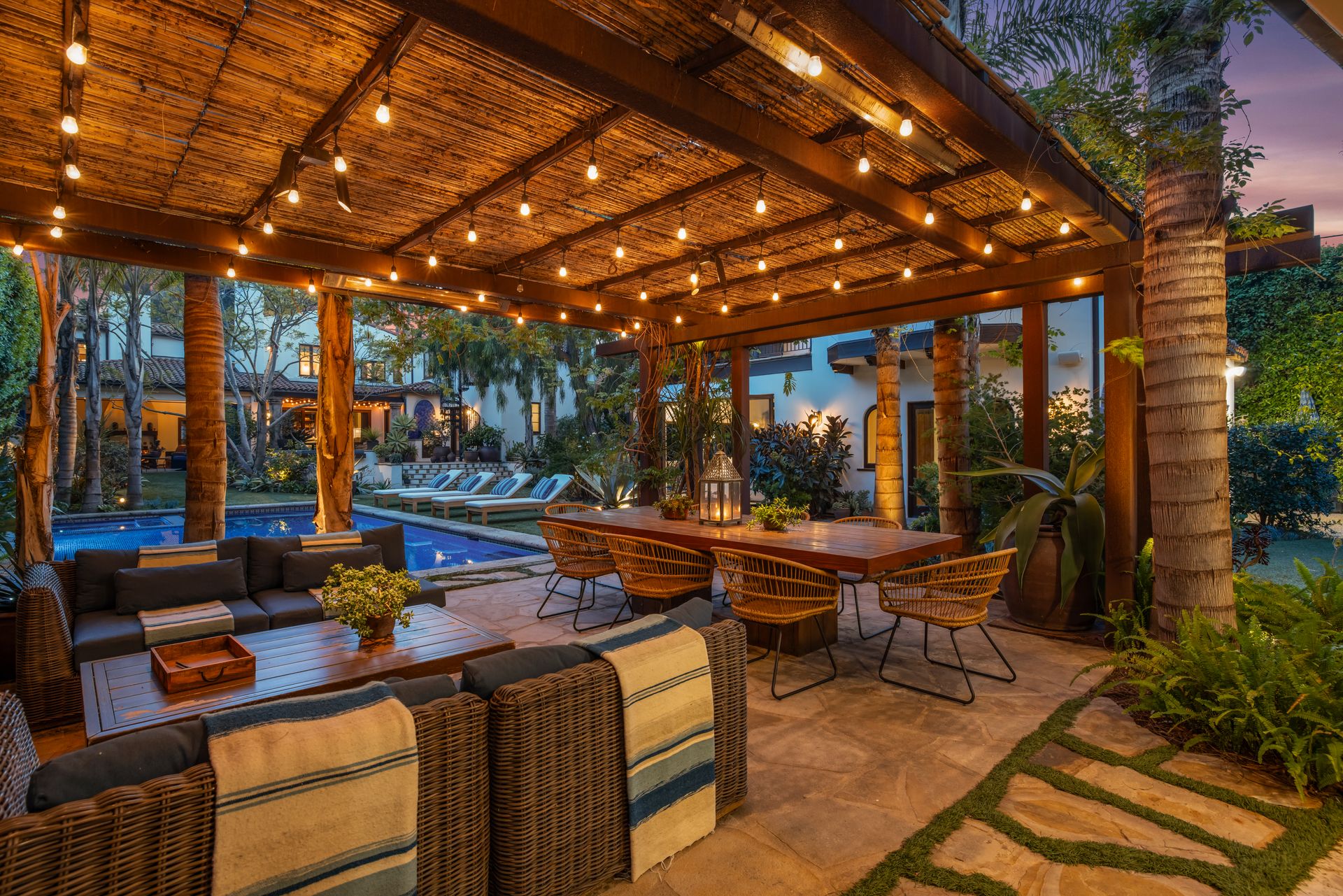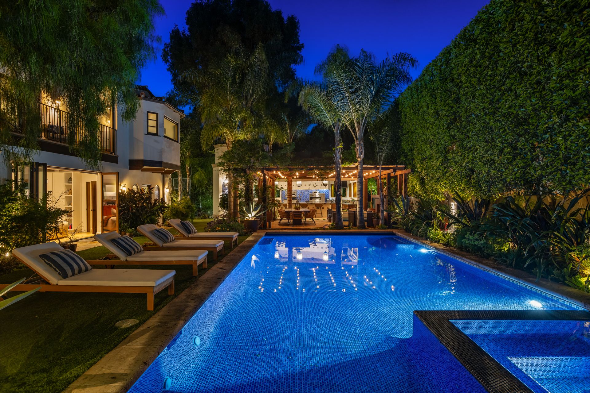 This private resort unfolds with a sophisticated pavilion with a decorative tower housing a fully appointed commercial-grade outdoor kitchen, complete with top-tier appliances, and a pergola with twinkling string lights over a large dining area, which sets the stage for al fresco meals, warmed by a gas fireplace. The centerpiece of the yard is a magnificent pool/spa, and an adjacent half-court basketball court. Completing the oasis is a sophisticated two-story guest house and office, providing refined accommodations for guests. This meticulously landscaped sanctuary with world-class amenities creates a true private paradise. The ideal blend of elegance and convenience by being moments away from the Brentwood Country Mart, charming Montana Avenue shops, Palisades Park, iconic Santa Monica Stairs, 3rd Street Promenade, and the beach that defines this sought-after coastal enclave.