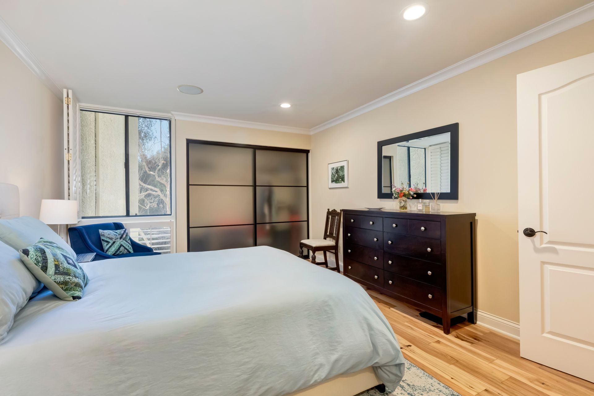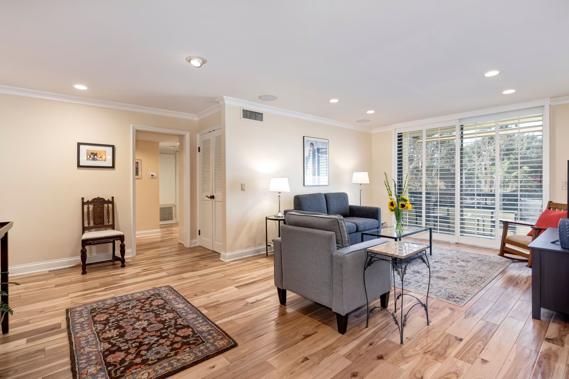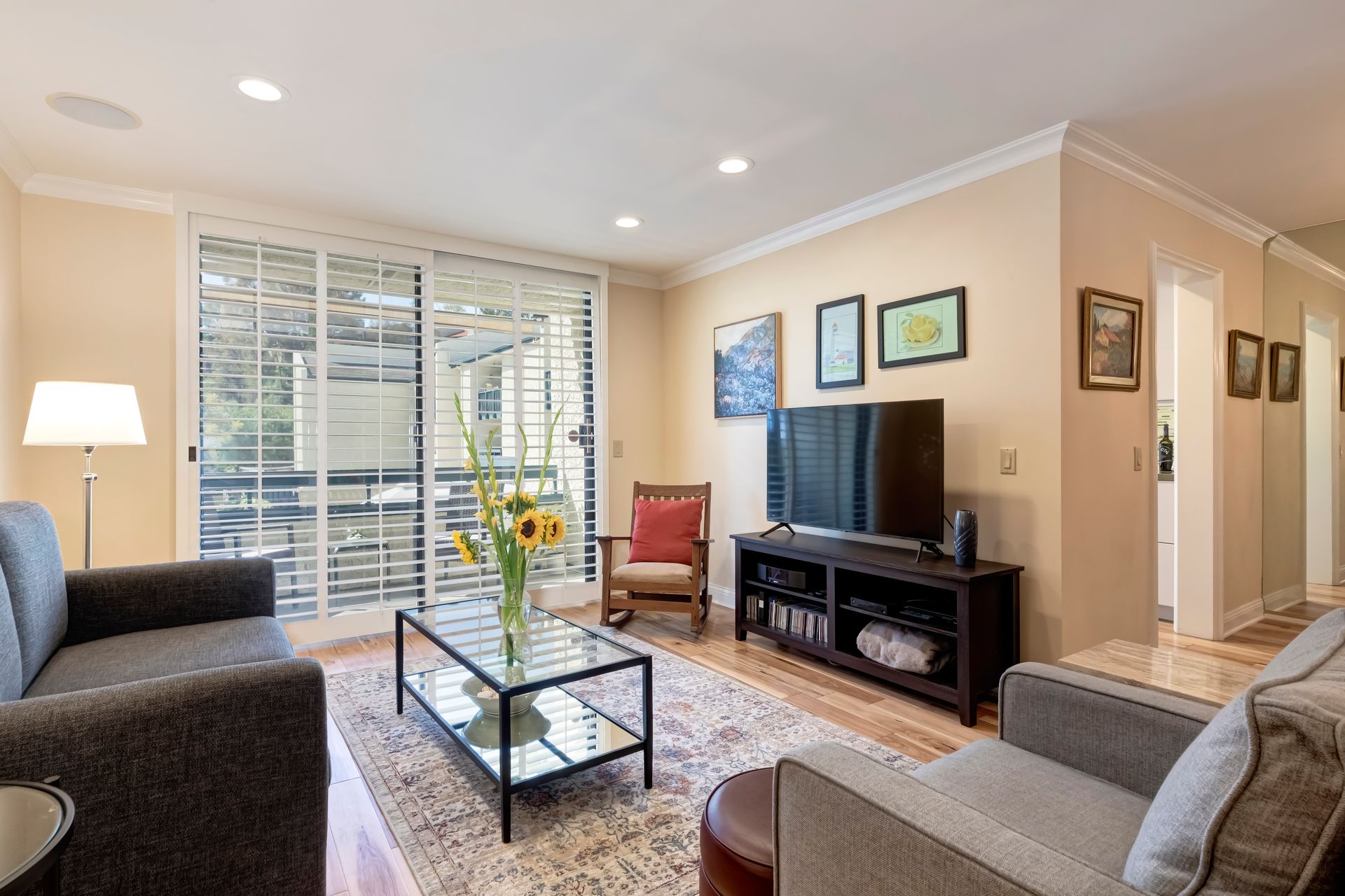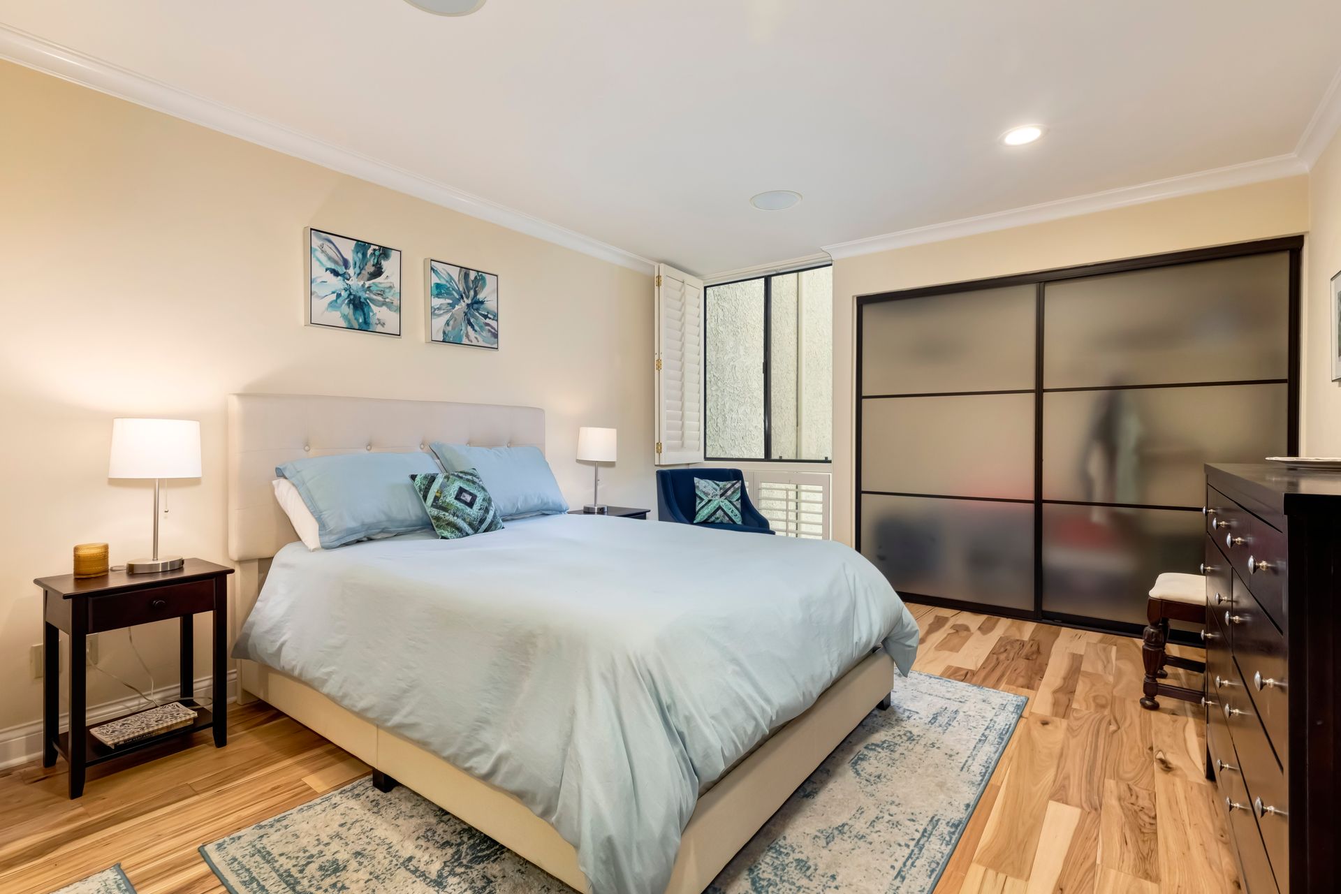 Every detail has been meticulously upgraded to enhance your living experience, from smooth walls and ceilings to rich hickory flooring, deep crown moldings, spacious six-inch baseboards, recessed lighting, built-in speakers, solid-core doors, plantation shutters and sleek glass closet doors in both bedrooms.