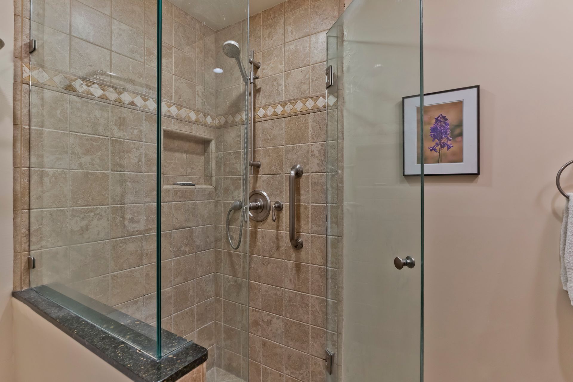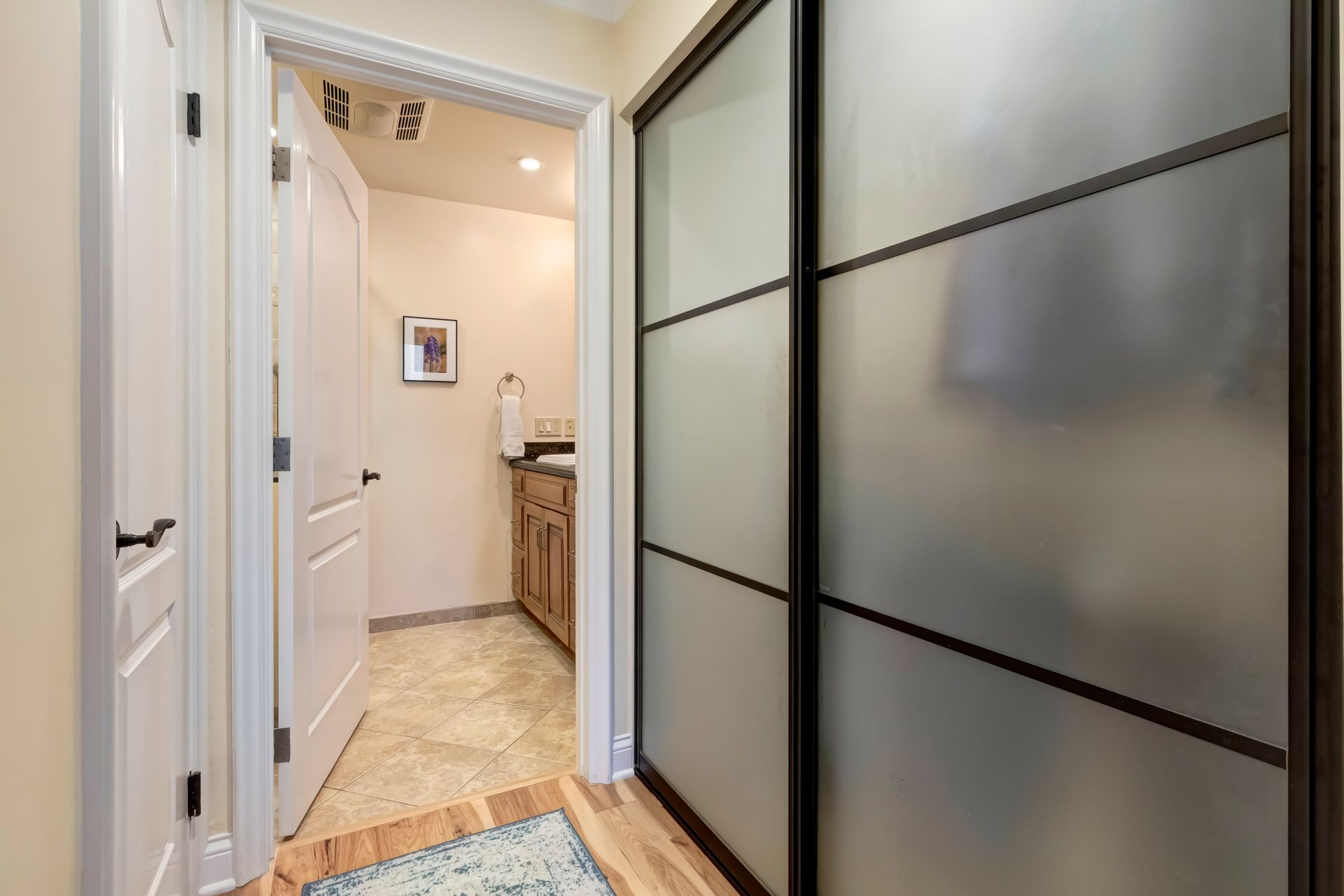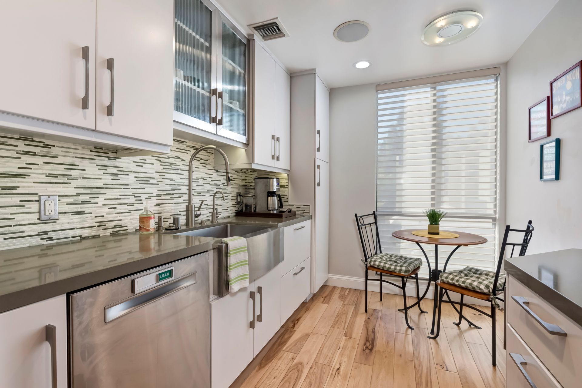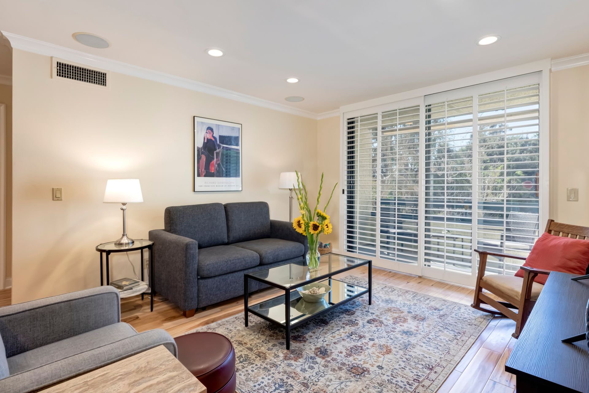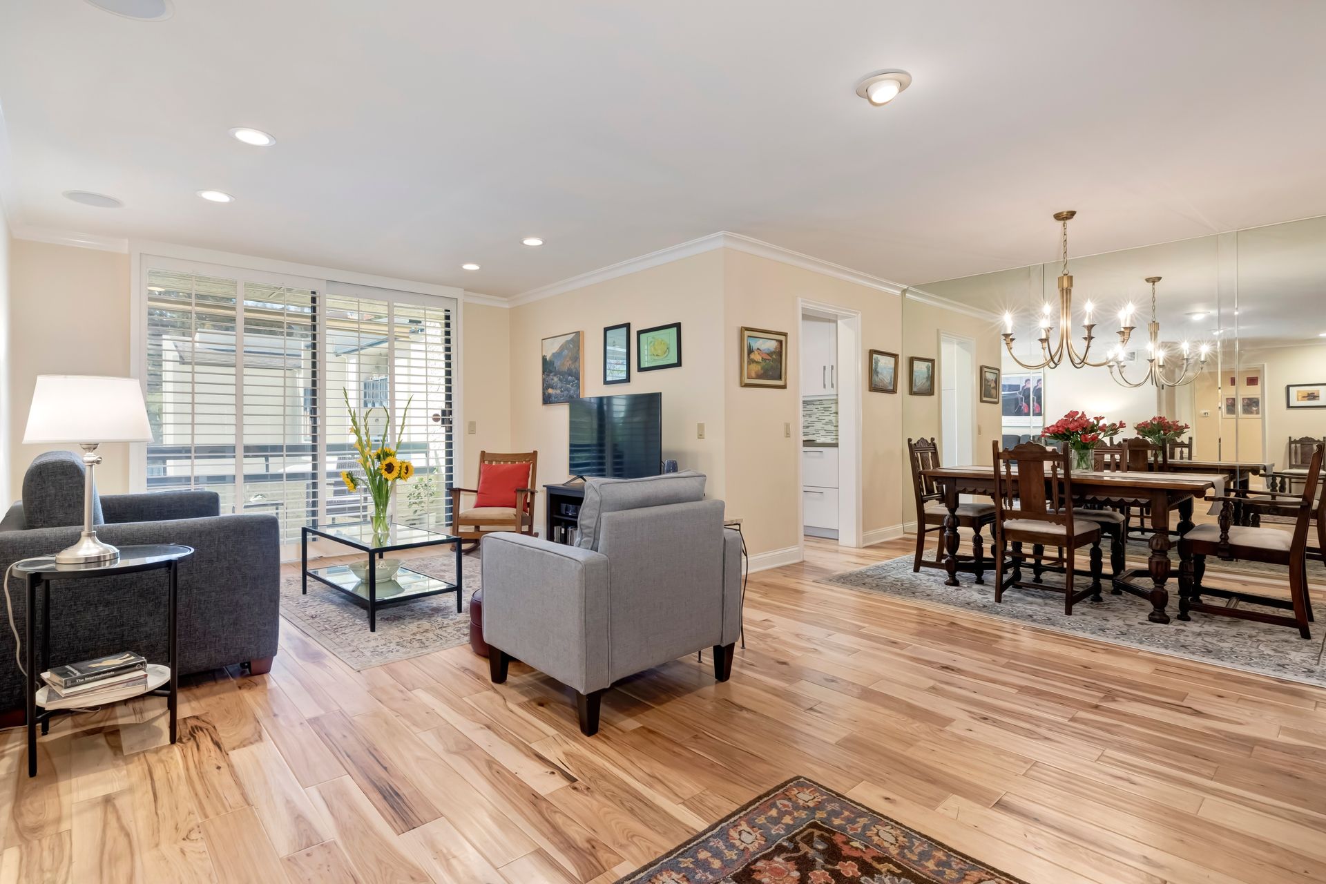 Every detail has been meticulously upgraded to enhance your living experience, from smooth walls and ceilings to rich hickory flooring, deep crown moldings, spacious six-inch baseboards, recessed lighting, built-in speakers, solid-core doors, plantation shutters and sleek glass closet doors in both bedrooms.