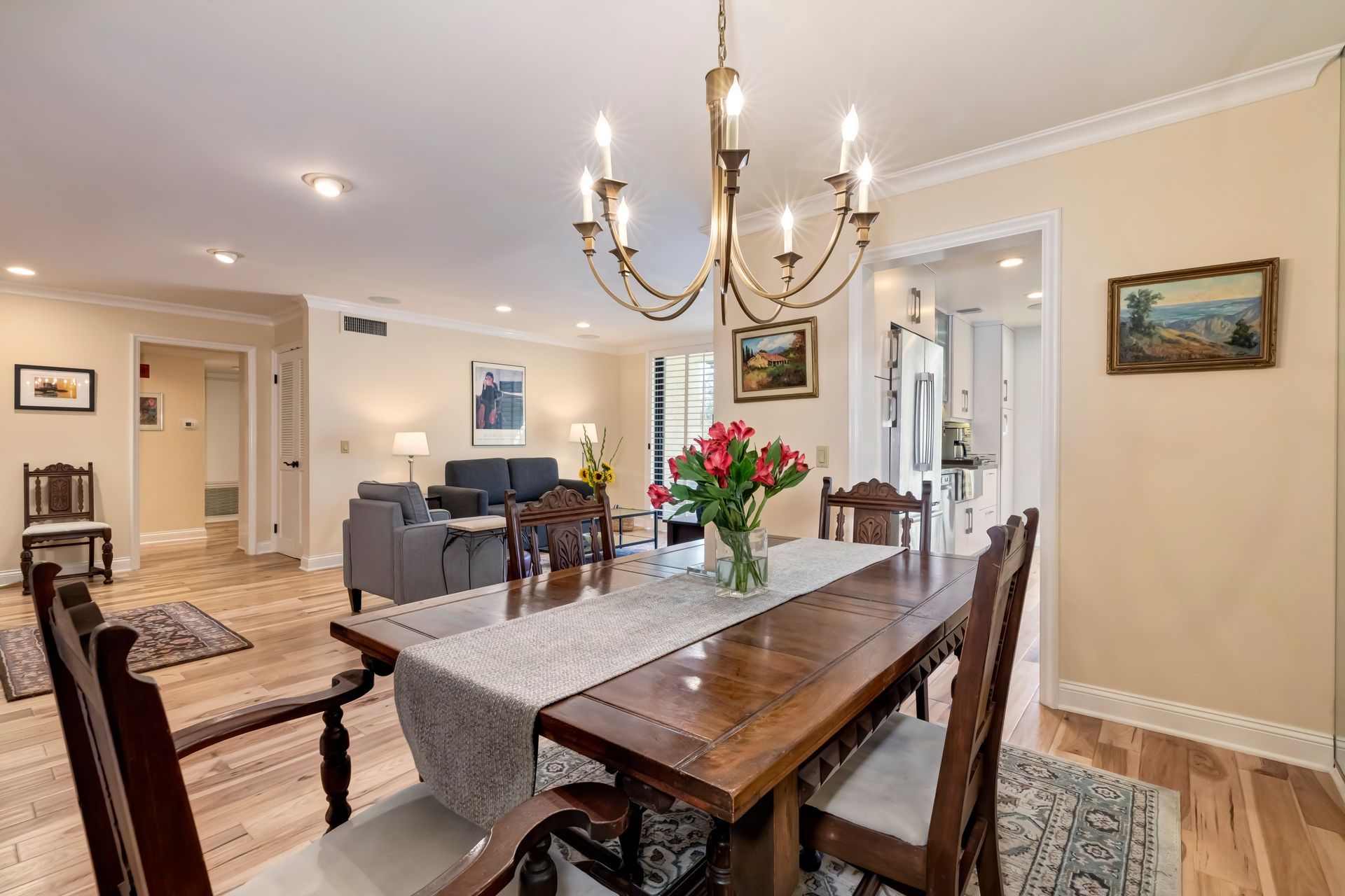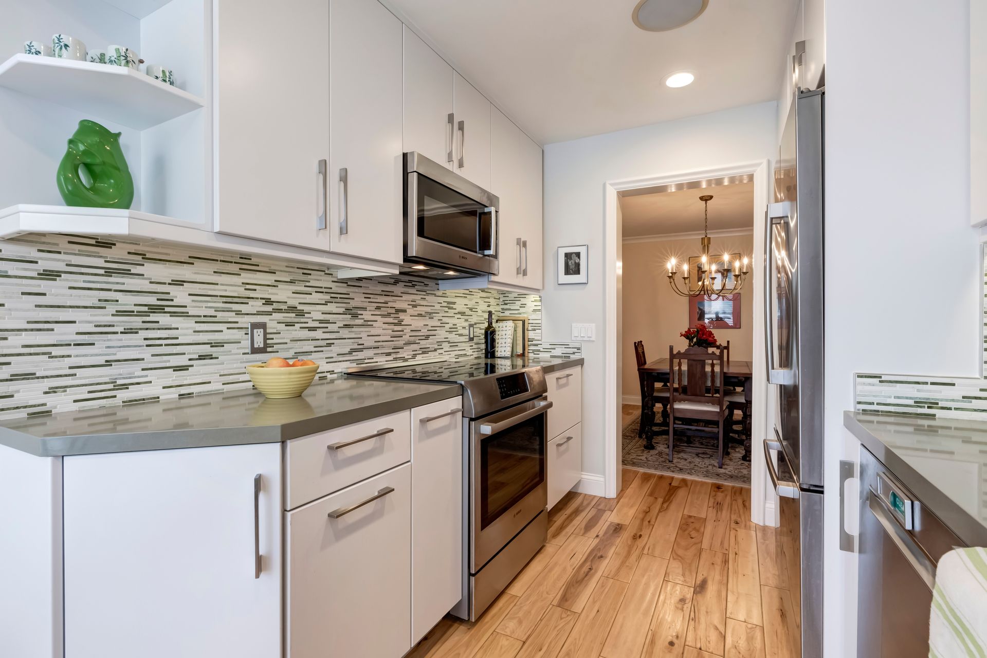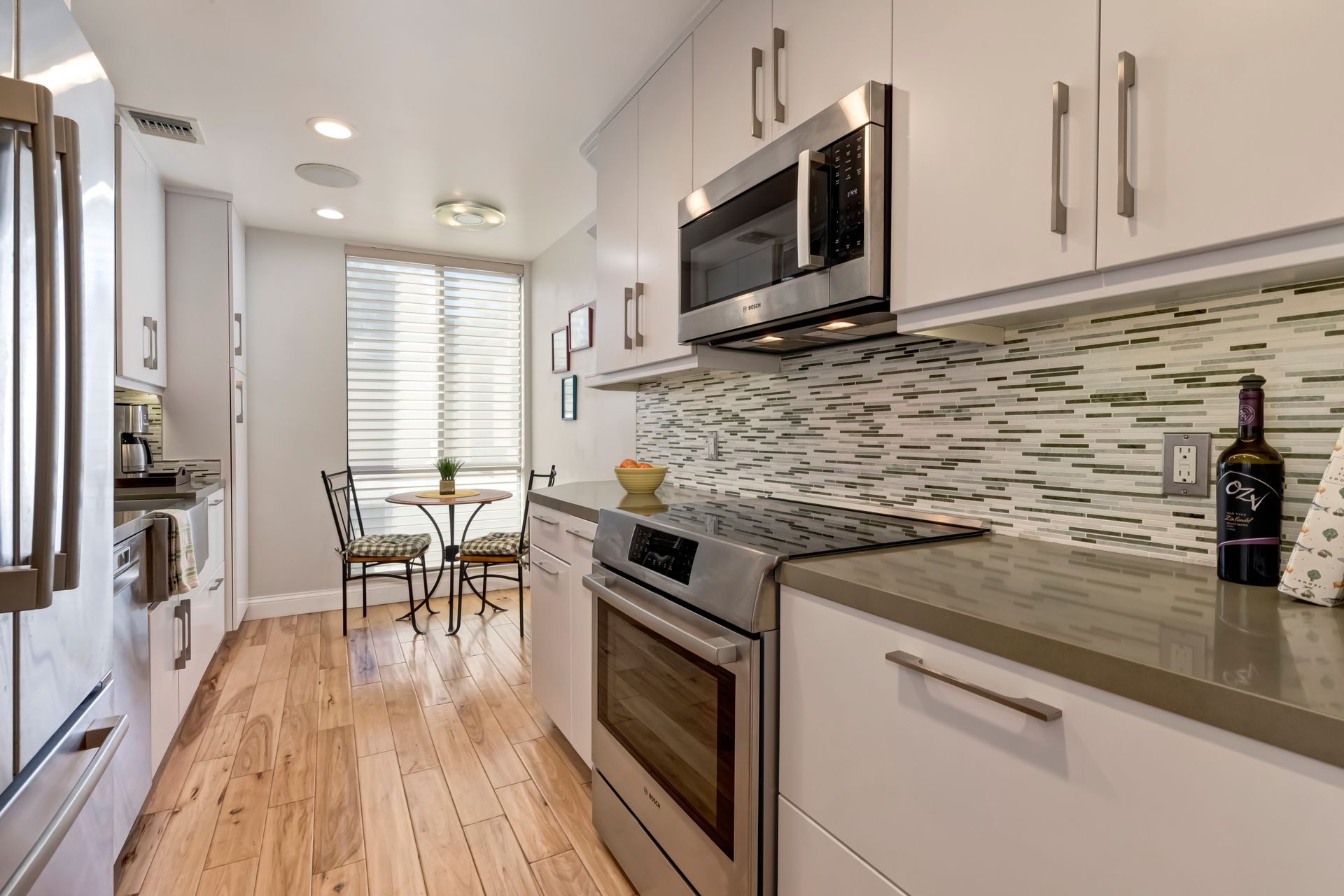 The formal dining area is ideally positioned next to a beautifully upgraded kitchen that boasts custom cabinetry, exquisite quartz countertops and top-of-the-line Bosch stainless steel appliances, including an induction range. The charming breakfast nook, graced by a generous window, basks in natural light—making it the ideal spot for savoring your morning coffee.