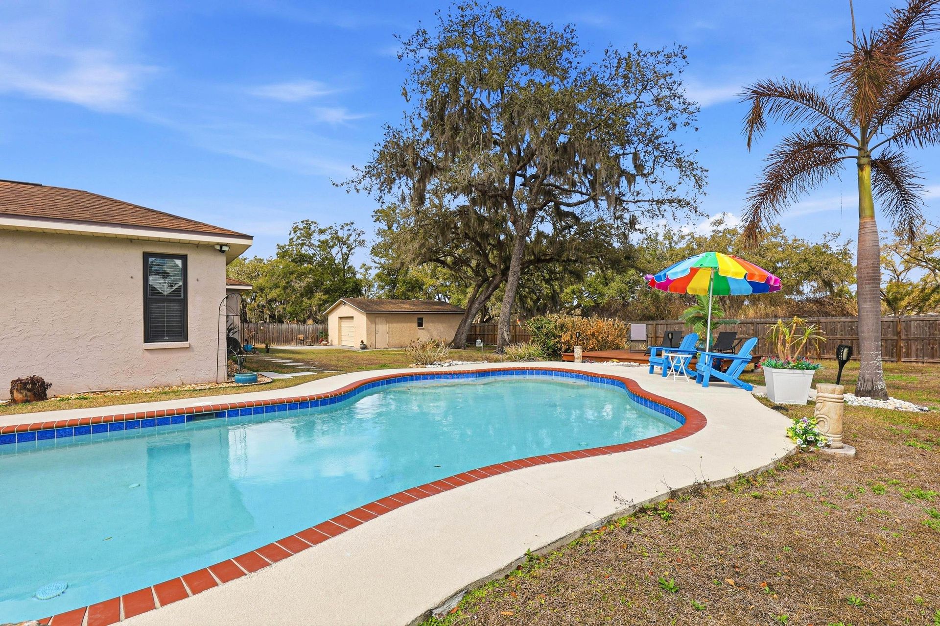 Wonderful, four-bedroom, three-bathroom home with an inground pool, and a detached, block garage/workshop that has electric. No homeowner or CDD fees. This property is almost a 1/2 acre with a fenced rear yard. Tile flooring throughout and no wasted space. There are two primary suites, located on opposite sides of the house. You will be impressed with the open floor plan and natural light. Owners have lavished with care and attention. The great room features a front bay window and a vaulted ceiling. The dining area is adjacent to the great room. Updated kitchen has a spacious pantry, granite counters and fairly new appliances. You will enjoy the pass-through window to the screened lanai. The two-car garage attached has an opener and side door to the exterior. The washer and dryer are new and will remain. Built in 1985 with 1,892 sq. ft. of easy living space. There are two heating and cooling, energy-efficient units that have been recently replaced. Conveniently located for excellent nearby schools, shopping, dining, library, and access to major roads for commutes to Tampa, Lakeland, Gulf beaches and Disney via I75 and Selmon Expressway. Make an appointment now to claim this ideal Florida home for your enjoyment.
