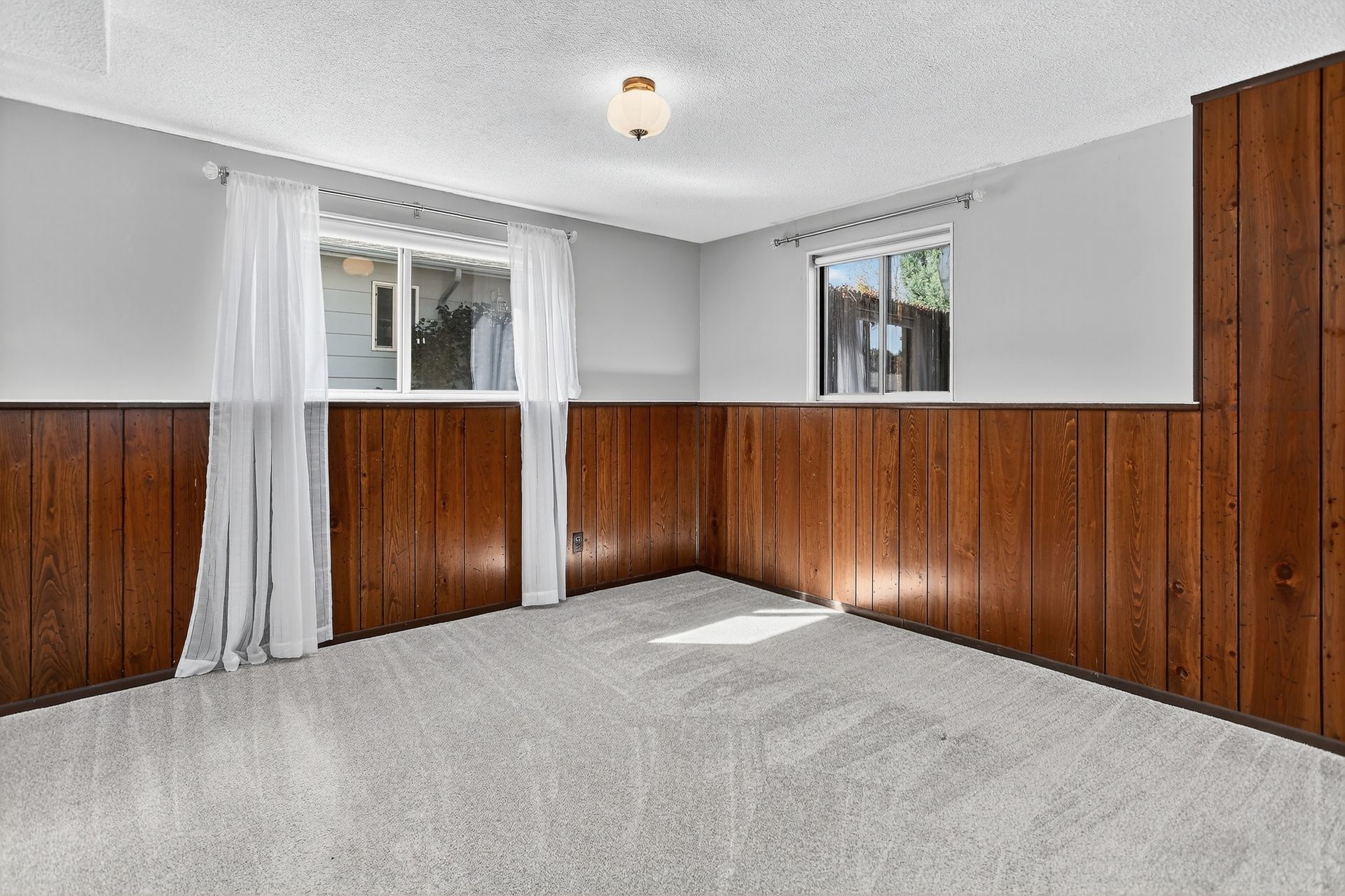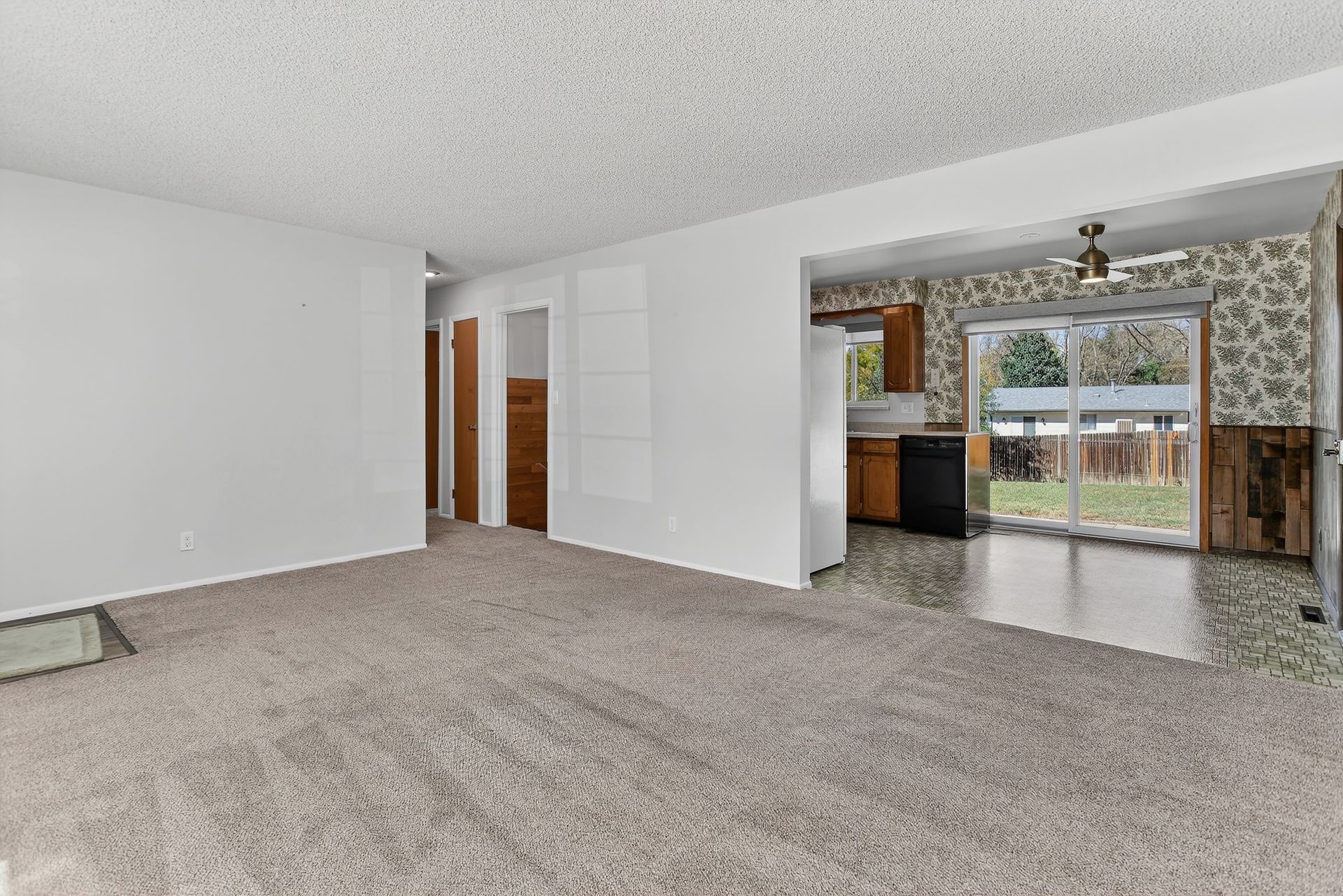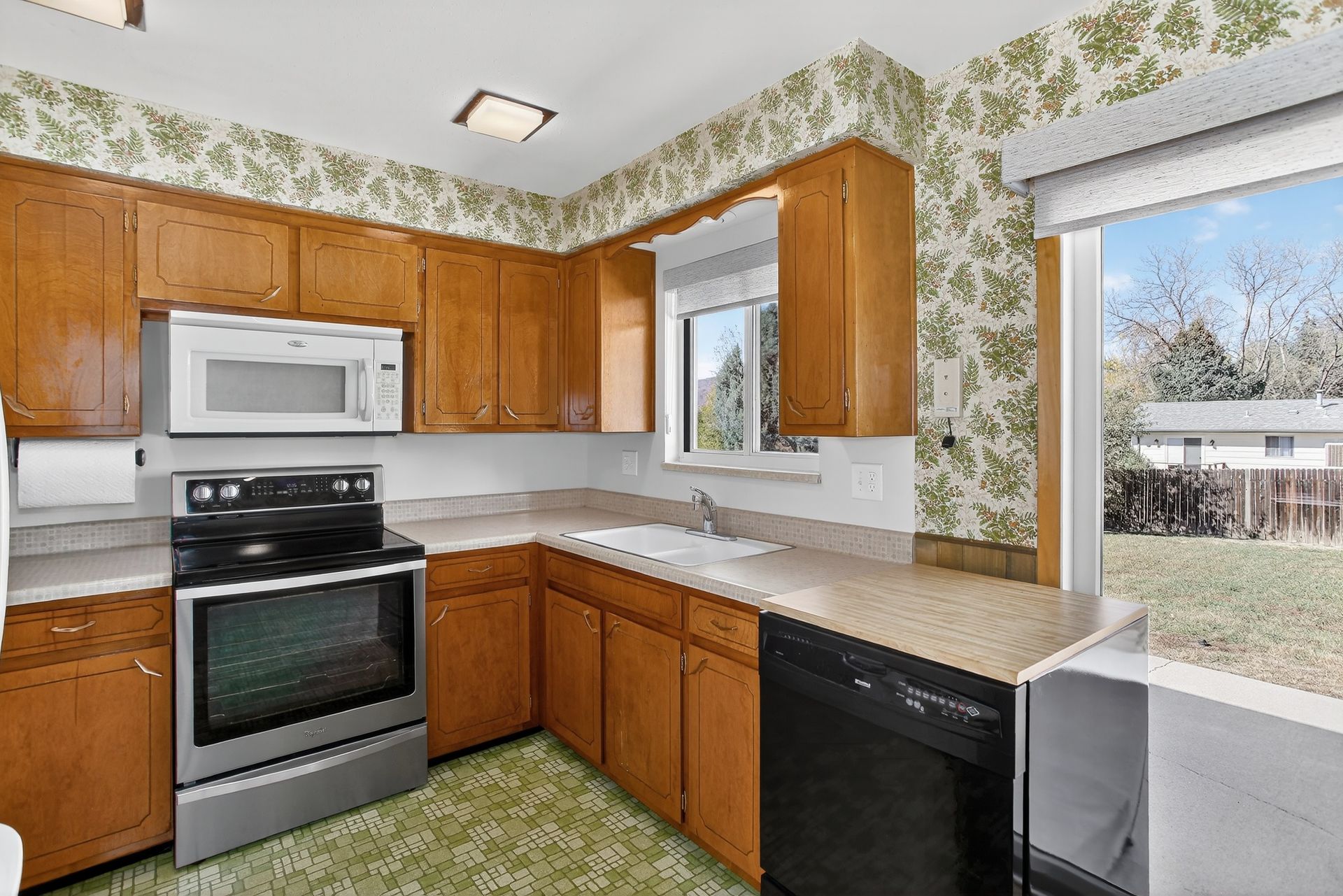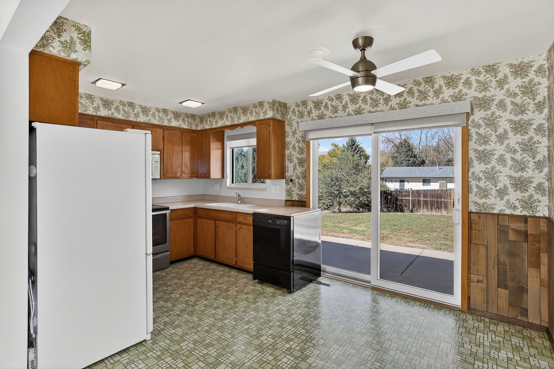 Meticulously maintained! This lovingly cared for home features...a sunny, south-facing 15'x17' living room with bay window, original paneling, and hardwood floors underneath the newer carpet...charming eat-in kitchen with gleaming original cabinetry and scrollwork detail, window that overlooks the backyard, all appliances including electric smooth-top range, French door refrigerator and rolling dishwasher, and automated shades on the door out to the concrete patio...primary bedroom with hardwood floors under the newer carpet, two windows to let in the light, step-in closet and direct access to the roomy full hall bath with solid surface extended countertop and vanity seat space, built-in linen cabinet and marble-look tub/shower surround...2 additional main level bedrooms, both freshly painted and with refinished hardwood floors. In the basement you'll enjoy the cozy 12'x37' family room with original paneling, new carpet, two storage closets and plenty of space to use as a game/office/TV/playroom or gym...4th bedroom with above-grade windows, newer carpet, original paneling and ensuite 3/4 bath...laundry/mechanical room with included W/D...and 10'x11' workshop with ample built-in cabinetry and extra refrigerator. Outside, you'll enjoy the...spacious backyard with cherry tree and partial mountain views...and extra parking on the side of the driveway. Just a short distance to Portal Park, UCCS, University Village shops and restaurants, and access to several bike trails. Furnace, AC, storm door ('24); garage door opener ('22); roof ('19); 50 gallon water heater ('14); almost all vinyl windows, too!