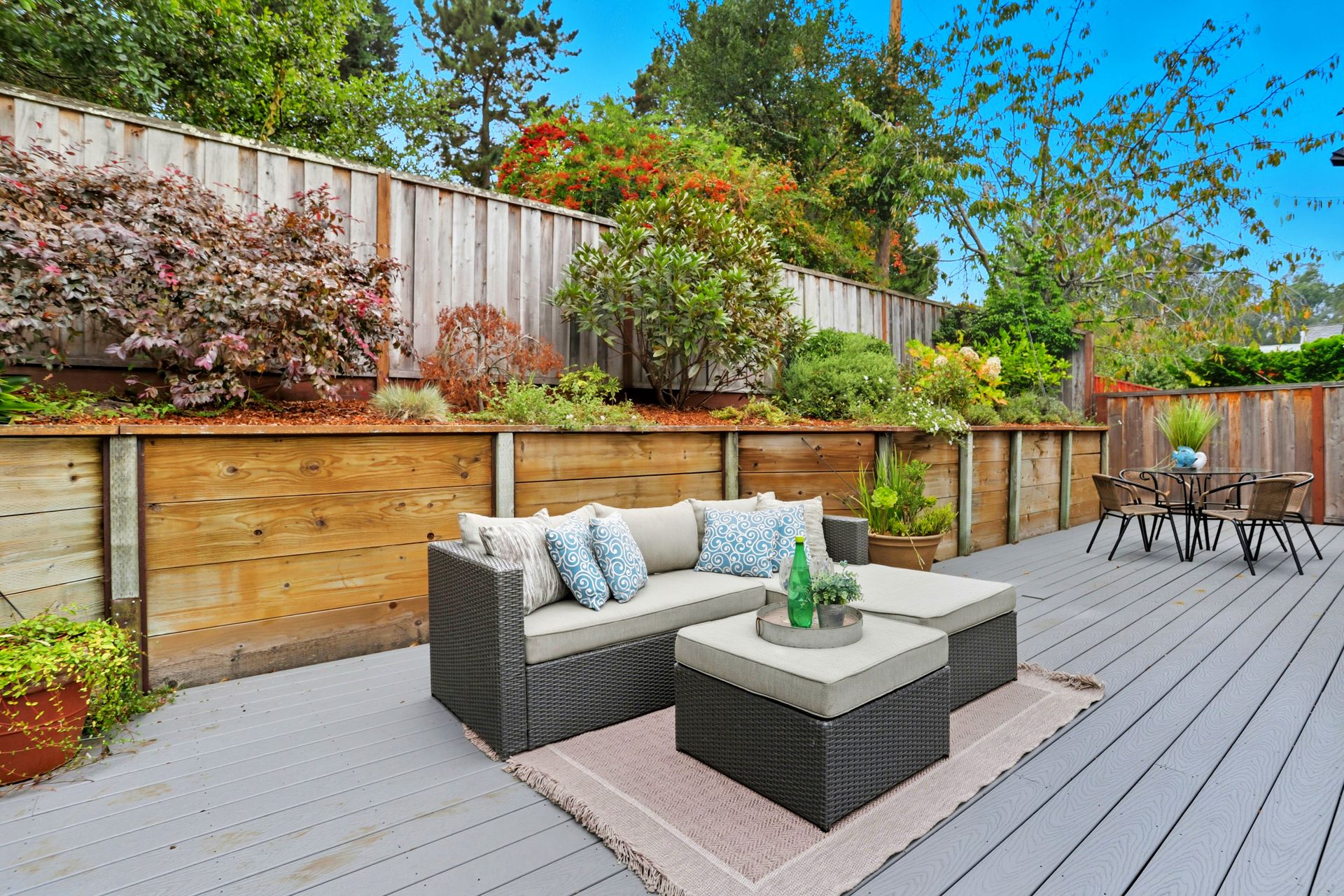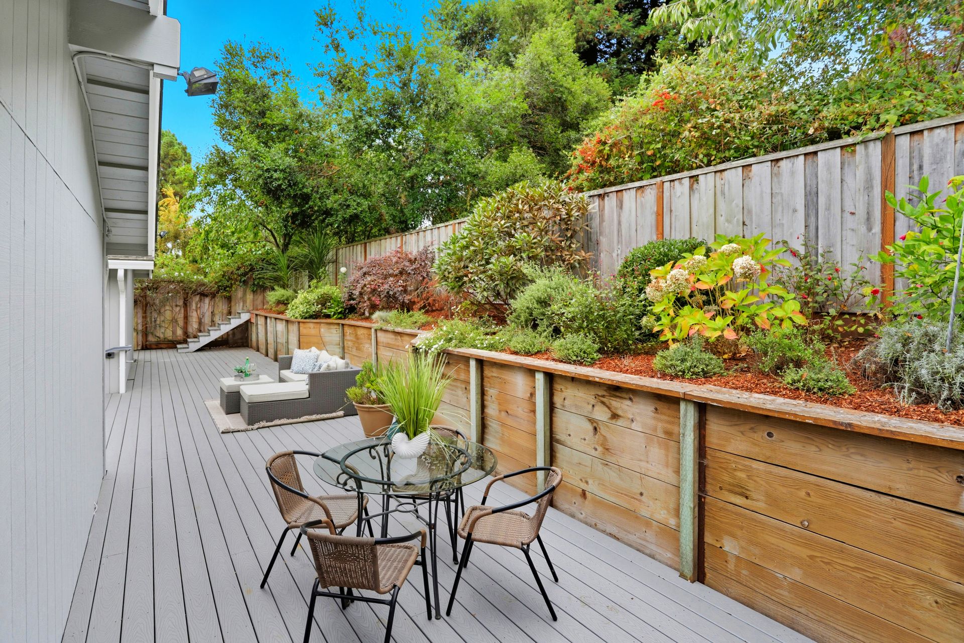 The lovely eat-in kitchen has an abundance of cabinetry, natural stone countertops and access to the sunny rear courtyard. The private, professionally landscaped rear yard with a large Trex deck is ideal for entertaining or relaxing.