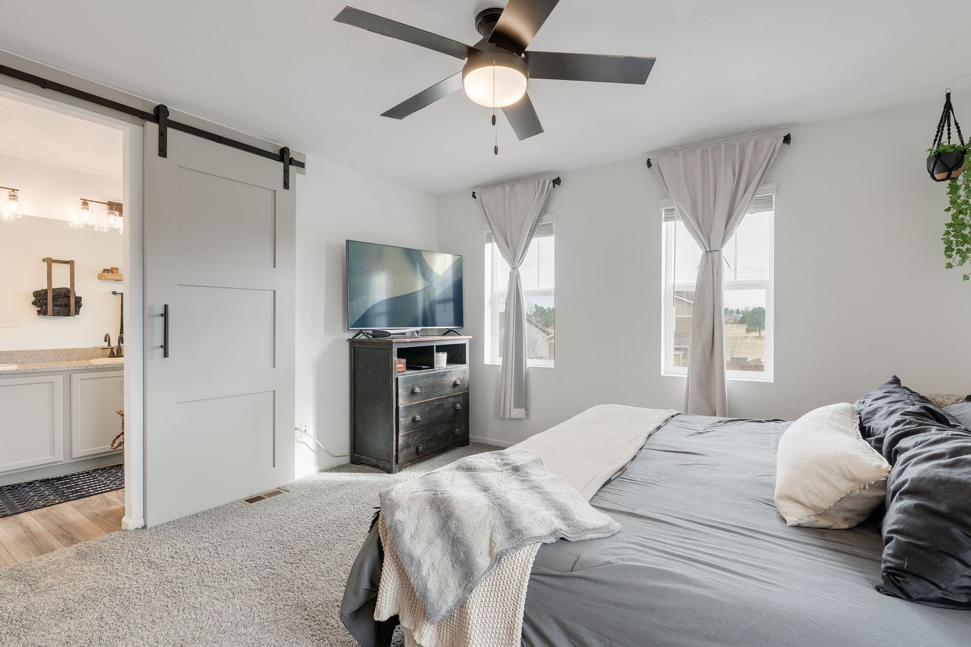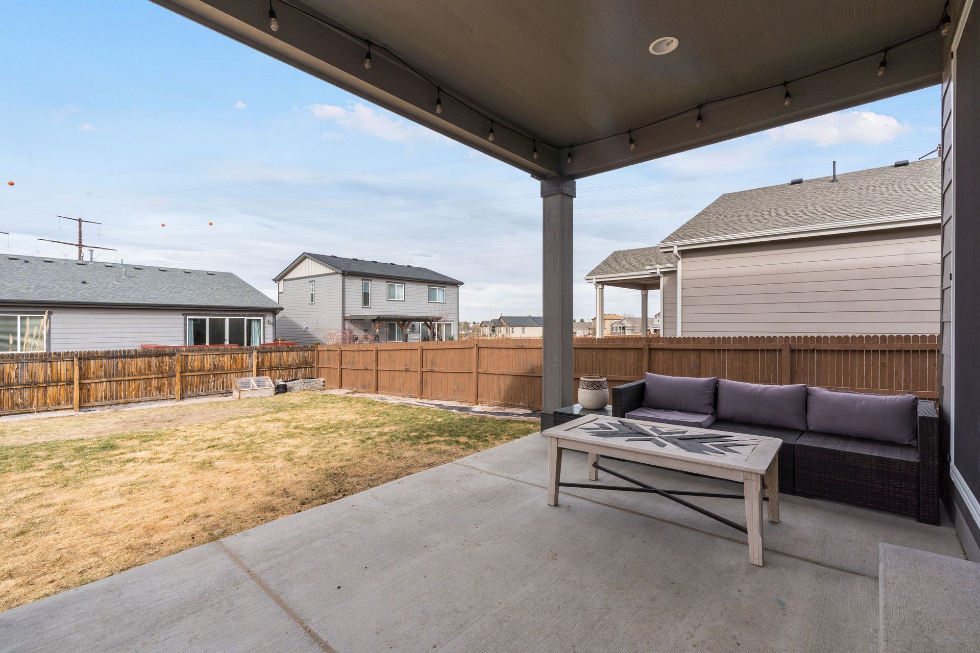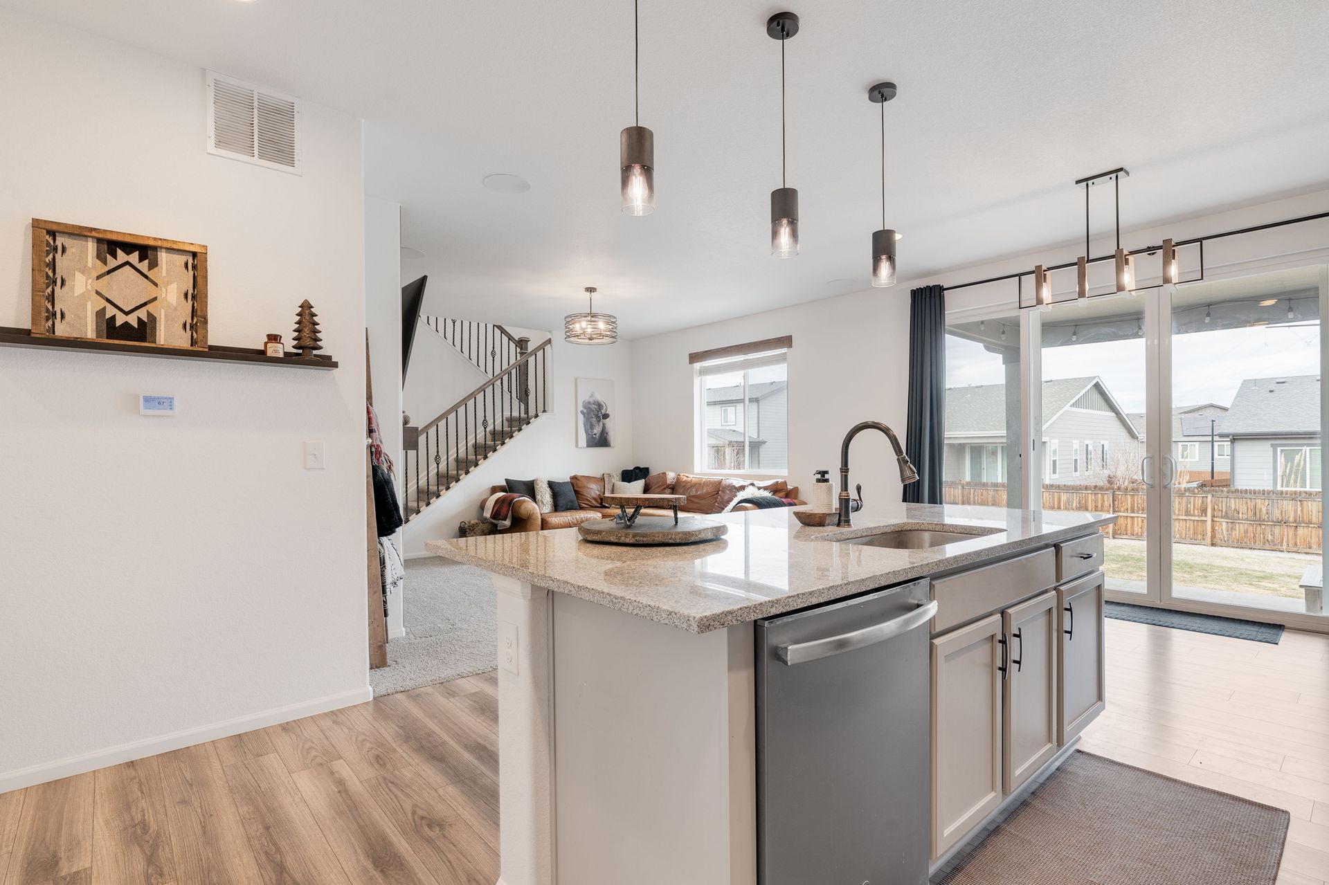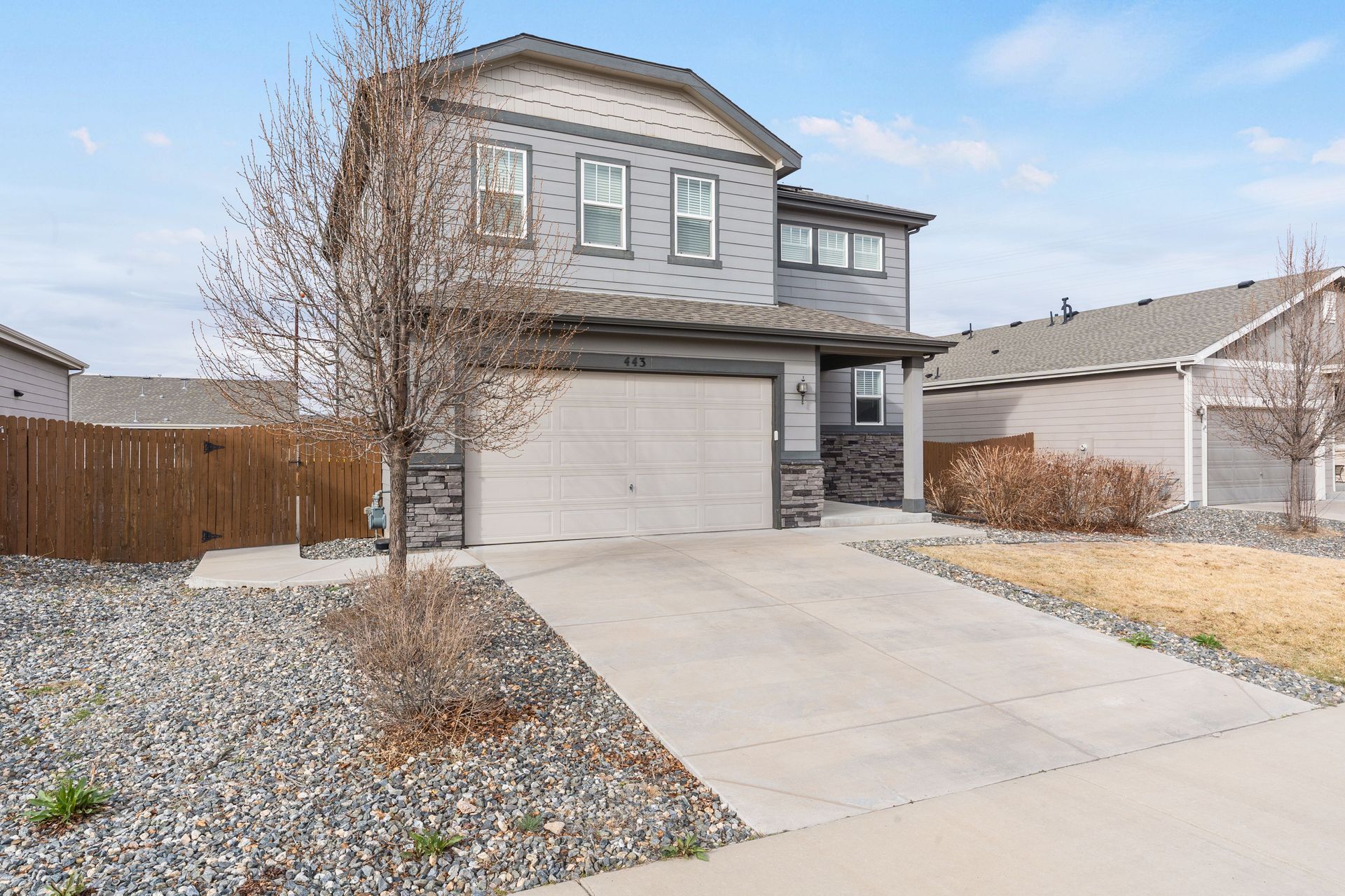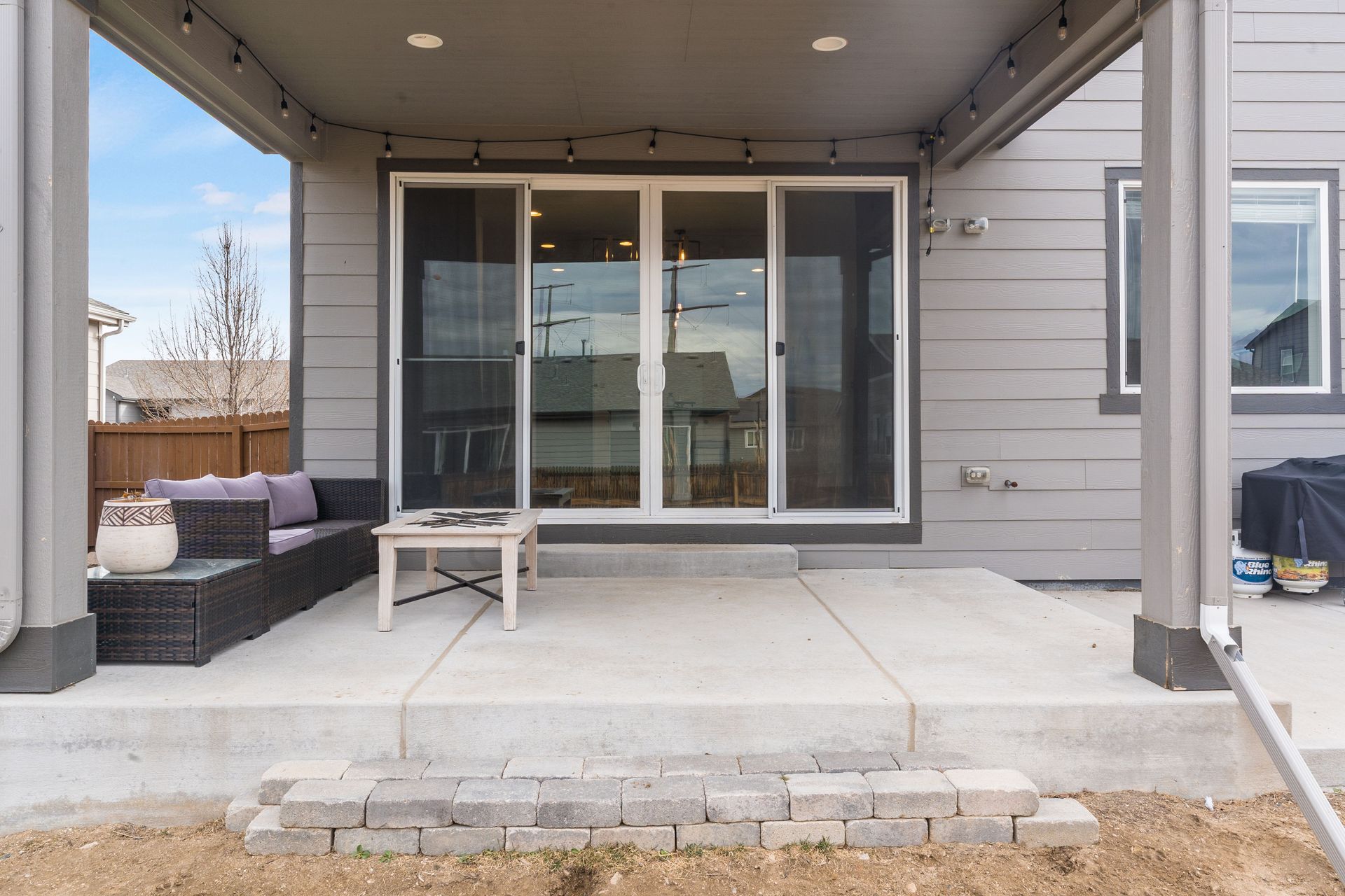 Beautiful two-story Richmond home in Founders Village, located within a cul-de-sac location. Modern contemporary with three bedrooms plus a loft. Kitchen includes GE Slate appliances, gray cabinets, large granite island, and pantry with a sliding barn door. Dining area with a dual patio door system to a covered patio in the backyard. Main level family room with soaring ceilings, impressive modern gas fireplace and surround sound speaker system. Wrought iron spindle staircase leads to the loft, all three bedrooms, and a full bathroom. Primary bedroom suite includes a walk-in closet and ceiling fan. Primary bath has a gray barn door entry, upgraded spa-like shower, and dual vanities. Convenient upper-level laundry room with attached cabinets. Fully fenced flat backyard with covered concrete patio and additional concrete pad for a gas grill and patio furniture. Located within the highly rated Douglas County School District, with easy access to Rock Ridge Elementary. Close to neighborhood walking trails, Founders Community Park, and local shopping. Easy access to the Outlets at Castle Rock, Castle Rock Hospital, and I-25.