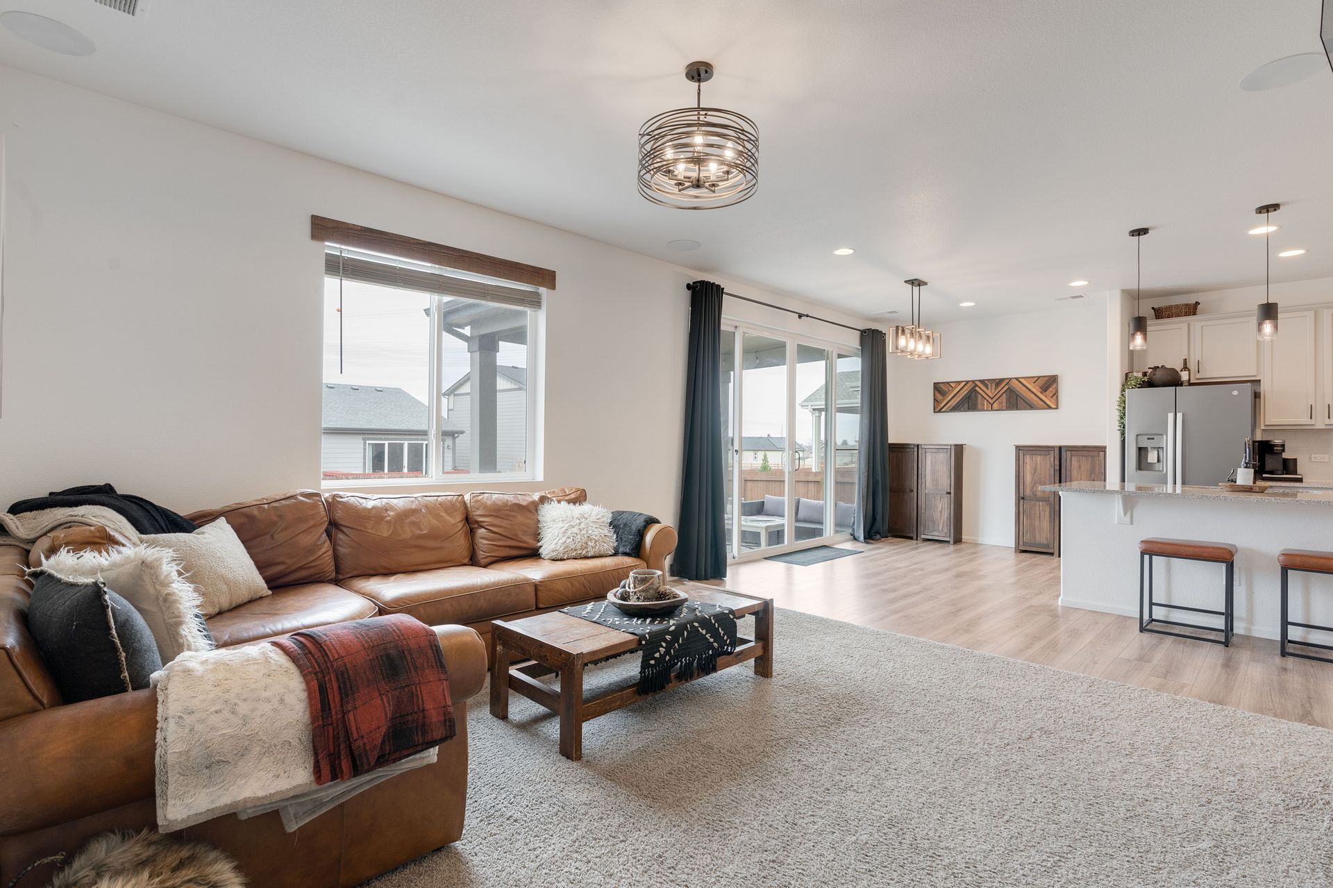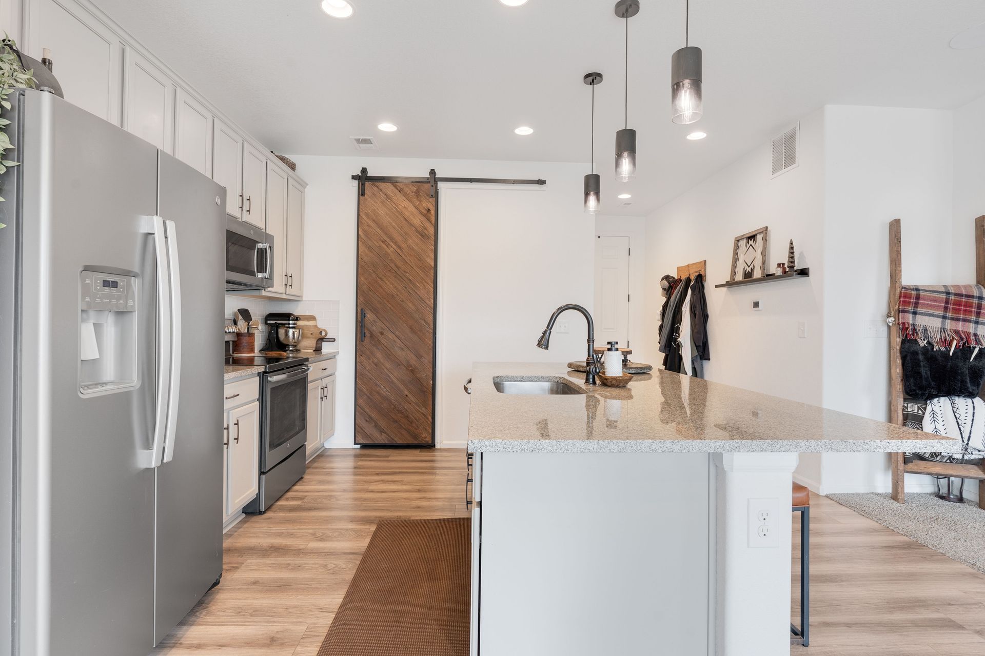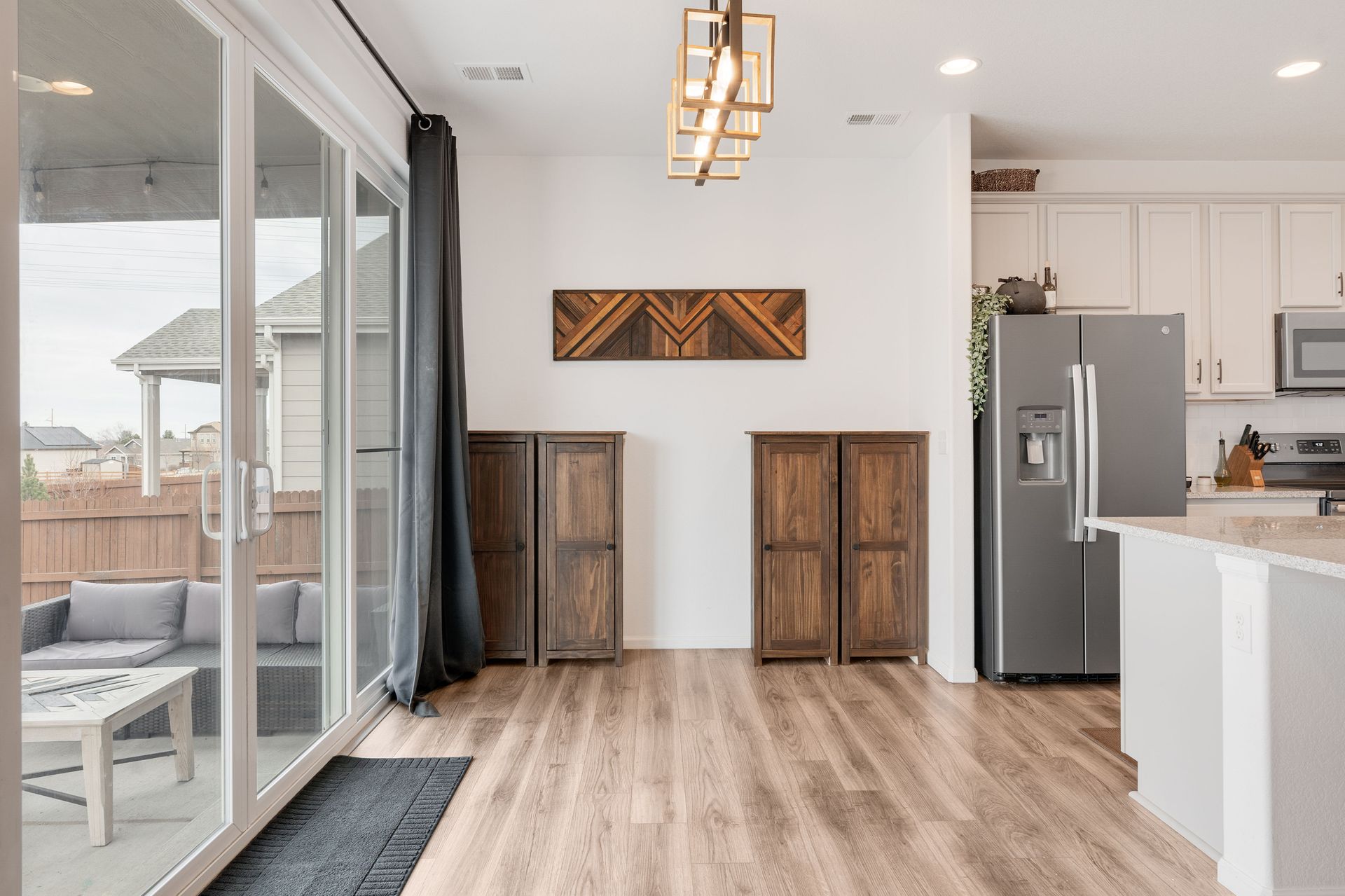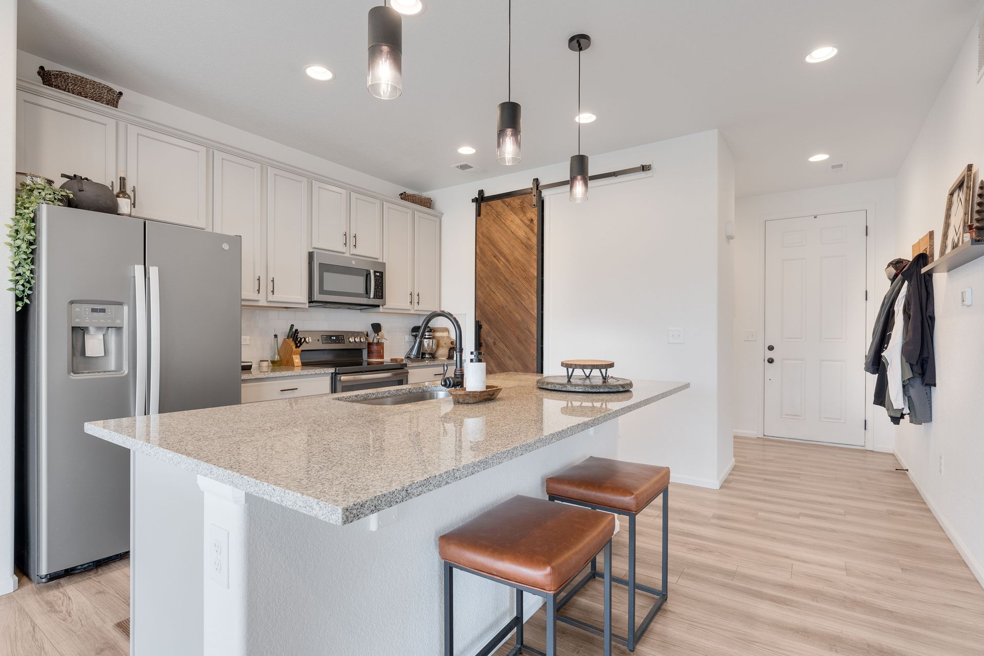 Beautiful two-story Richmond home in Founders Village, located within a cul-de-sac location. Modern contemporary with three bedrooms plus a loft. Kitchen includes GE Slate appliances, gray cabinets, large granite island, and pantry with a sliding barn door. Dining area with a dual patio door system to a covered patio in the backyard. Main level family room with soaring ceilings, impressive modern gas fireplace and surround sound speaker system. Wrought iron spindle staircase leads to the loft, all three bedrooms, and a full bathroom. Primary bedroom suite includes a walk-in closet and ceiling fan. Primary bath has a gray barn door entry, upgraded spa-like shower, and dual vanities. Convenient upper-level laundry room with attached cabinets. Fully fenced flat backyard with covered concrete patio and additional concrete pad for a gas grill and patio furniture. Located within the highly rated Douglas County School District, with easy access to Rock Ridge Elementary. Close to neighborhood walking trails, Founders Community Park, and local shopping. Easy access to the Outlets at Castle Rock, Castle Rock Hospital, and I-25.