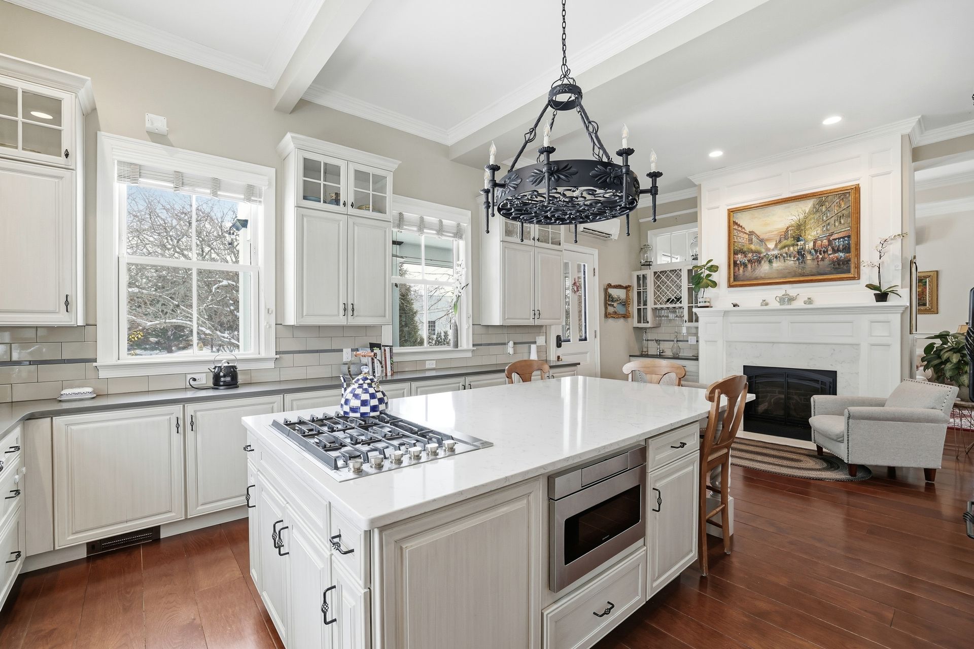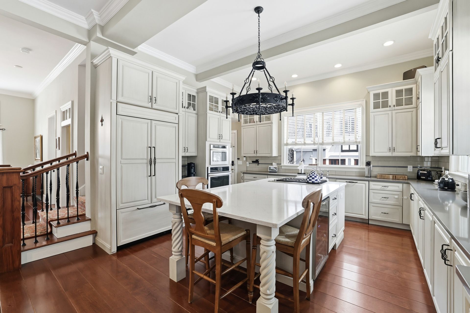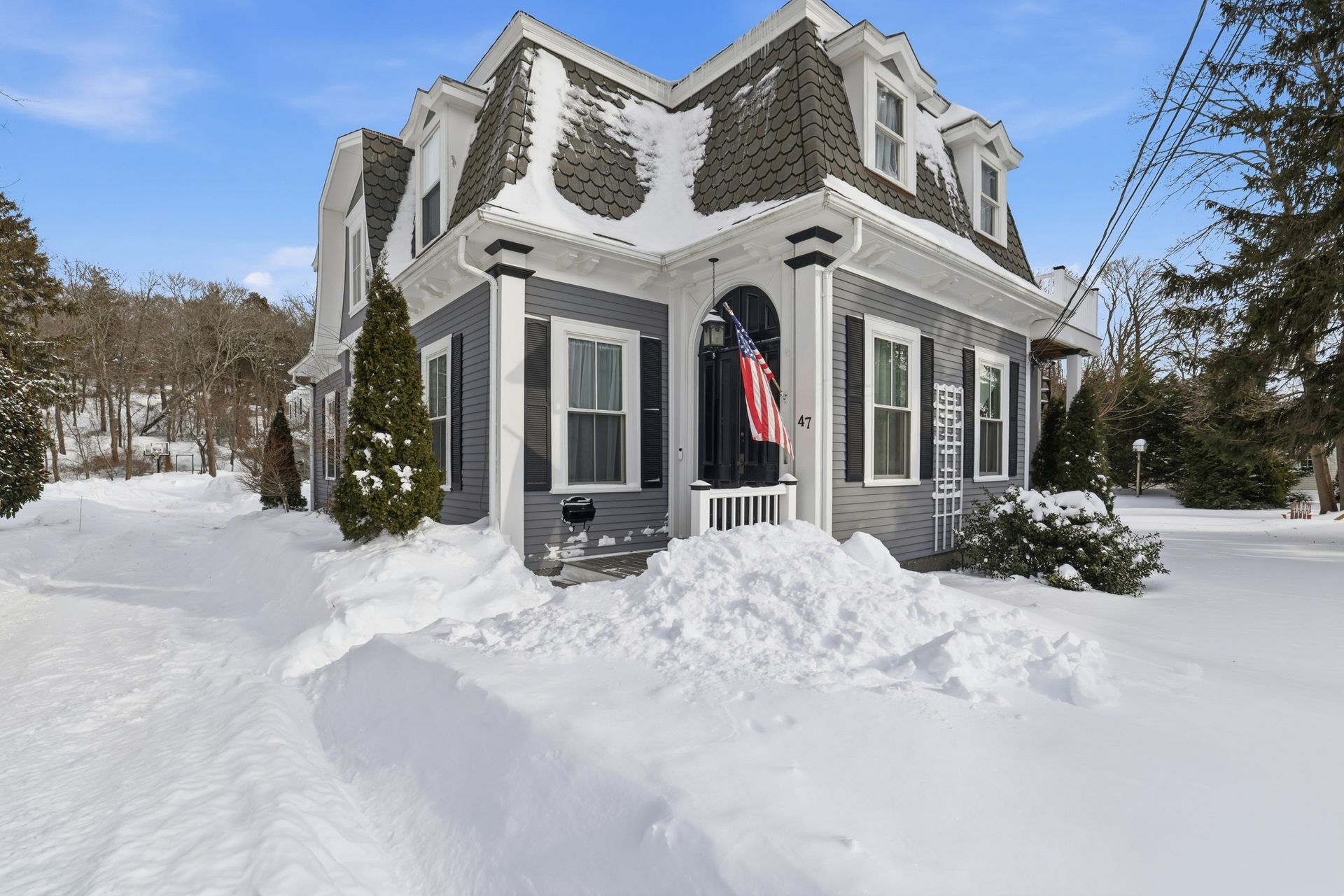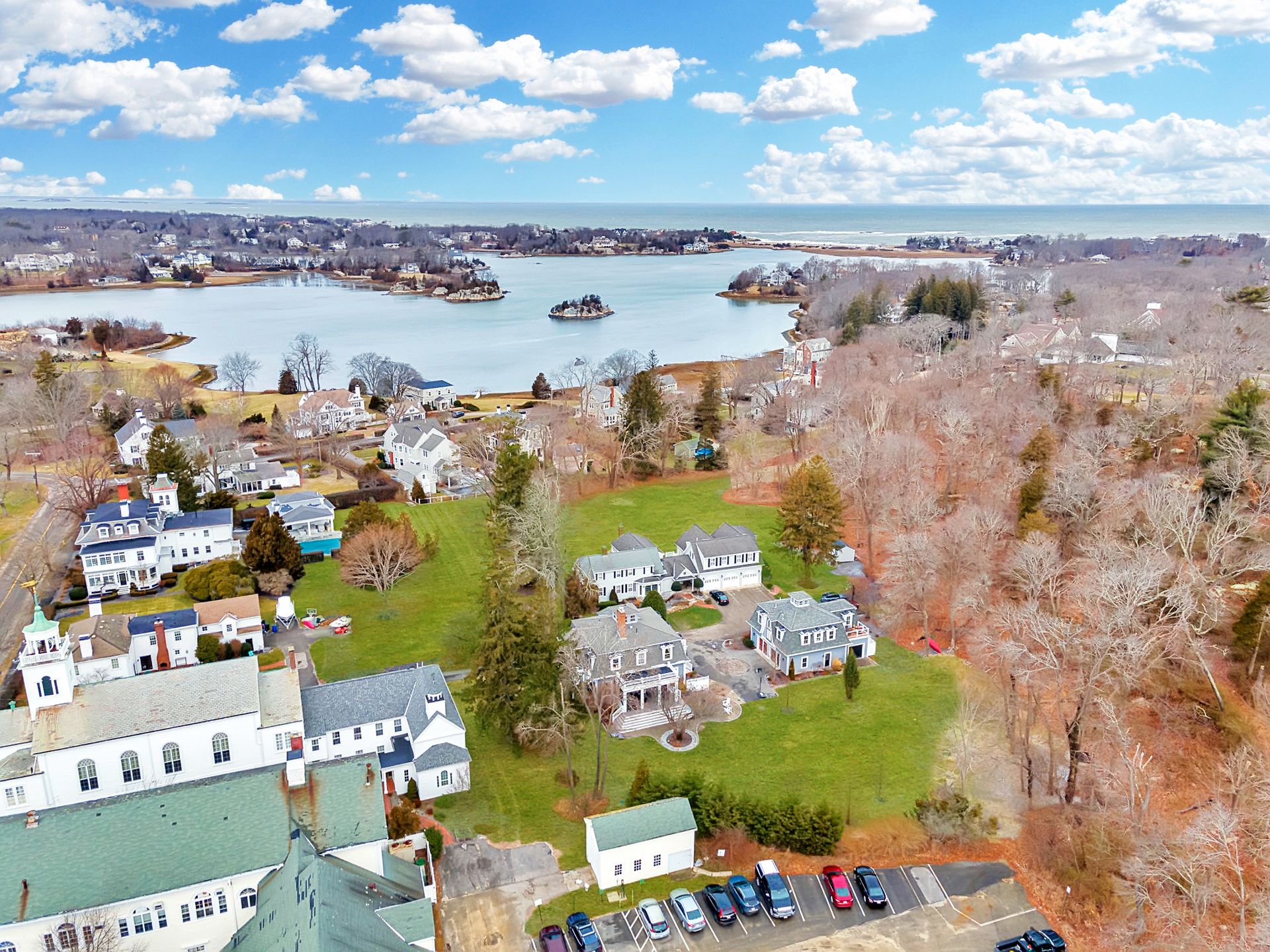 Ideally located in the heart of downtown Cohasset, just steps from the picturesque Common, this beautifully renovated residence is set on a serene, level .75-acre lot. Thoughtfully transformed in 2017, the home offers four bedrooms and 3.5 baths, with soaring 12-foot ceilings on the main level that enhance its timeless character and modern appeal. Rich millwork and custom built-ins are featured throughout. The expansive kitchen, appointed with high-end appliances, a wet bar, and a fireplaced sitting area, overlooks the beautifully landscaped grounds and opens to a covered porch with pull-down screens, creating a seamless screened-in porch. A stone patio with firepit and grill provides an ideal setting for entertaining and outdoor living. The primary suite features a fireplace, radiant heat in the bath and walk-in closet, and a private deck with a spiral staircase. A stunning carriage house built in 2016 offers exceptional flexibility, ideal for guests, a private office, studio, or rental opportunity.