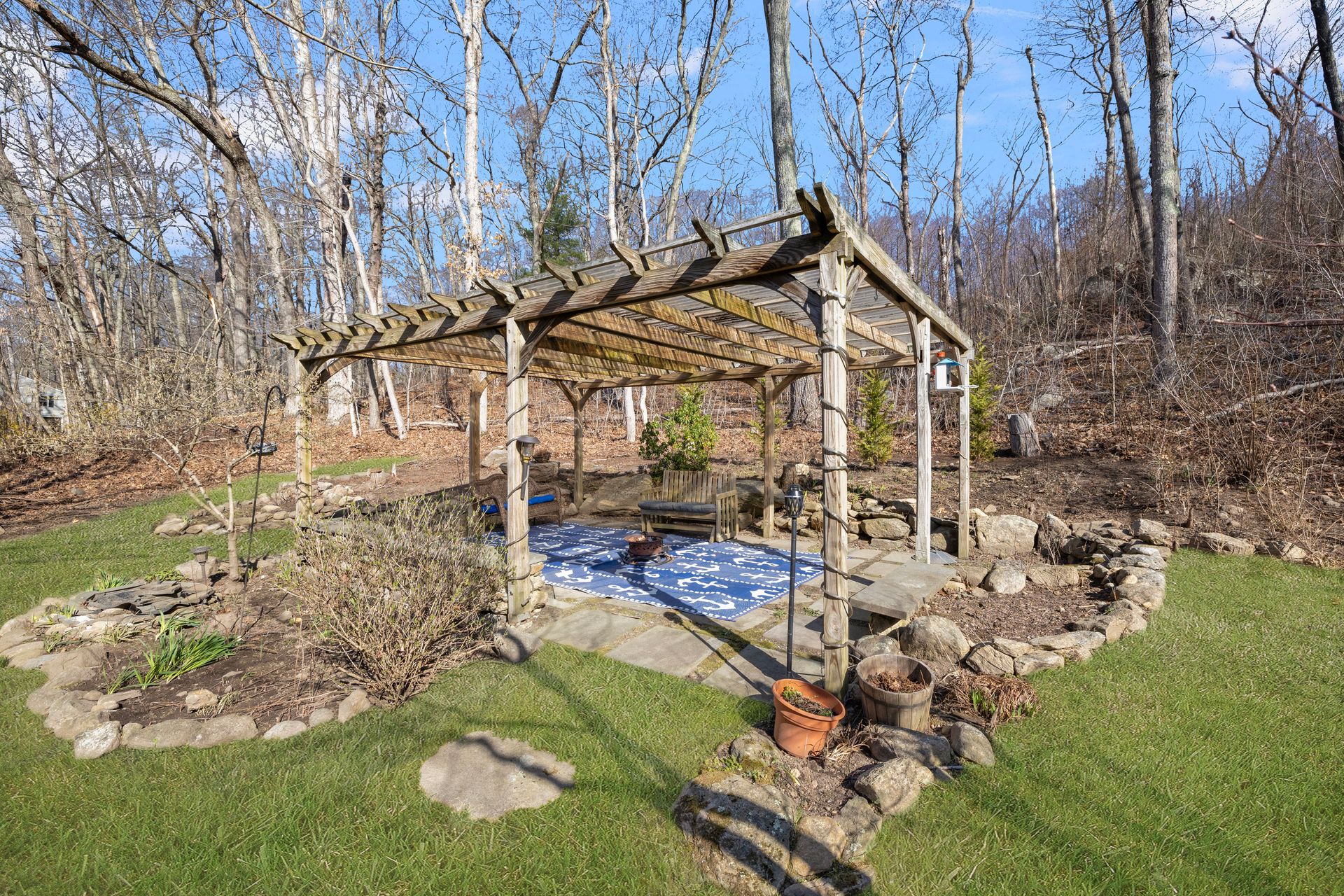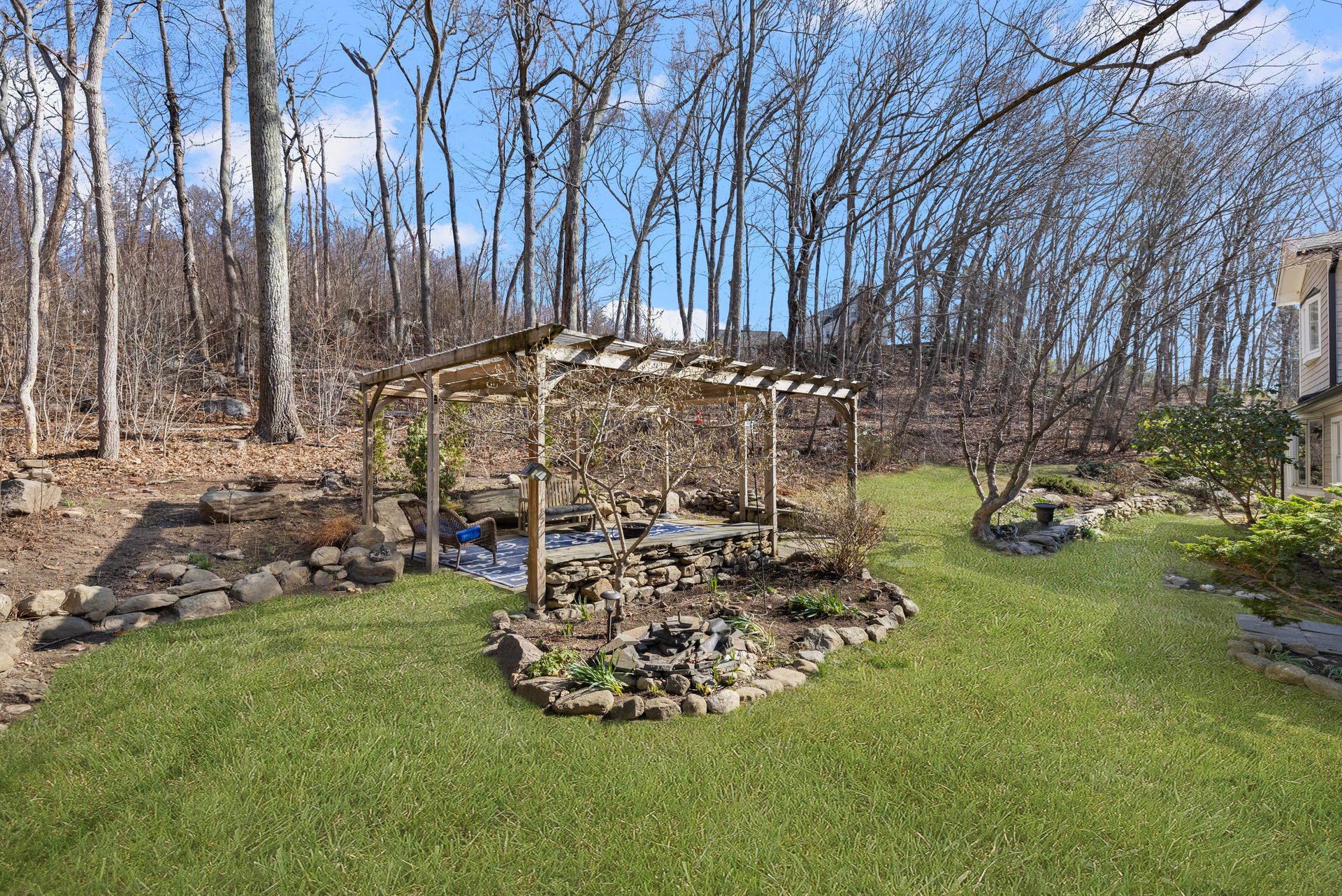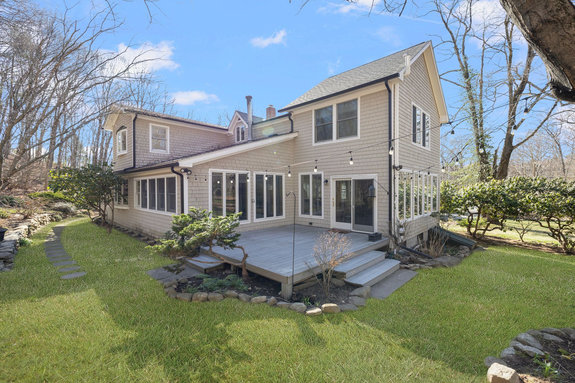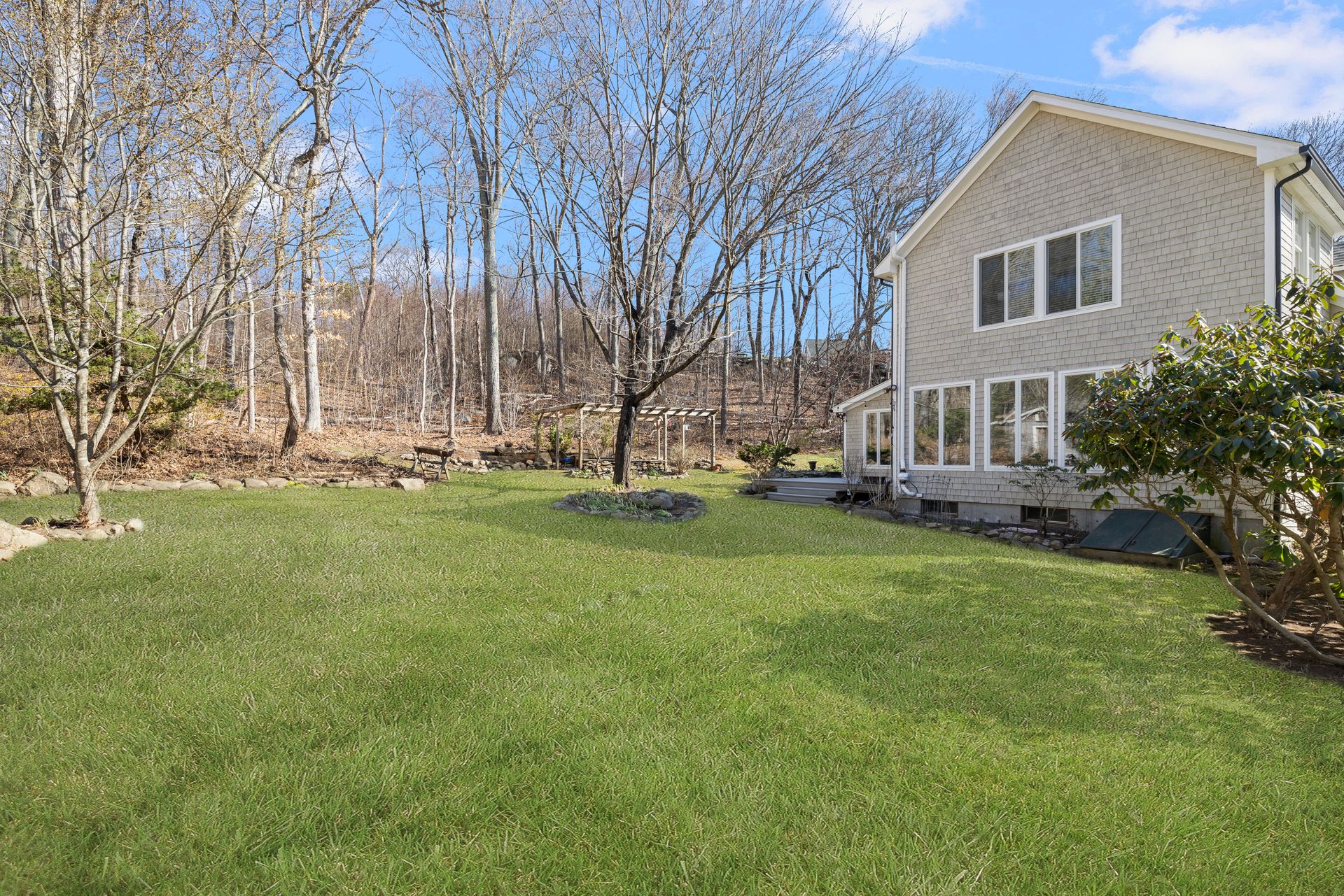 Designed for the culinary enthusiast, the custom kitchen boasts double ovens, stainless steel appliances, a wine fridge, and stylish finishes throughout. A versatile first-floor den or home office, along with a full bath and laundry, offers flexible living options. Upstairs, the oversized primary suite includes a walk-in closet and an ensuite bath. Two additional bedrooms and another full bath complete the second level. The three-season sunroom provides a serene retreat overlooking the tranquil yard and a charming pergola for summer gatherings. Multi-level landscaping adds year-round visual interest, especially as spring brings vibrant color to the grounds.