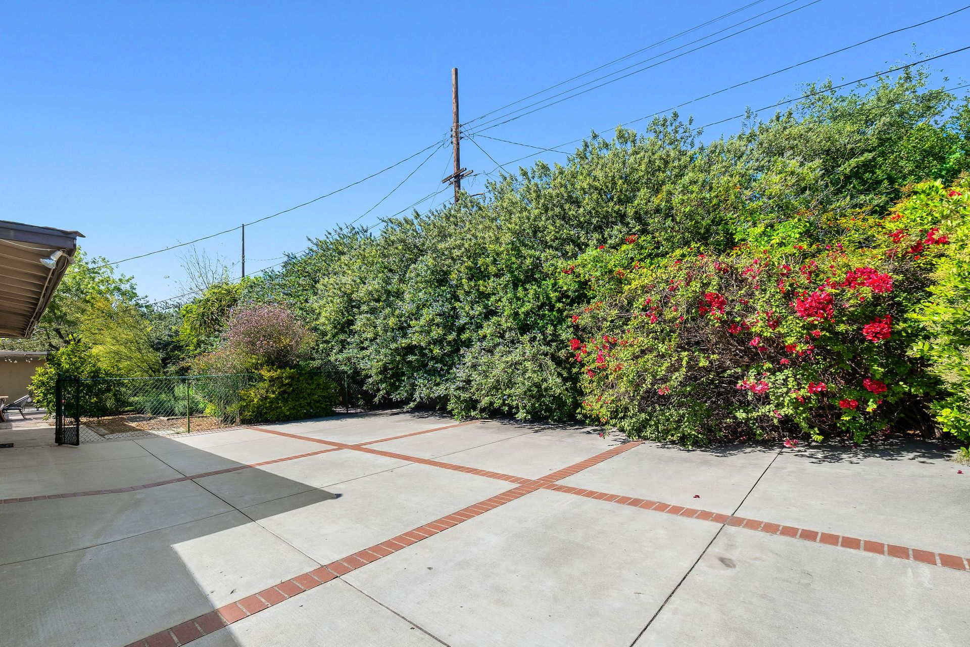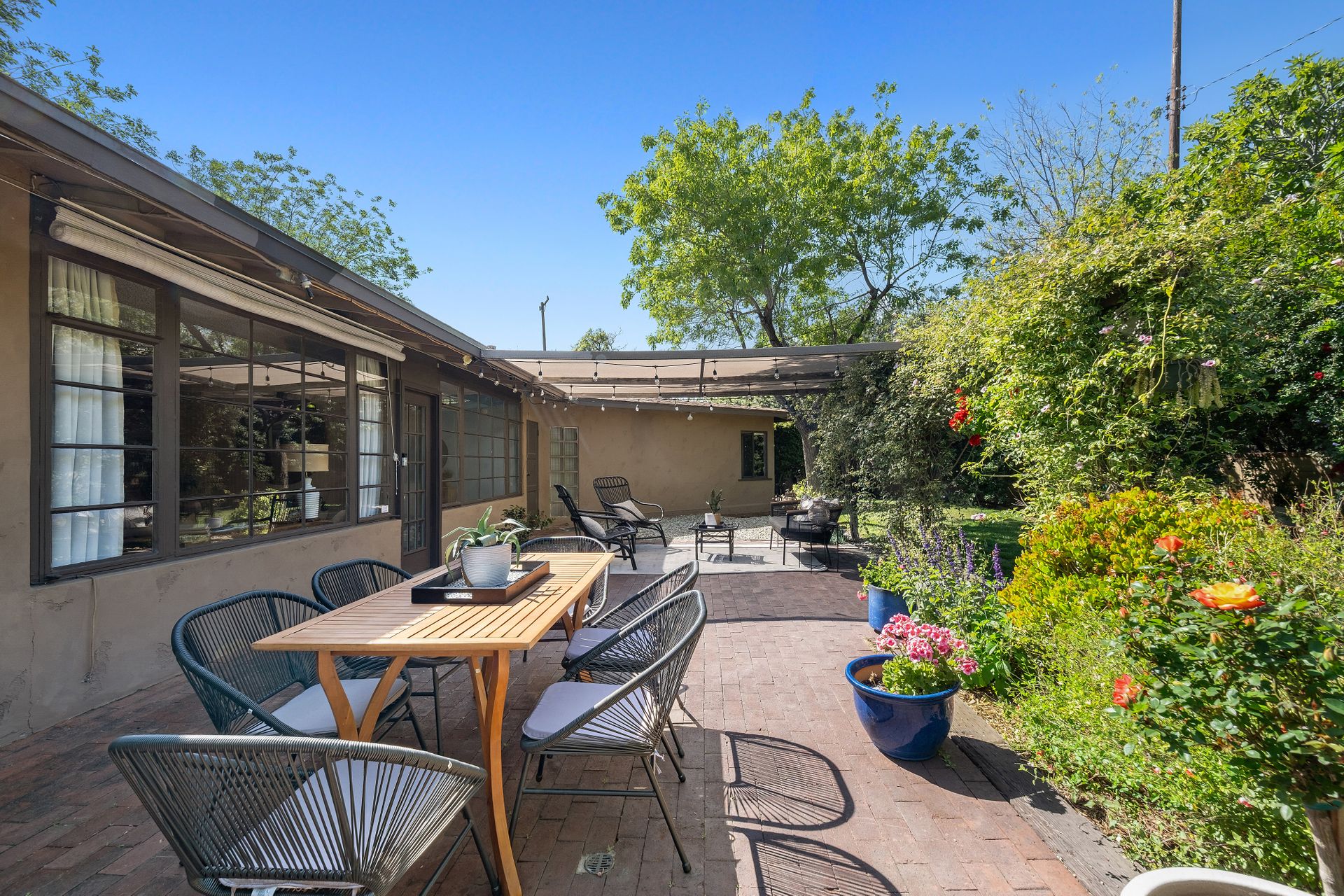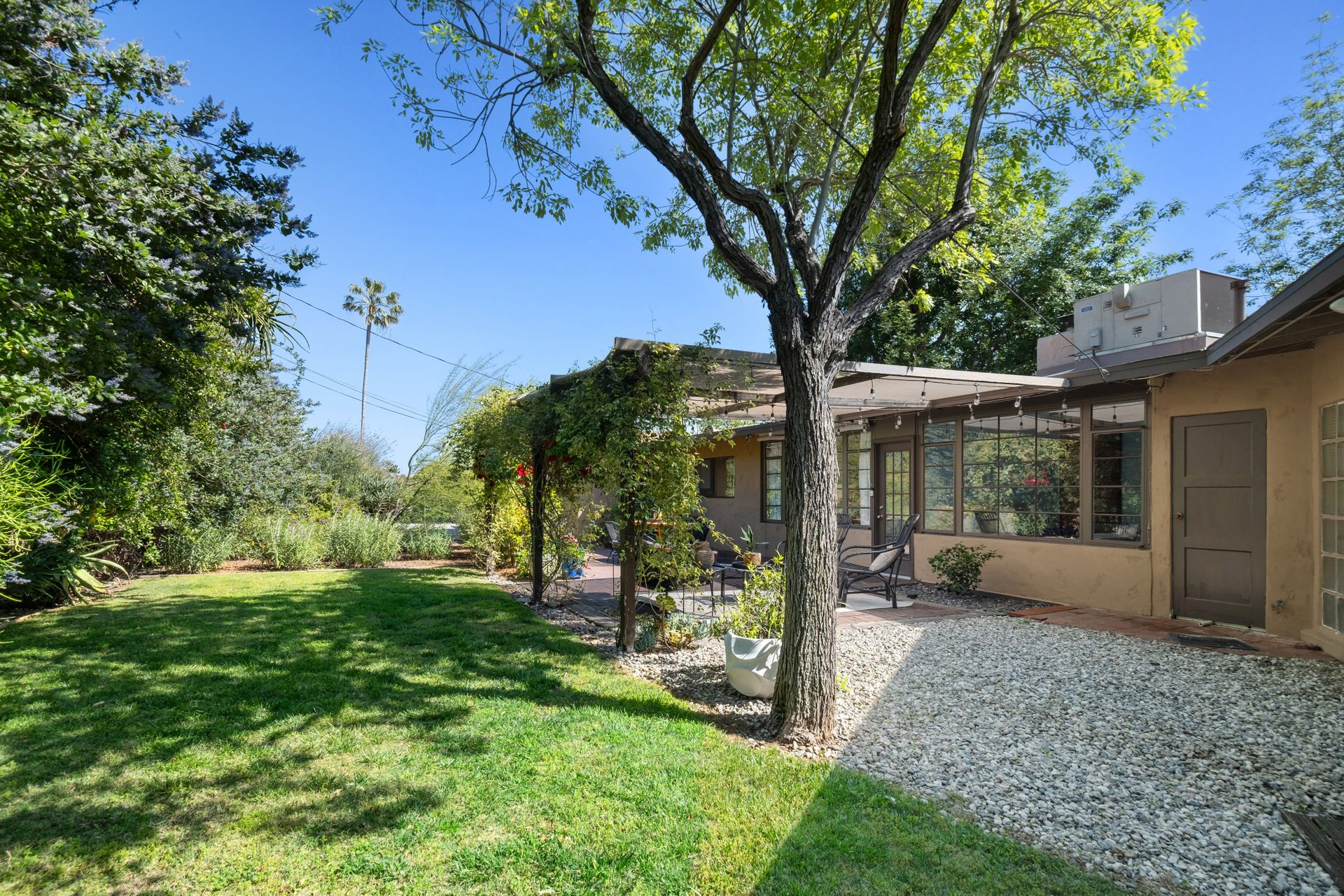 It's the large flat lot! The house is placed centrally, shaded by three mature Chinese Elms. The backyard is filled with a glorious array of colorful plants, many water-wise. A tangerine tree fruits abundantly in the fall. A brick patio with a splendid vine-covered pergola is ideal for barbecues. At night, LED lights turn it into a magical entertainment space.