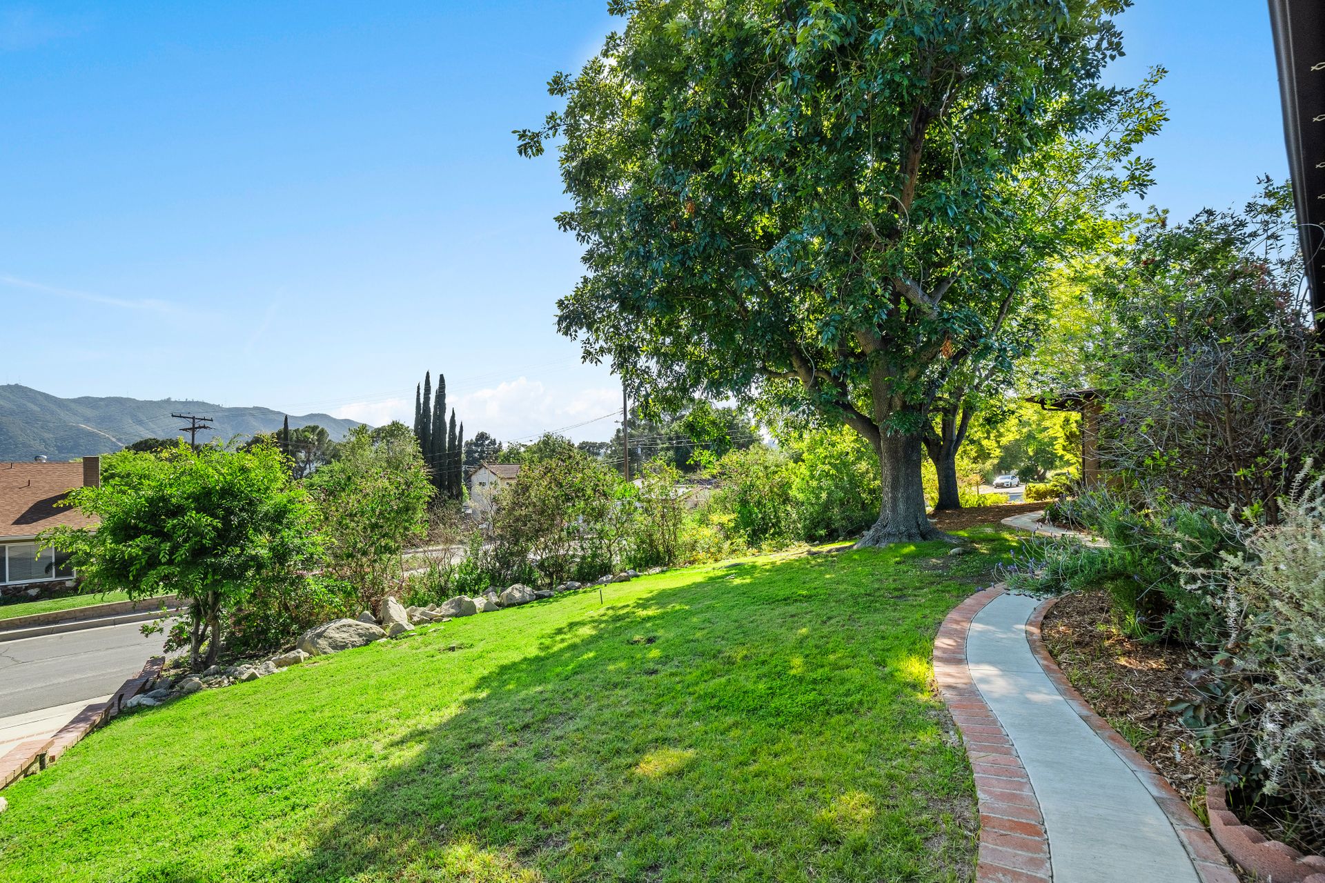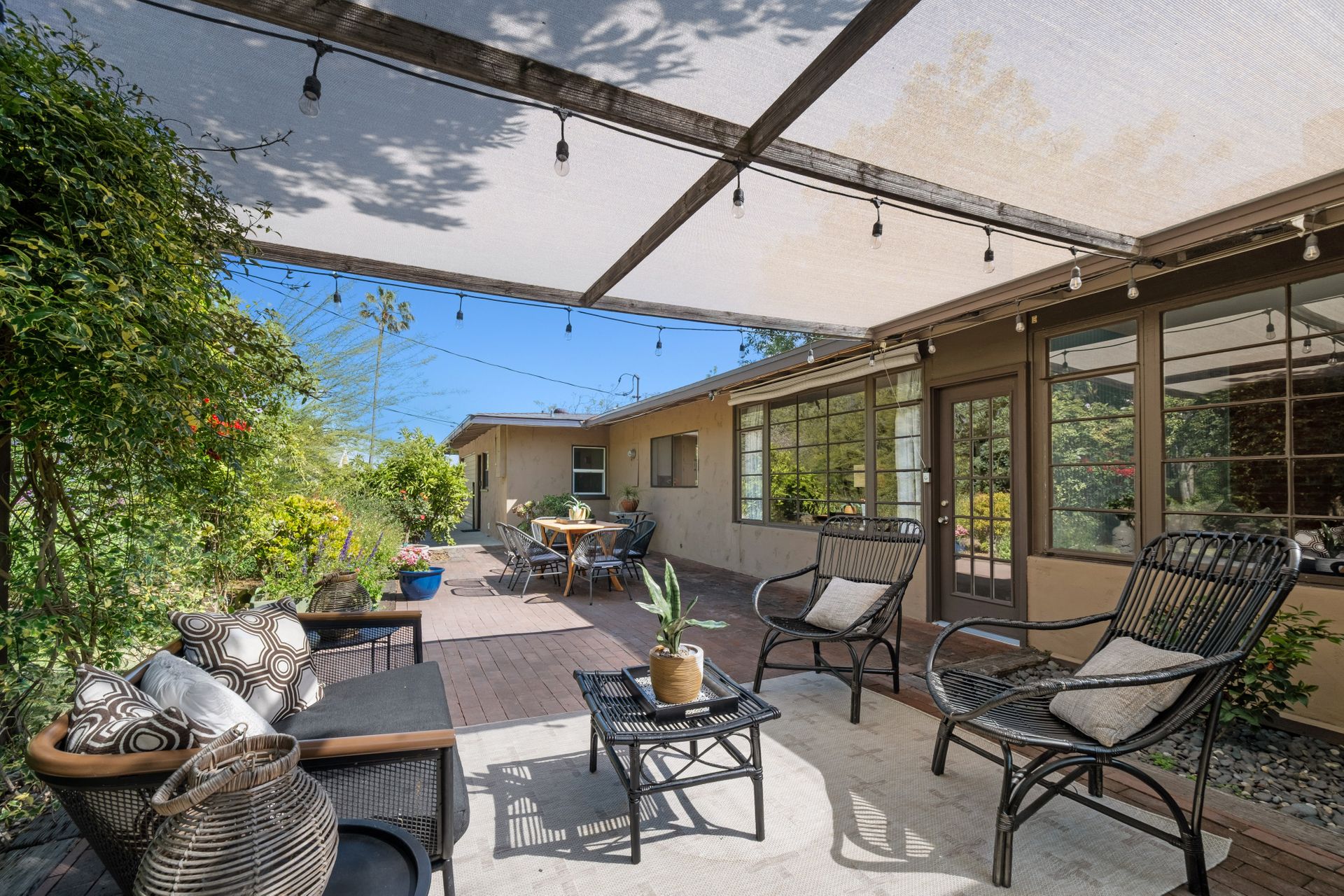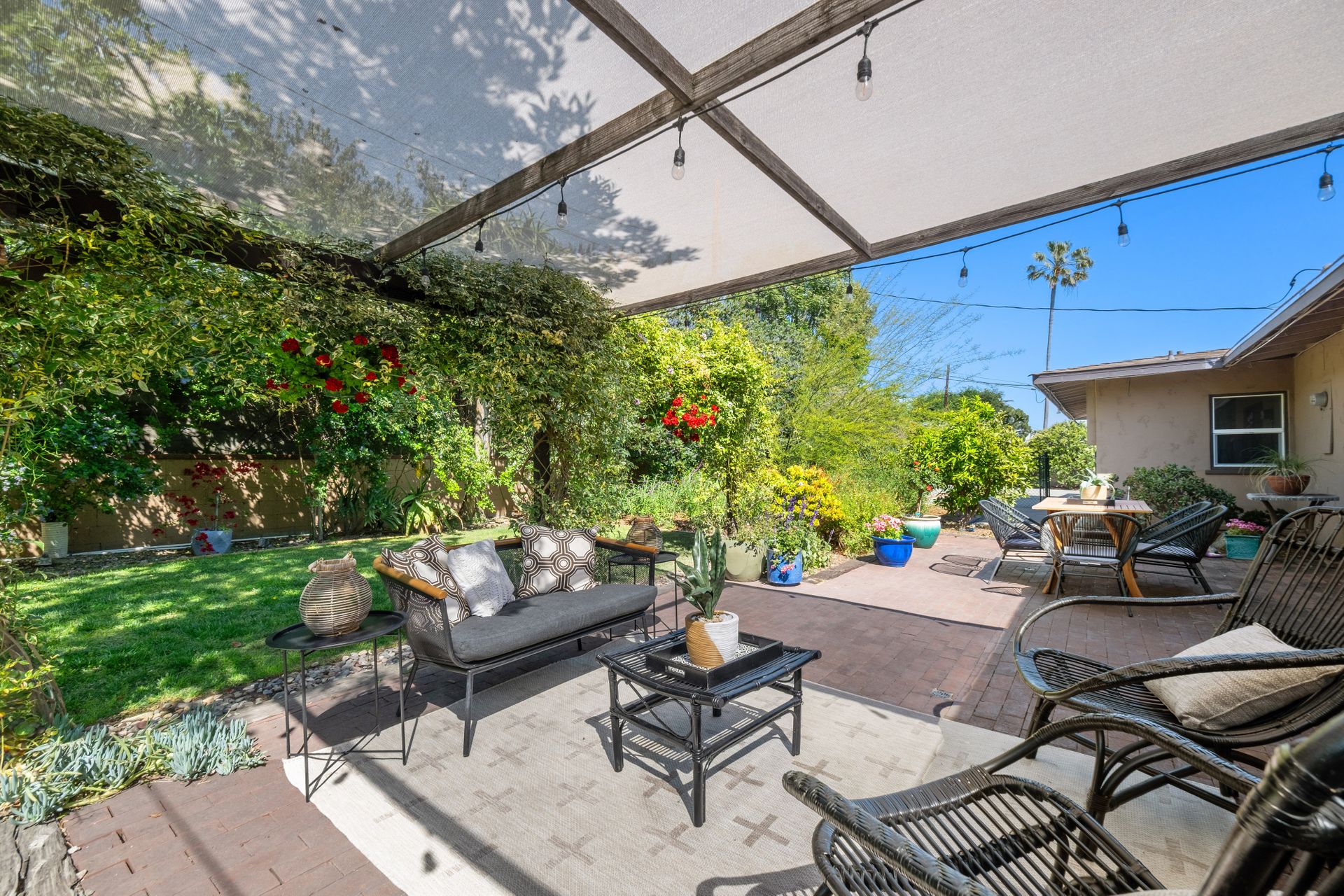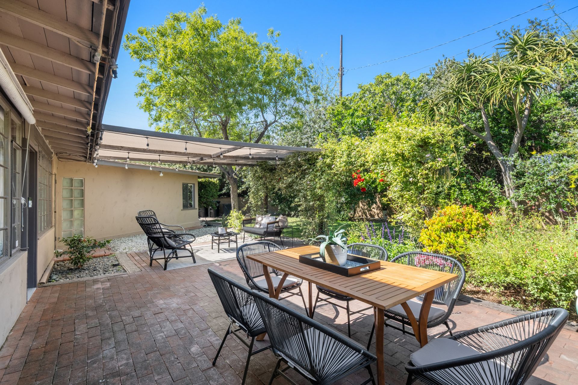 It's the large flat lot! The house is placed centrally, shaded by three mature Chinese Elms. The backyard is filled with a glorious array of colorful plants, many water-wise. A tangerine tree fruits abundantly in the fall. A brick patio with a splendid vine-covered pergola is ideal for barbecues. At night, LED lights turn it into a magical entertainment space.