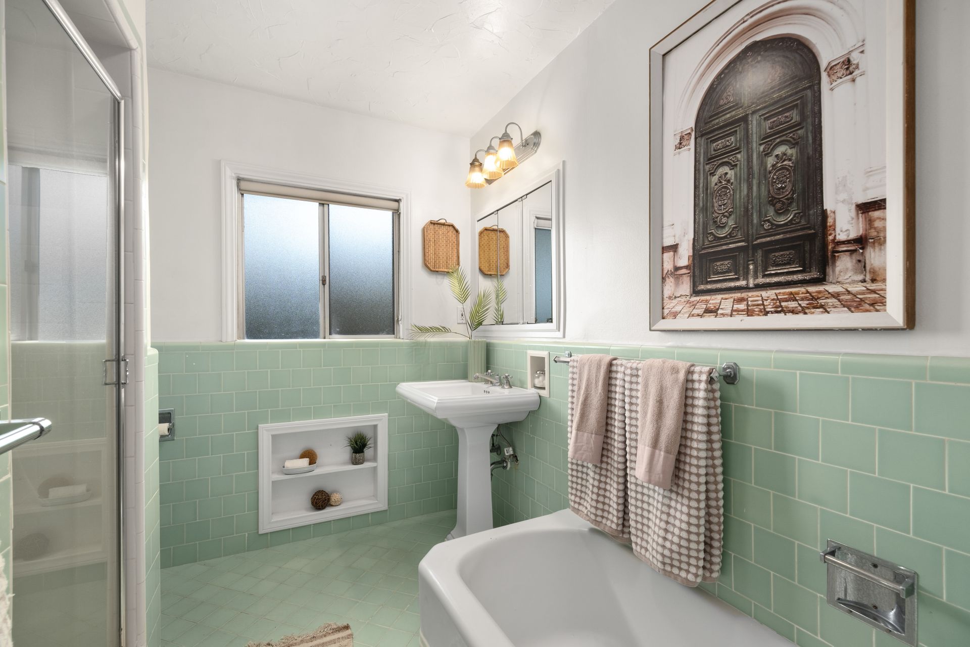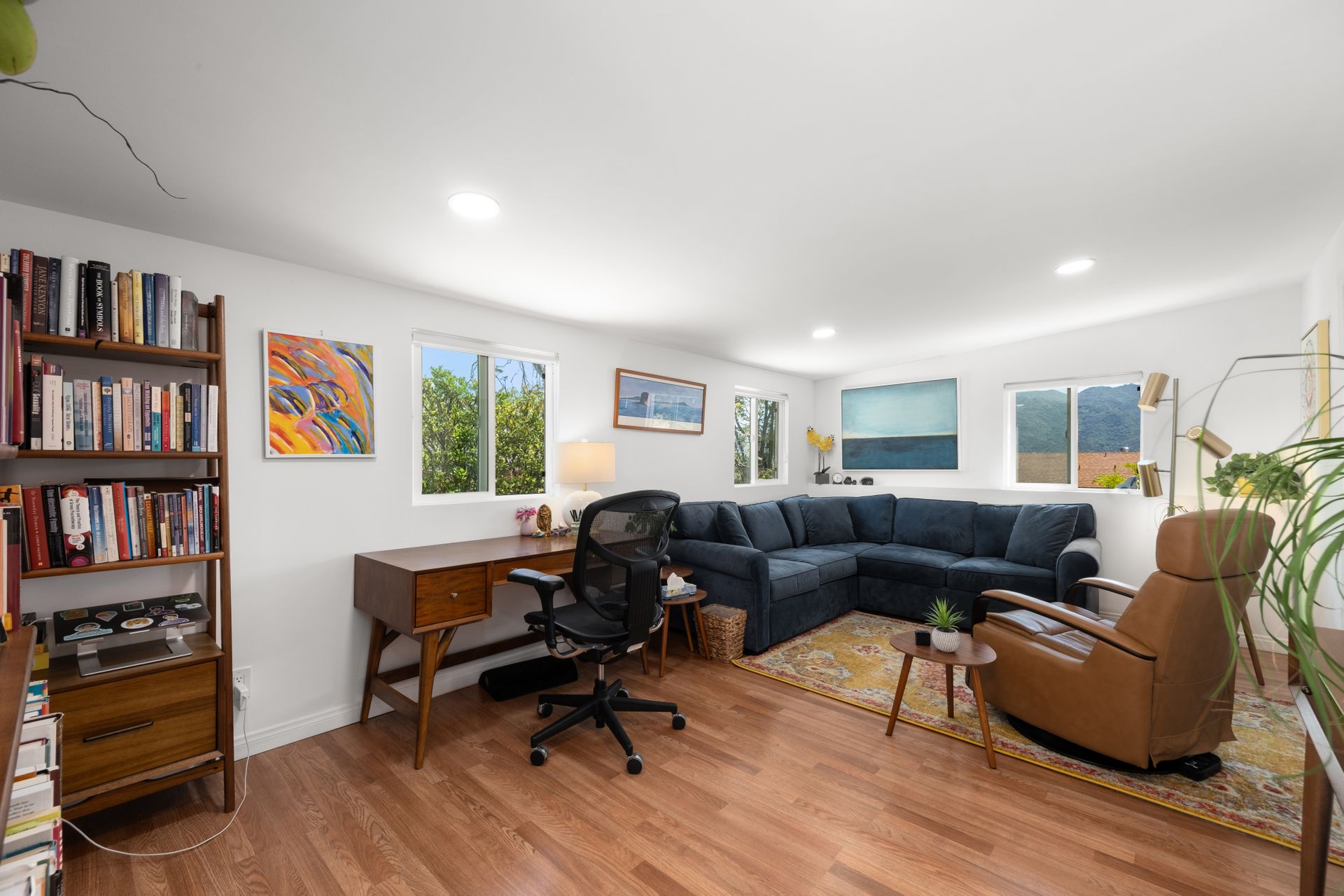 It's the floorplan! The large living room, with an eye-catching arched stone fireplace, flows into the kitchen. Wraparound windows in the living room and dining area face the mountains. Sunsets are glorious. In one wing of the L-shaped house is the living room, kitchen, a bedroom with views, a remodeled bathroom, and a den. The other wing holds two bedrooms, another room that offers flexibility for a fourth bedroom, and a full bathroom with original tiles, bath and separate shower. The kitchen is bright, with ample counter and storage space. From the window above the sink, you have a great view of the enclosed backyard.