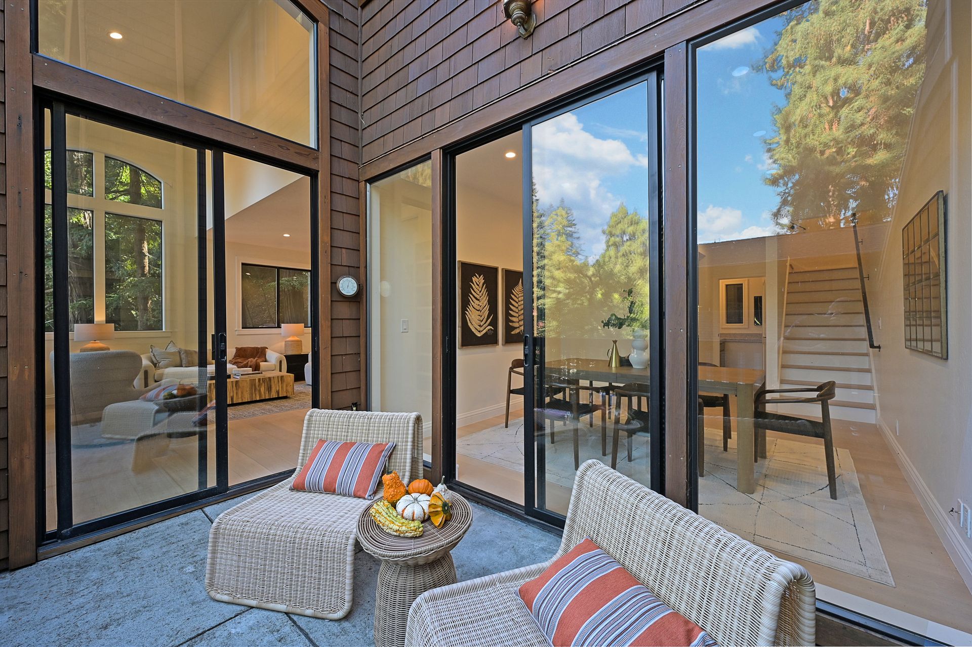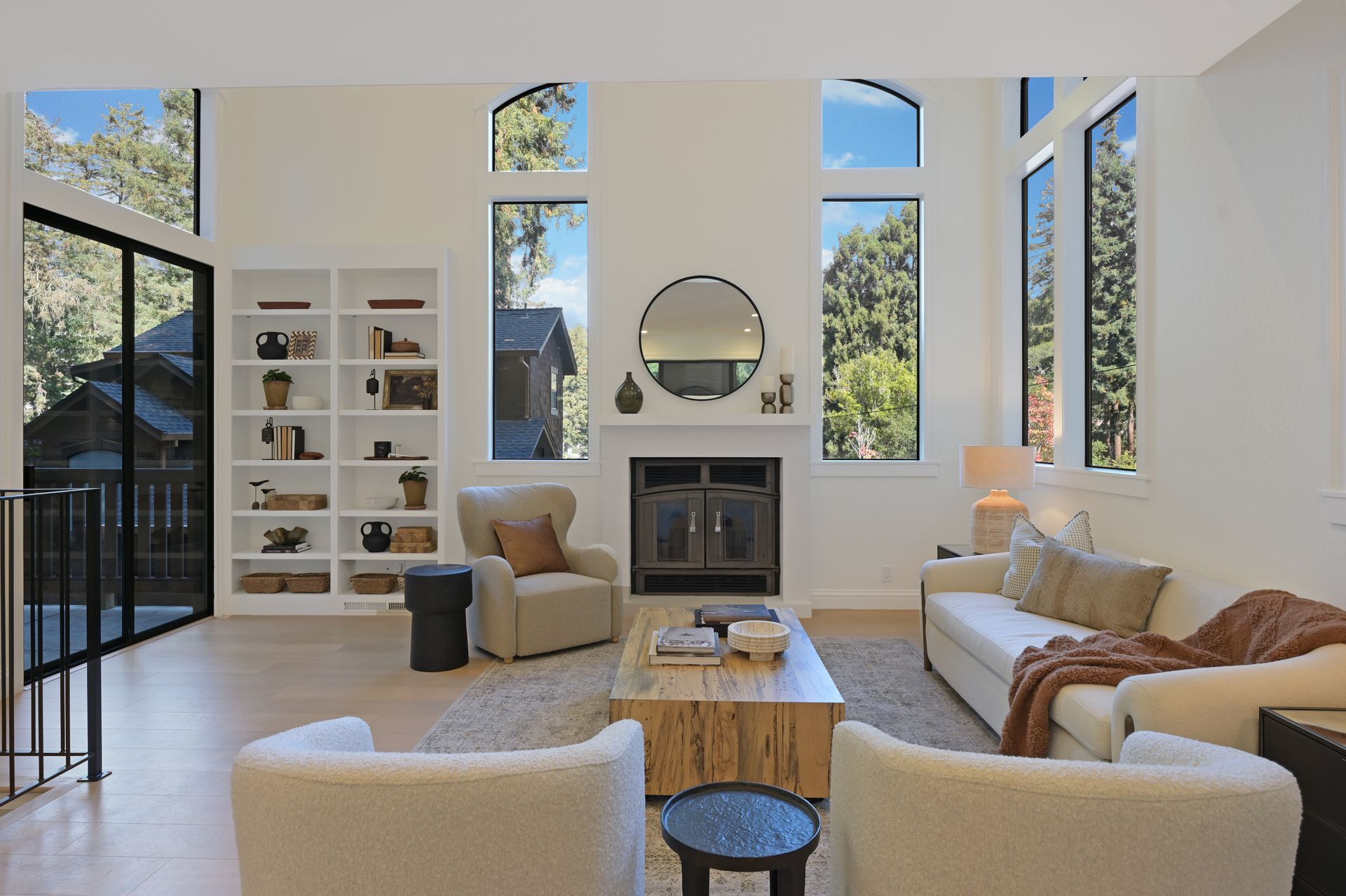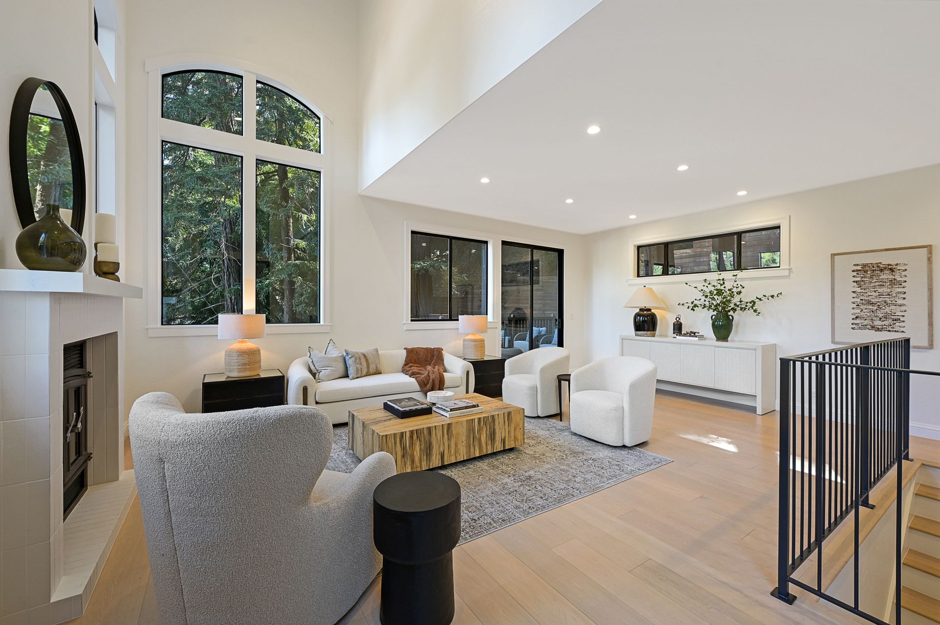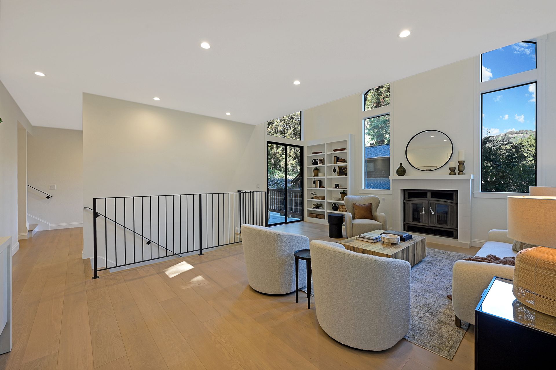 Enter inside to find soaring high ceilings and a beautifully renovated interior, including fresh paint, newly installed oak wood floors, and remodeled fireplaces, amongst other appreciated upgrades. The light-filled living room features a wood-burning fireplace, built-in bookshelves, and access to a large private deck, seamlessly blending indoor and outdoor living. The dining room, bathed in natural light, opens to its own patio. The kitchen boasts stainless steel appliances, including a Wolf gas cooktop, built-in refrigerator/freezer, wine fridge, dishwasher, and ample storage for all your culinary needs.