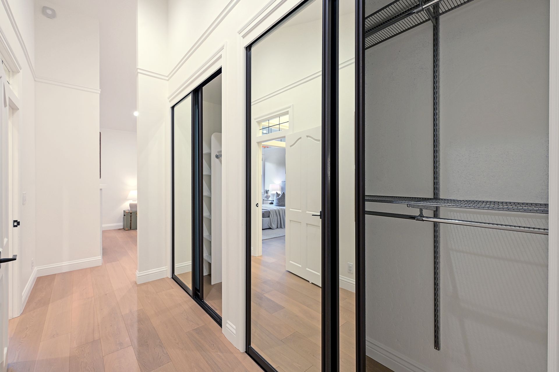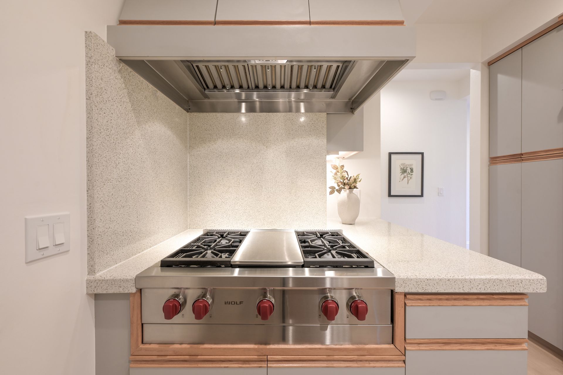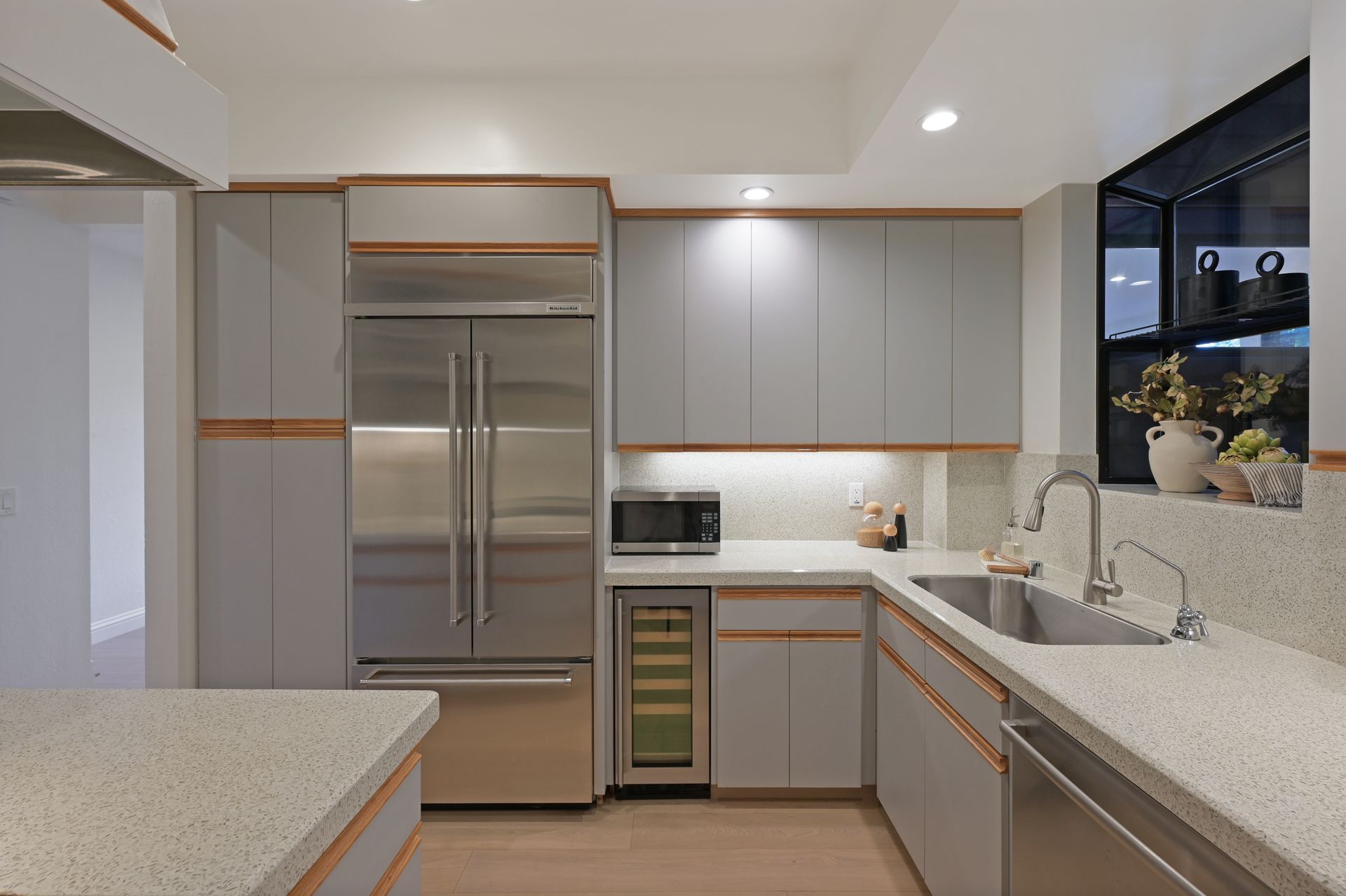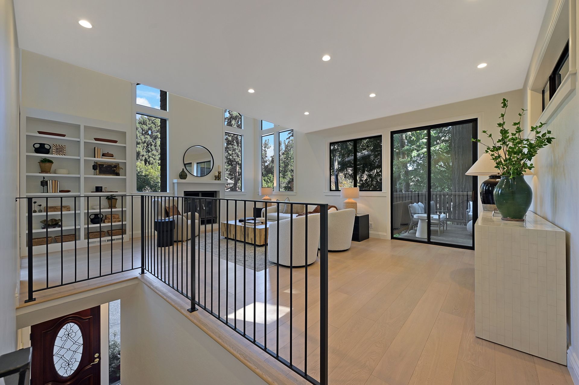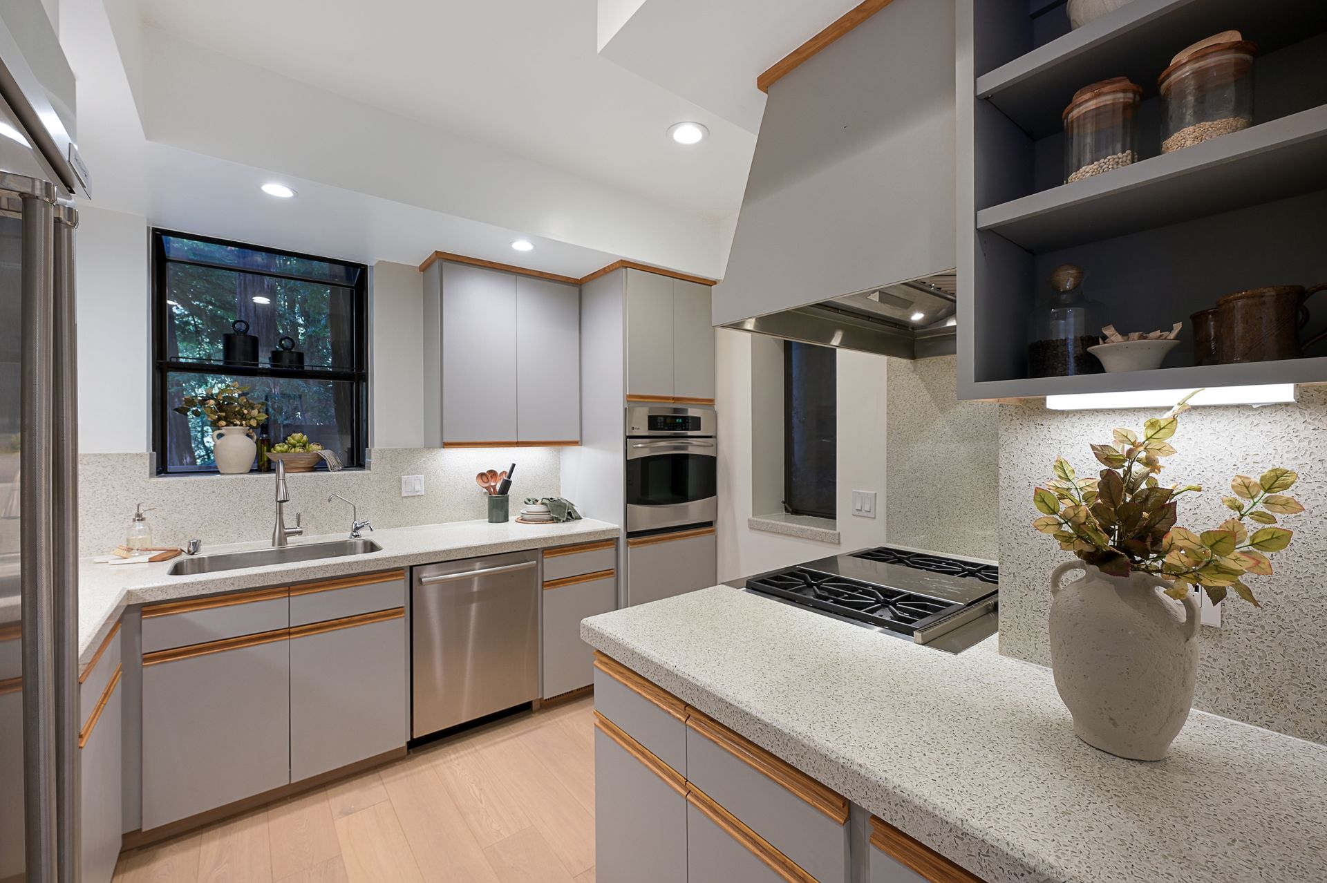 Enter inside to find soaring high ceilings and a beautifully renovated interior, including fresh paint, newly installed oak wood floors, and remodeled fireplaces, amongst other appreciated upgrades. The light-filled living room features a wood-burning fireplace, built-in bookshelves, and access to a large private deck, seamlessly blending indoor and outdoor living. The dining room, bathed in natural light, opens to its own patio. The kitchen boasts stainless steel appliances, including a Wolf gas cooktop, built-in refrigerator/freezer, wine fridge, dishwasher, and ample storage for all your culinary needs.