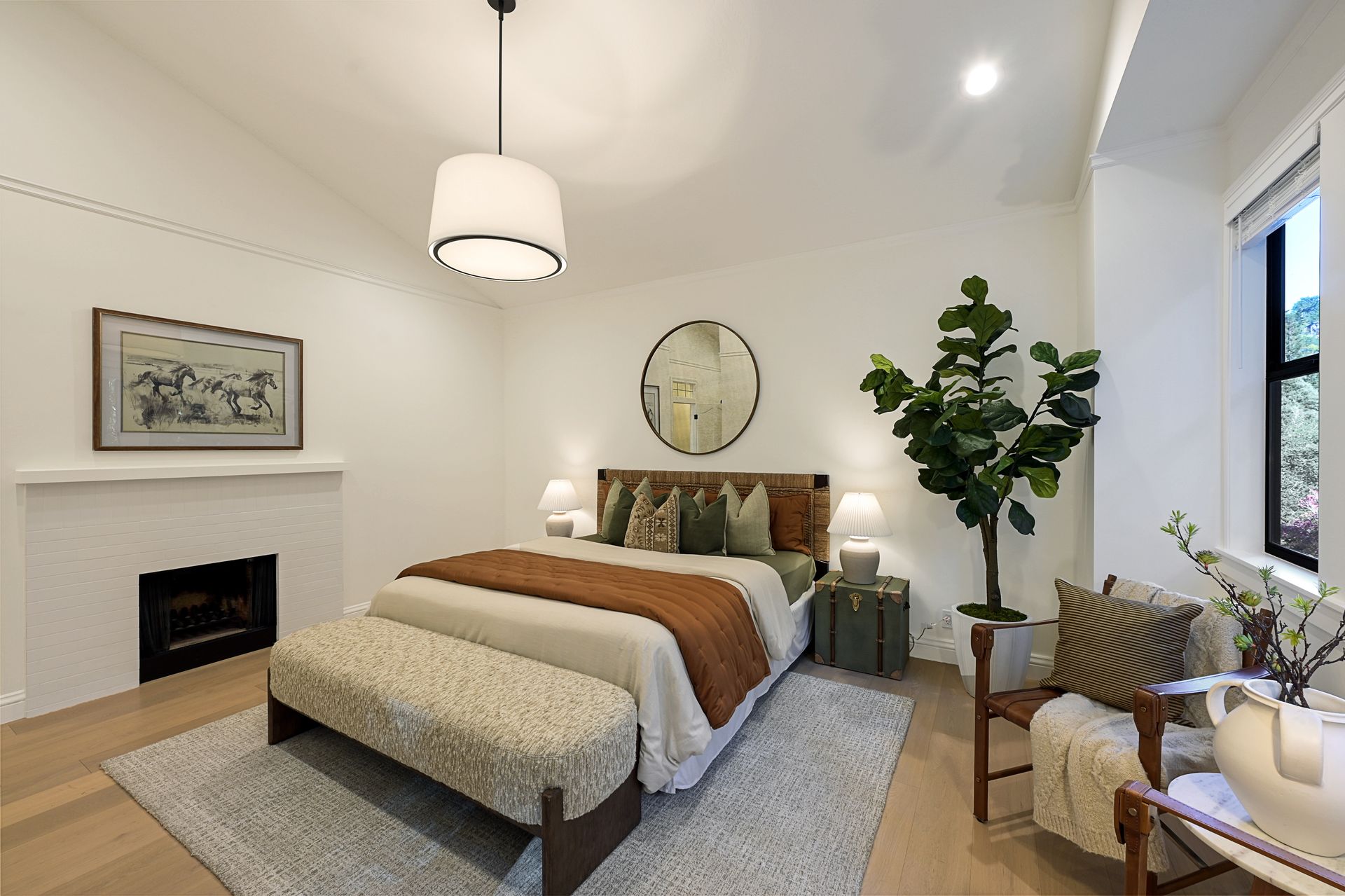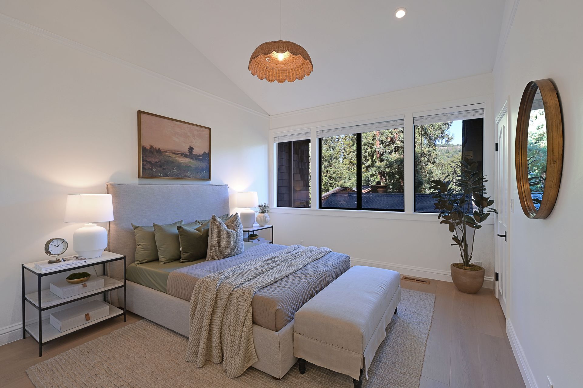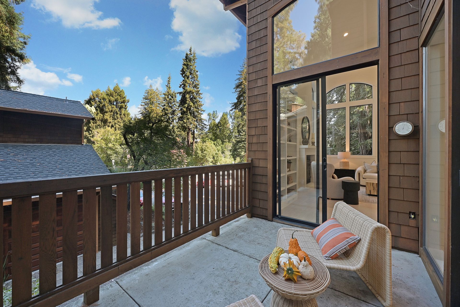 Upstairs, two spacious bedrooms offer peaceful retreats. The primary suite is a true haven with vaulted ceilings, recessed lighting, a second wood-burning fireplace, and stunning views of the surrounding redwoods. Its en-suite bathroom features a walk-in double shower and a double vanity with a quartzstone countertop. The second bedroom, complete with its own en-suite bath, ensures comfort and privacy for guests.