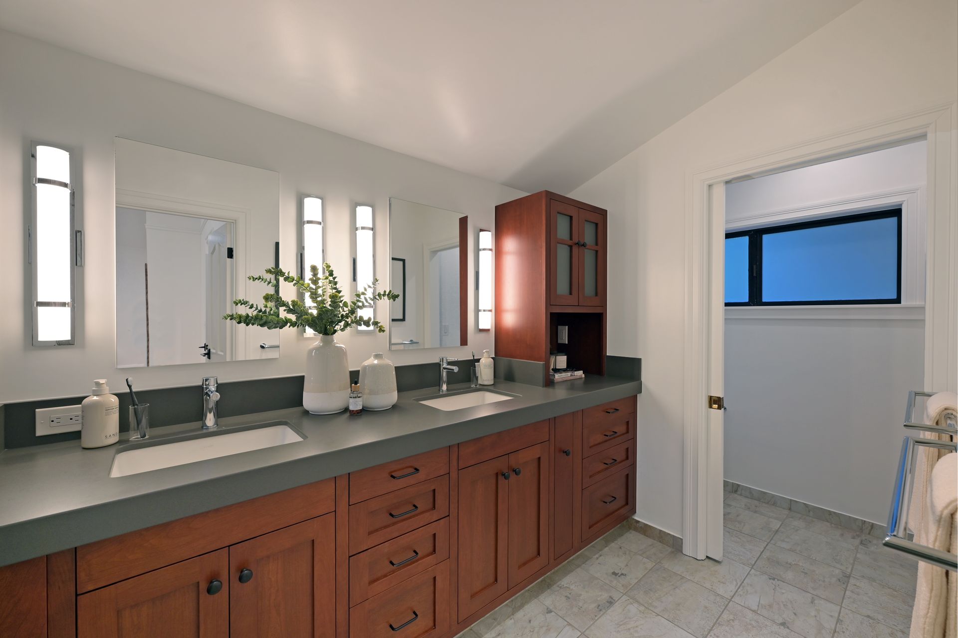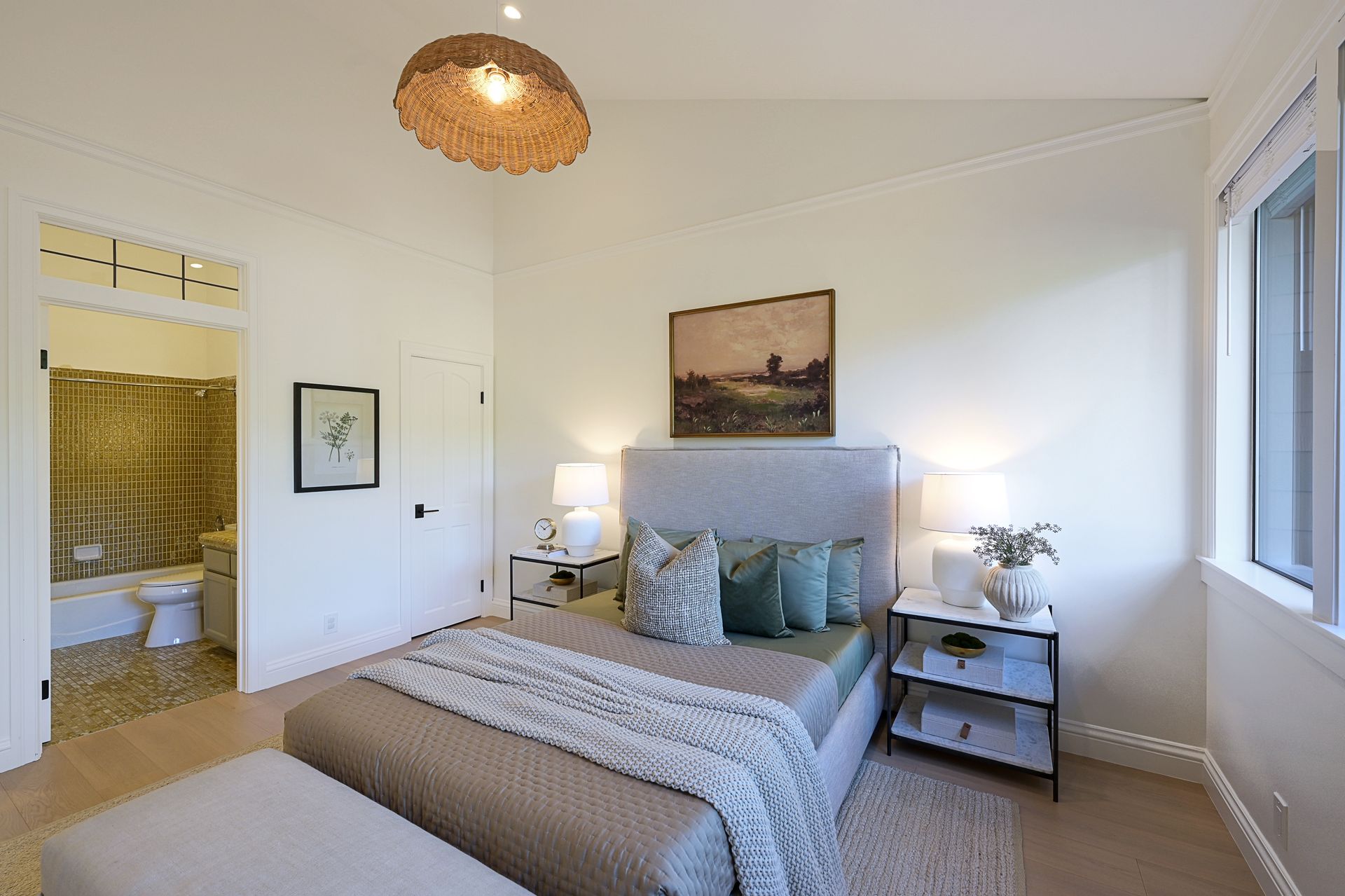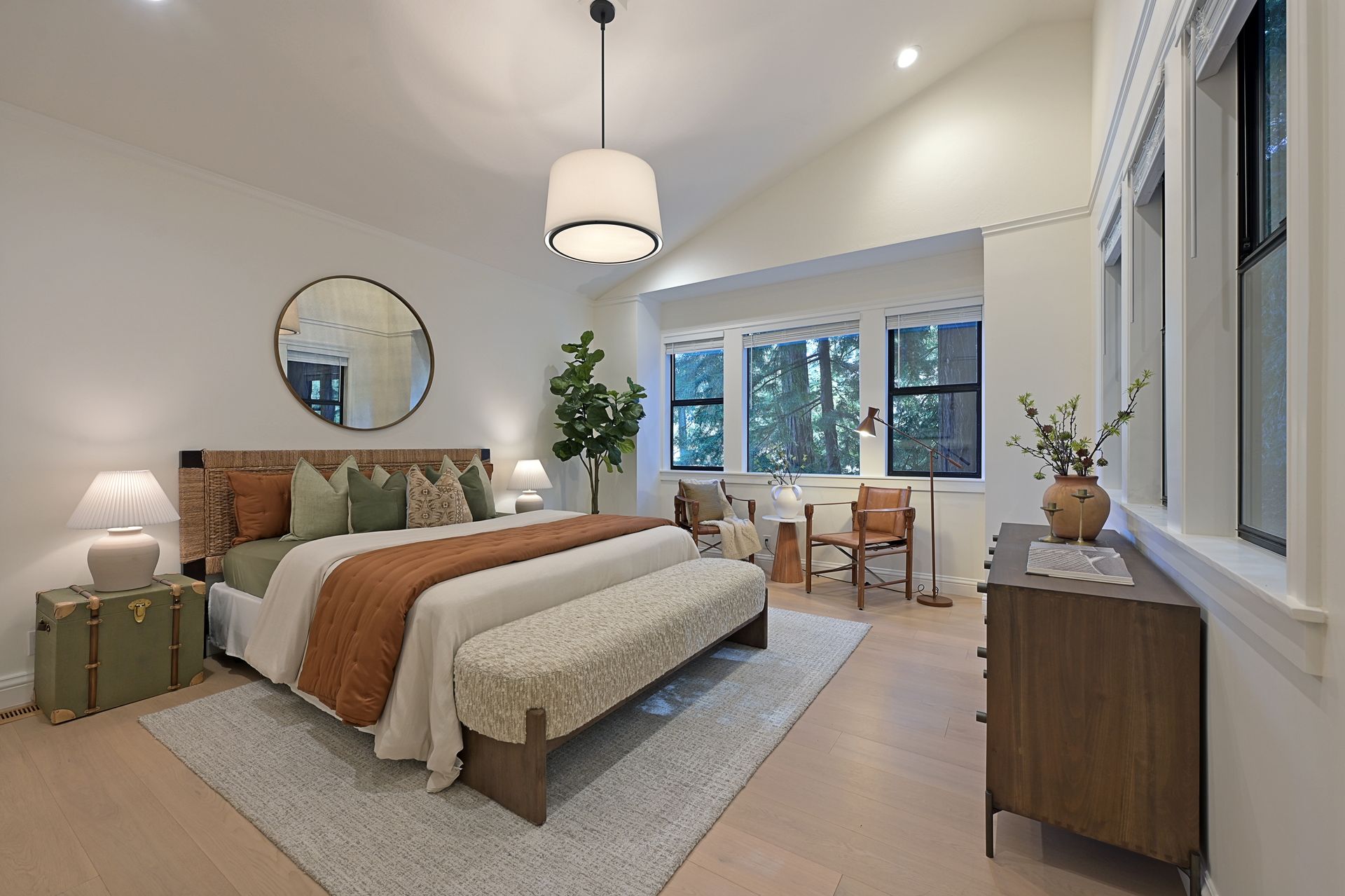 Upstairs, two spacious bedrooms offer peaceful retreats. The primary suite is a true haven with vaulted ceilings, recessed lighting, a second wood-burning fireplace, and stunning views of the surrounding redwoods. Its en-suite bathroom features a walk-in double shower and a double vanity with a quartzstone countertop. The second bedroom, complete with its own en-suite bath, ensures comfort and privacy for guests.