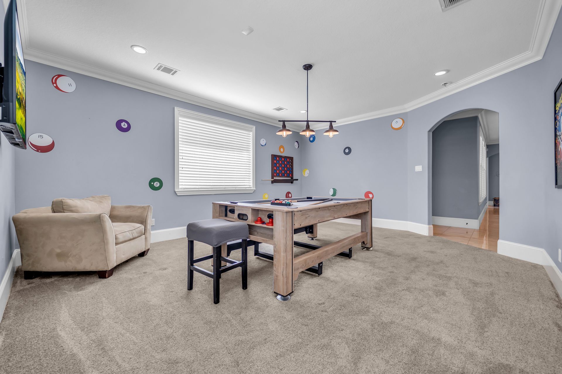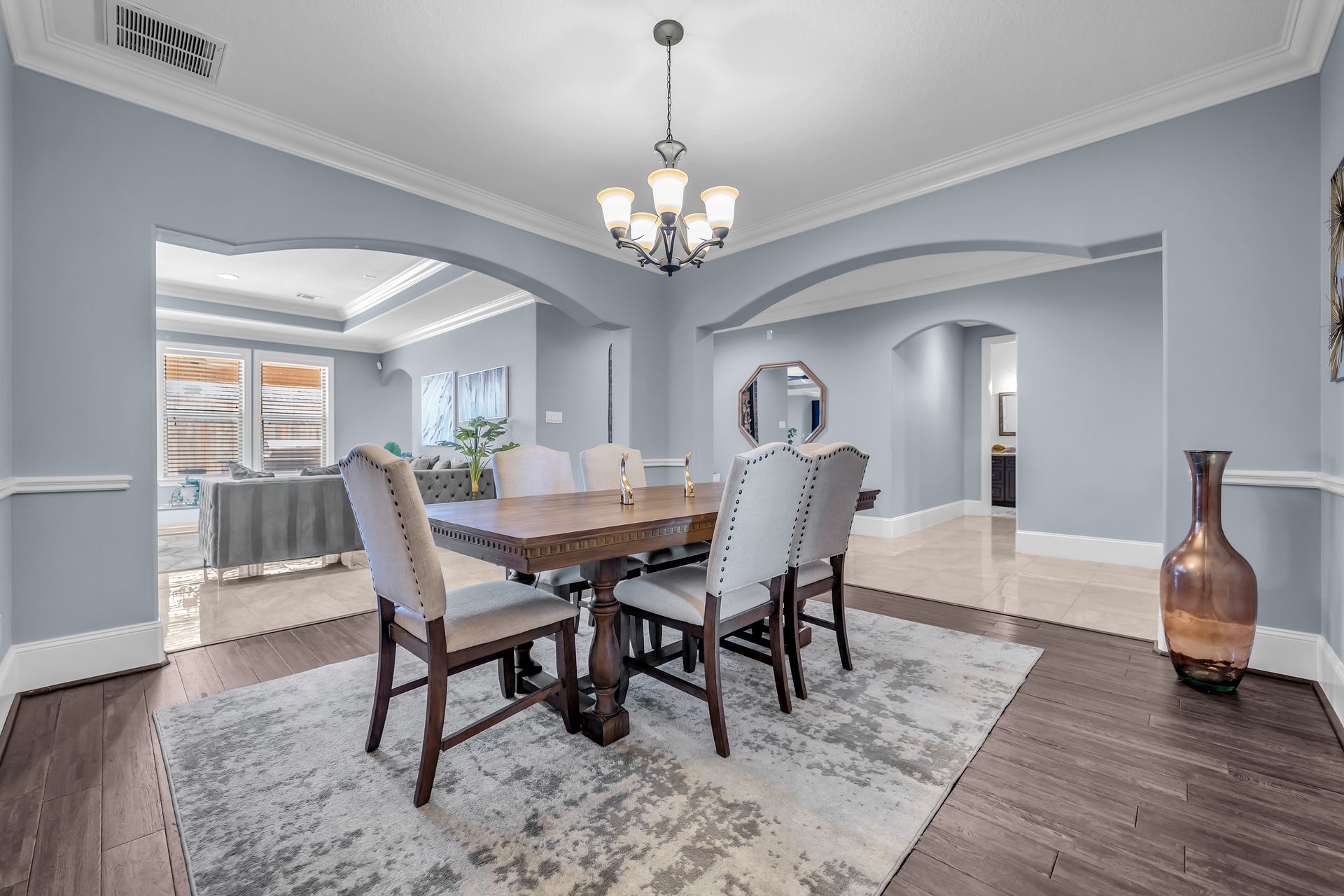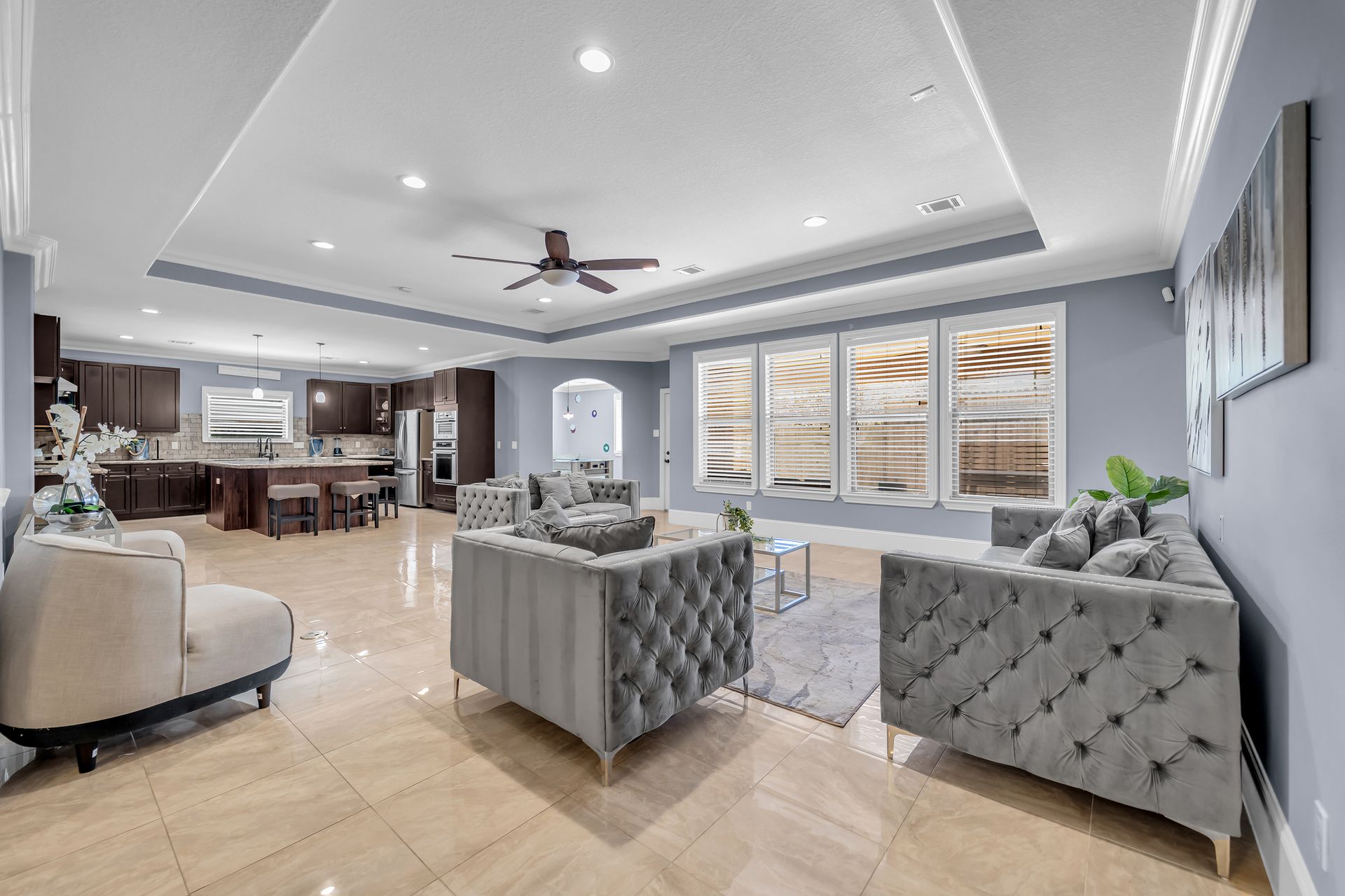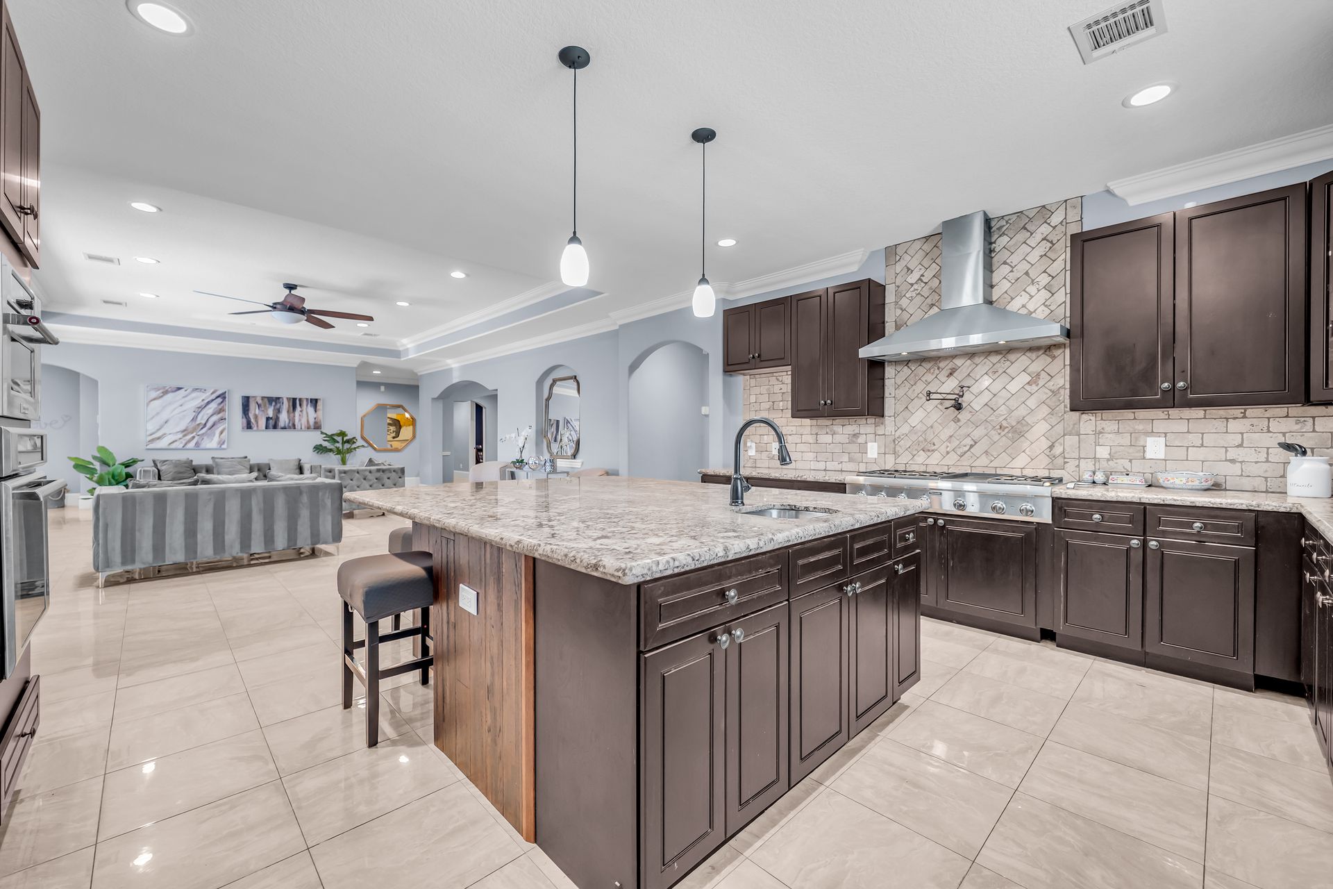 Venture inside to an inviting open‑concept layout featuring high ceilings, an elegant foyer, granite countertops, a walk‑in pantry, and a chef‑style kitchen complete with a pot filler, double oven, and custom cabinetry. Multiple living spaces— including a family room, game room, dining room, and optional fourth bedroom or study—provide ample room for both relaxation and entertainment.