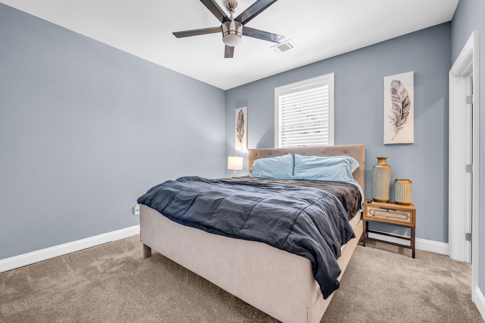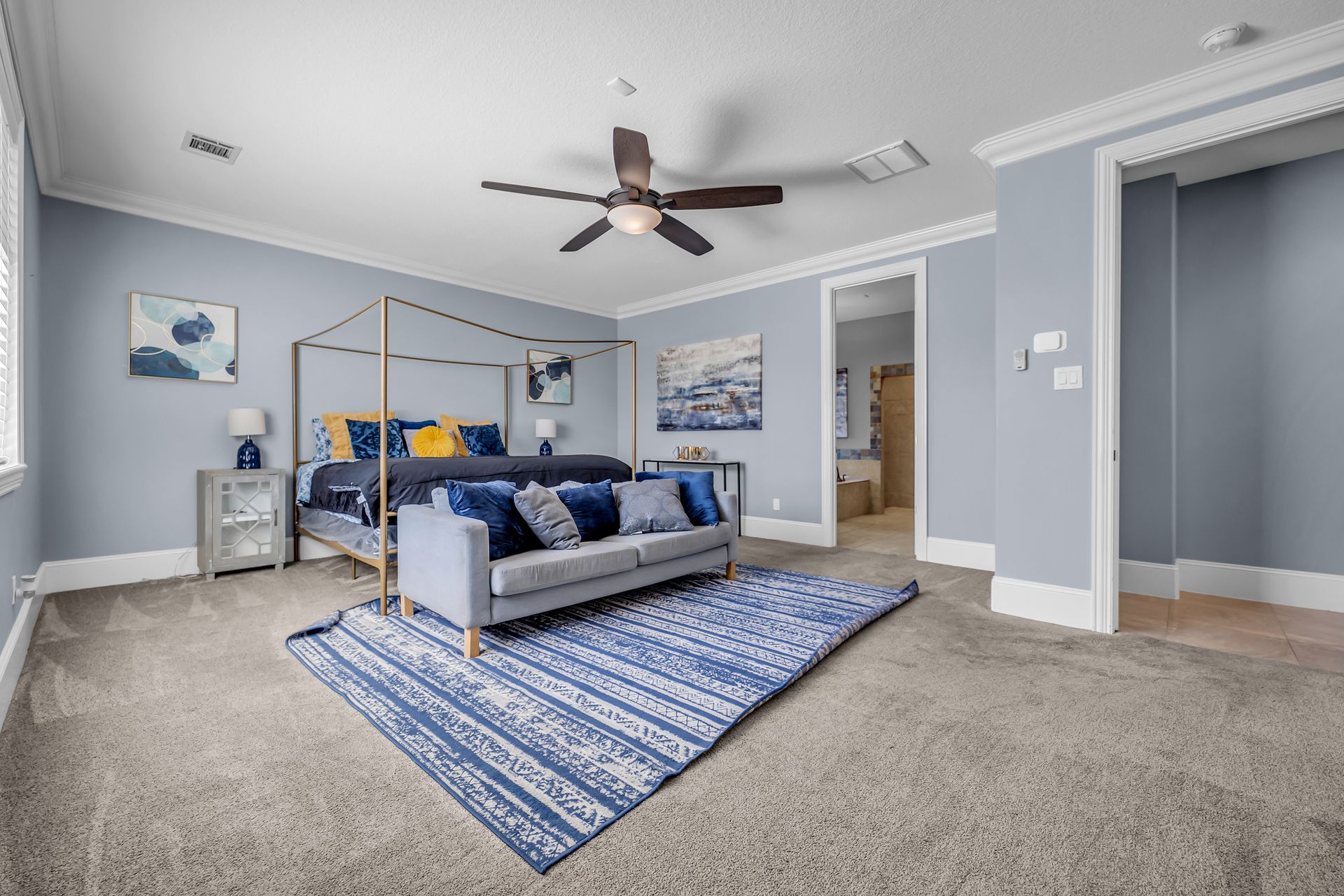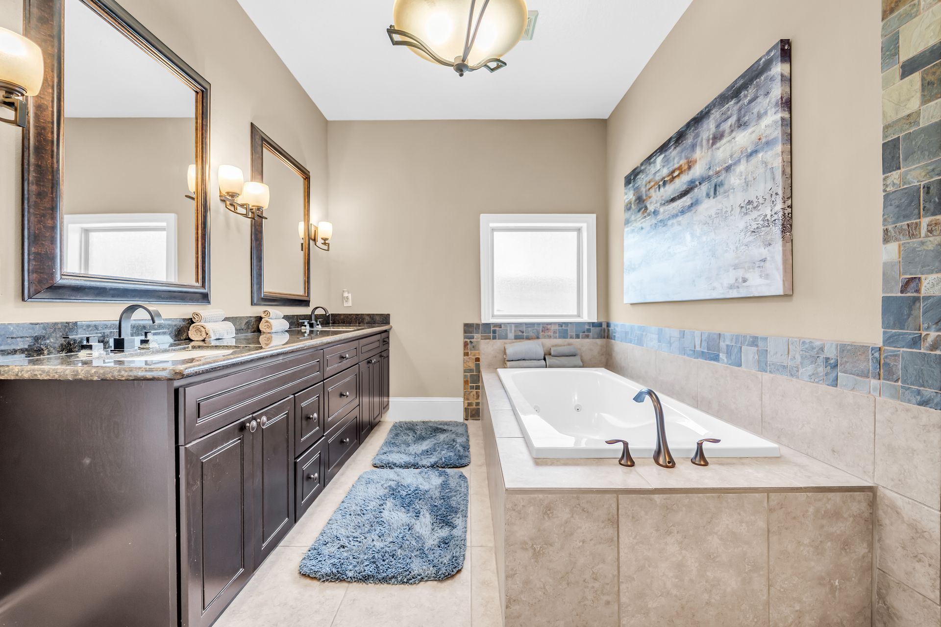 The luxurious primary suite includes a soaking tub, separate shower, dual vanities, and generous closet space. Throughout the home, you'll find engineered hardwood, stone flooring, and modern energy‑efficient features such as a programmable thermostat.