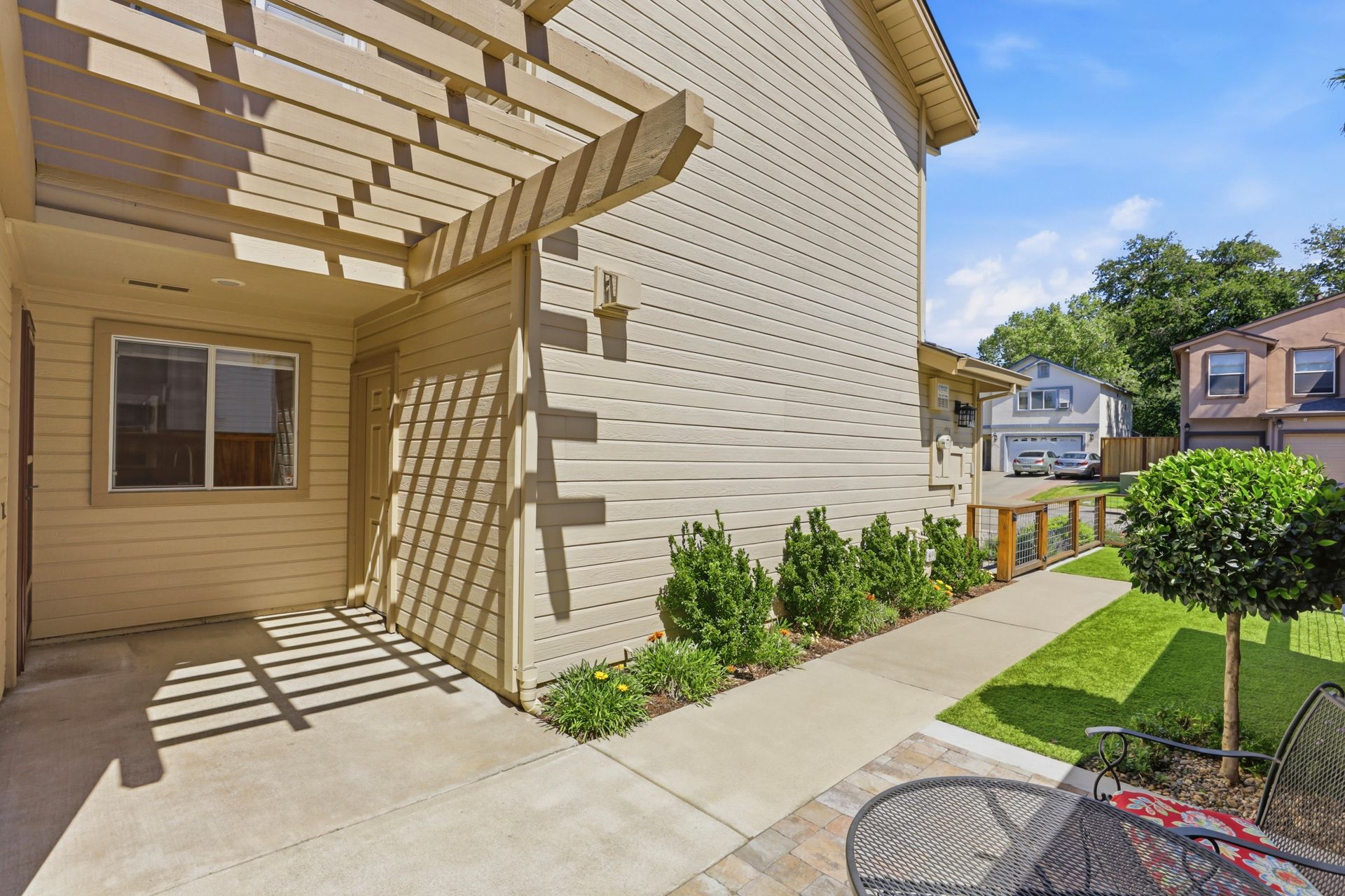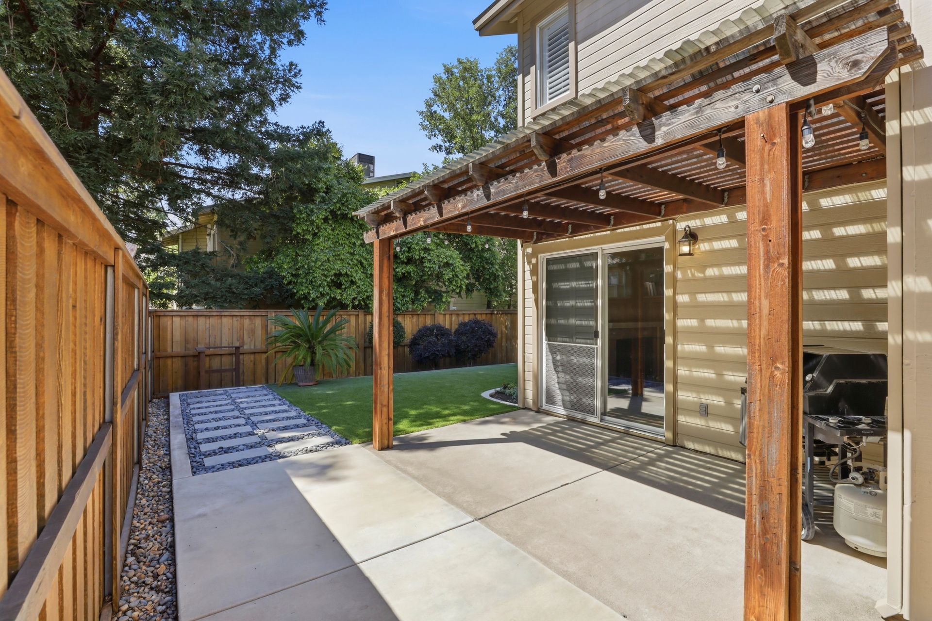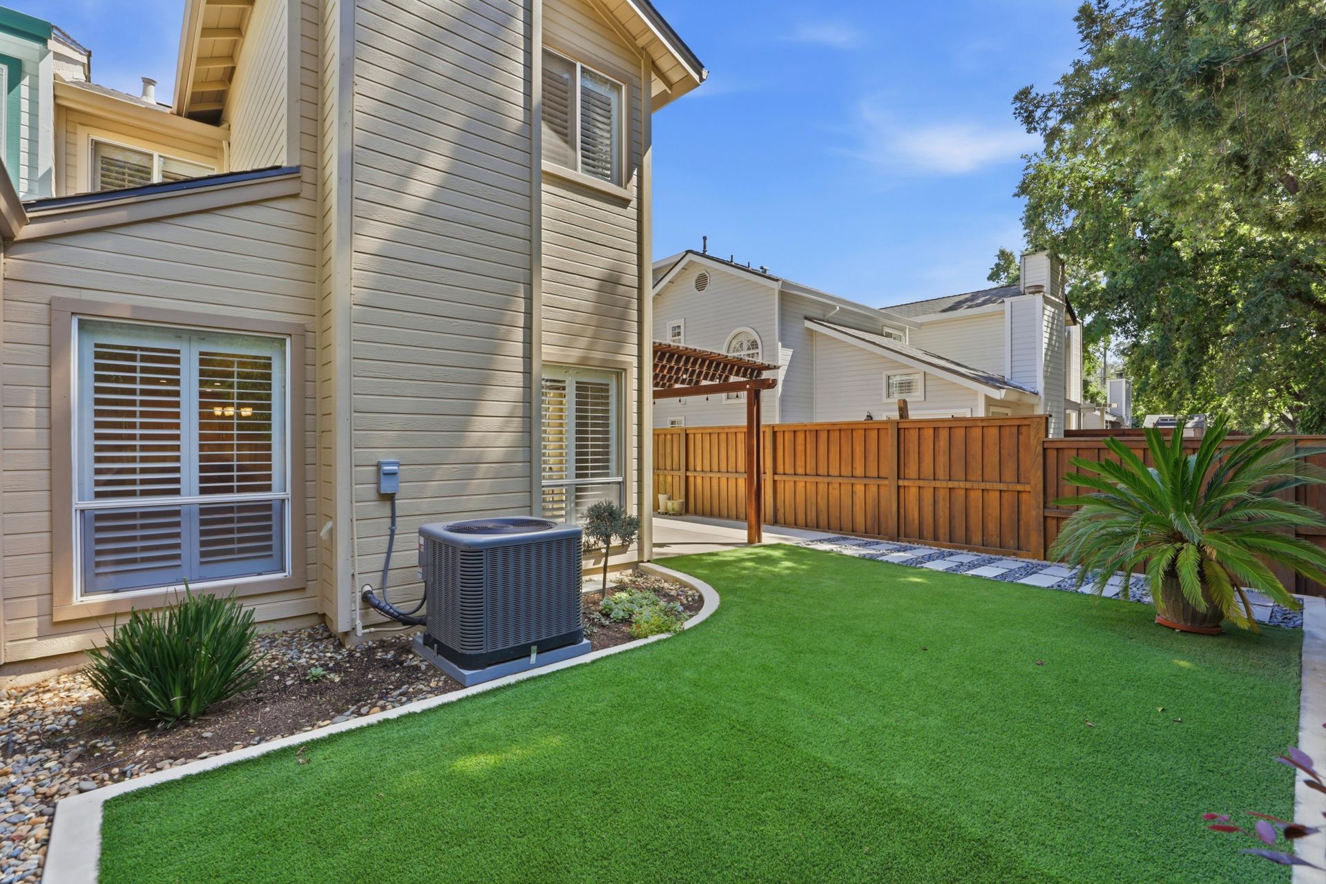 Beautifully remodeled 3-bedroom, 2.5-bath half-plex offering comfort, style, and low-maintenance living in a convenient location. Thoughtfully designed floor plan features an open living space, dual-pane windows, plantation shutters, and a sliding glass door that opens to the private backyard. The well-positioned kitchen overlooks the living and dining areas and is equipped with granite countertops, quality cabinetry, stainless steel gas range, microwave, and dishwasherideal for both everyday living and entertaining. A tastefully updated half bath and convenient indoor laundry closet complete the downstairs. Durable and attractive luxury vinyl plank flooring, installed in 2018, enhances the main level, while a modern fireplace creates a warm and inviting focal point. Upstairs, you'll find comfortable carpeting throughout and a spacious primary suite with a large closet and beautifully remodeled en-suite bathroom featuring dual sinks and a generous walk-in shower with sleek European-style glass enclosure. Two additional bedrooms and an updated hall bathroom provide flexibility for family, guests, or home office needs. Additional highlights include a finished two-car garage with extra storage and well-designed front and backyard spaces featuring artificial turf for easy upkeep. Major system updates include a newer roof (2019), HVAC (2020), water heater (2011), and exterior paint (2020). No HOA. Ideally located near shopping, dining, and local favorites including The Farmer's Wife, Milagro Centre, and Ancil Hoffman Park. Enjoy close proximity to the American River Parkway with its scenic trails and natural beauty. A fantastic opportunity to own a move-in ready home at an exceptional value.