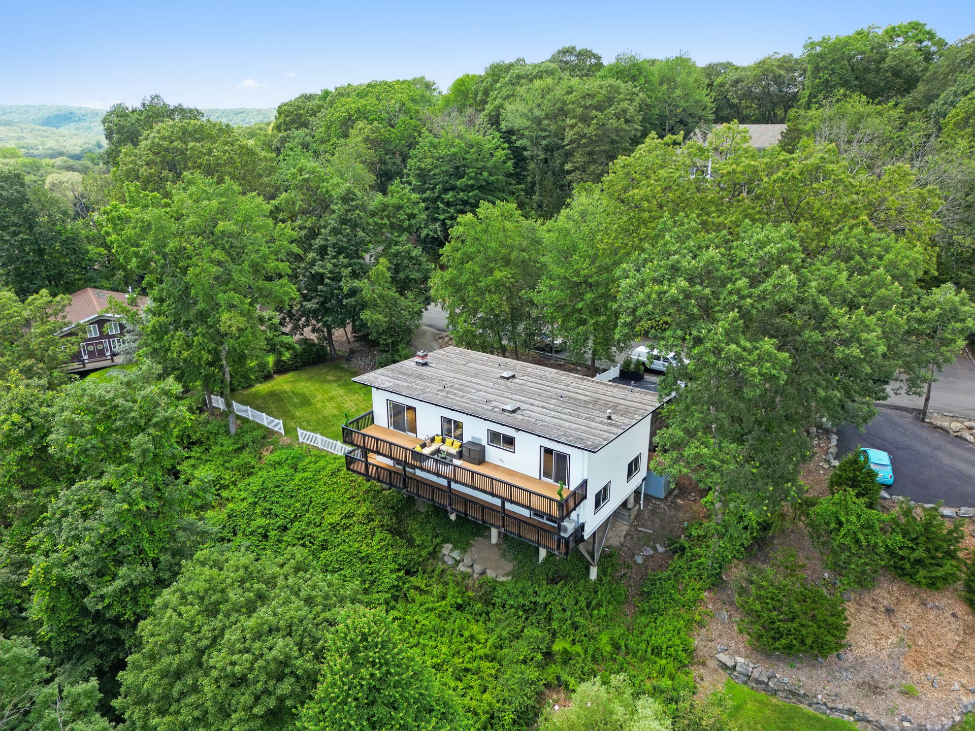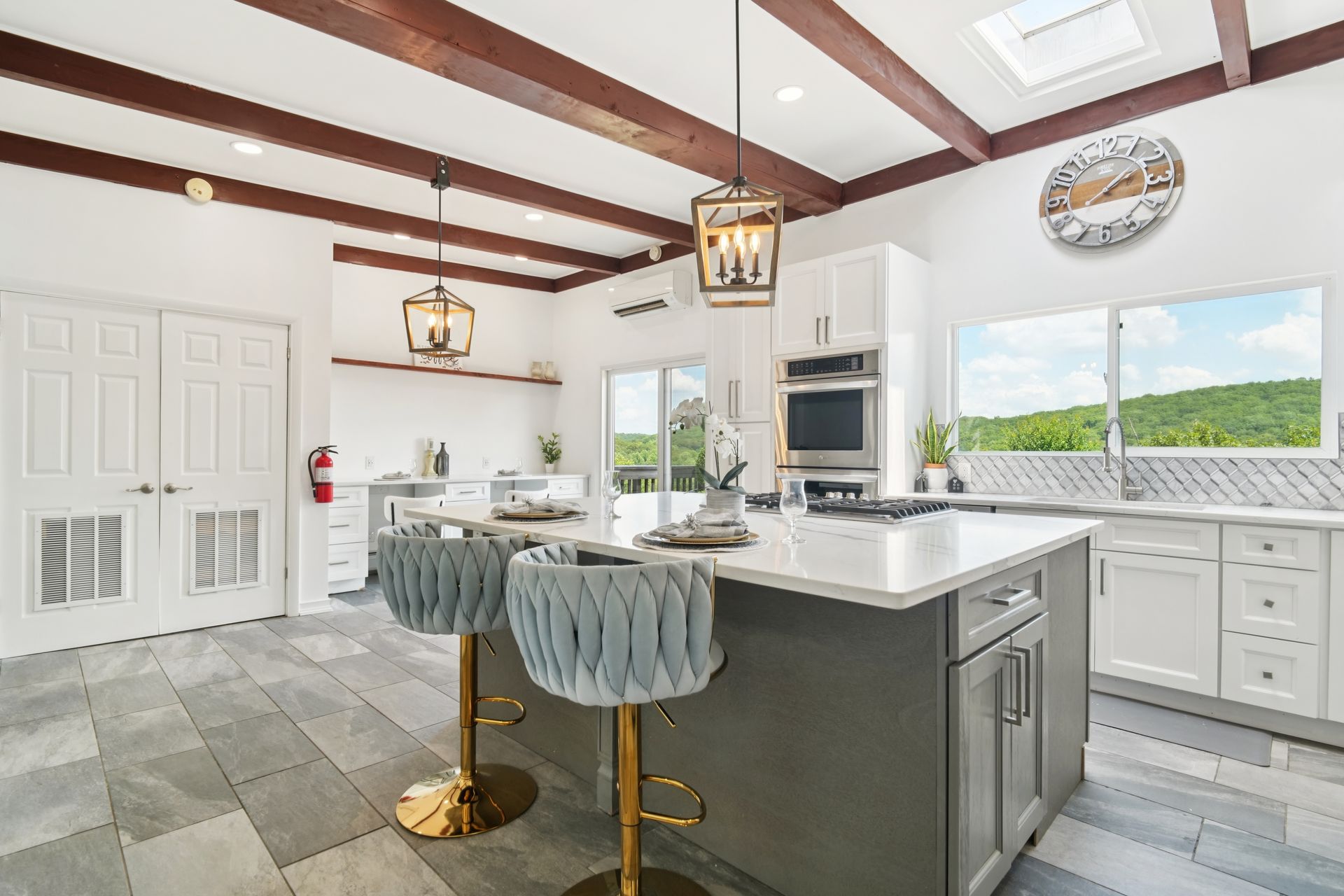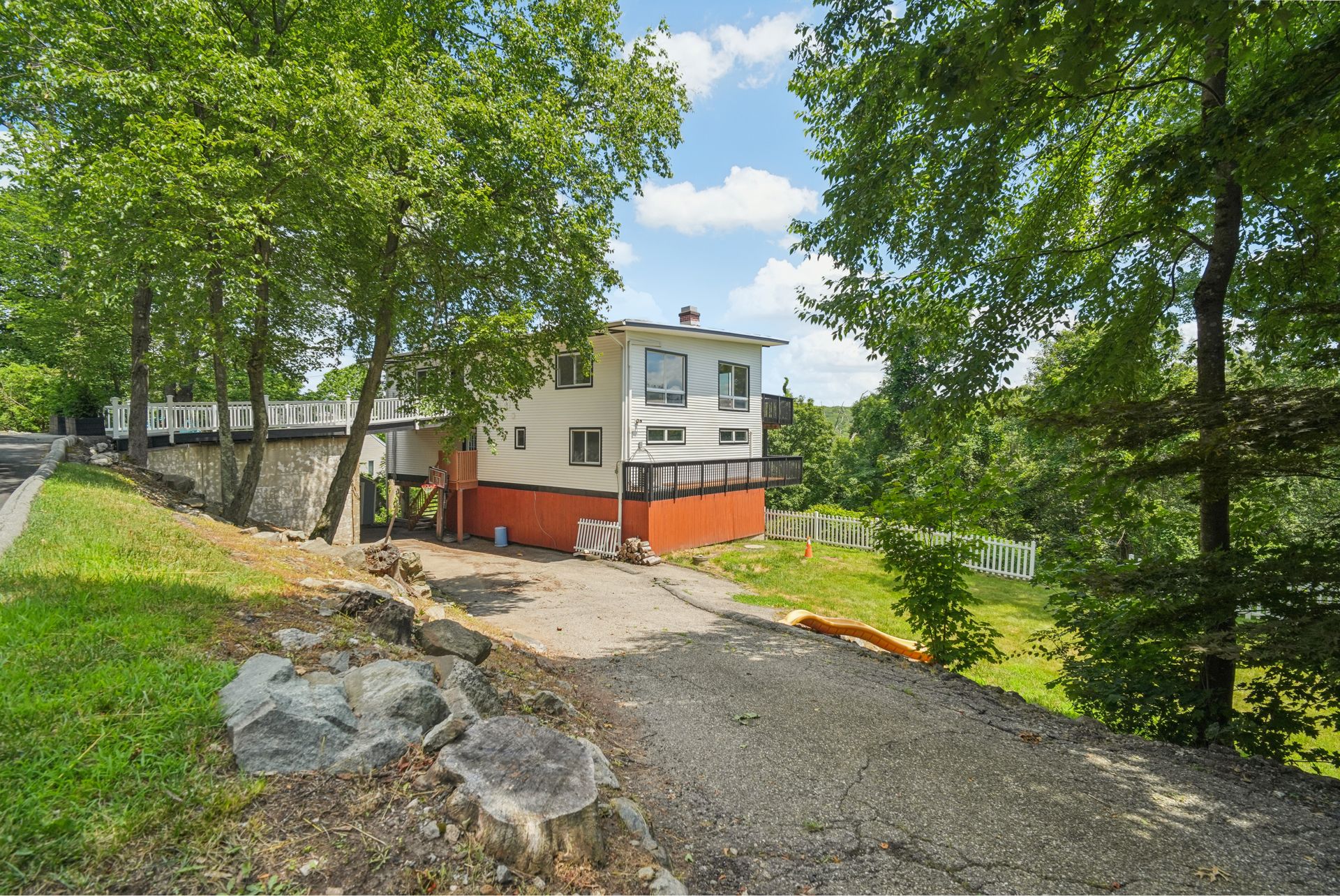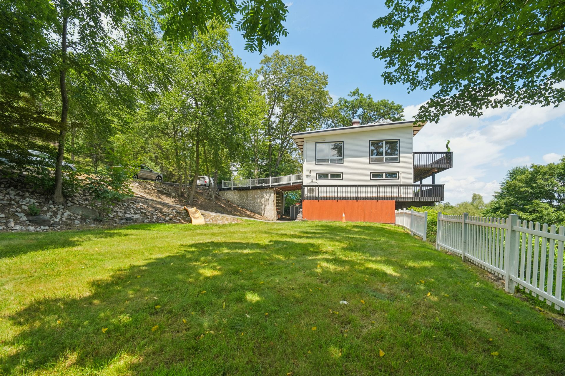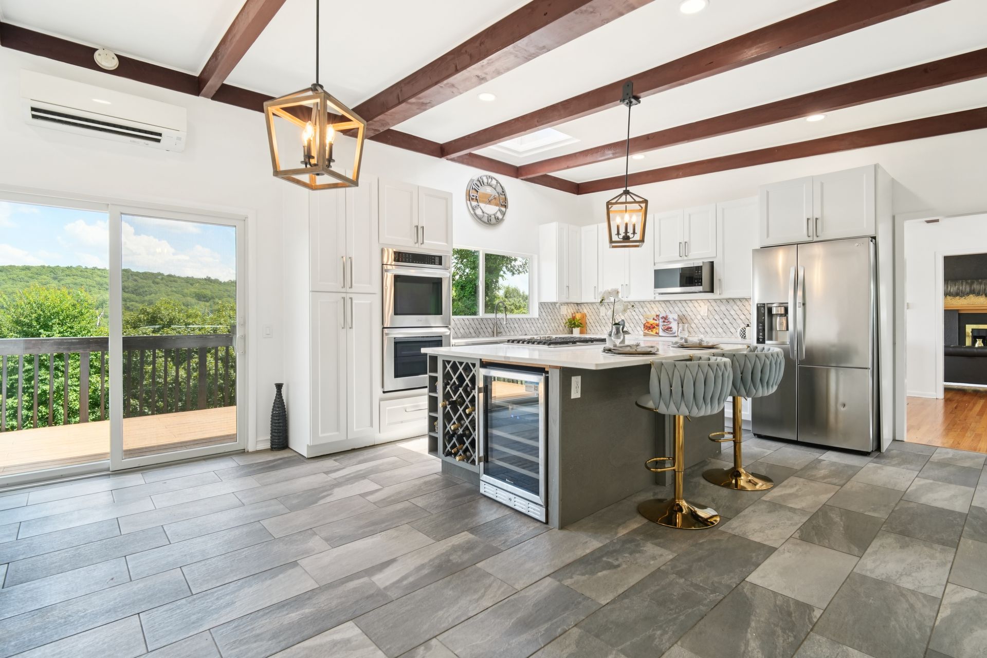 Perched atop a private hill with sweeping, year-round mountain views, this custom-designed gem blends elevated living with everyday comfort. Set in a sought-after township of Kinnelon known for its high-ranking schools and vibrant community association, residents enjoy access to seasonal pools, playgrounds and year-round events that bring neighbors together. Step inside to discover a fully renovated masterpiece featuring vaulted ceilings, skylights and restored hardwood floors that flow seamlessly throughout the home. The newly reimagined living room and formal dining room has a chef's kitchen outfitted with a center island. Enjoy a large family room with a wood-burning fireplace and sliders that open up where you can soak in hilltop sunsets or host under the stars. Boasting five bedrooms on the first floor, including two private suites, this home offers incredible flexibility. The spacious primary suite features a double vanity, stall shower and private deck access. The secondary suite is complete with its own stall shower, walk-in closet, A third hallway bath, featuring heated flooring, a jetted soaking tub and a separate shower stall. Recent upgrades include new siding, roof, select windows and LED recessed lighting throughout, plus exterior and vanity lighting enhancements. Freshly painted inside and out, this home blends contemporary style with classic warmth. Perfect home location for those seeking tranquility, privacy and a dead-end street. Welcome to elevated living. This one won't last long.