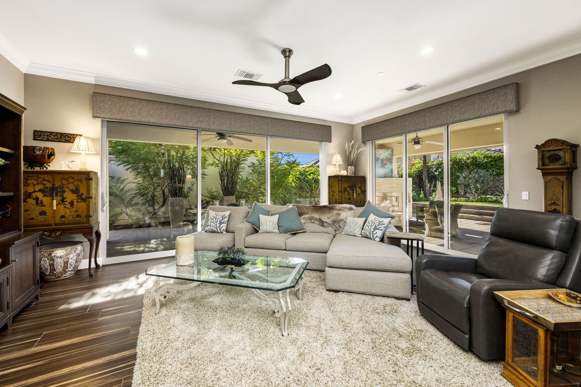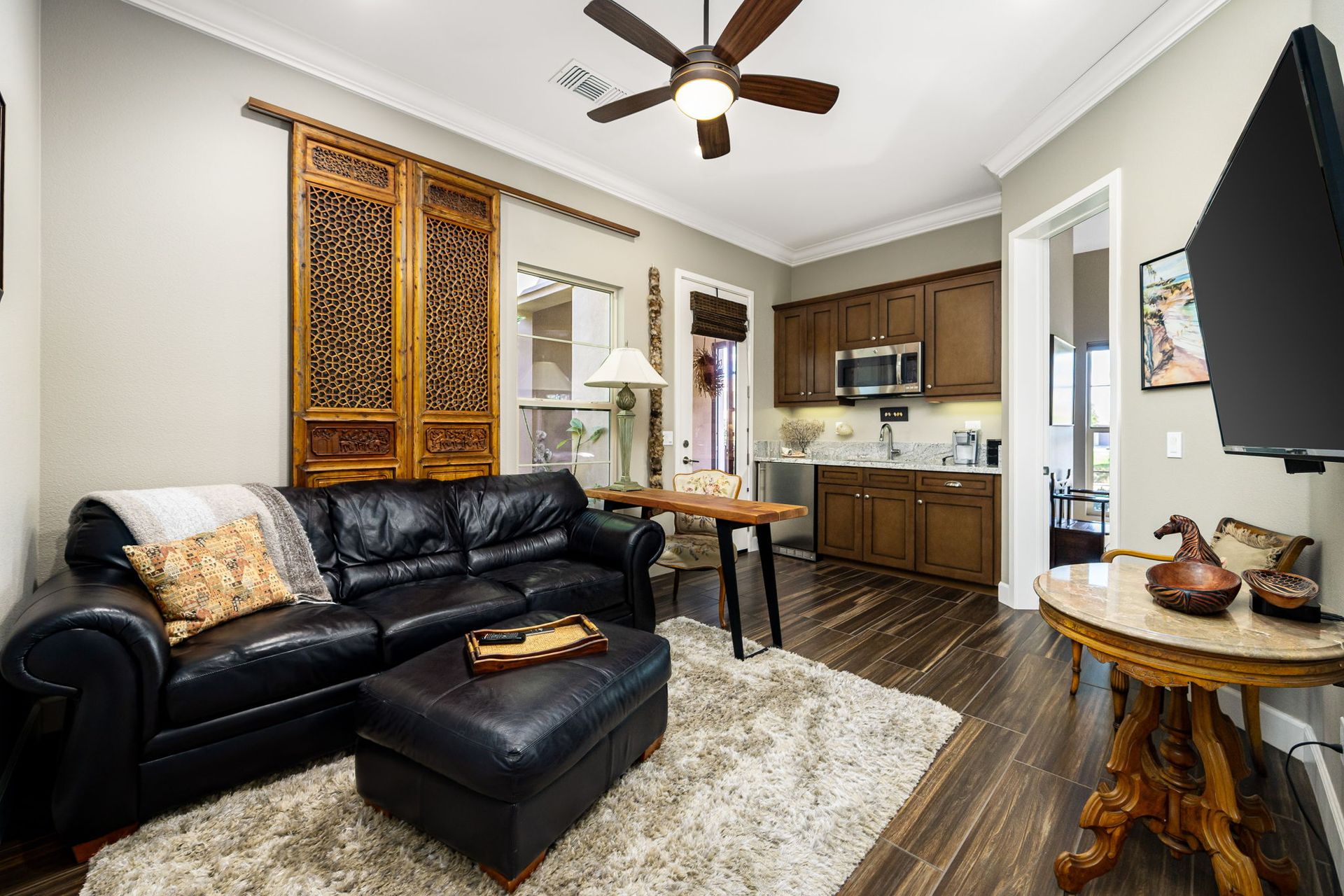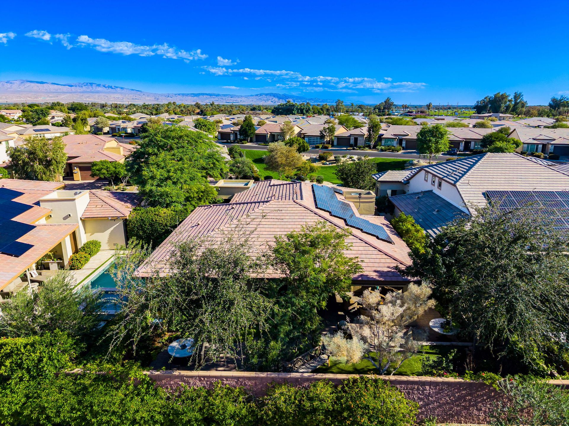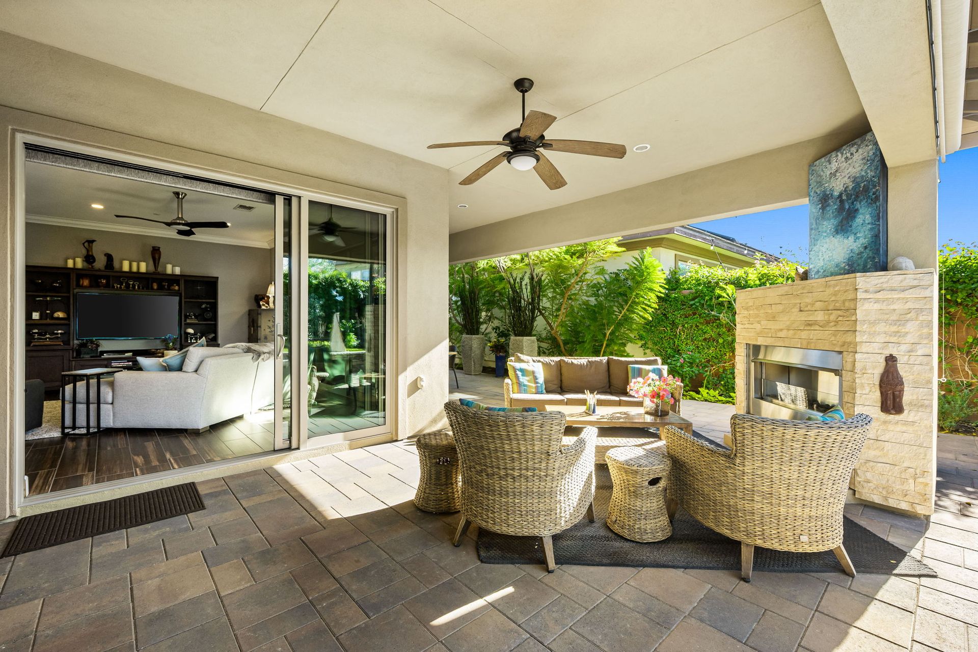 Spectacular upgraded Incantare floor plan with attached two-room Casita with mini kitchen and private entrance, the den/office could be converted to a third bedroom. Located on a premium lot with resort-style living in Trilogy at the Polo Club. This beautiful open floor plan is upgraded to the max, including three rolling walls of glass that offer indoor/outdoor living at its finest. Porcelain tile floors throughout, crown molding, chef-inspired kitchen with a large island with built-in GE Monogram stainless steel appliances, quartz counters with upgraded backsplash, and a large dining room. All bathrooms have upgraded counters and showers, including framed mirrors with upgraded, rooms have designer fans, custom window treatments, soft-close cabinets and drawers, and a tankless water heater. The garage has a Separate A/C system, epoxy floors, storage cabinets, and a workbench. Escape to the mature backyard to enjoy your very own professionally designed indoor-outdoor paradise. Enjoy a wrap-around covered patio with a custom fireplace and misting system. This opportunity encompasses the ultimate desert lifestyle. This Home has Solar, on IID Zero Net Metering program with no electric bill. With its close clubhouse location with no expense spared upgrades, this home stands alone as a singular masterpiece, crafted with precision, intention, and an unwavering commitment to luxury living. Call Michael today for your private showing.