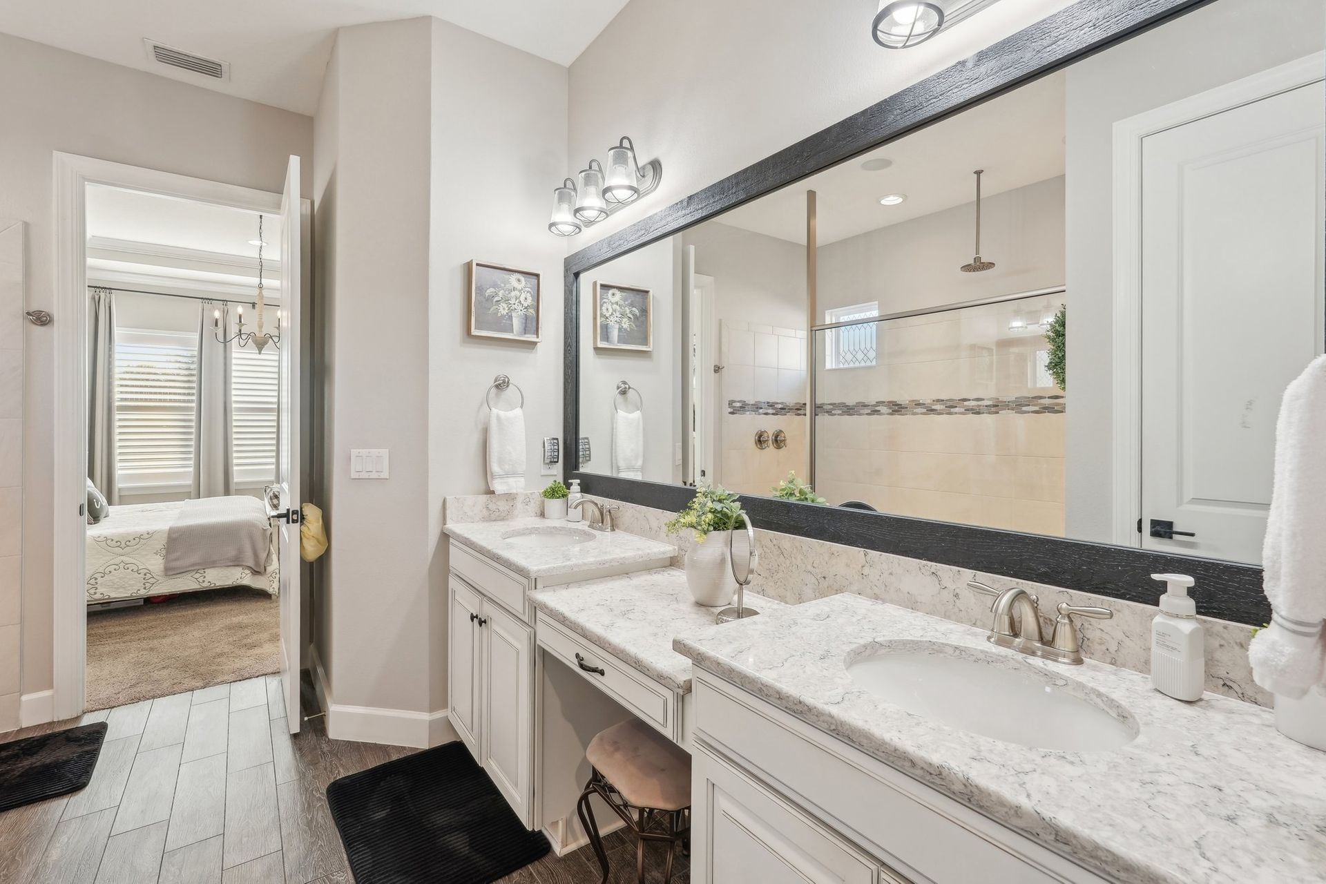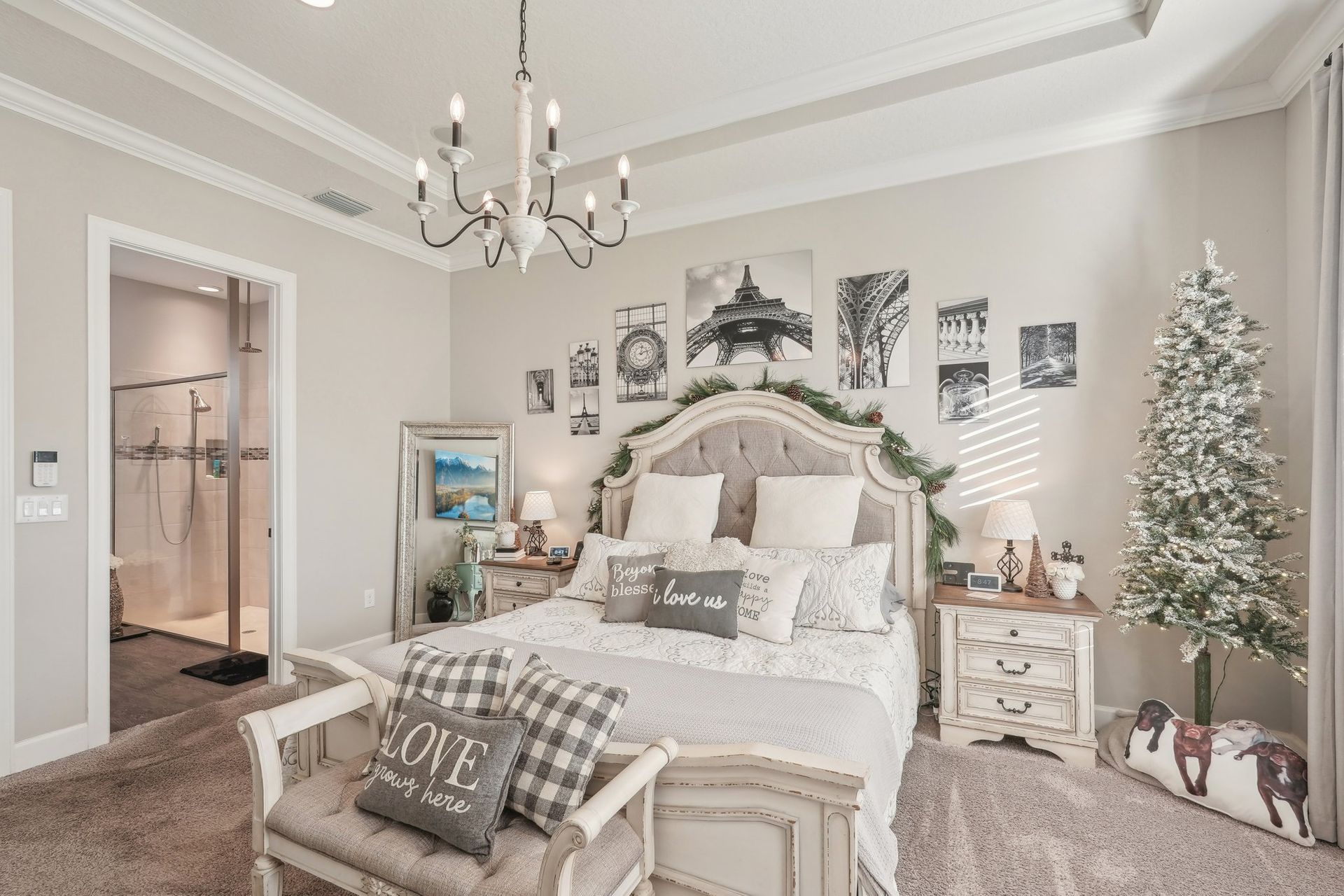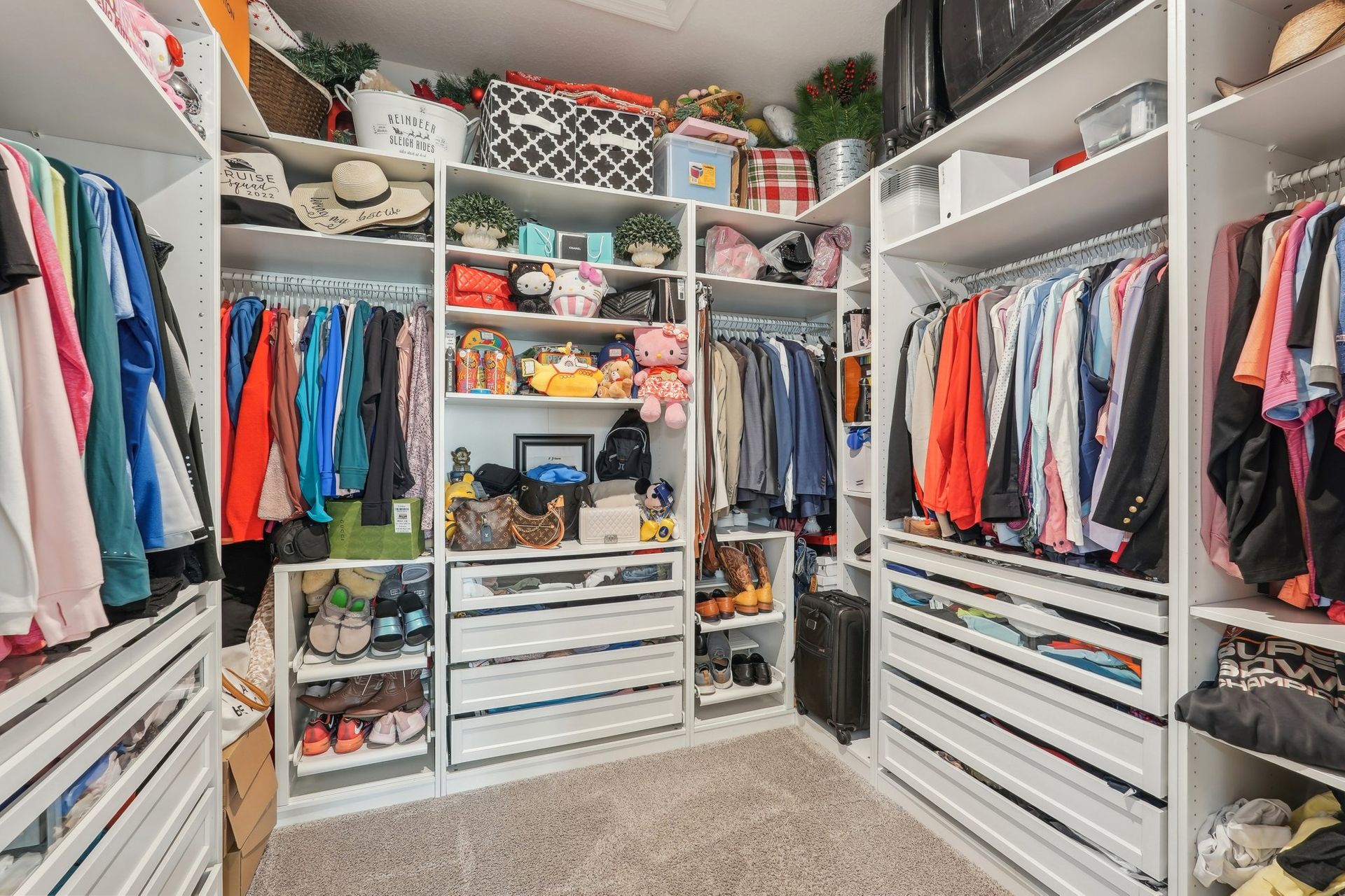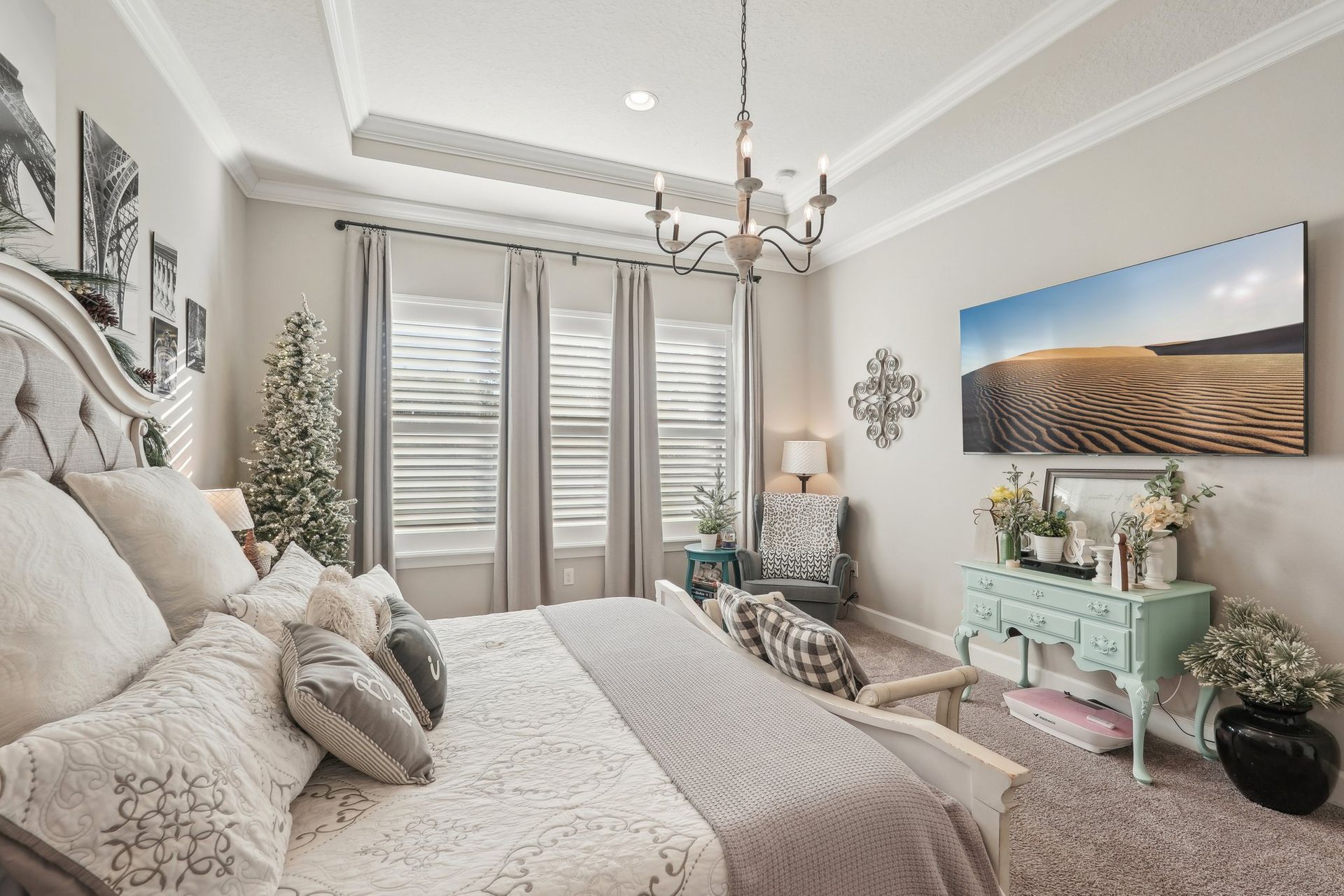 Every corner of this home reflects luxury, from the custom wood shelving in the pantry to the elegant plantation shutters that adorn the windows, allowing natural light to dance through the space. The master suite serves as a serene retreat, featuring a rain shower in the spa-inspired bathroom and an extended closet designed for ultimate organization.