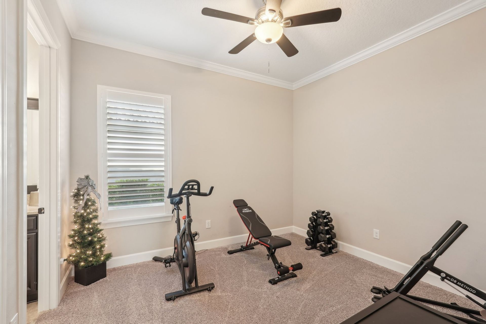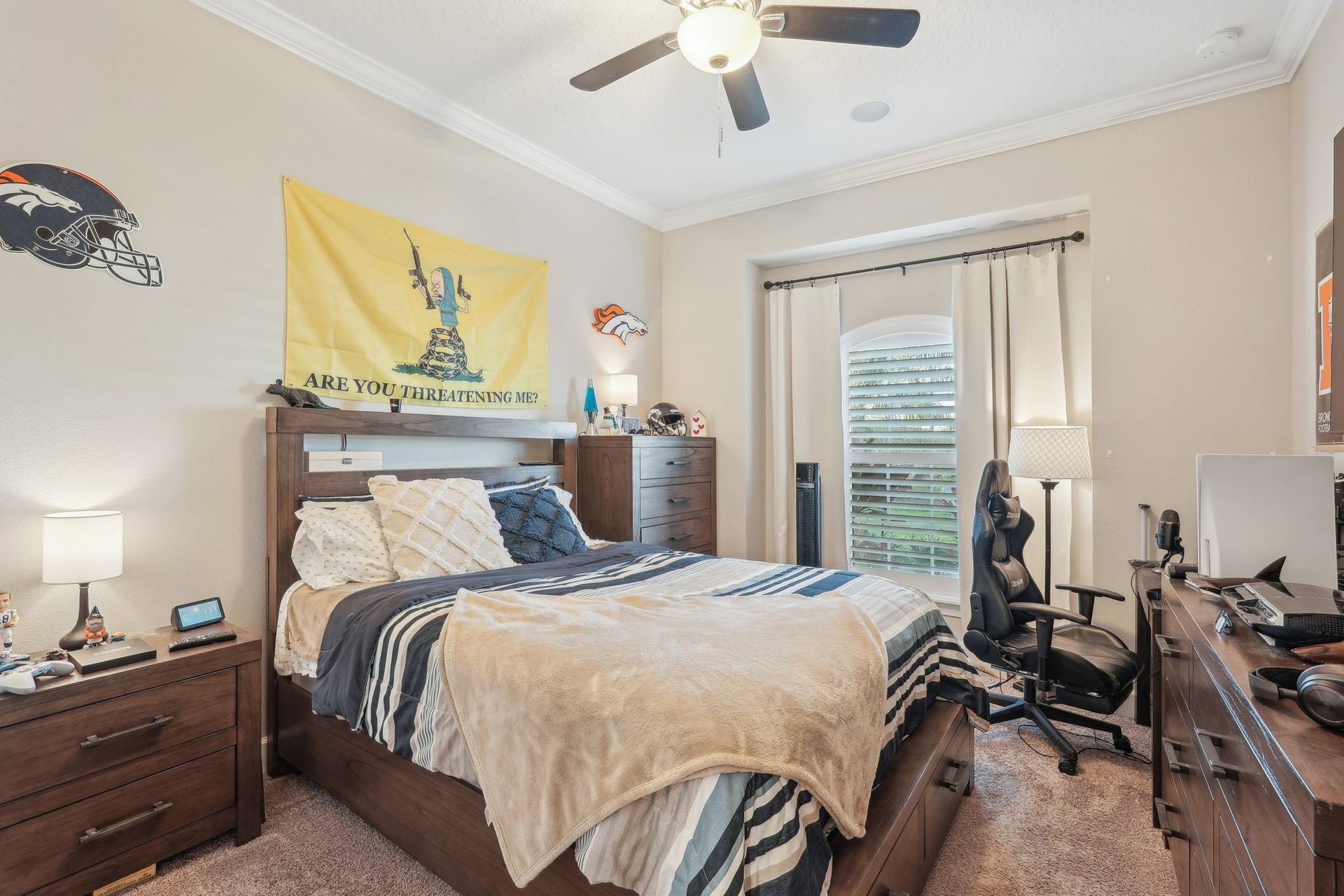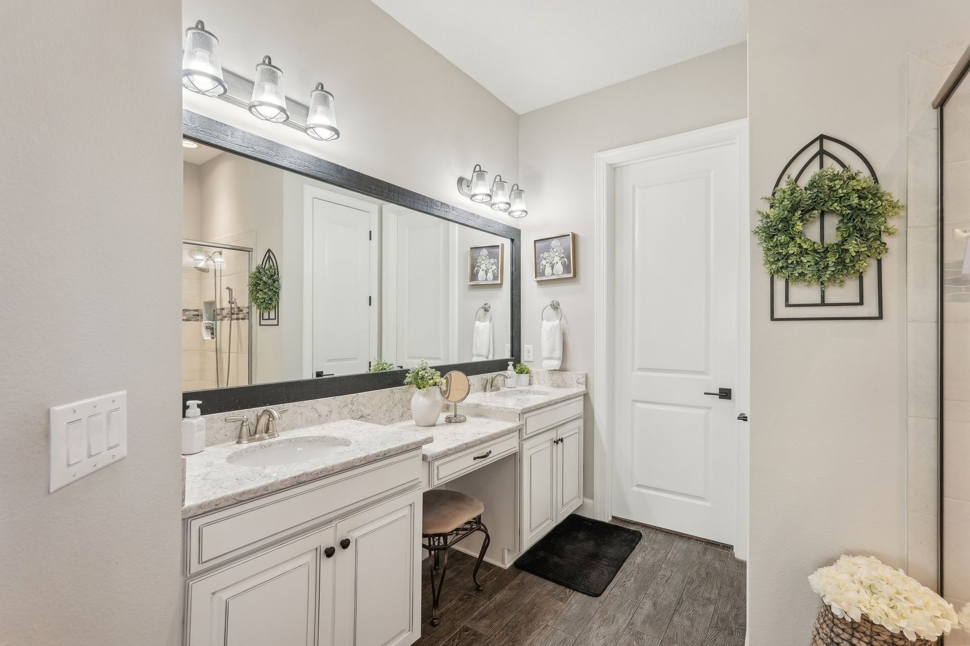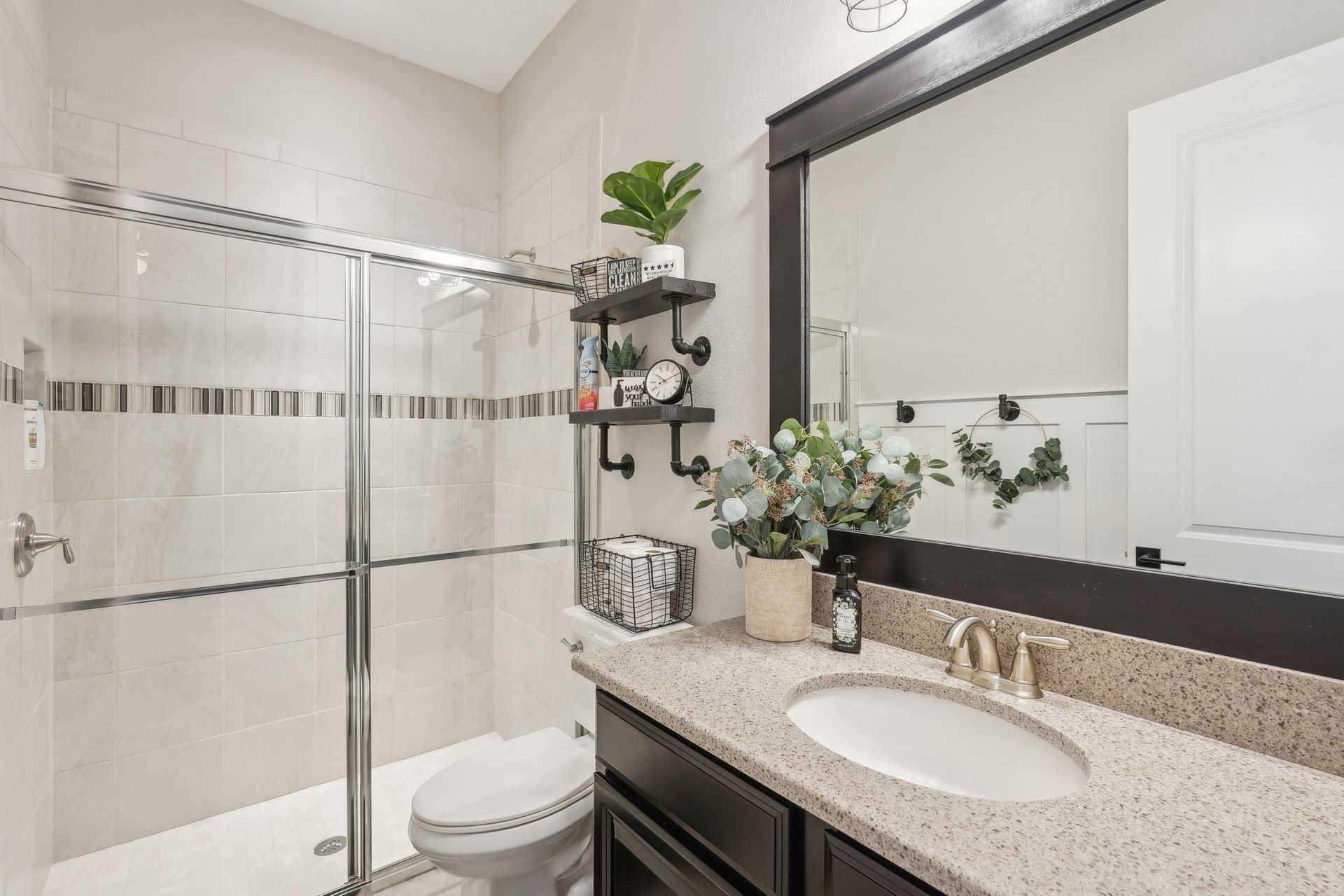 Every corner of this home reflects luxury, from the custom wood shelving in the pantry to the elegant plantation shutters that adorn the windows, allowing natural light to dance through the space. The master suite serves as a serene retreat, featuring a rain shower in the spa-inspired bathroom and an extended closet designed for ultimate organization.