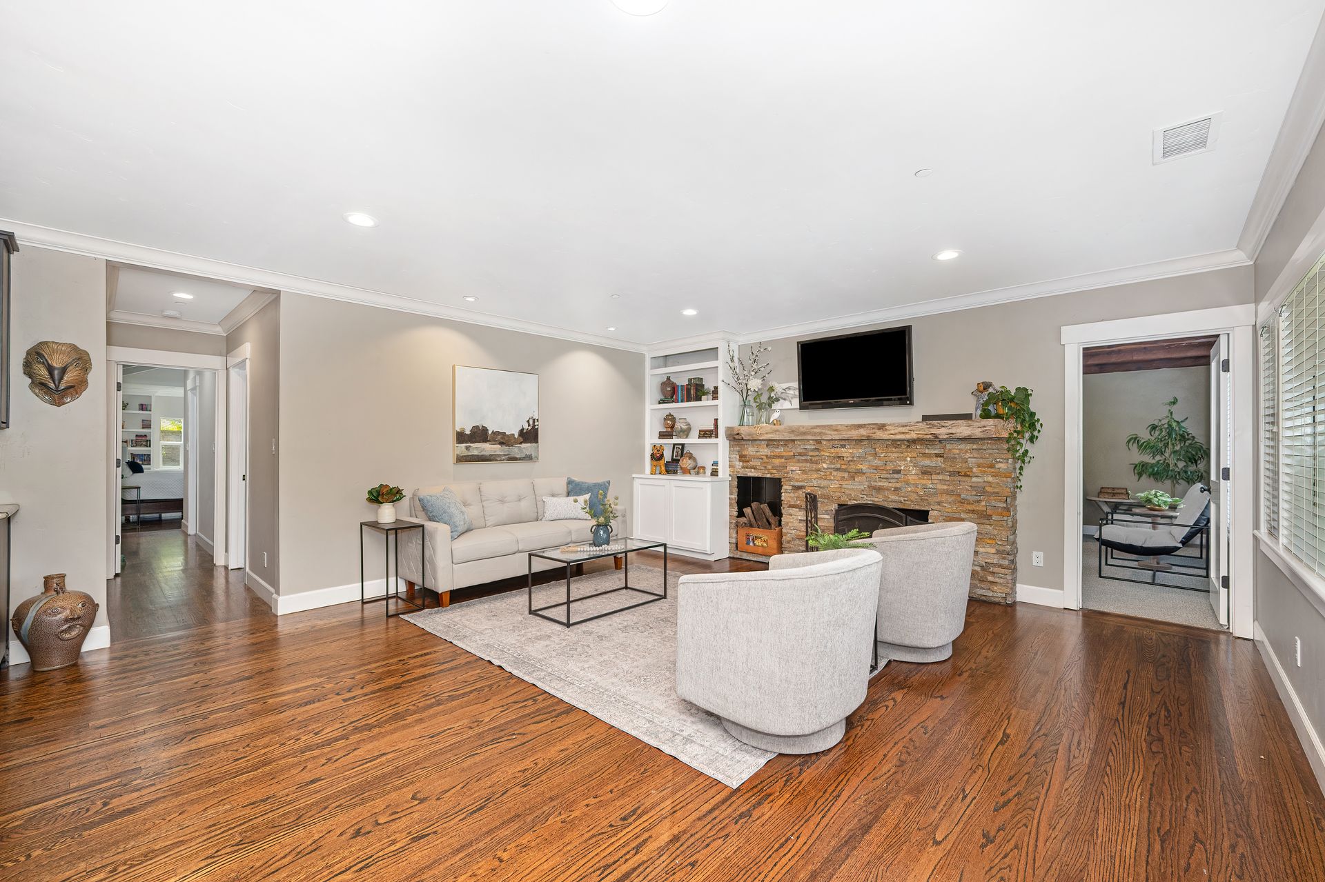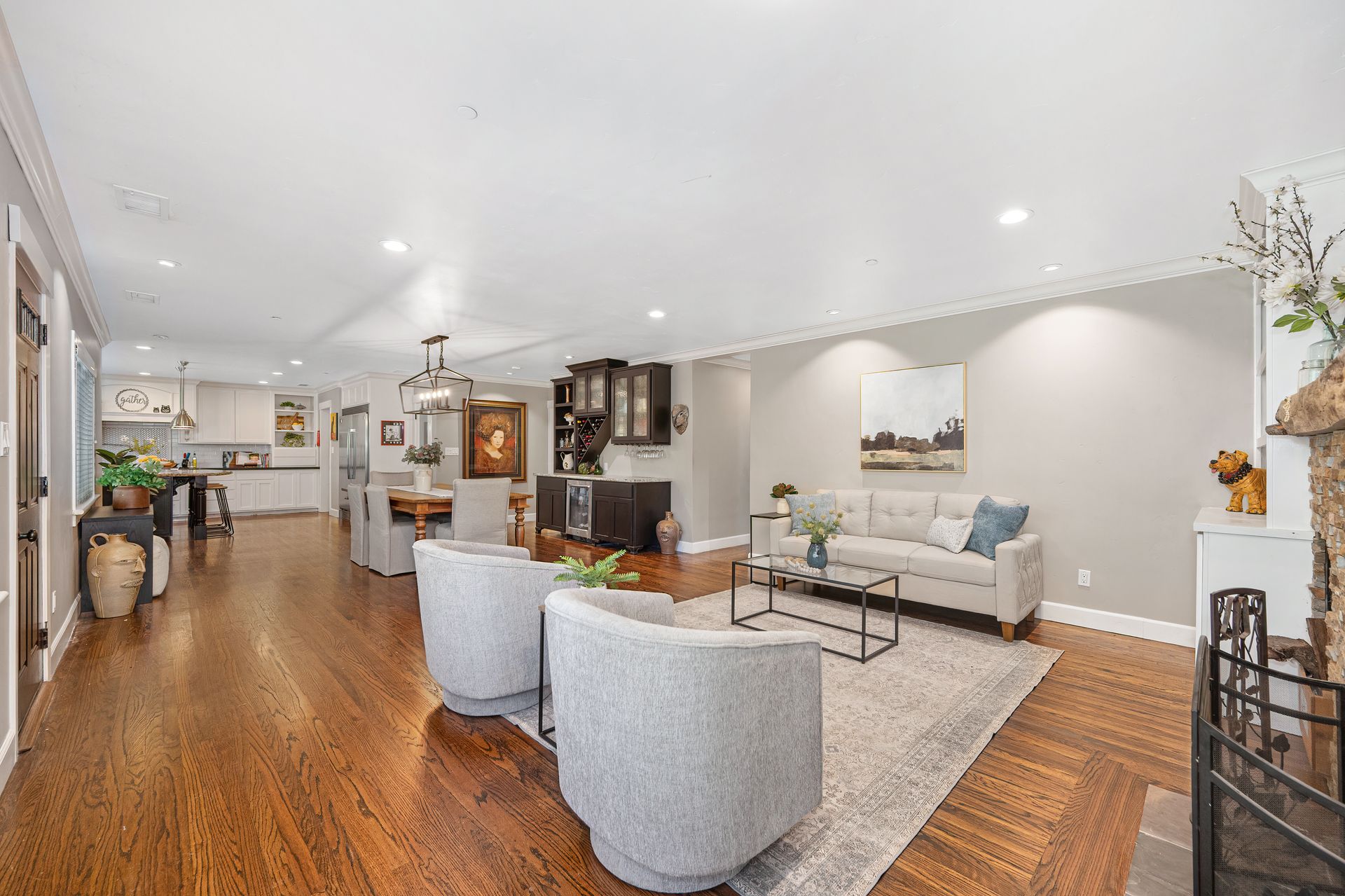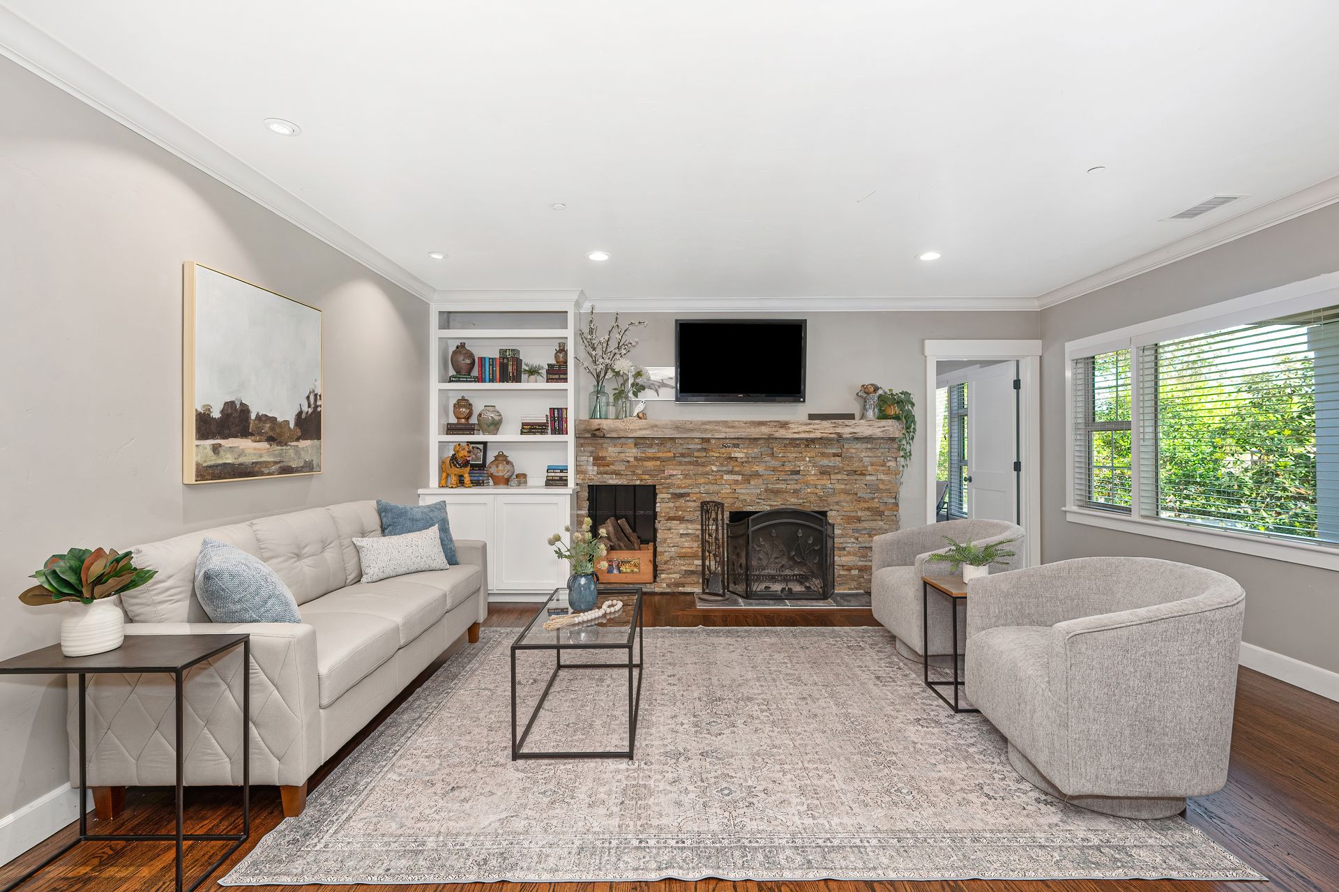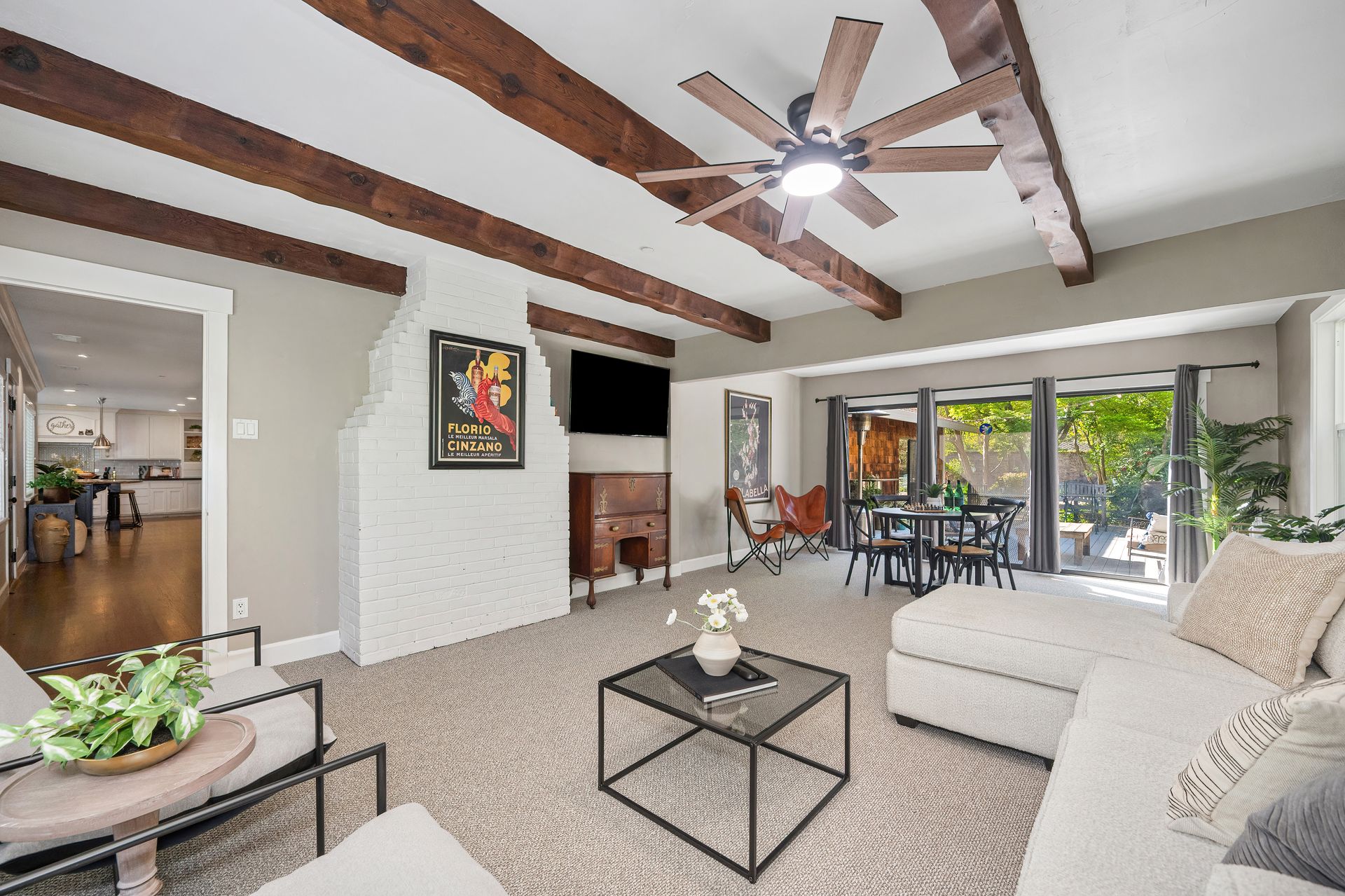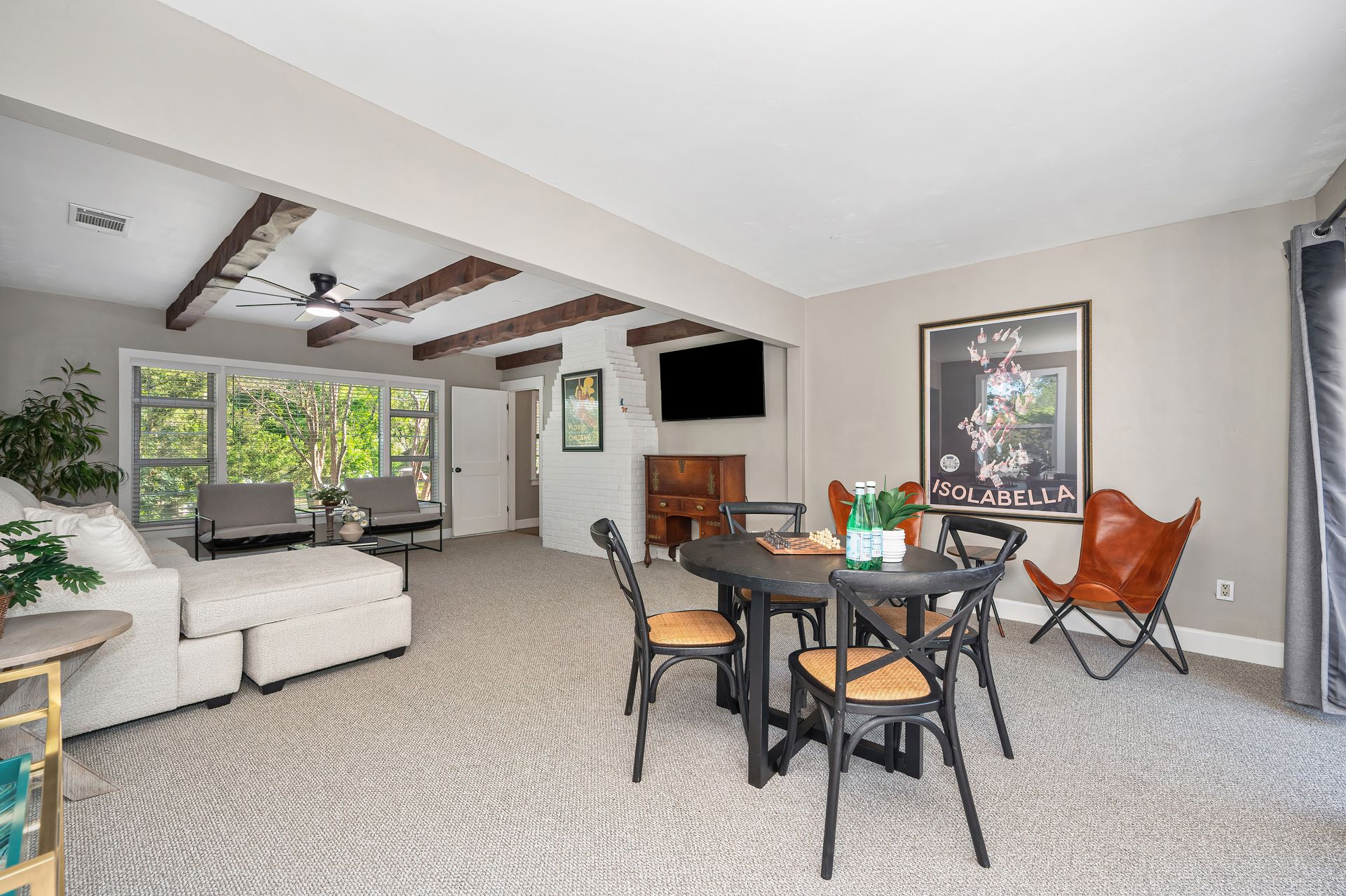 Extensively renovated down to the studs in 2015, this private gated property offers thoughtfully designed indoor and outdoor living with major system upgrades throughout. Inside, original hardwood floors (refinished in 2026), a wood-burning fireplace with stacked stone surround and a reclaimed wood mantel, and two inviting livable areas create a warm place to relax or gather. The open layout flows to a dining area with built-in cabinetry, granite counters, wine storage and refrigerator, while the secondary living room features exposed beams and new Berber carpet (March 2026).