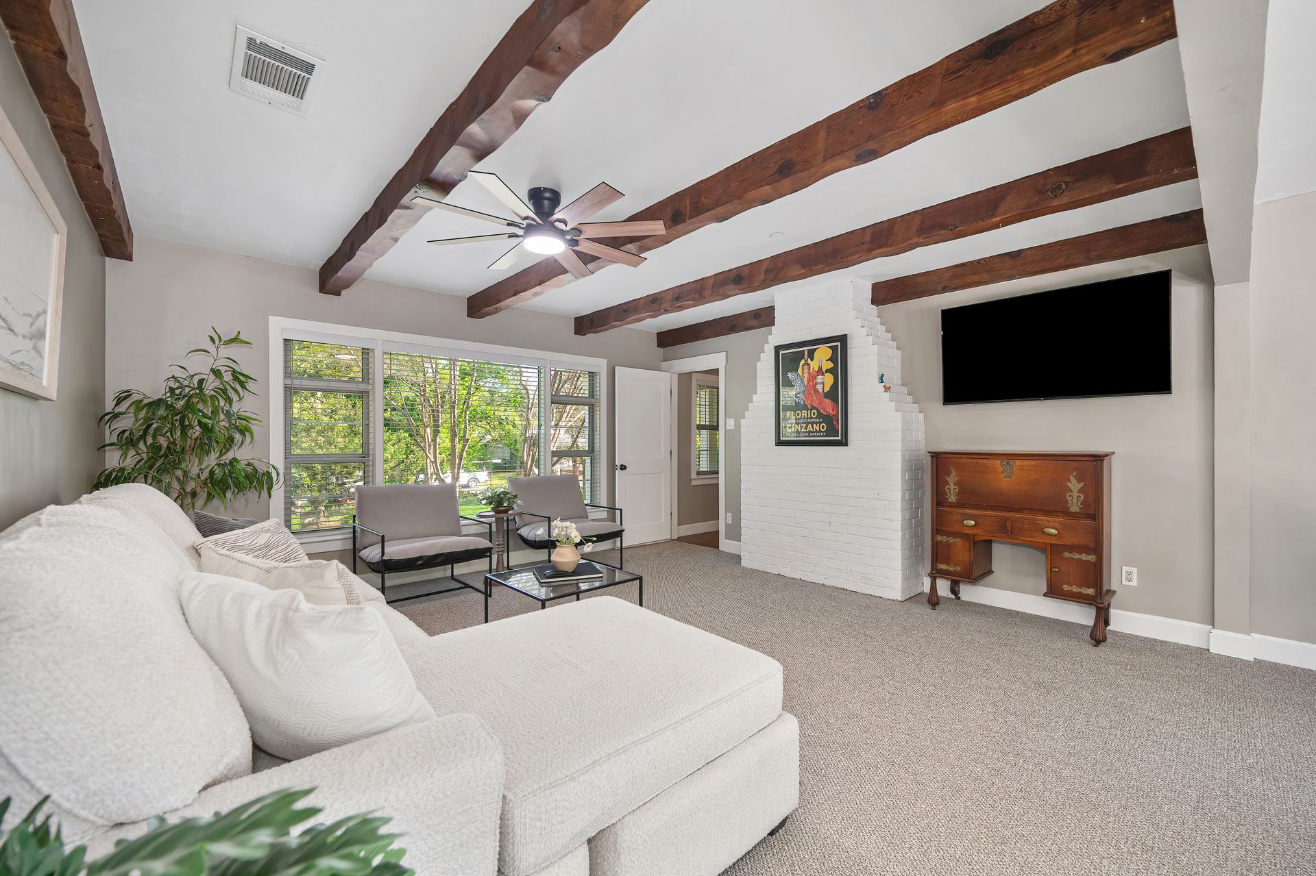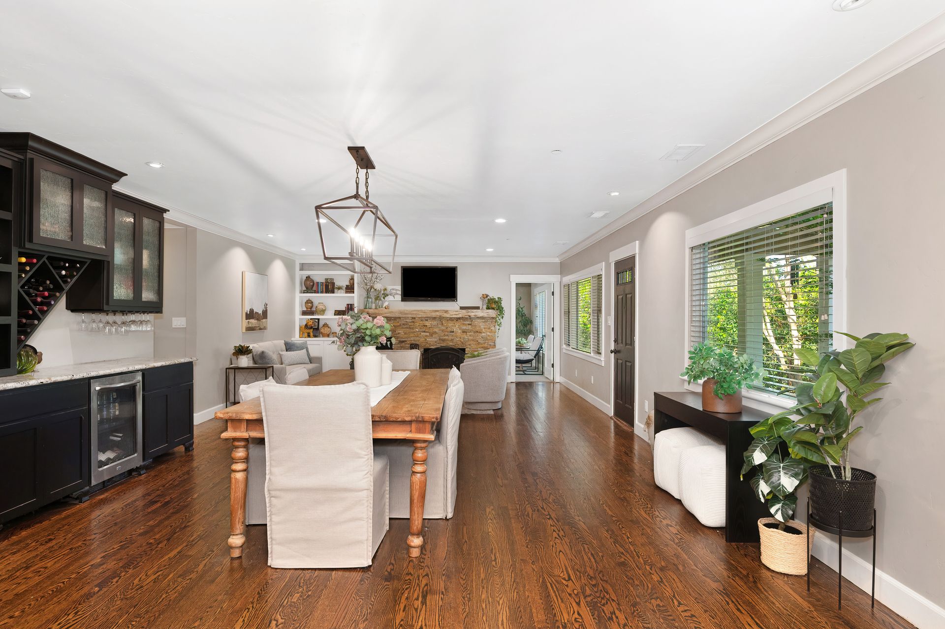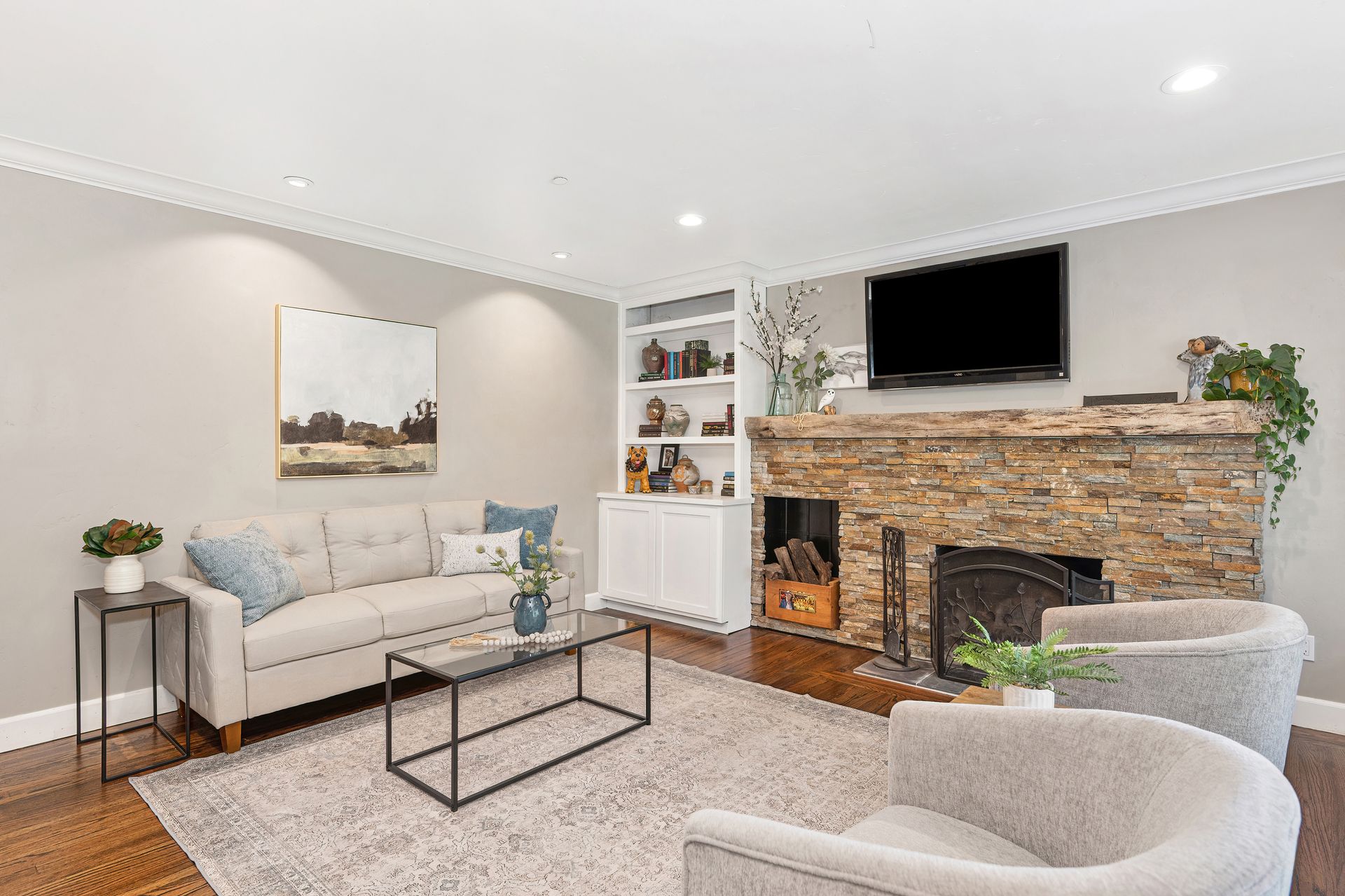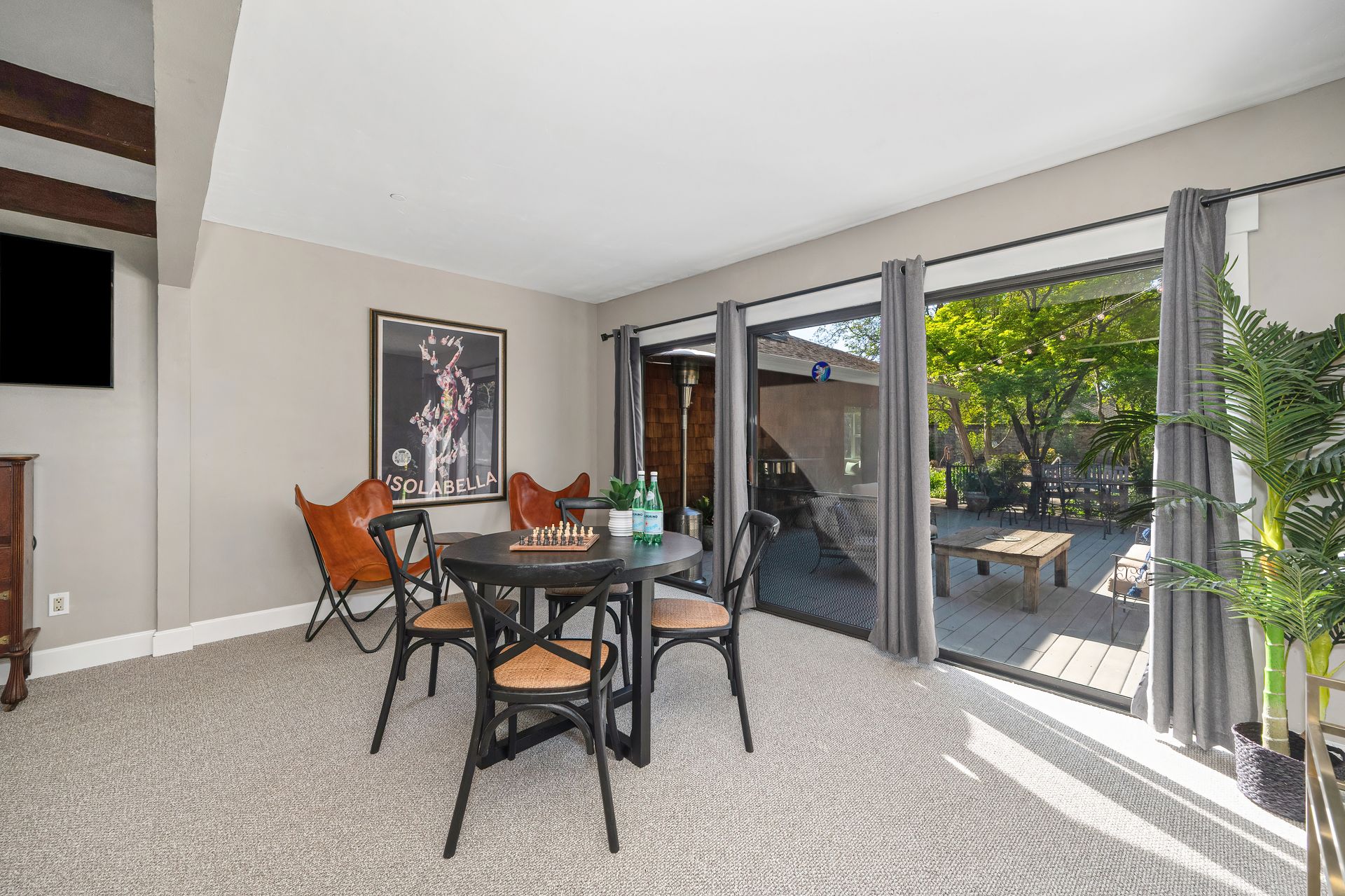 Extensively renovated down to the studs in 2015, this private gated property offers thoughtfully designed indoor and outdoor living with major system upgrades throughout. Inside, original hardwood floors (refinished in 2026), a wood-burning fireplace with stacked stone surround and a reclaimed wood mantel, and two inviting livable areas create a warm place to relax or gather. The open layout flows to a dining area with built-in cabinetry, granite counters, wine storage and refrigerator, while the secondary living room features exposed beams and new Berber carpet (March 2026).