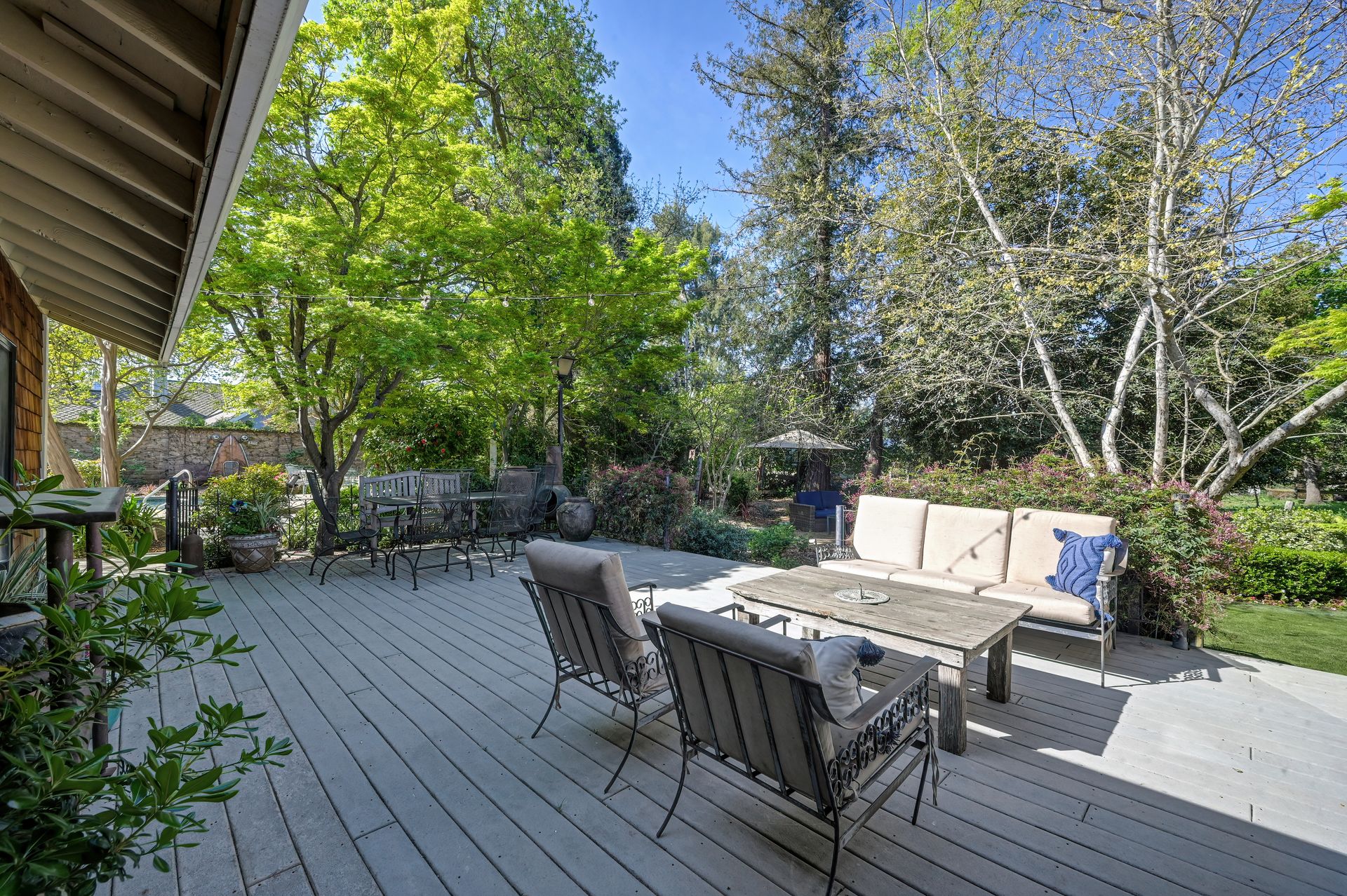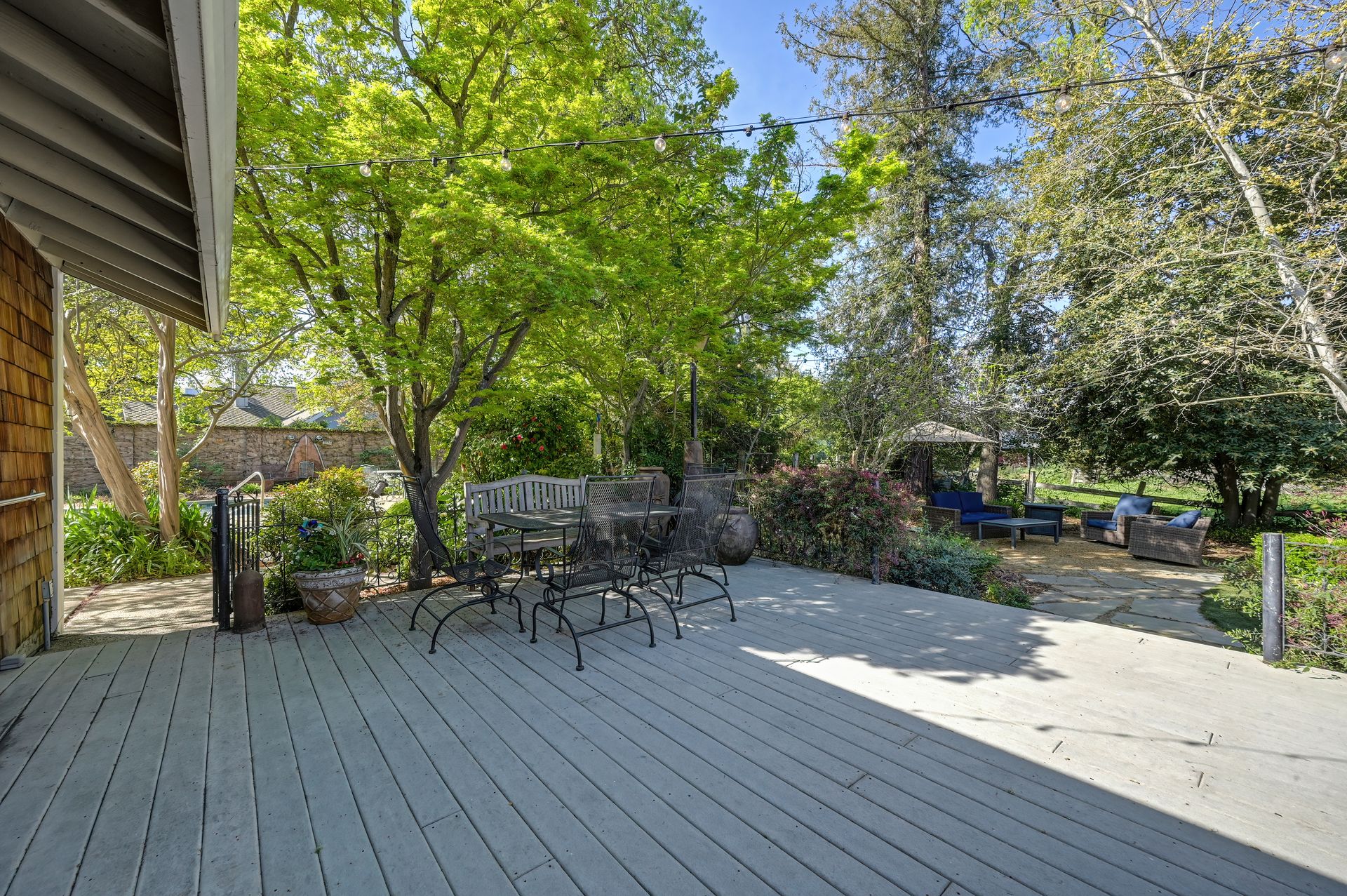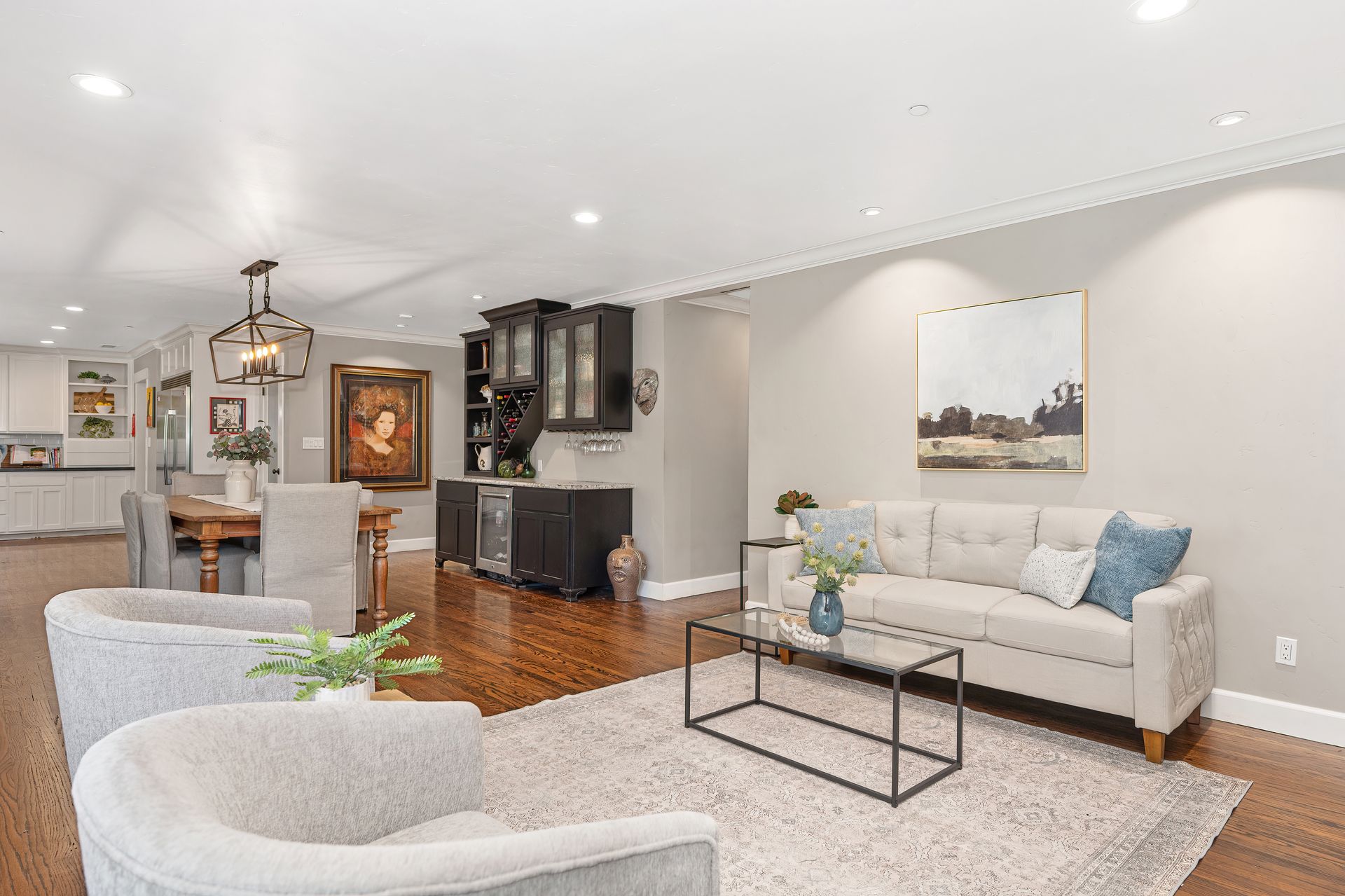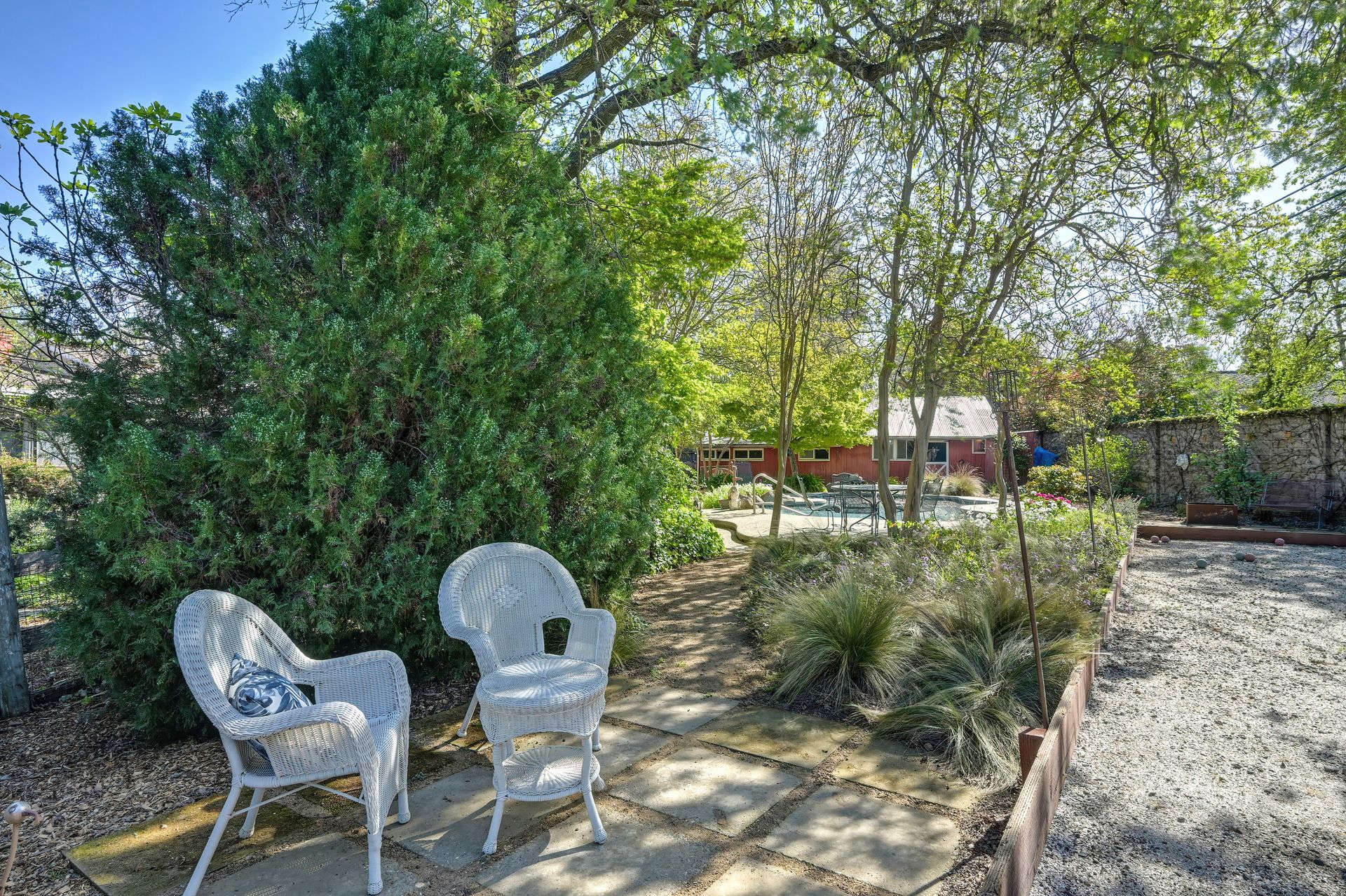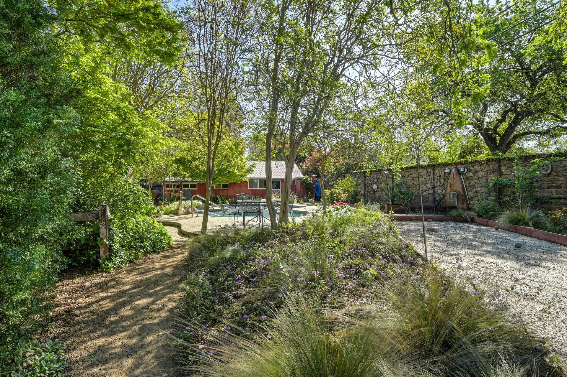 Extensively renovated down to the studs in 2015, this private gated property offers thoughtfully designed indoor and outdoor living with major system upgrades throughout. Inside, original hardwood floors (refinished in 2026), a wood-burning fireplace with stacked stone surround and a reclaimed wood mantel, and two inviting livable areas create a warm place to relax or gather. The open layout flows to a dining area with built-in cabinetry, granite counters, wine storage and refrigerator, while the secondary living room features exposed beams and new Berber carpet (March 2026).